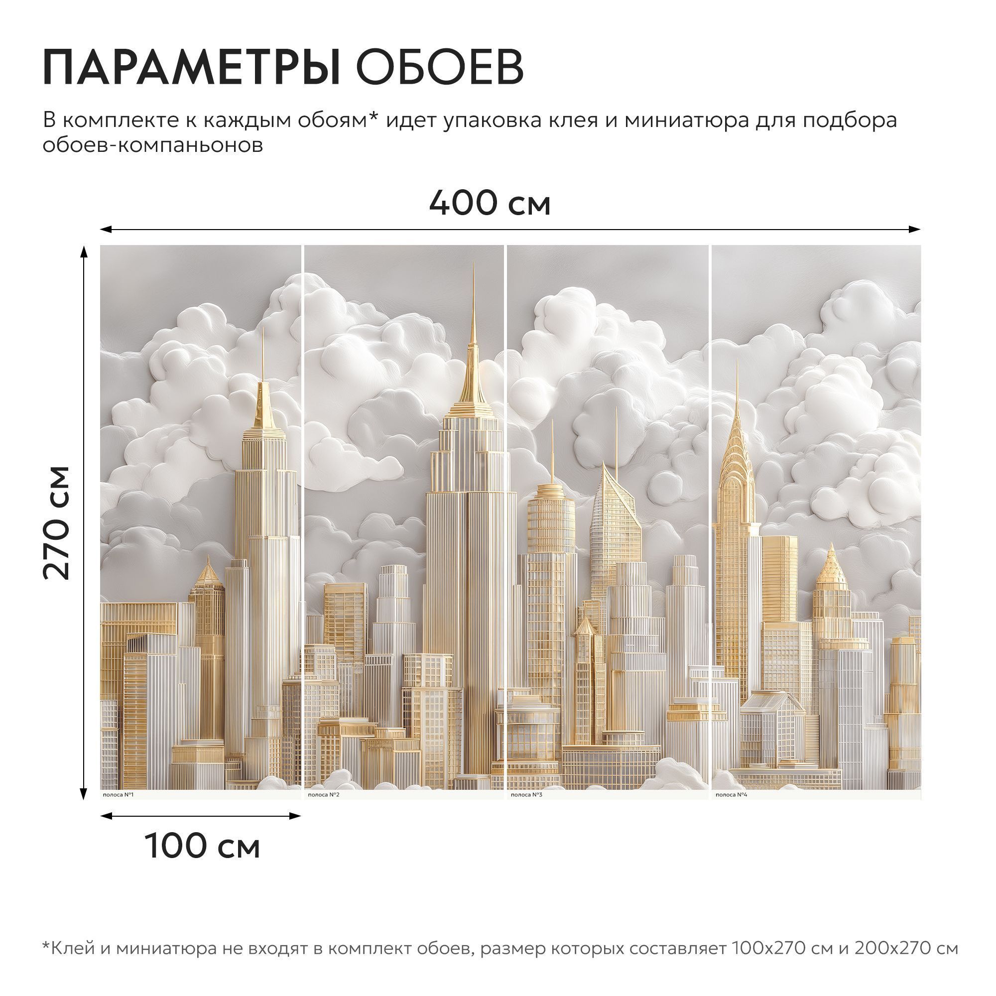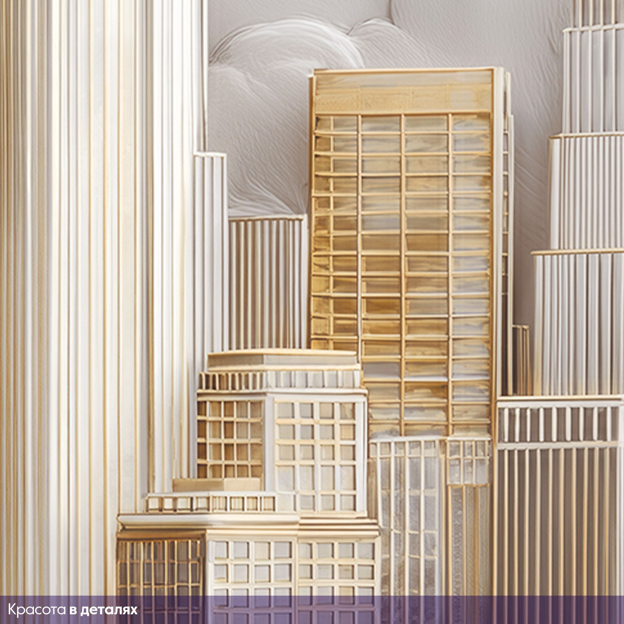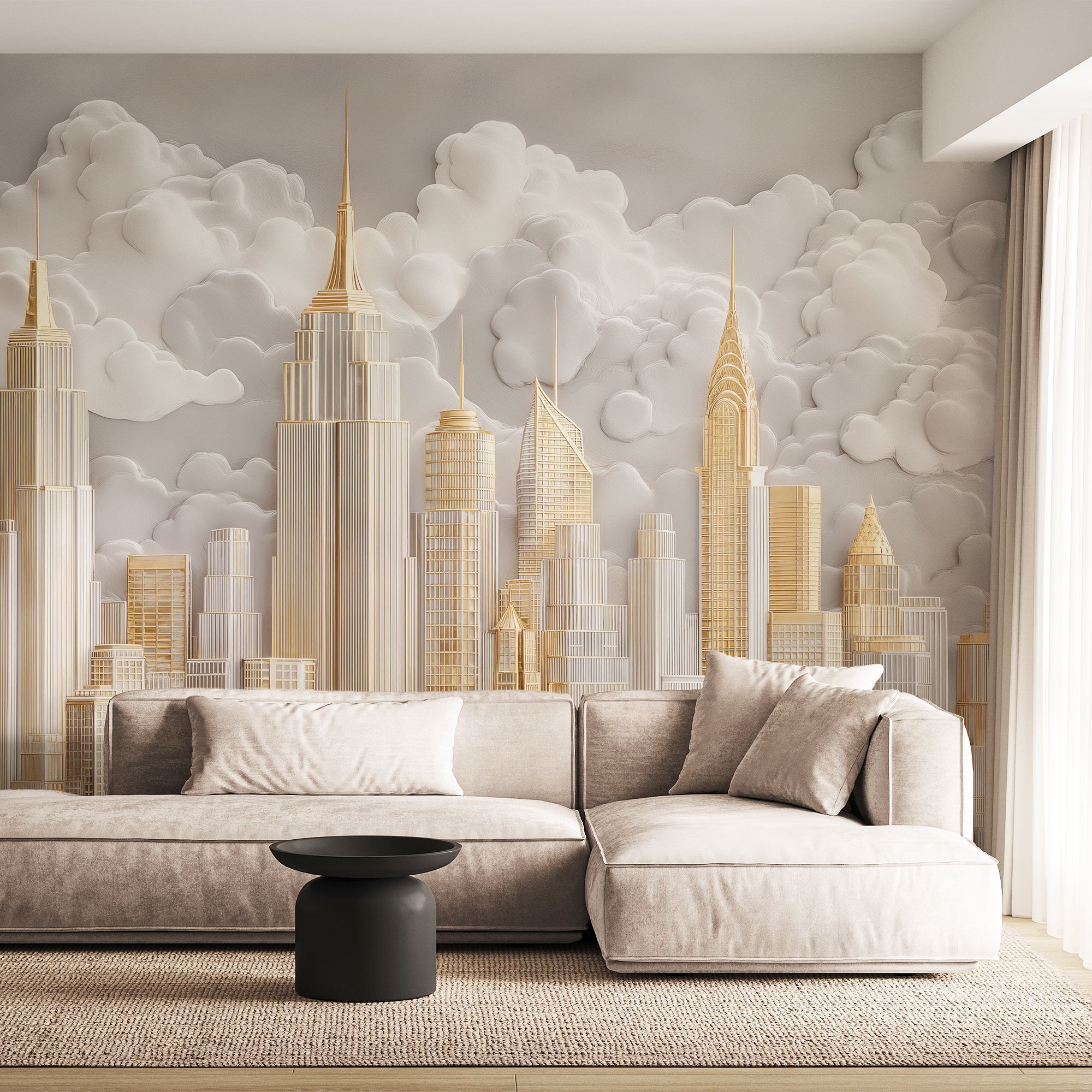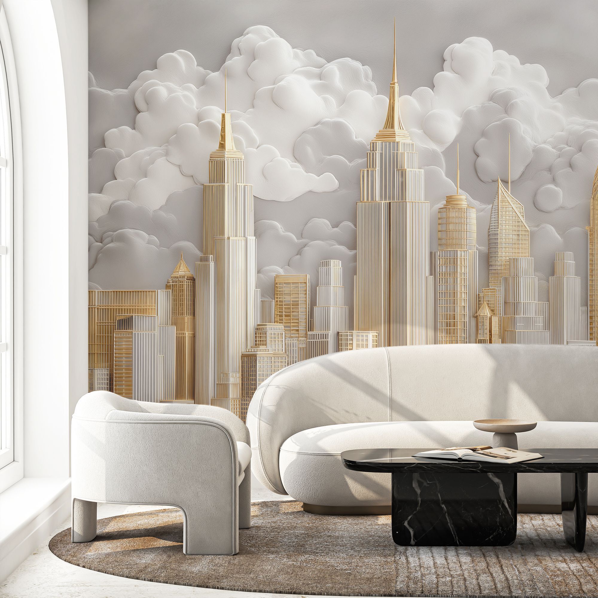 Фотообои с изысканным городским пейзажем в золотых и серебристых тонах, окружённым пушистыми облаками — воплощение роскоши и урбанистической мечты. Центральную часть композиции занимают величественные здания, напоминающие знаковые архитектурные шедевры Нью-Йорка — их изящные силуэты устремлены ввысь, к небесам. Благородные оттенки золота, серебра и белого создают ощущение лёгкости и одновременно подчёркивают статусность интерьера. Архитектурные детали прорисованы с удивительной точностью — видны линии фасадов, оконные сетки, шпили и декоративные элементы зданий. Сочетание строгих геометрических форм небоскрёбов и плавных, округлых очертаний облаков создаёт гармоничный контраст. Фотообои идеально подойдут для гостиной в современном или арт-деко стиле; кабинета руководителя; холла или приёмной; спальни в урбанистическом стиле.