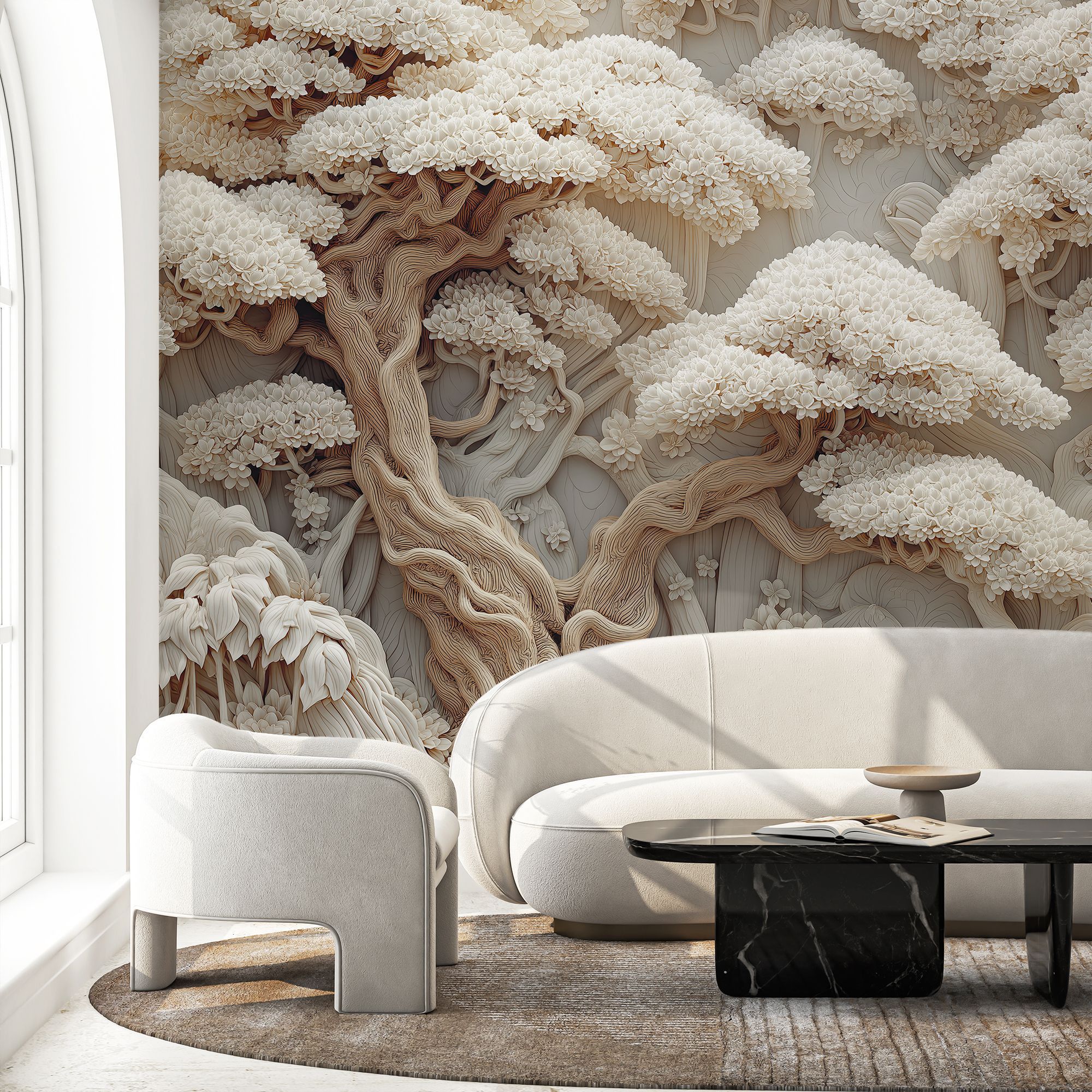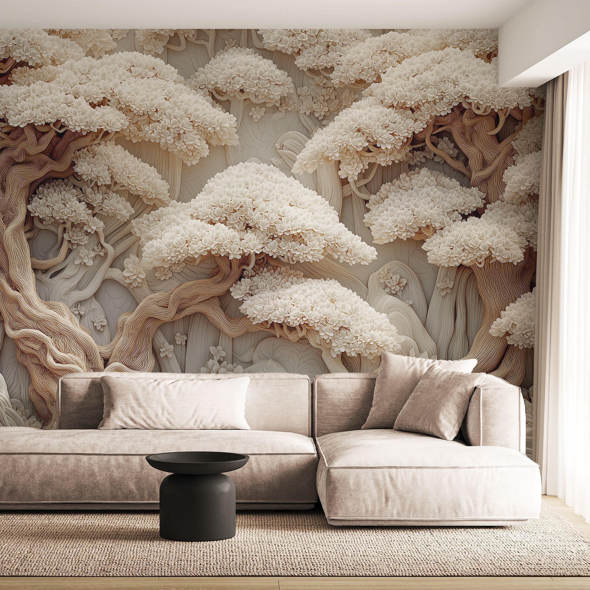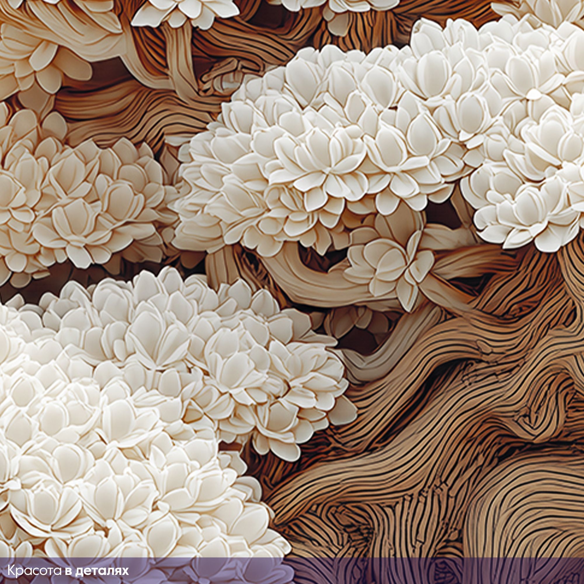 Дизайн этих фотообоев выполнен в виде объёмного барельефа, изображающего волшебный лес. Центром композиции стали величественные деревья с причудливо изогнутыми стволами, напоминающими древние бонсаи. Их кроны состоят из множества мелких цветочных элементов, создающих эффект воздушной пушистости. Ветви плавно перетекают друг в друга, образуя завораживающий ритм линий и форм. В нижней части композиции раскинулся цветочный ковёр из крупных бутонов и нежных лепестков, гармонично дополняющий древесные мотивы. Вся сцена выполнена в изысканной палитре бежево-кремовых оттенков — от тёплого песочного до холодного молочного. Мягкие переходы тонов создают ощущение глубины и трёхмерности, будто изображение оживает при смене освещения. Такой дизайн станет роскошным акцентом в интерьере: украсит гостиную, придав ей аристократичную элегантность; создаст атмосферу умиротворения в спальне; станет выразительным фоном для зоны отдыха или домашнего кабинета; добавит изысканности холлу или прихожей. Фотообои идеально впишутся в стили: арт-деко, неоклассика, эклектика, а также дополнят современный минималистичный интерьер, добавив ему глубины и характера.