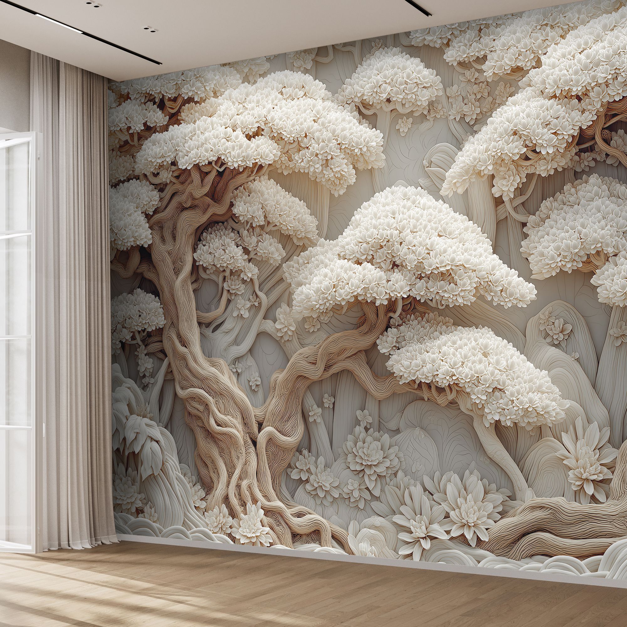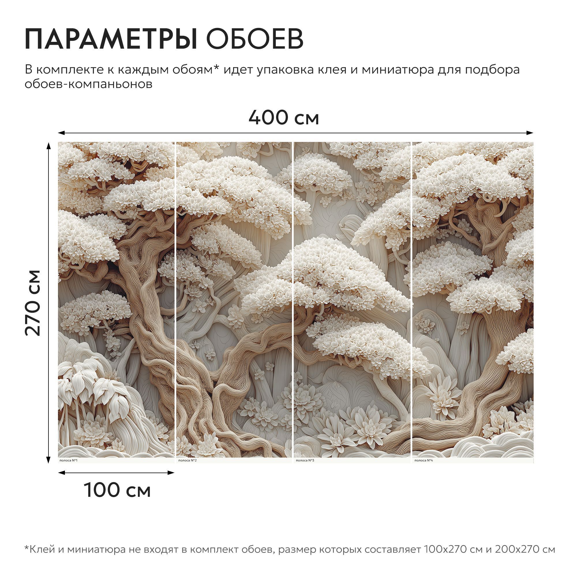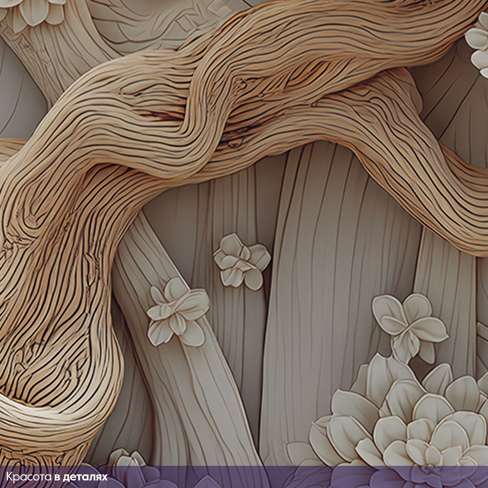 Дизайн этих фотообоев выполнен в виде объёмного барельефа, изображающего волшебный лес. Центром композиции стали величественные деревья с причудливо изогнутыми стволами, напоминающими древние бонсаи. Их кроны состоят из множества мелких цветочных элементов, создающих эффект воздушной пушистости. Ветви плавно перетекают друг в друга, образуя завораживающий ритм линий и форм. В нижней части композиции раскинулся цветочный ковёр из крупных бутонов и нежных лепестков, гармонично дополняющий древесные мотивы. Вся сцена выполнена в изысканной палитре бежево-кремовых оттенков — от тёплого песочного до холодного молочного. Мягкие переходы тонов создают ощущение глубины и трёхмерности, будто изображение оживает при смене освещения. Такой дизайн станет роскошным акцентом в интерьере: украсит гостиную, придав ей аристократичную элегантность; создаст атмосферу умиротворения в спальне; станет выразительным фоном для зоны отдыха или домашнего кабинета; добавит изысканности холлу или прихожей. Фотообои идеально впишутся в стили: арт-деко, неоклассика, эклектика, а также дополнят современный минималистичный интерьер, добавив ему глубины и характера.