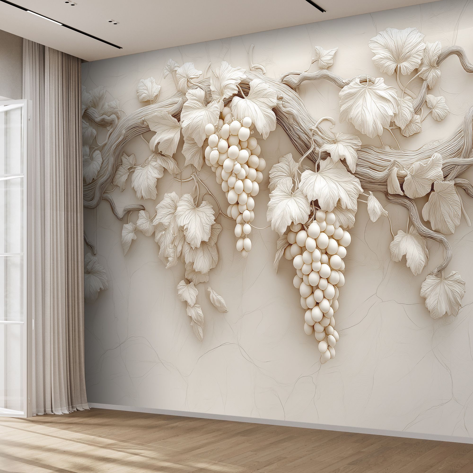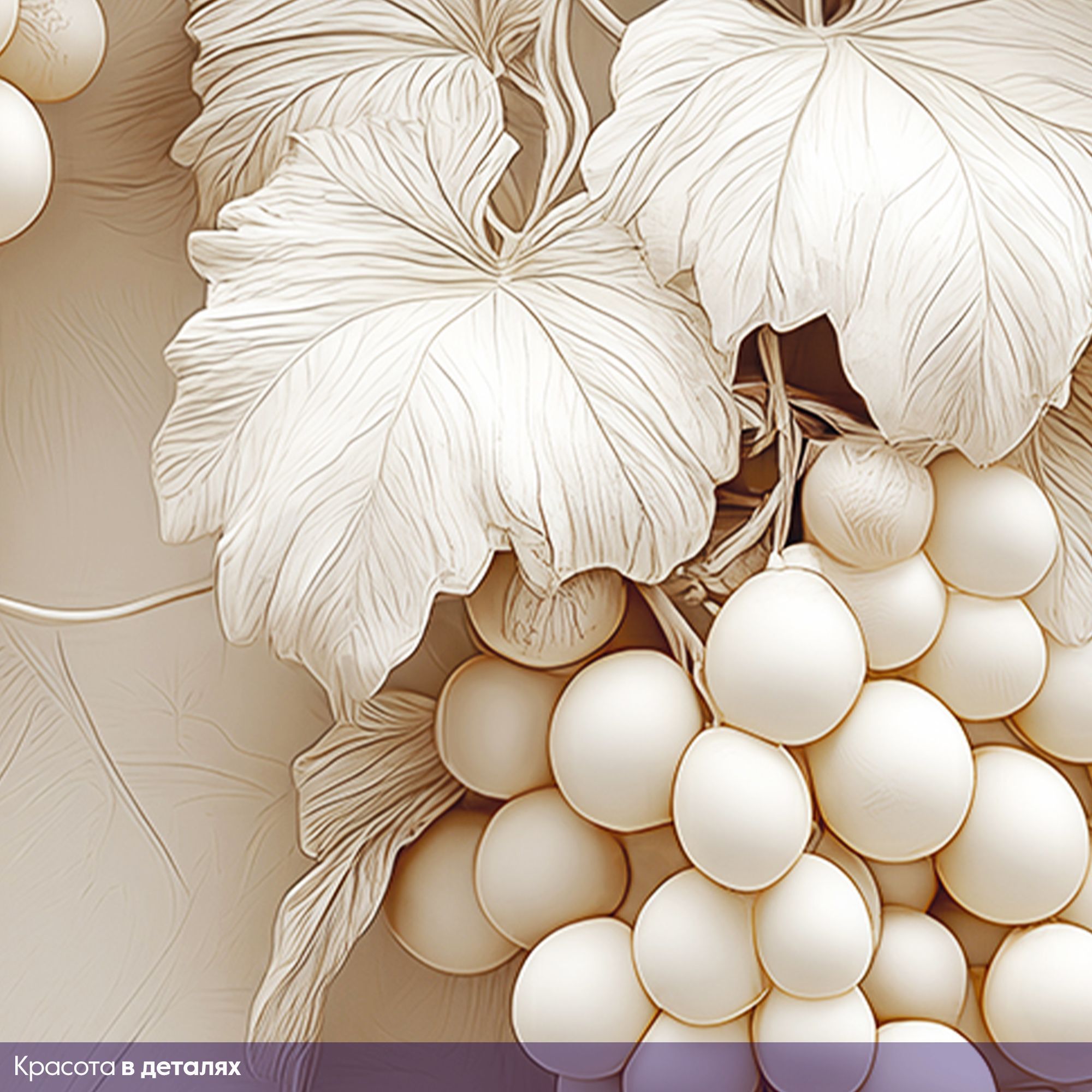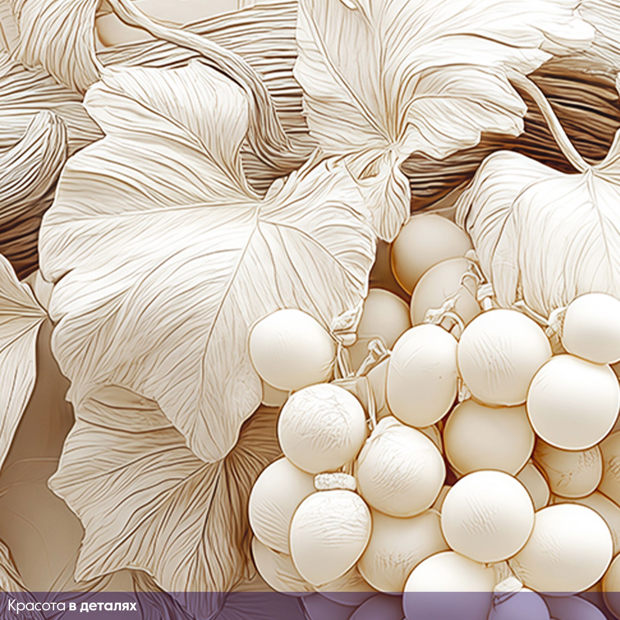 Эти фотообои — истинное воплощение утончённой природной эстетики, способное превратить любую стену в произведение искусства. Центральным элементом композиции стала изящная виноградная лоза, словно вылепленная из благородного гипса или мрамора. Её изогнутые ветви раскинулись по полотну, создавая ощущение лёгкости и естественной гармонии. Особую изысканность придаёт монохромная гамма в нежных бежево-кремовых оттенках. Листья, окружающие гроздья, прорисованы с филигранной точностью: видны прожилки, лёгкие изгибы, естественная асимметрия, характерная для живой природы. Фон обоев выполнен в виде едва заметных рельефных линий, напоминающих структуру натурального камня или штукатурки. Эта деталь добавляет глубины и подчёркивает трёхмерность основного рисунка. Благодаря такому сочетанию создаётся эффект барельефа — изображение будто выступает из стены, оживляя пространство. Фотообои идеально подойдут для интерьеров в классическом, неоклассическом или современном стиле. Они станут изысканным акцентом в гостиной, столовой, спальне или даже в элегантной кухне.