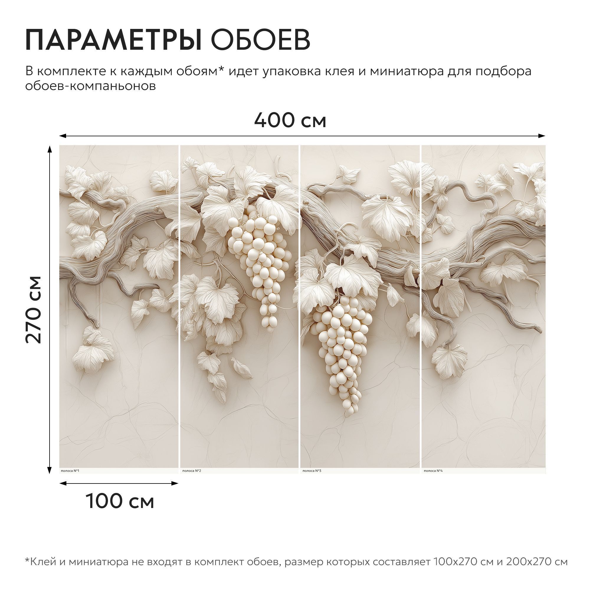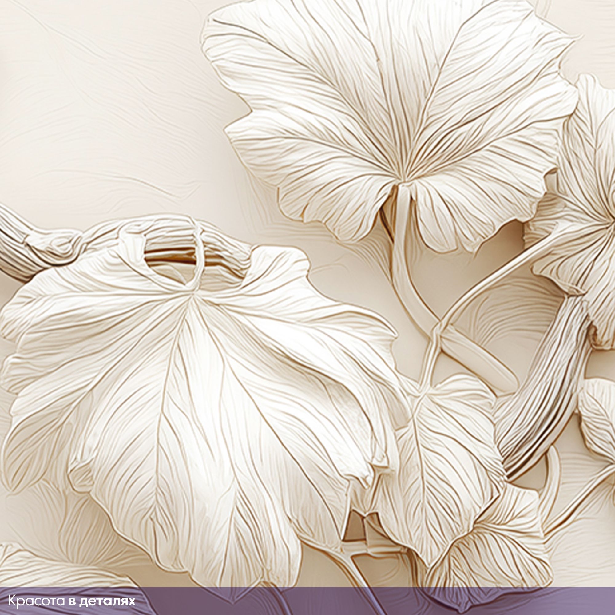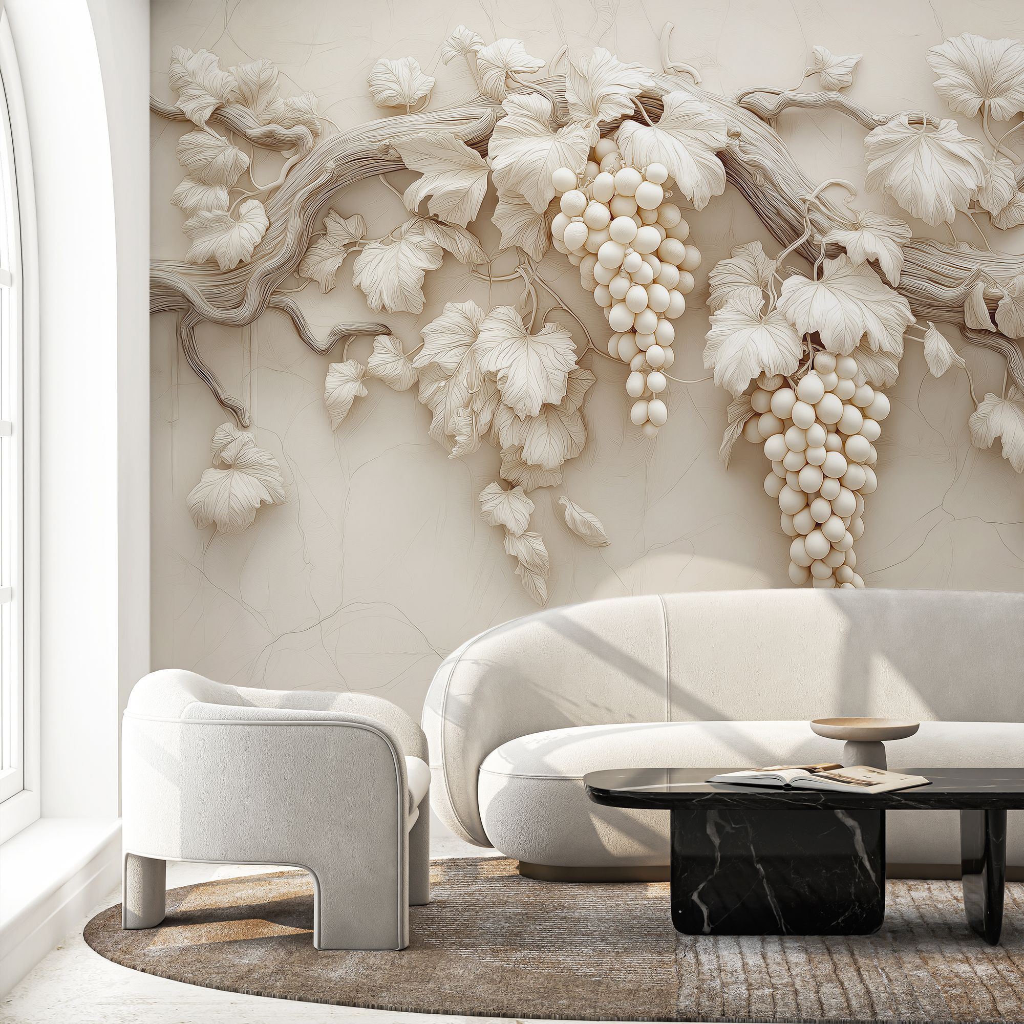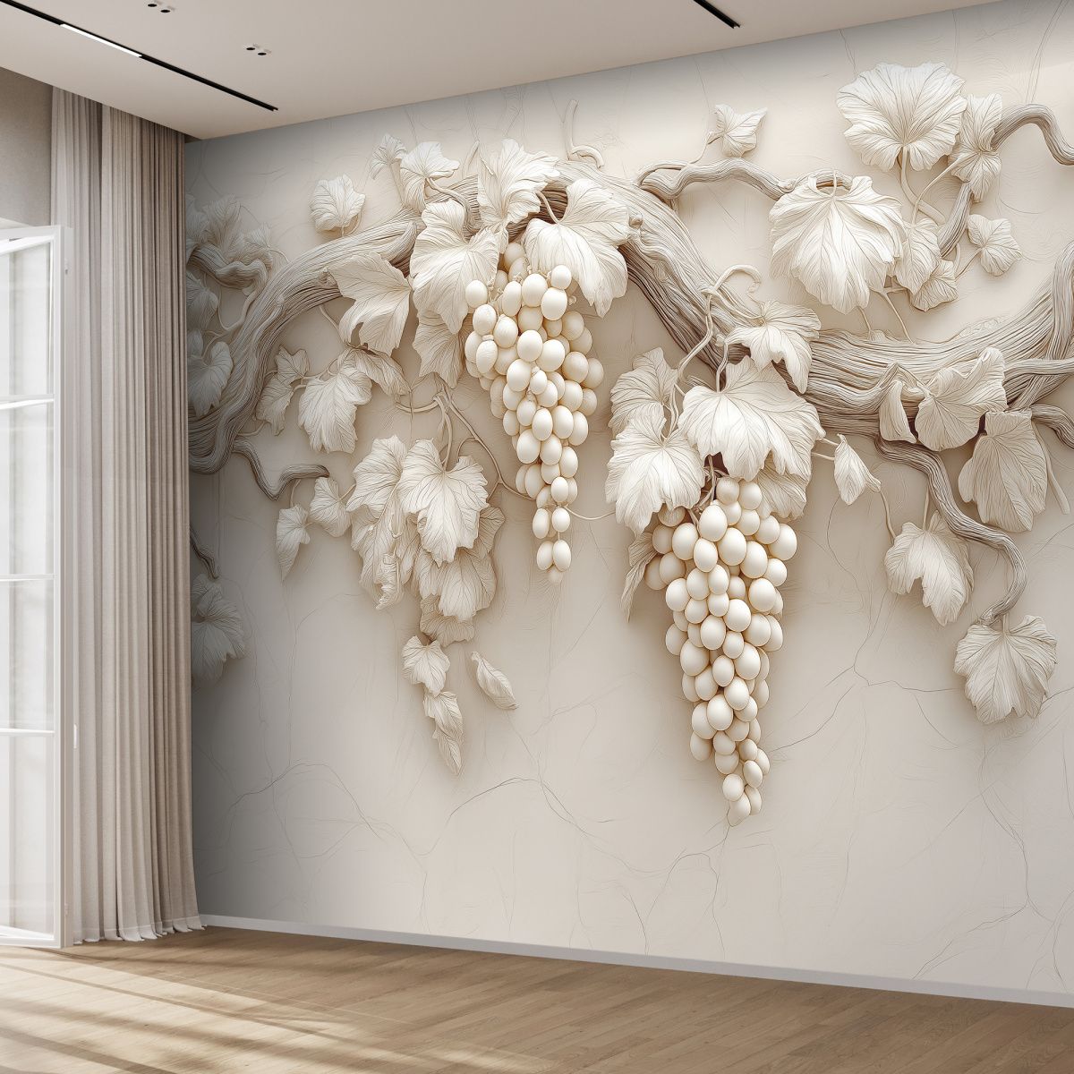 Эти фотообои — истинное воплощение утончённой природной эстетики, способное превратить любую стену в произведение искусства. Центральным элементом композиции стала изящная виноградная лоза, словно вылепленная из благородного гипса или мрамора. Её изогнутые ветви раскинулись по полотну, создавая ощущение лёгкости и естественной гармонии. Особую изысканность придаёт монохромная гамма в нежных бежево-кремовых оттенках. Листья, окружающие гроздья, прорисованы с филигранной точностью: видны прожилки, лёгкие изгибы, естественная асимметрия, характерная для живой природы. Фон обоев выполнен в виде едва заметных рельефных линий, напоминающих структуру натурального камня или штукатурки. Эта деталь добавляет глубины и подчёркивает трёхмерность основного рисунка. Благодаря такому сочетанию создаётся эффект барельефа — изображение будто выступает из стены, оживляя пространство. Фотообои идеально подойдут для интерьеров в классическом, неоклассическом или современном стиле. Они станут изысканным акцентом в гостиной, столовой, спальне или даже в элегантной кухне.