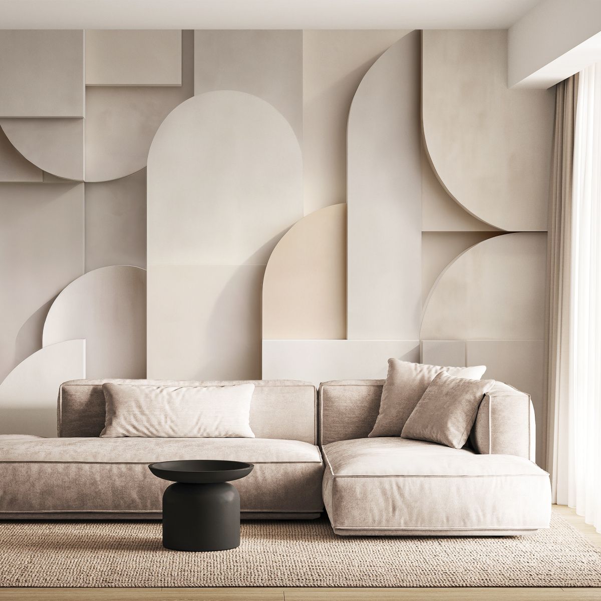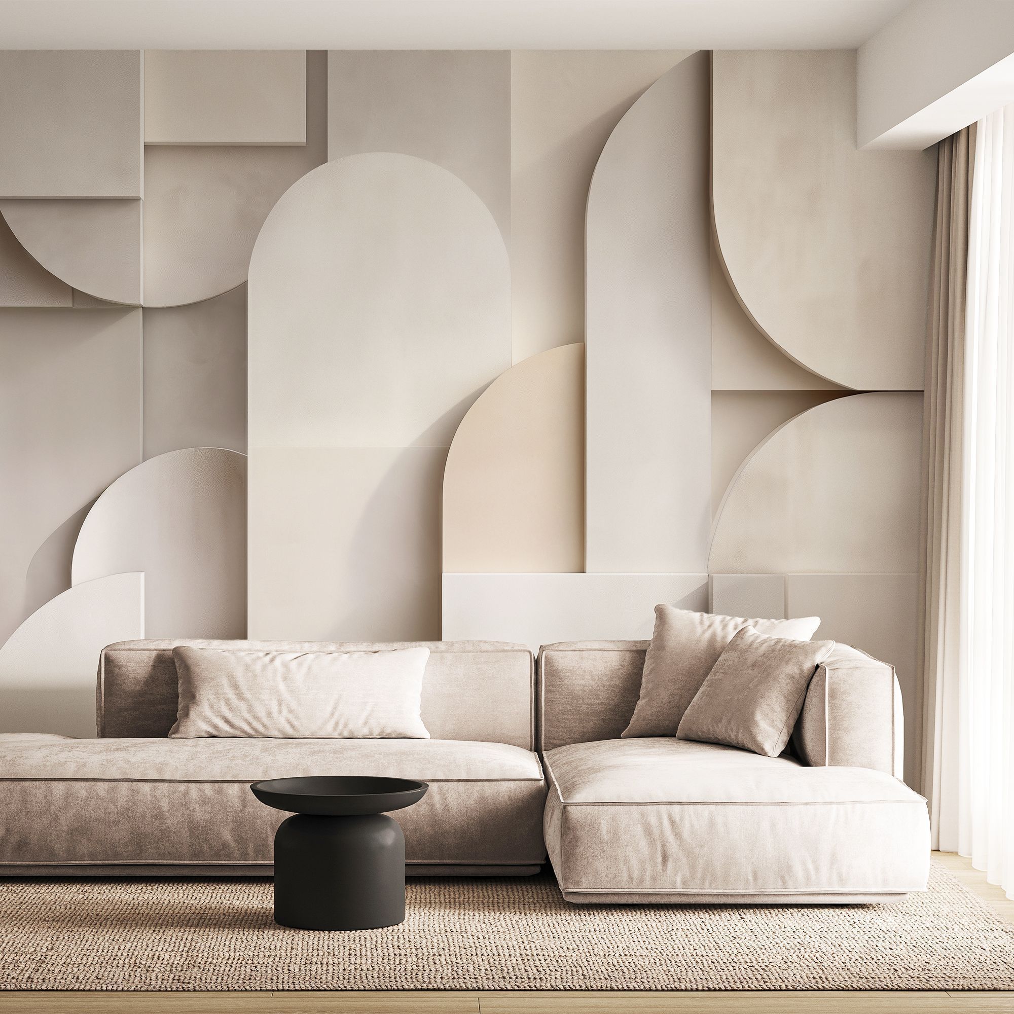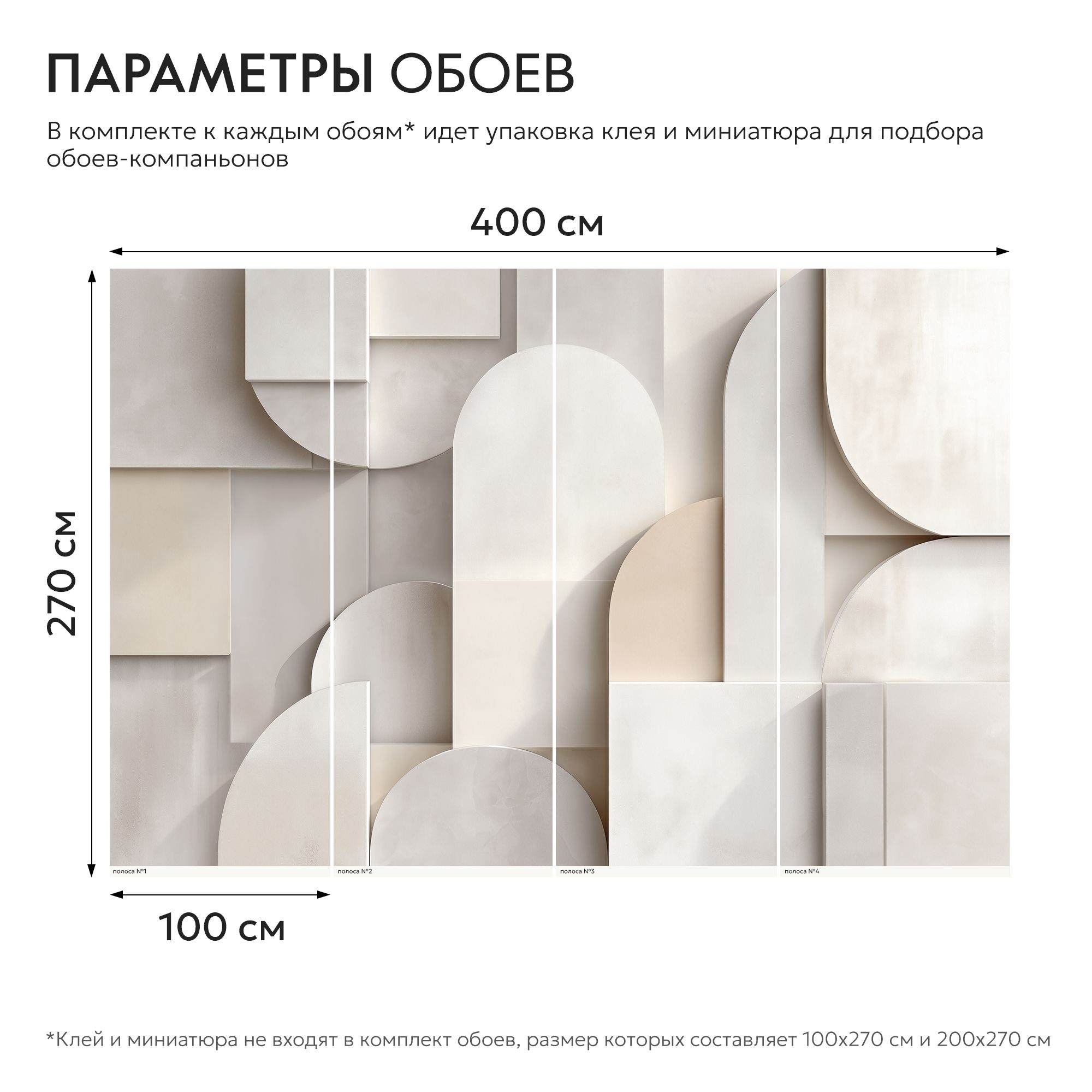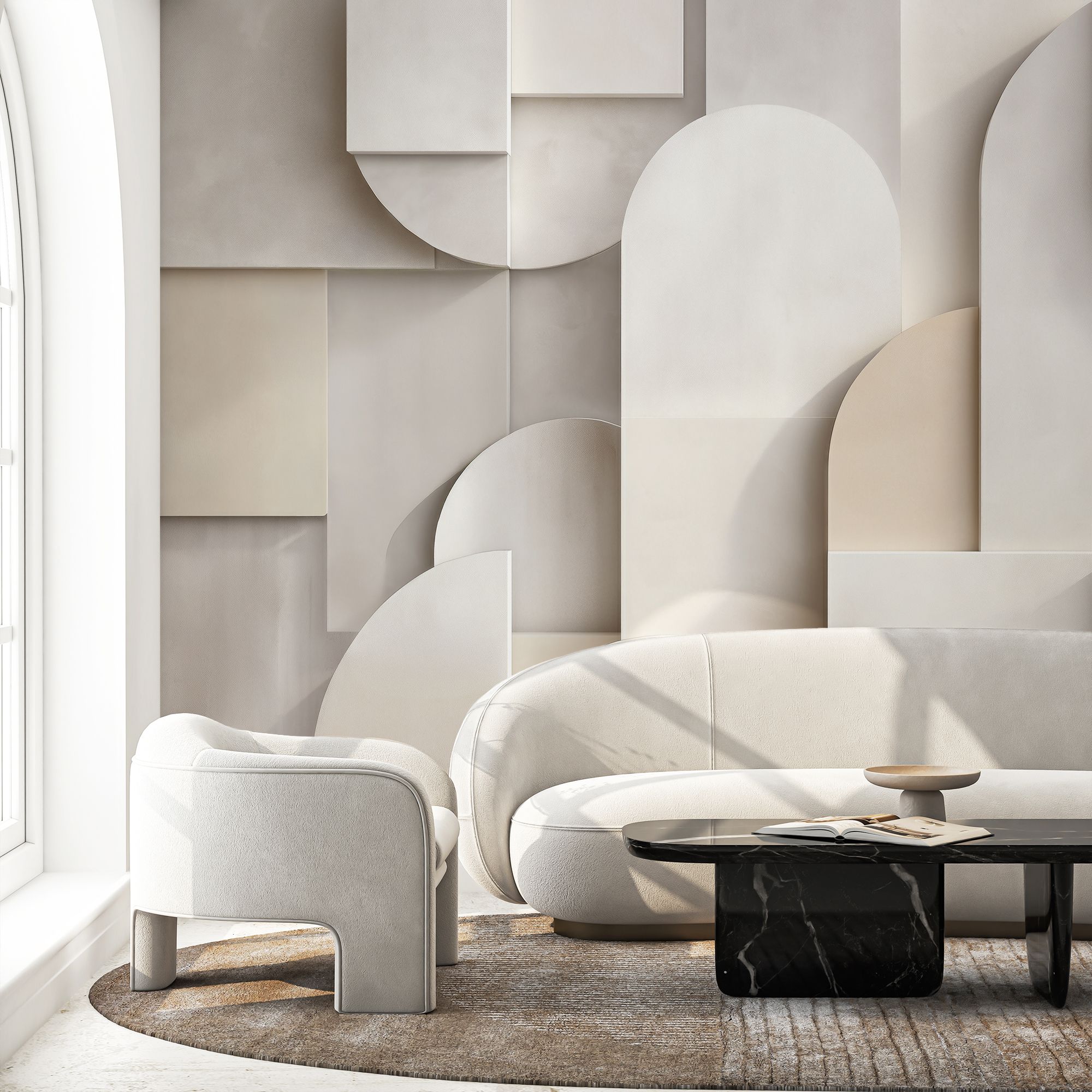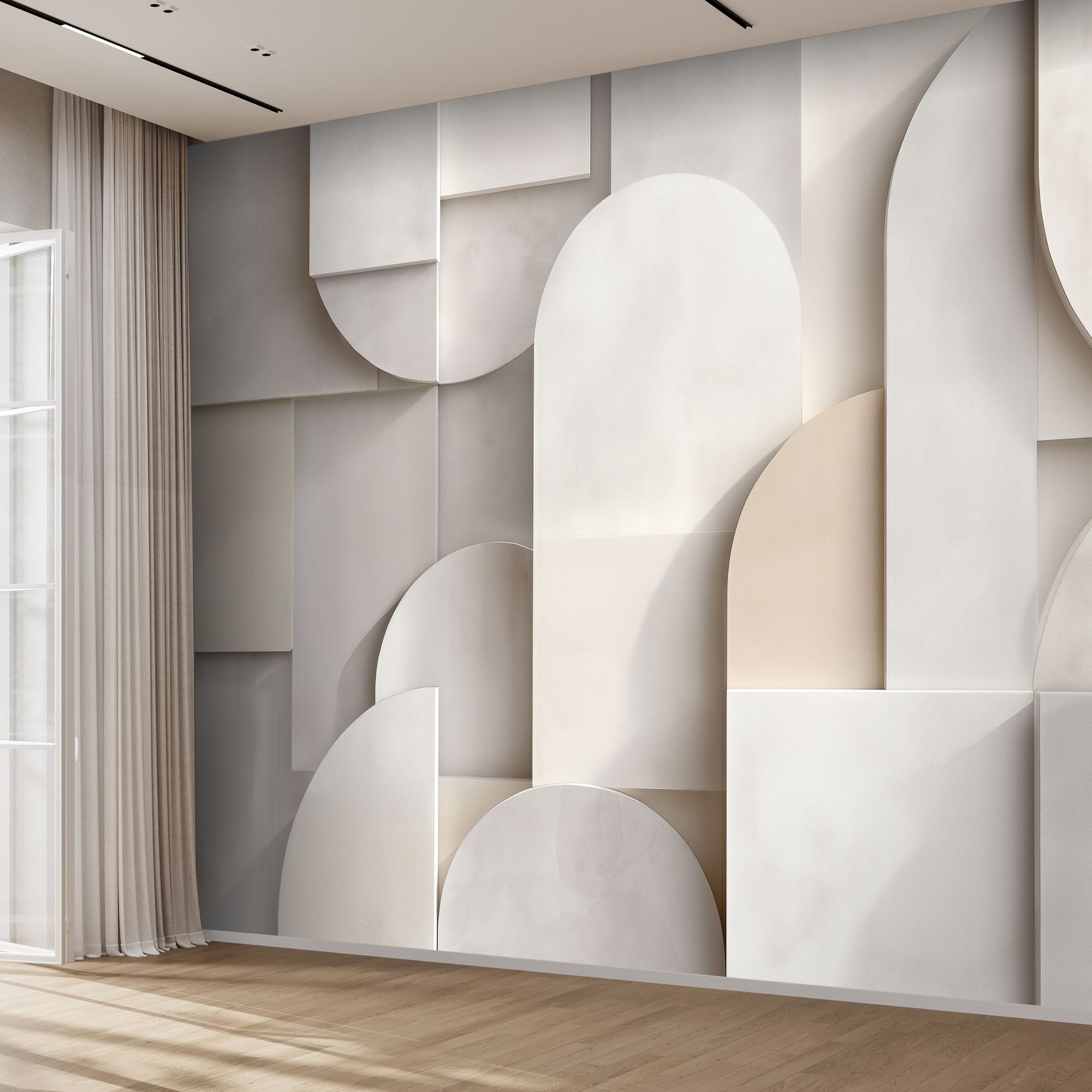 Эти фотообои представляют собой изысканное сочетание геометрии и нежной пастельной палитры. Мягкие оттенки белого, бежевого и кремового создают воздушную и светлую атмосферу, придавая стене ощущение лёгкости и простора. Объёмные формы — прямоугольники, круги и арки — словно наложены друг на друга в трехмерном пространстве, создавая эффект глубины и тактильной фактуры. Дизайн идеально впишется в современные интерьеры в стиле минимализм, скандинавский или арт-деко, подчеркивая изящество и гармонию пространства. Эти фотообои способны стать центральным акцентом комнаты, добавляя ей утонченность и визуальный интерес без излишней пестроты.