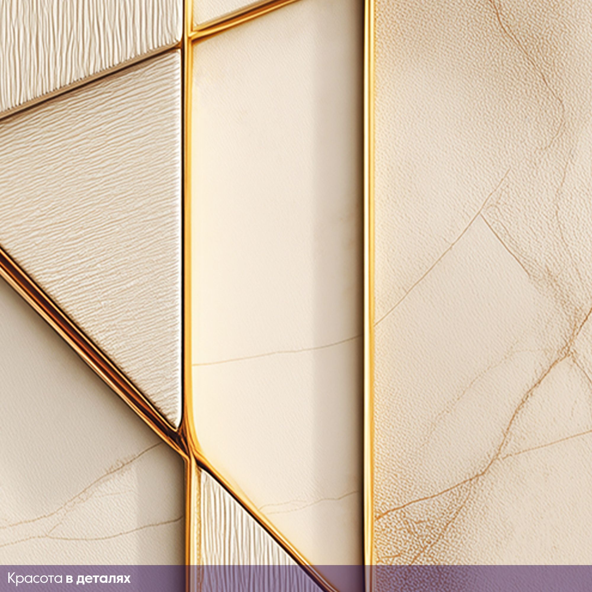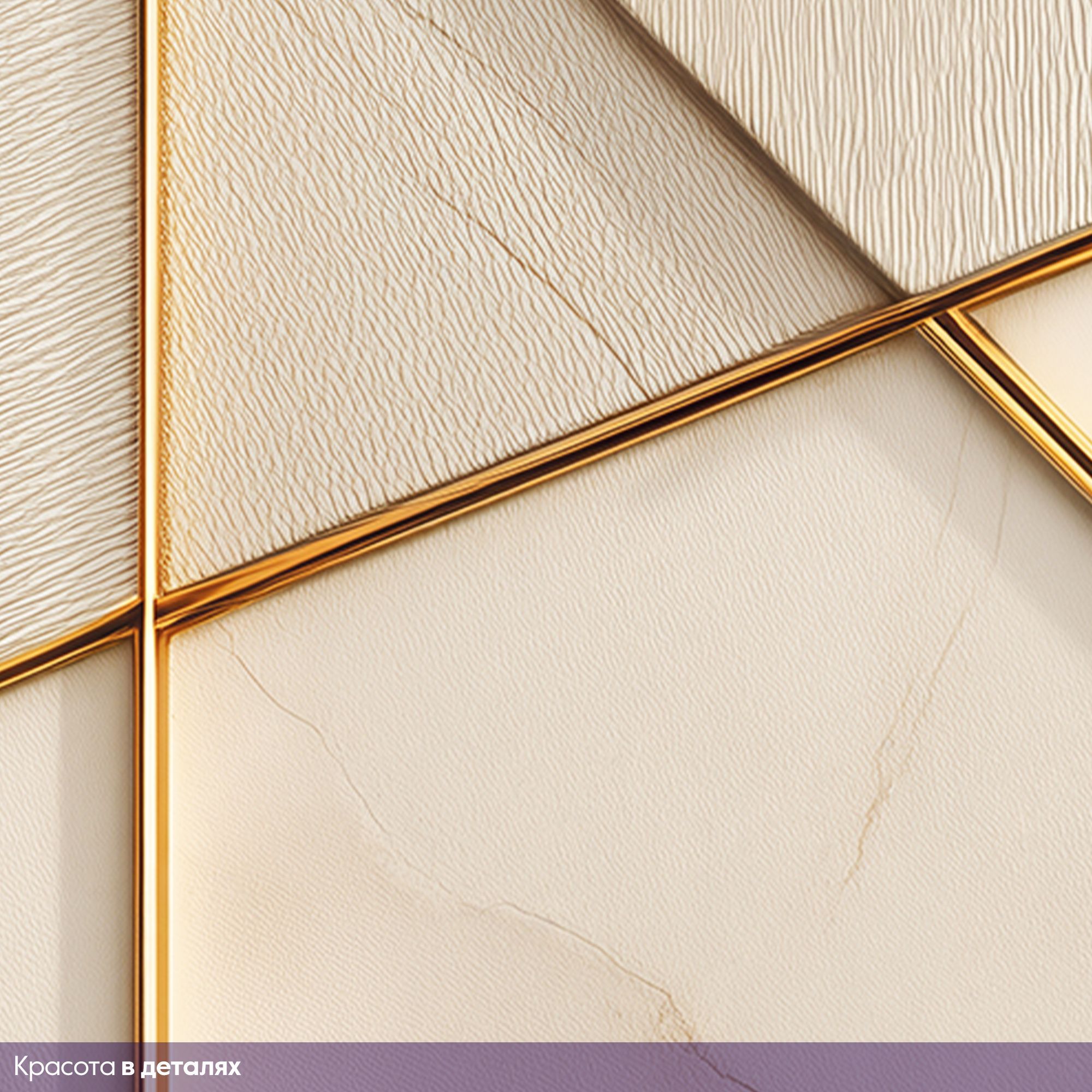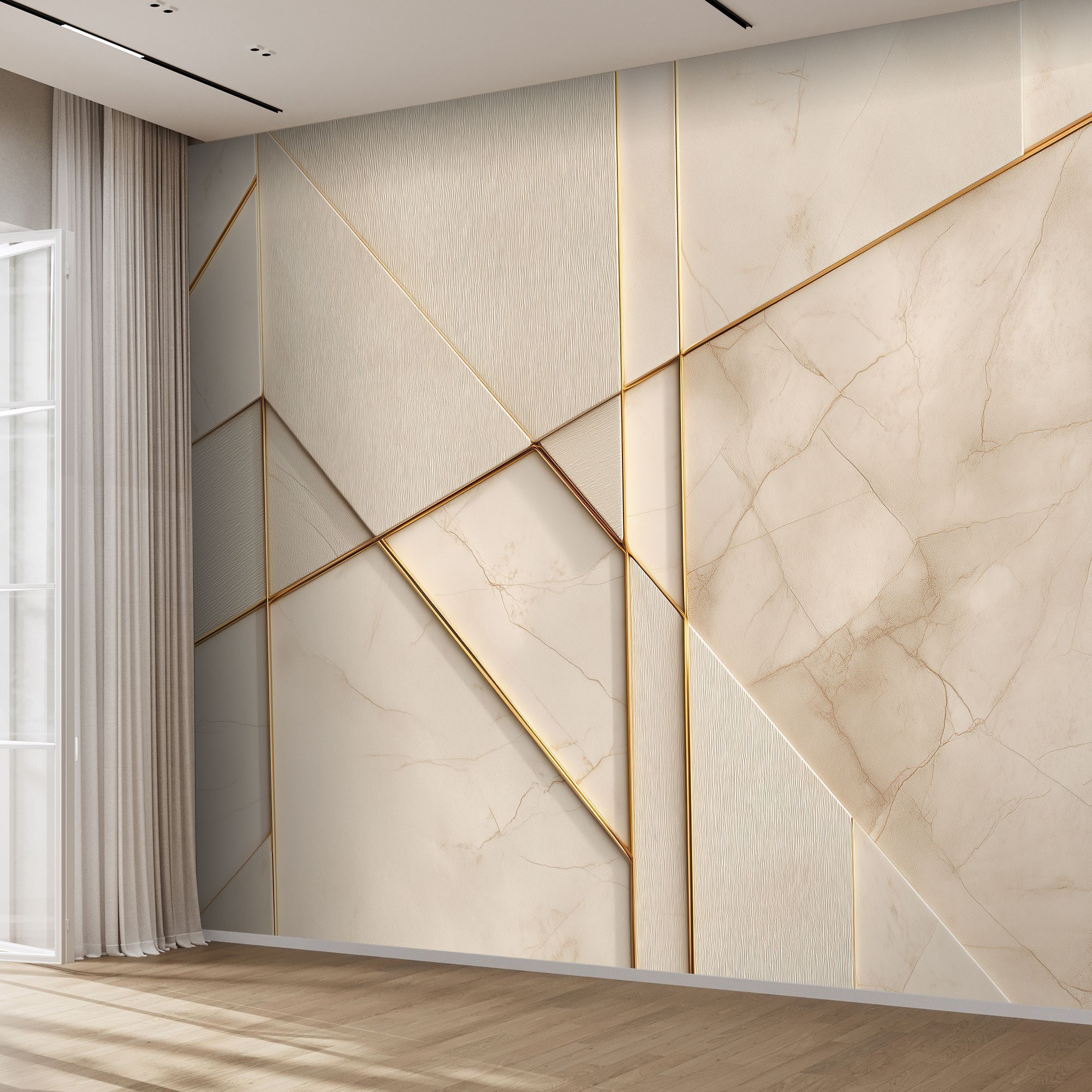 Эти фотообои — воплощение современной роскоши и утончённой геометрии. Дизайн сочетает в себе благородную мраморную фактуру в нежных бежево-кремовых оттенках и изящные золотые линии, создающие динамичный, но сдержанный узор. Мраморная основа: фон имитирует высококачественный мрамор с тонкими природными прожилками, придавая стене ощущение глубины и текстуры. Тёплые бежевые тона создают атмосферу уюта и элегантности. Пересекающиеся золотые линии формируют сложную, но гармоничную структуру. Диагональные и вертикальные элементы создают иллюзию трёхмерности, визуально «оживляют» поверхность стены. Часть панелей выполнена с лёгкой текстурой, напоминающей шлифованный камень или ткань, что добавляет дизайну тактильного интереса. Тонкие, но выразительные линии из «золота» служат изысканным украшением, подчёркивают геометрию и придают интерьеру нотку аристократизма. Не смотря на сложность композиции, дизайн остаётся лаконичным — без излишеств, но с выразительным характером. Сочетание мрамора и золота — классика, которая никогда не выходит из моды, а современная геометрическая интерпретация делает дизайн актуальным и оригинальным.