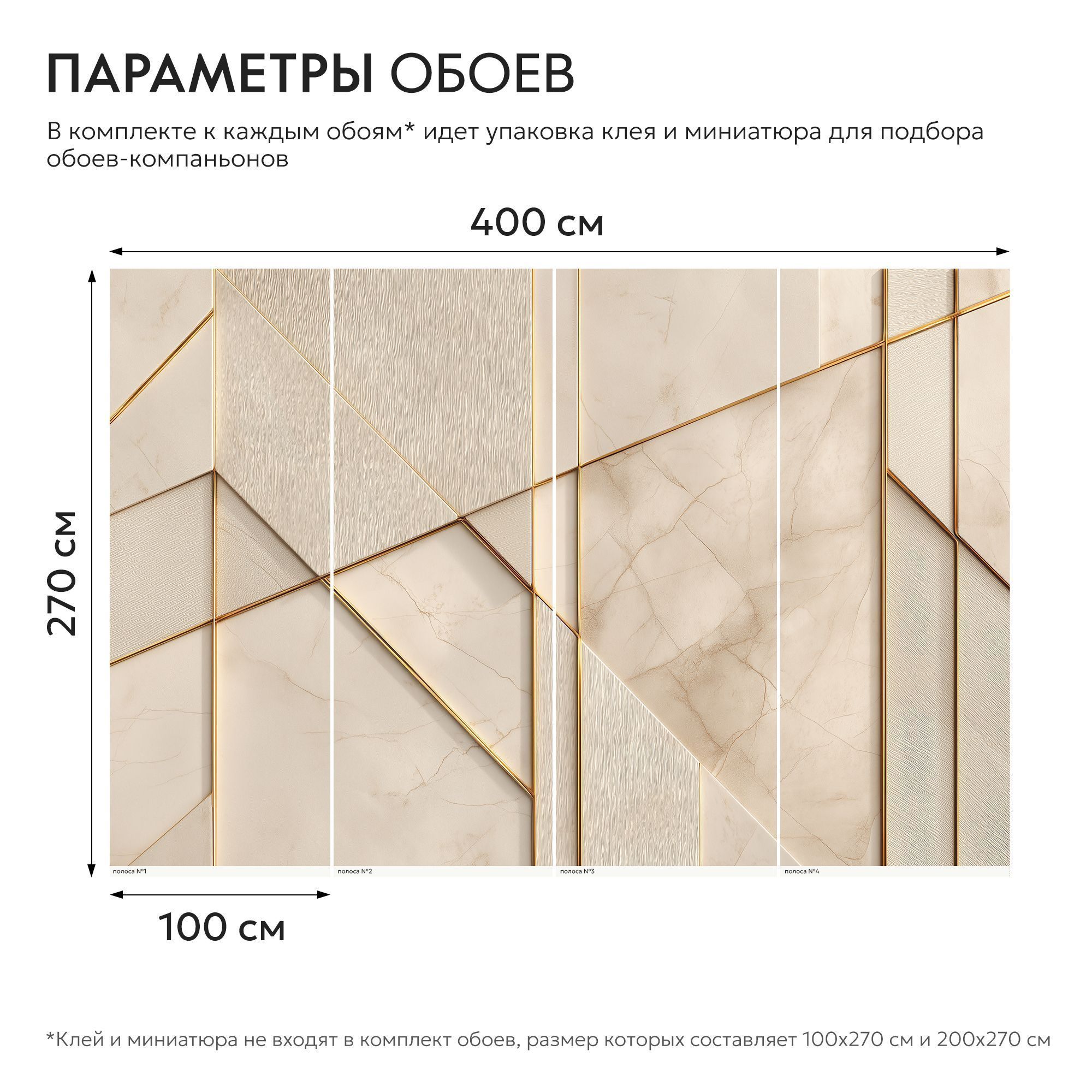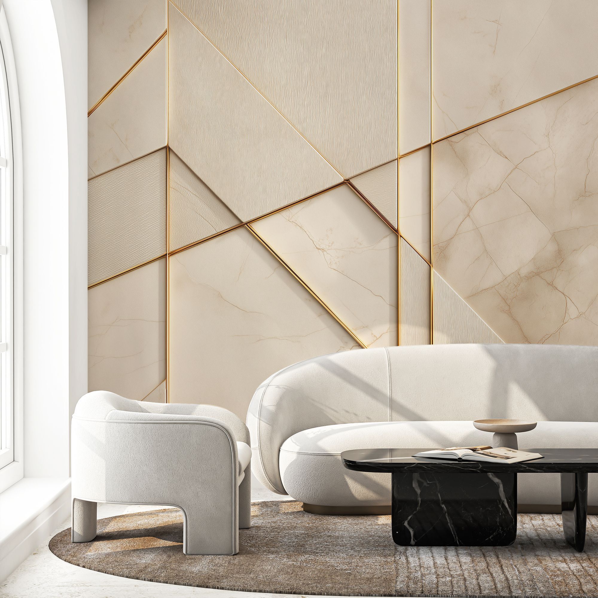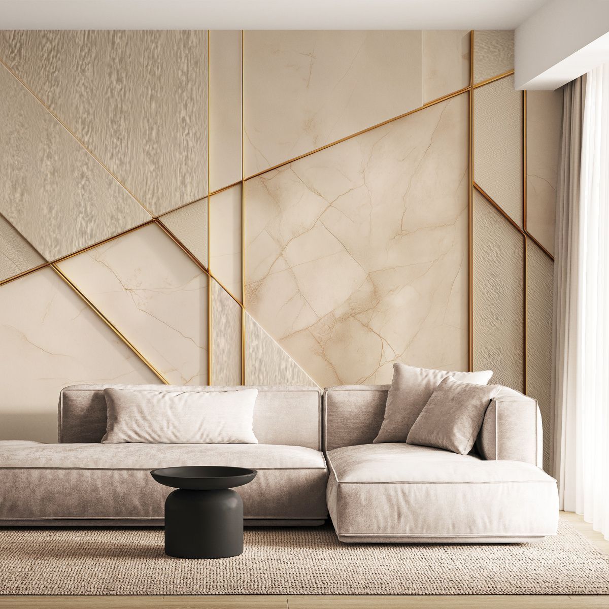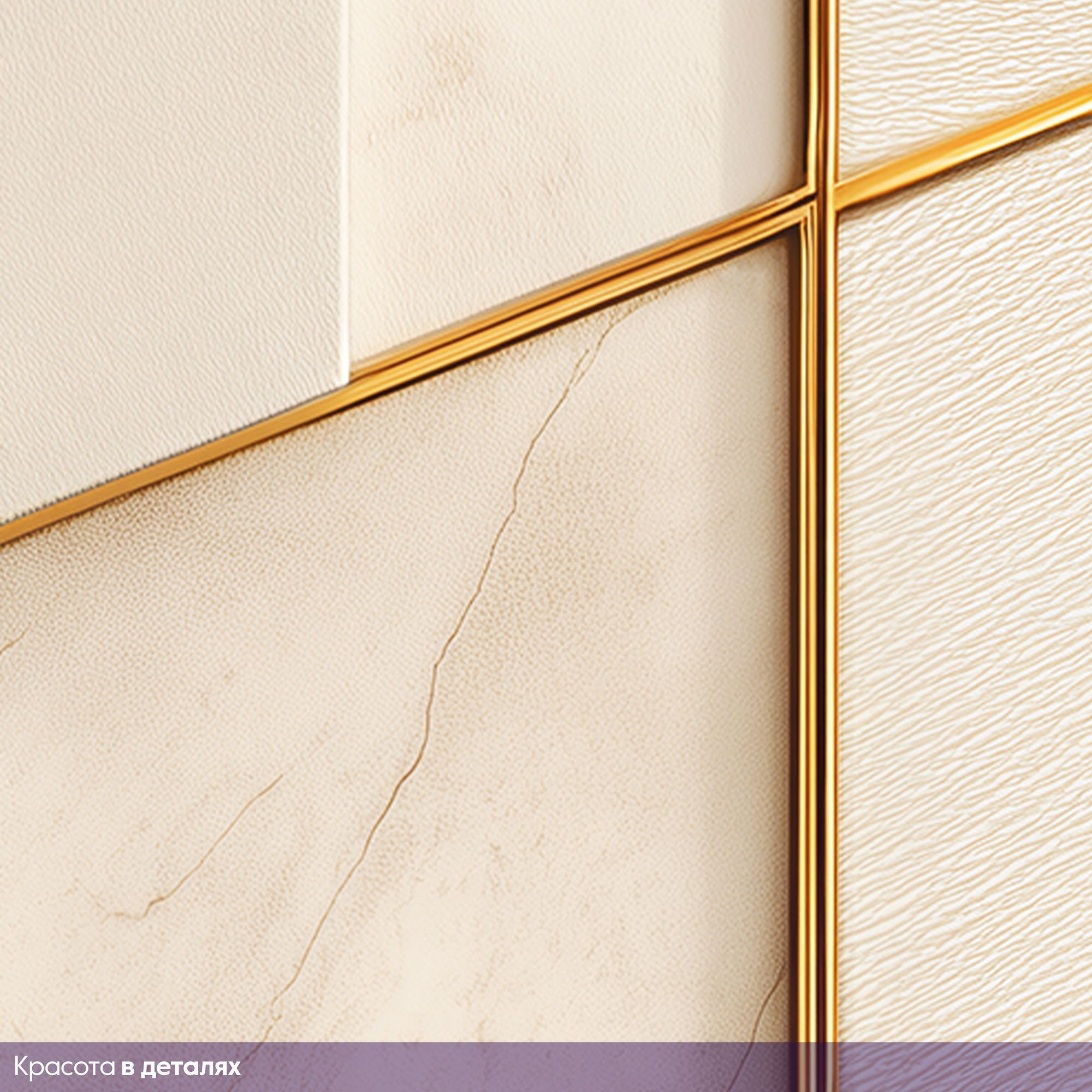 Эти фотообои — воплощение современной роскоши и утончённой геометрии. Дизайн сочетает в себе благородную мраморную фактуру в нежных бежево-кремовых оттенках и изящные золотые линии, создающие динамичный, но сдержанный узор. Мраморная основа: фон имитирует высококачественный мрамор с тонкими природными прожилками, придавая стене ощущение глубины и текстуры. Тёплые бежевые тона создают атмосферу уюта и элегантности. Пересекающиеся золотые линии формируют сложную, но гармоничную структуру. Диагональные и вертикальные элементы создают иллюзию трёхмерности, визуально «оживляют» поверхность стены. Часть панелей выполнена с лёгкой текстурой, напоминающей шлифованный камень или ткань, что добавляет дизайну тактильного интереса. Тонкие, но выразительные линии из «золота» служат изысканным украшением, подчёркивают геометрию и придают интерьеру нотку аристократизма. Не смотря на сложность композиции, дизайн остаётся лаконичным — без излишеств, но с выразительным характером. Сочетание мрамора и золота — классика, которая никогда не выходит из моды, а современная геометрическая интерпретация делает дизайн актуальным и оригинальным.