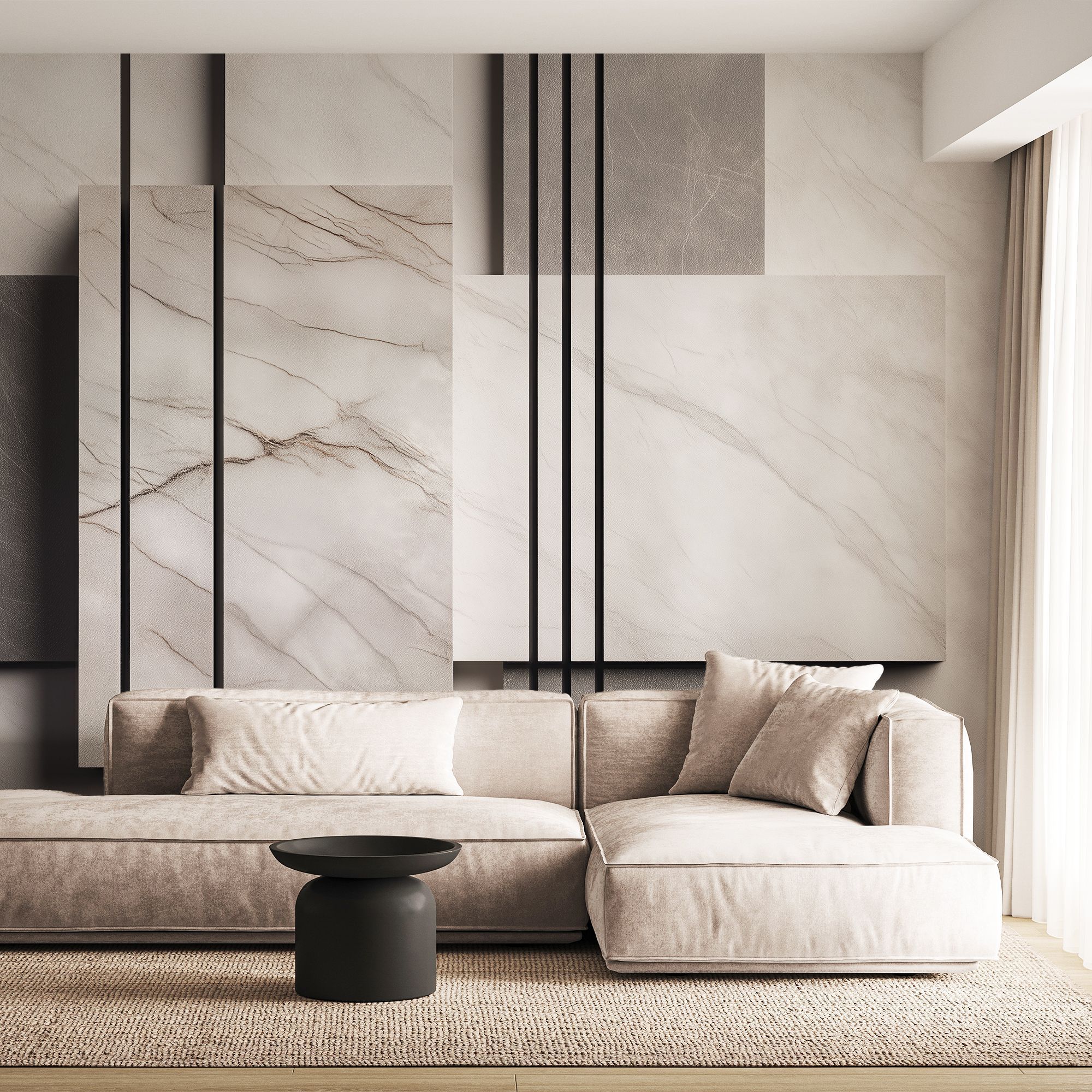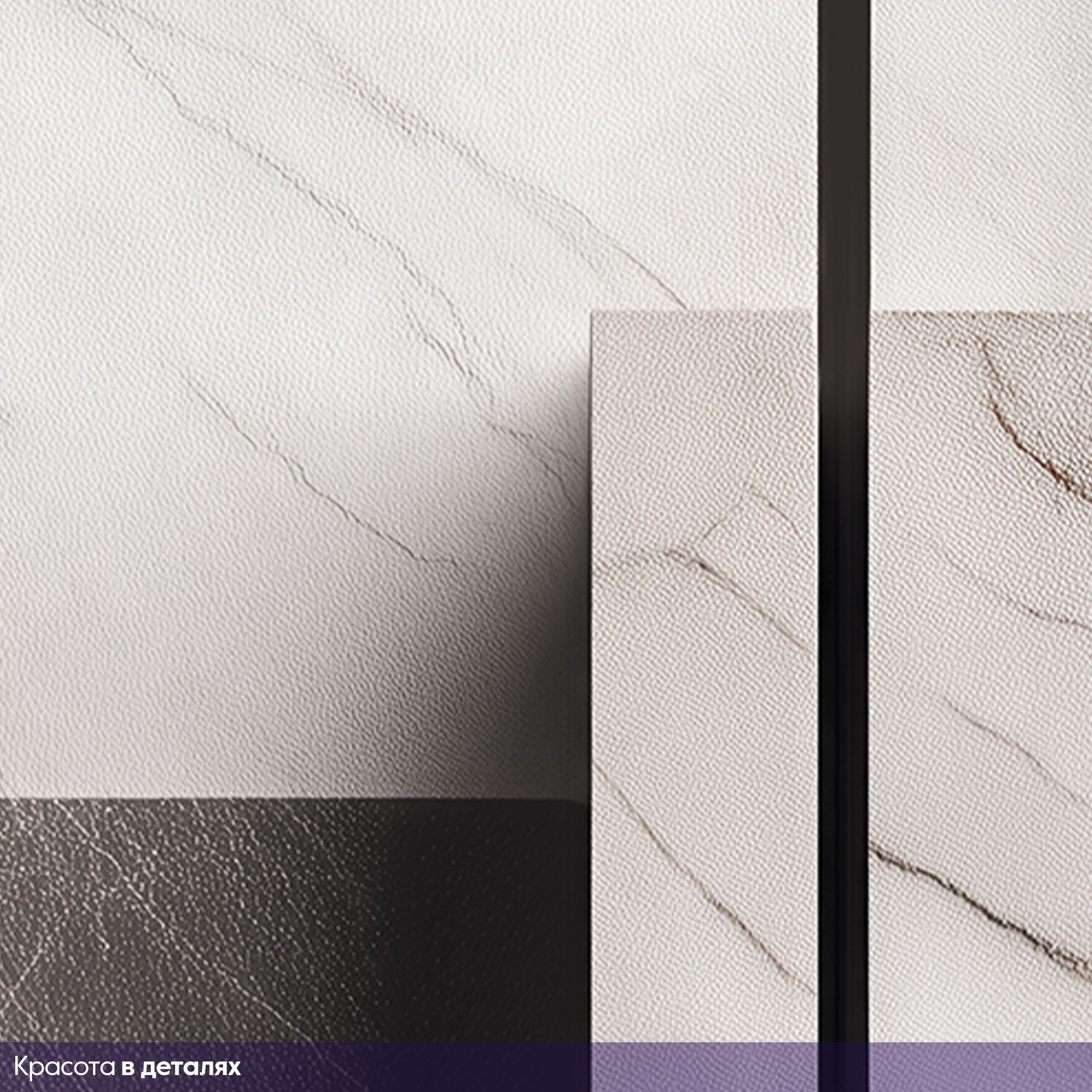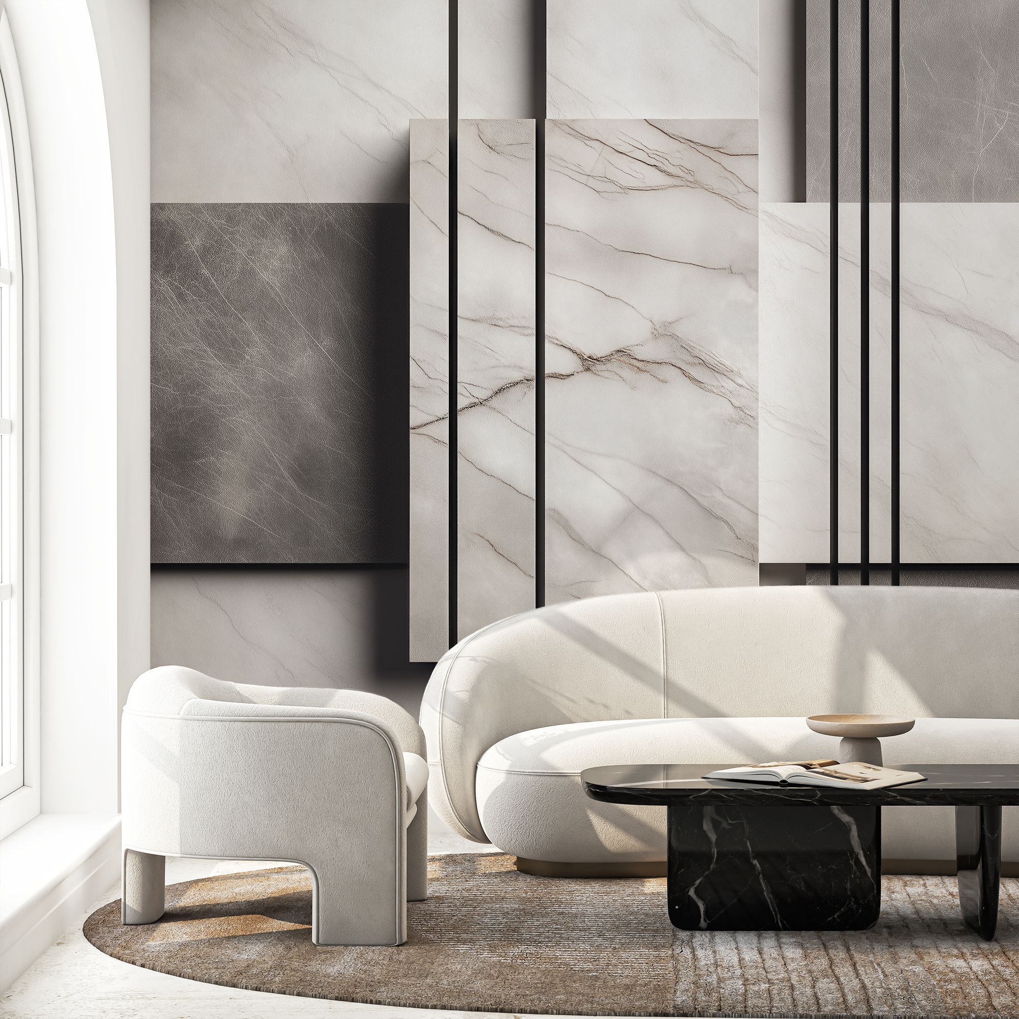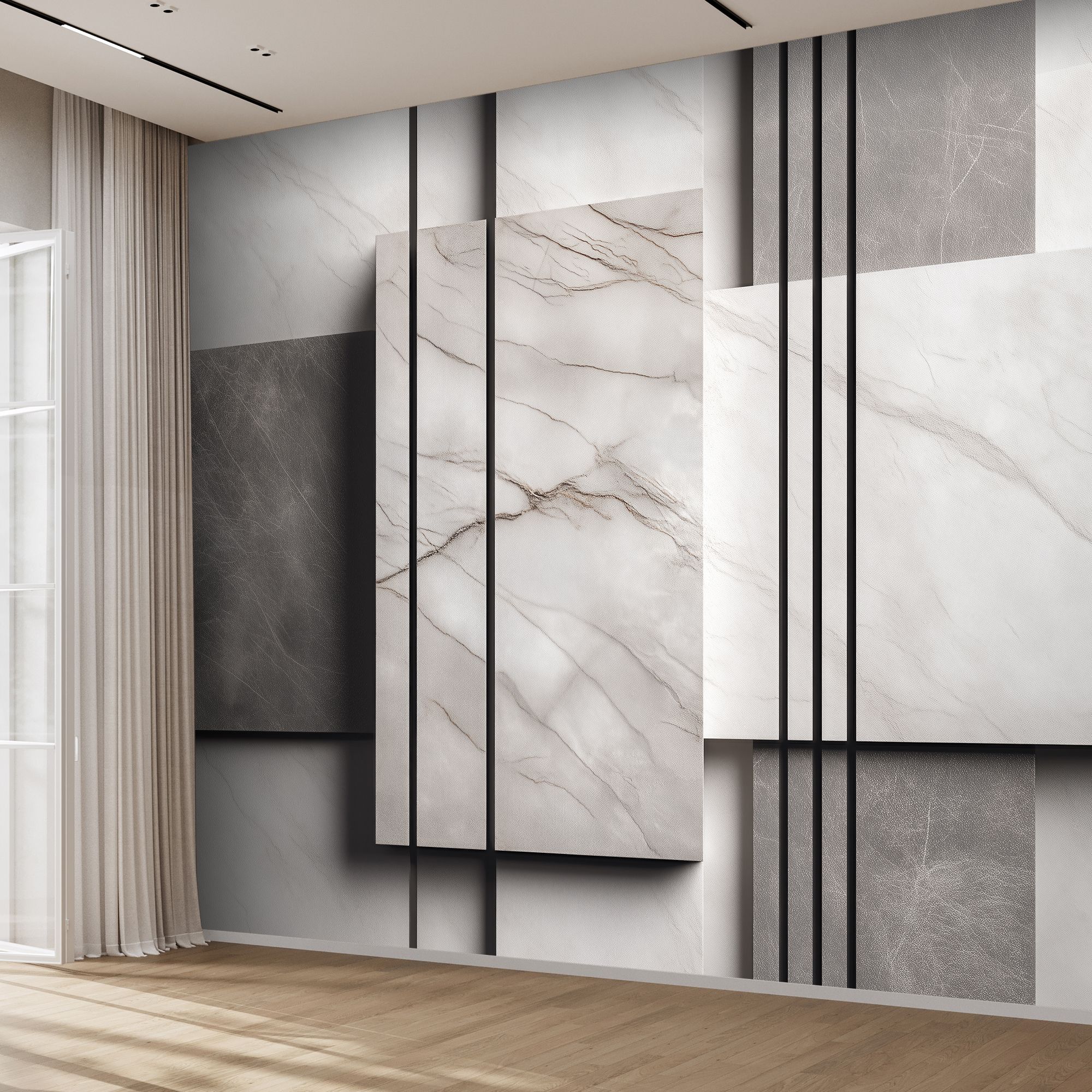 Эти фотообои выполнены в современном минималистическом стиле, вдохновлённые благородной текстурой натурального мрамора. Композиция сочетает плавные, естественные жилки на светло-серых и белоснежных поверхностях с чёткими графичными линиями чёрного цвета, создавая гармоничный контраст между органикой и геометрией. Игра пересечений горизонтальных и вертикальных плоскостей придаёт изображению объём и глубину, визуально расширяя пространство. Такие фотообои идеально подойдут для тех, кто ценит элегантность и сдержанность, стремится к лаконичному, но выразительному интерьеру. Это стильное решение подчеркнёт современную архитектуру, сделает помещение светлым и стильным, добавляя нотки роскоши и утончённой эстетики.