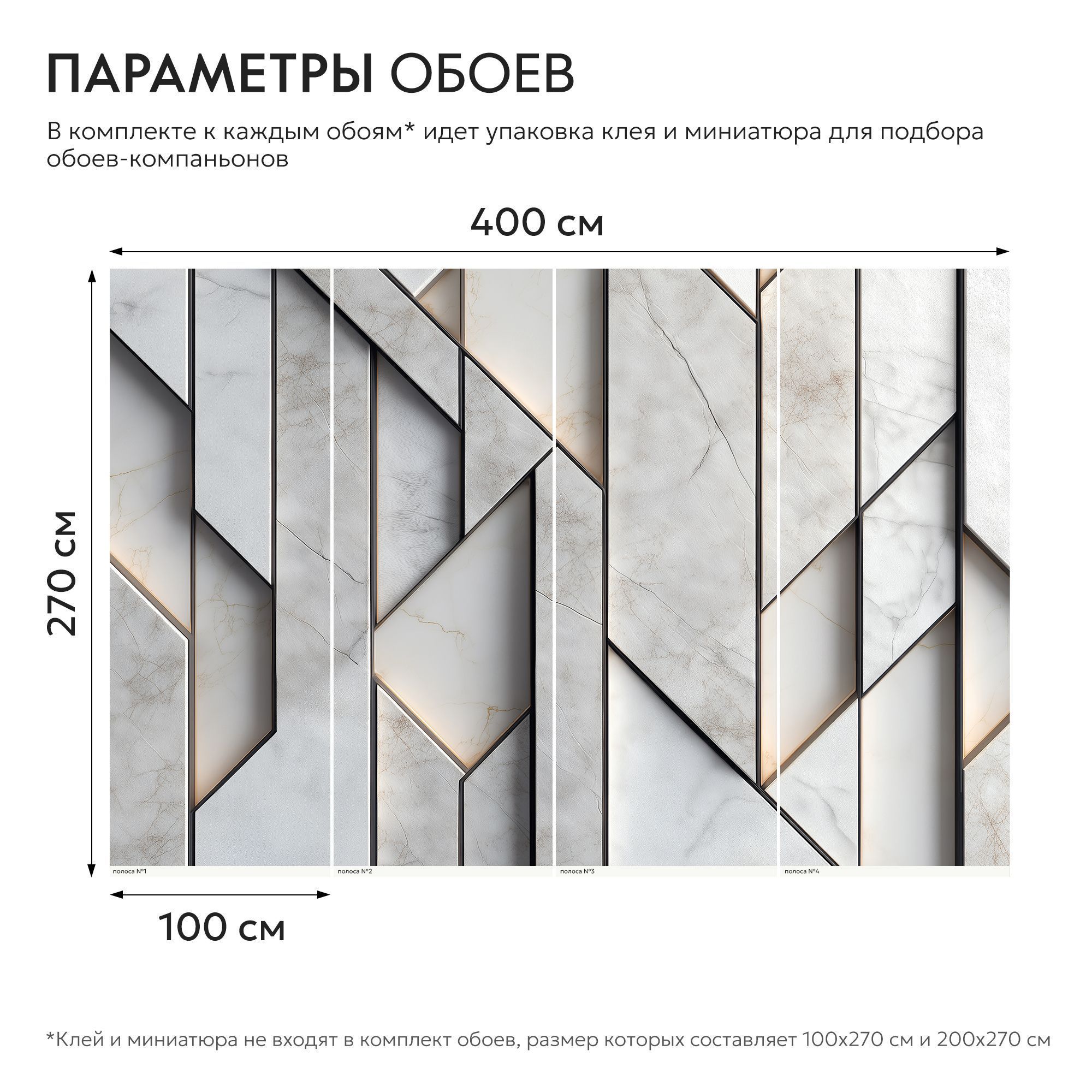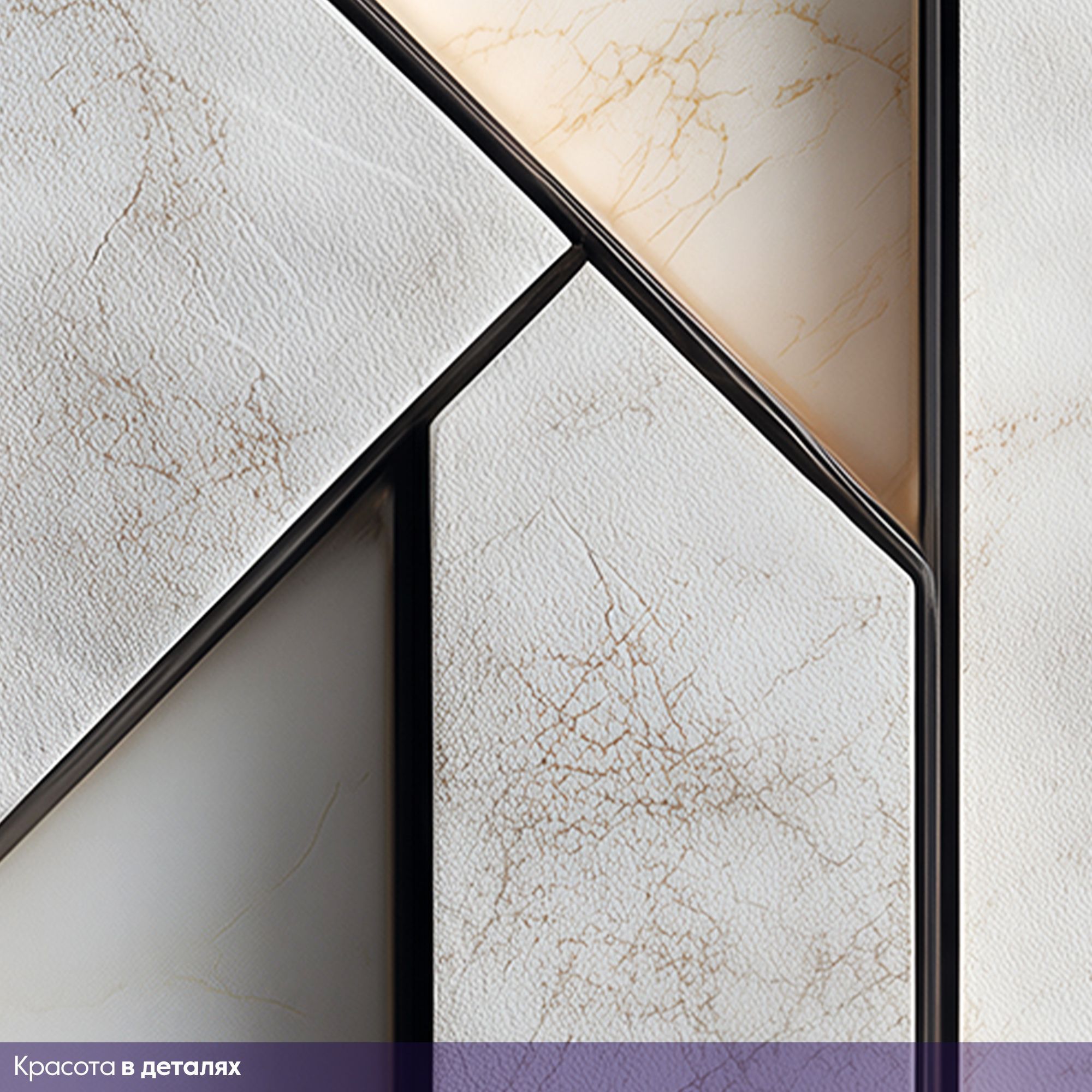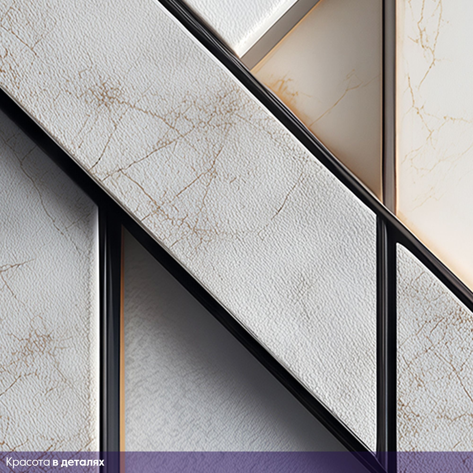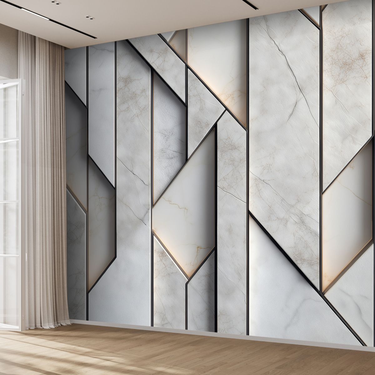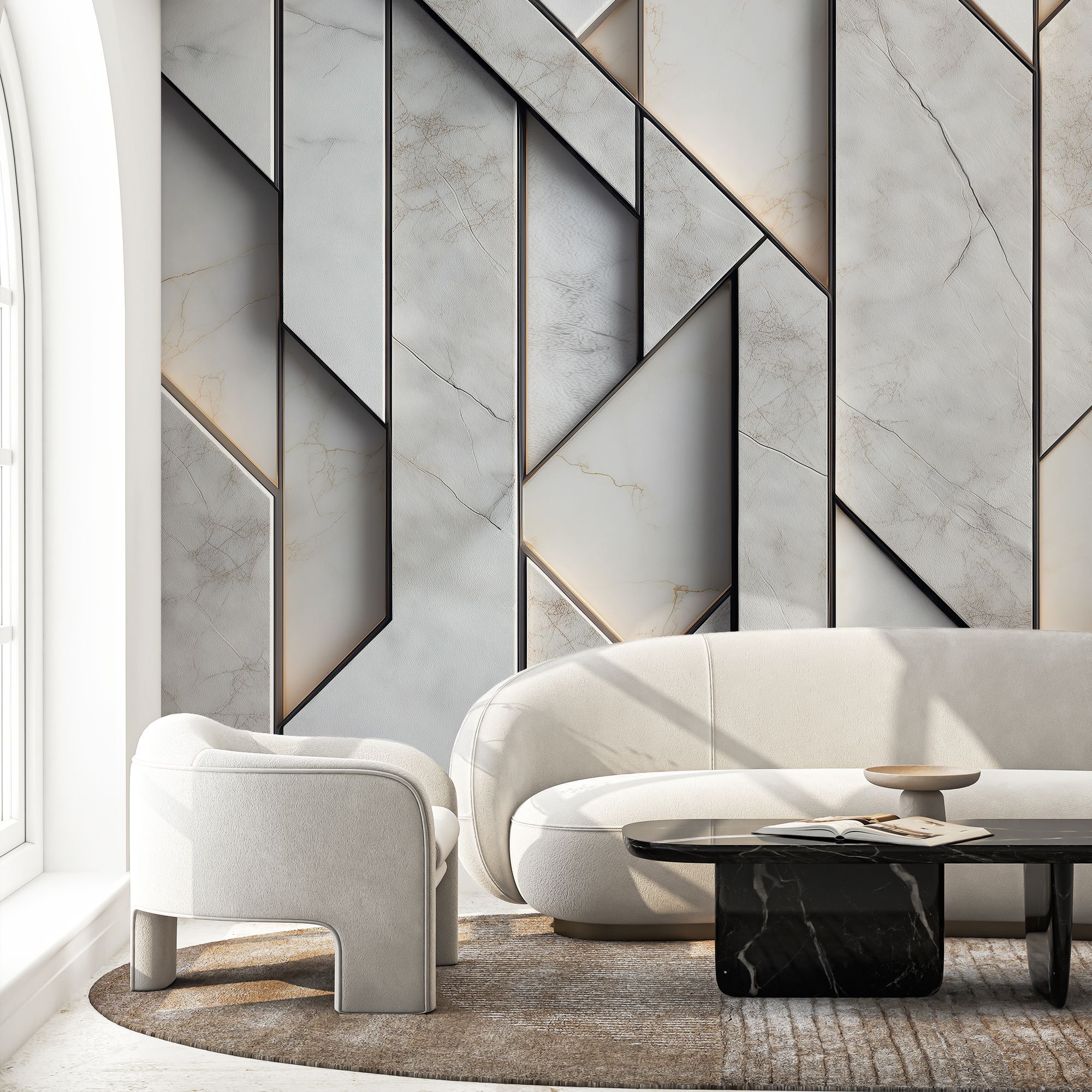 Эти фотообои представляют собой стильное сочетание современной геометрии и изящной текстуры мрамора. Композиция состоит из разнообразных треугольных и прямоугольных панелей с чёткими линиями и равномерными контурами, выполненных в мягких оттенках белого, серого и светло-бежевого с естественными прожилками мрамора. Тонкие тёмные рамки между сегментами добавляют глубину и акцентируют рисунок, создавая эффект объёмности и многослойности. Такие обои станут прекрасным решением для интерьеров в стиле минимализм, лофт или хай-тек, привнеся элегантность и ощущение чистоты пространства. Они подойдут для оформления гостиной, офиса или холла, придавая помещению современный, утончённый и дорогой вид.