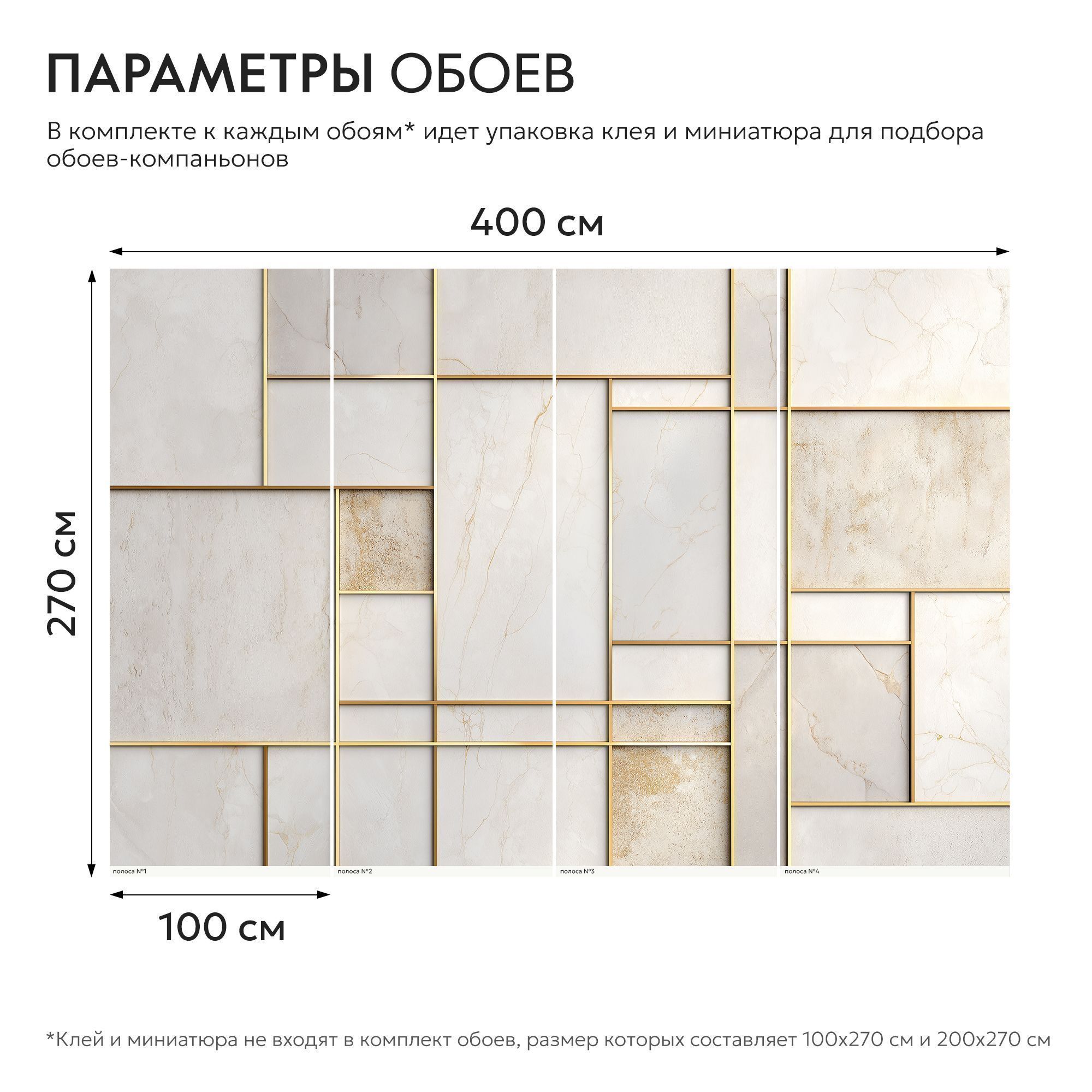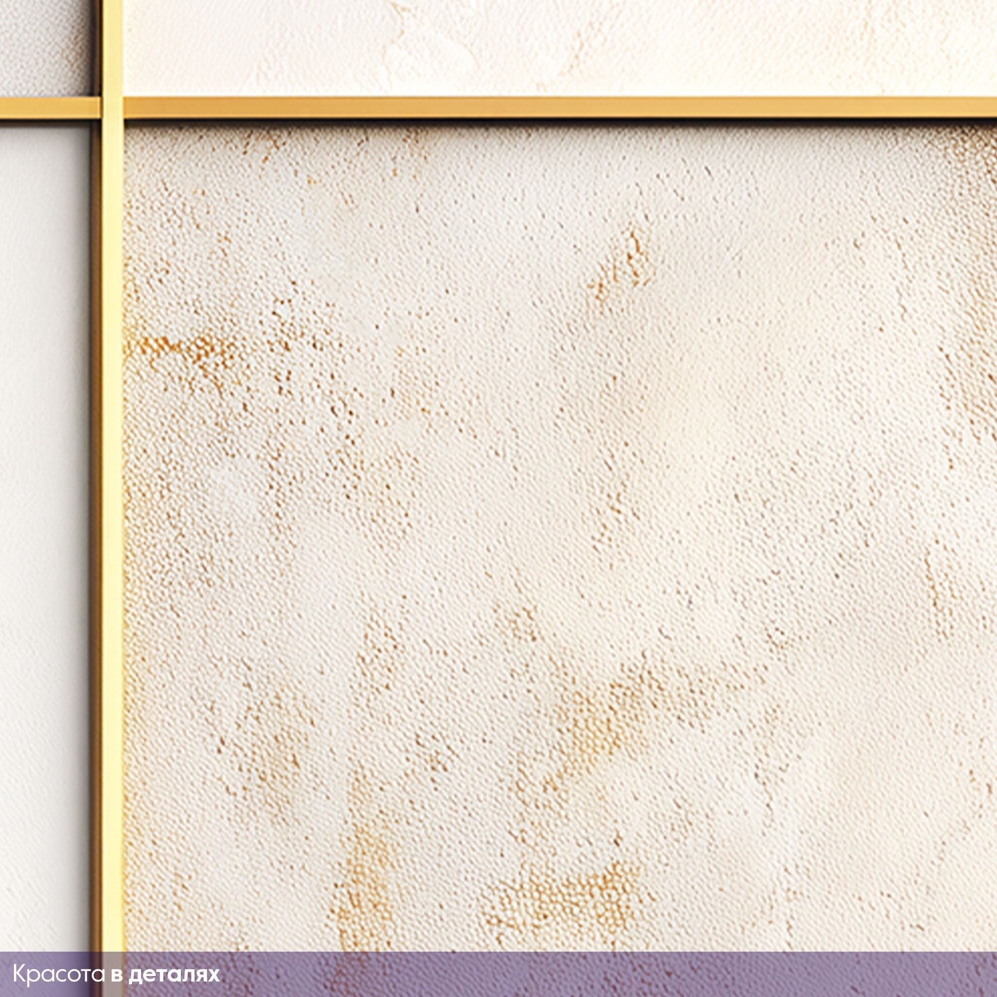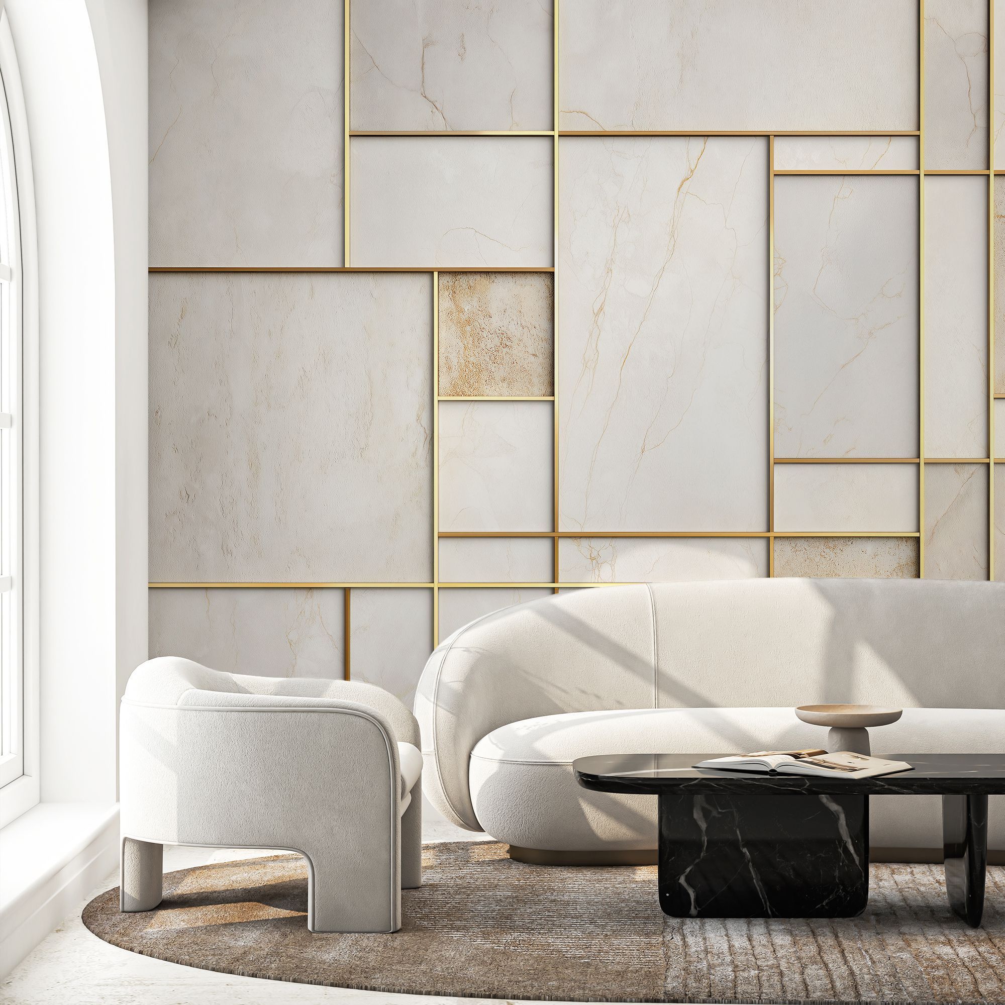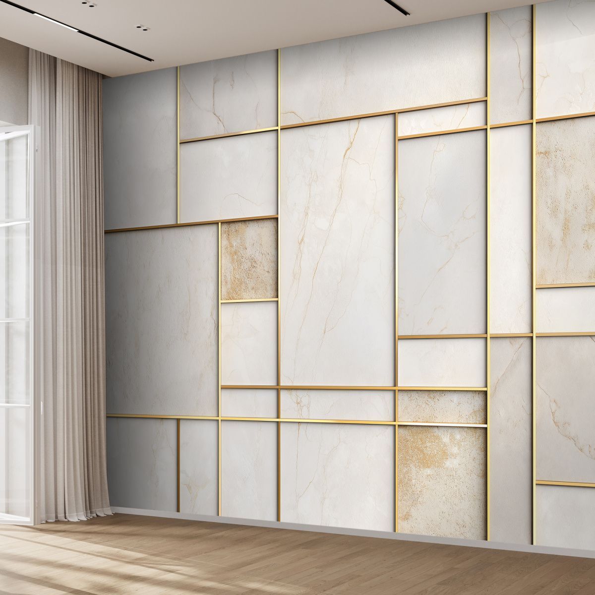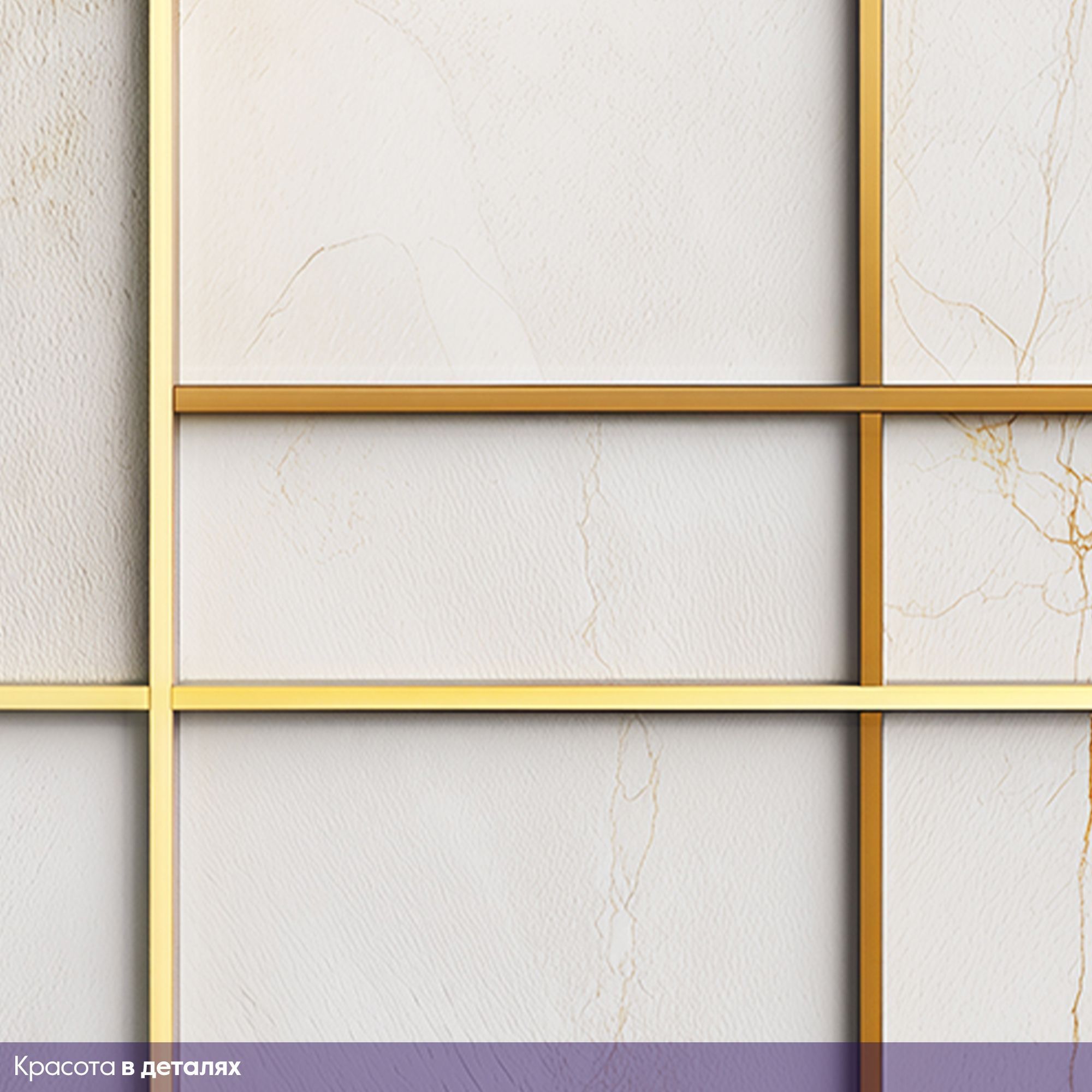 Эти фотообои — воплощение современной элегантности и утончённого минимализма. Изящная композиция имитирует облицовку стены мраморными панелями с благородными золотыми акцентами. Особенности дизайна: Мраморная фактура в светлых бежево-белых оттенках создаёт ощущение роскоши и чистоты, визуально расширяет пространство. Тонкие прожилки на «плитах» добавляют реалистичности и глубины. Геометрическая сетка из тонких золотых линий формирует динамичный, но сдержанный узор. Прямоугольные и квадратные сегменты разного размера создают игру ритма и объёма. Баланс контраста: сочетание холодного мрамора и тёплого золота выглядит гармонично, придаёт интерьеру статусность. Современный стиль: лаконичная композиция без излишеств подойдёт для самых разных дизайнерских решений — от классики до лофта. Будут уместны в гостиной; в прихожей; в кабинете; в спальне.