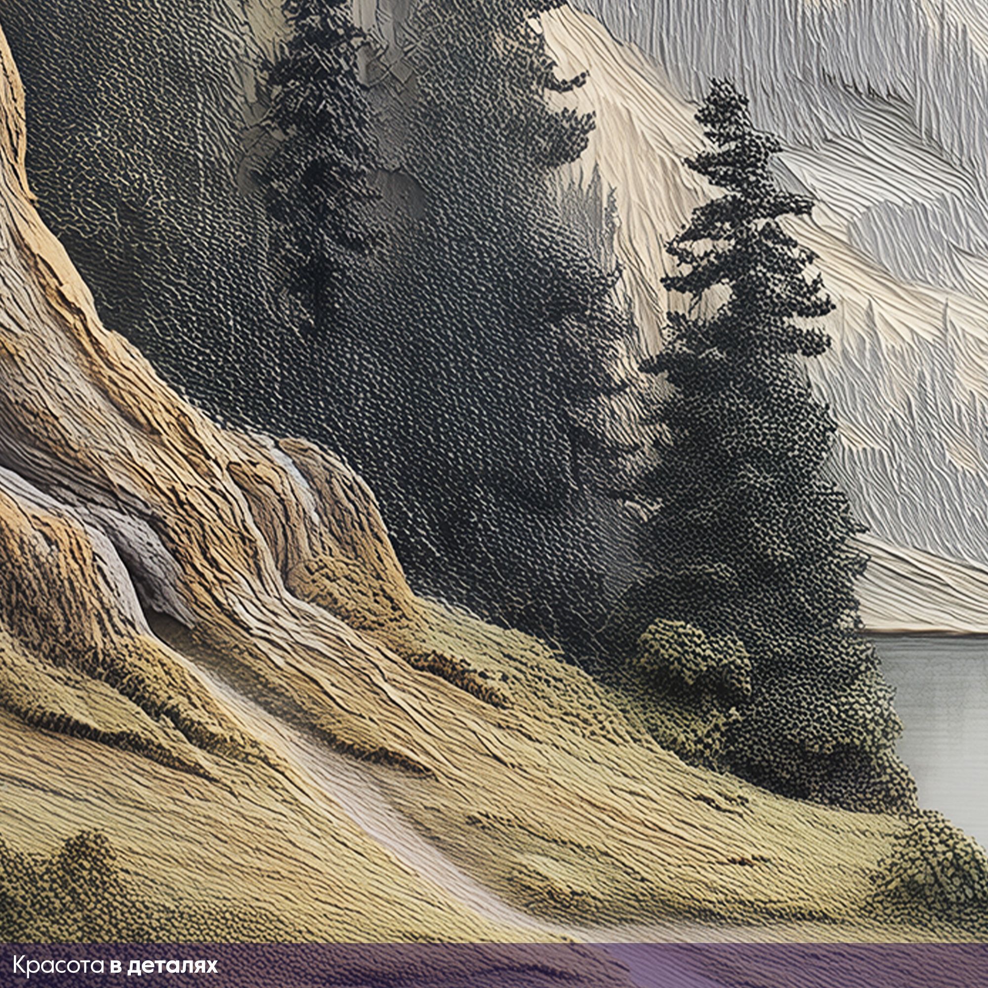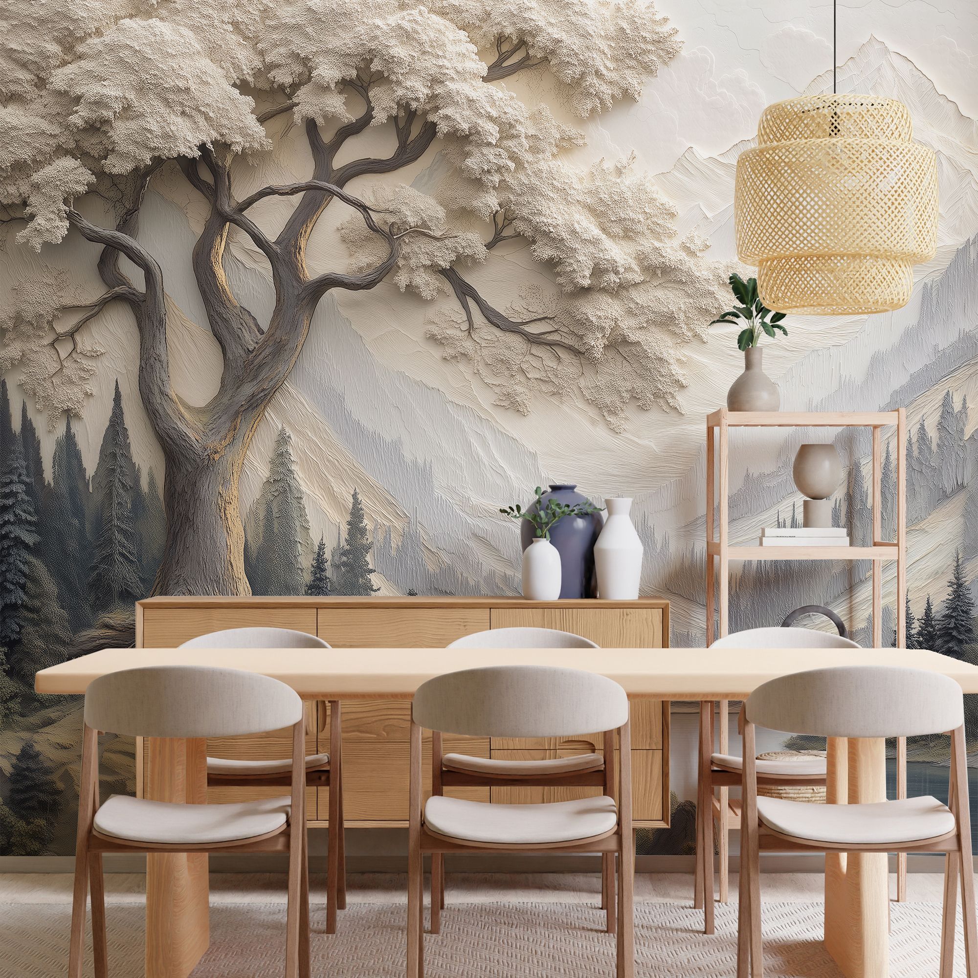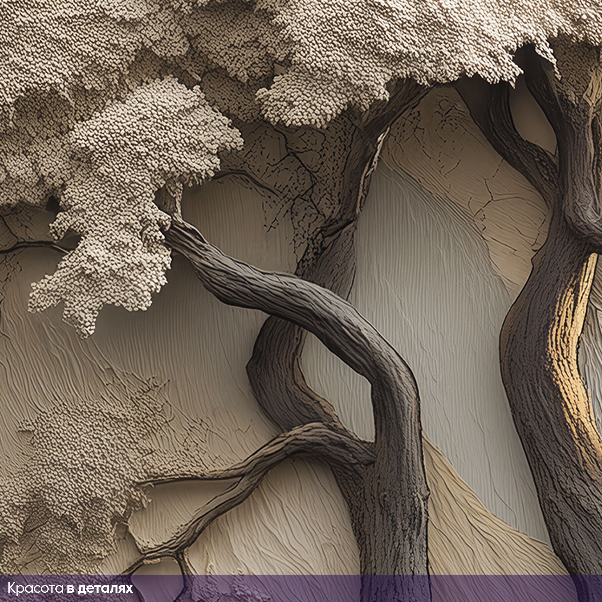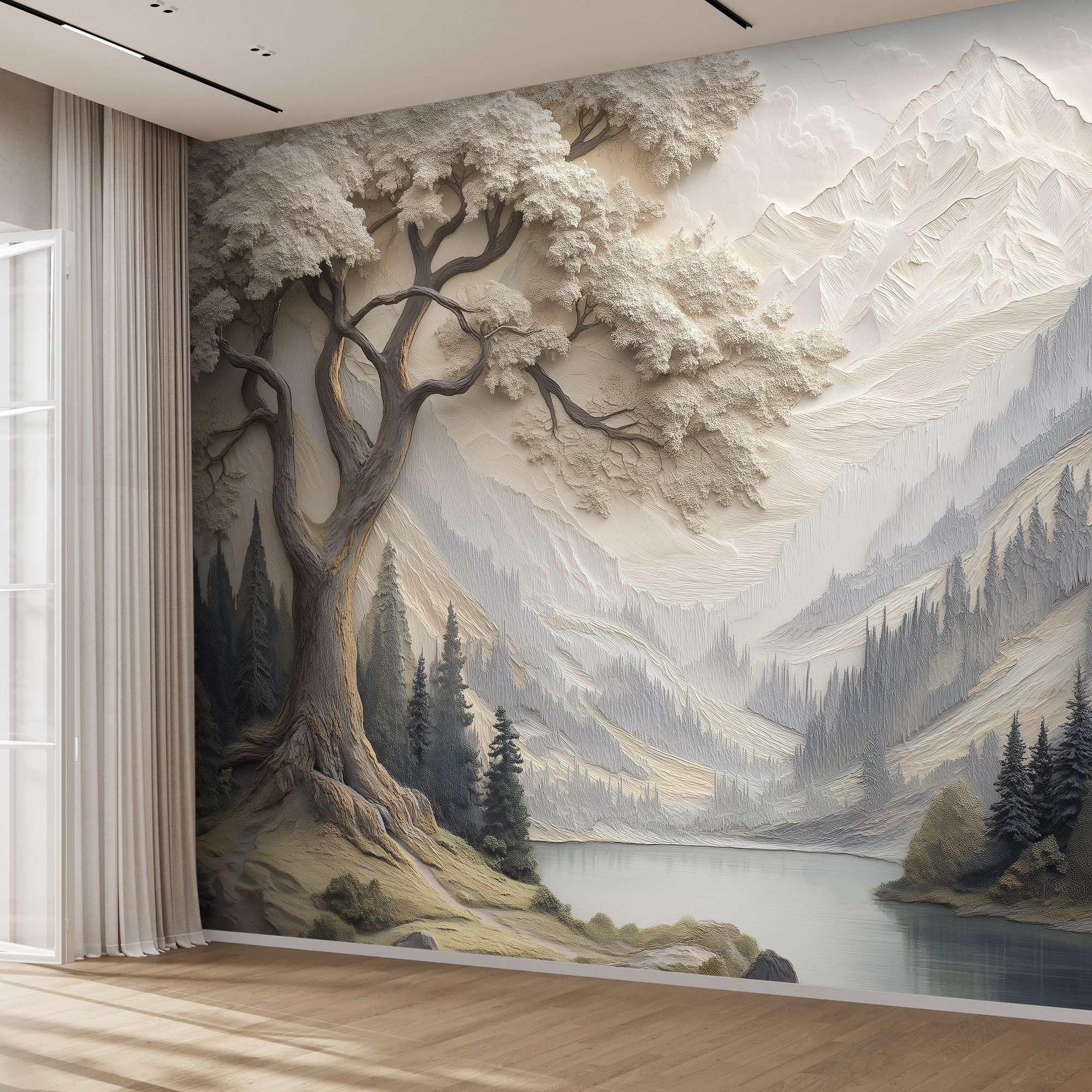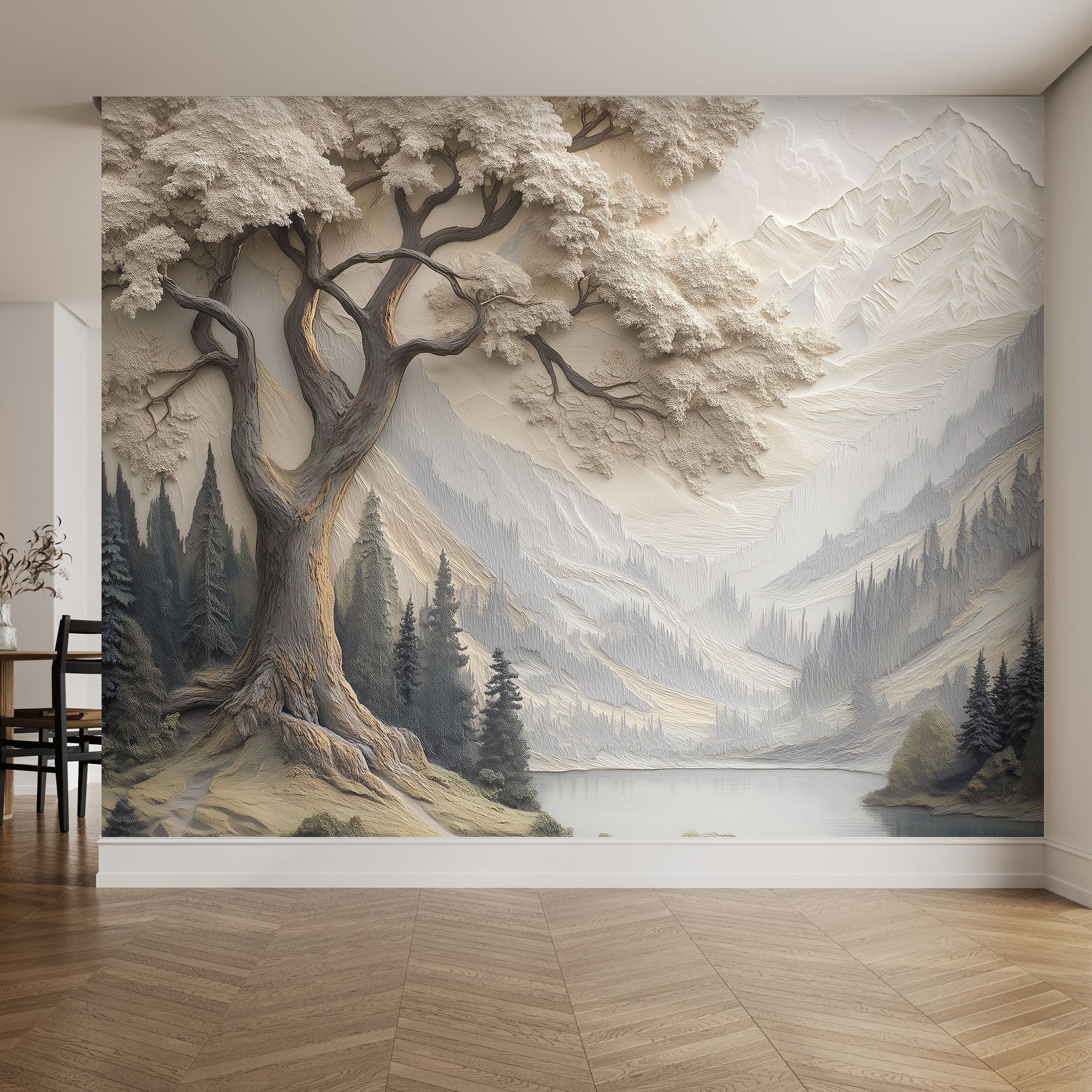 Данные фотообои представляют собой изысканный рельефный пейзаж, выполненный в приглушённой пастельной гамме с преобладанием светло-бежевых и серо-синих оттенков. В центре композиции возвышается старое, могучее дерево с ветвями, раскинувшимися словно в объятиях, его текстура словно вылеплена вручную, подчёркивая каждую неровность коры и деталь листвы. Вдали раскинулась величественная горная цепь, чётко прорисованная с рельефной глубиной, что создаёт ощущение трёхмерности и бескрайнего простора. Перед горным массивом тихо блестит гладь озера, отражающего спокойствие и свежесть горного воздуха. Низкие холмы и хвойные леса добавляют атмосфере природной гармонии и умиротворённости. Такое изображение идеально подойдёт для создания элегантного, погружающего в природу интерьера, привнося в пространство ощущение бесконечной глубины, покоя и изысканности. Эти фотообои — идеальный выбор для тех, кто ценит сочетание утончённого художественного стиля и природной красоты.