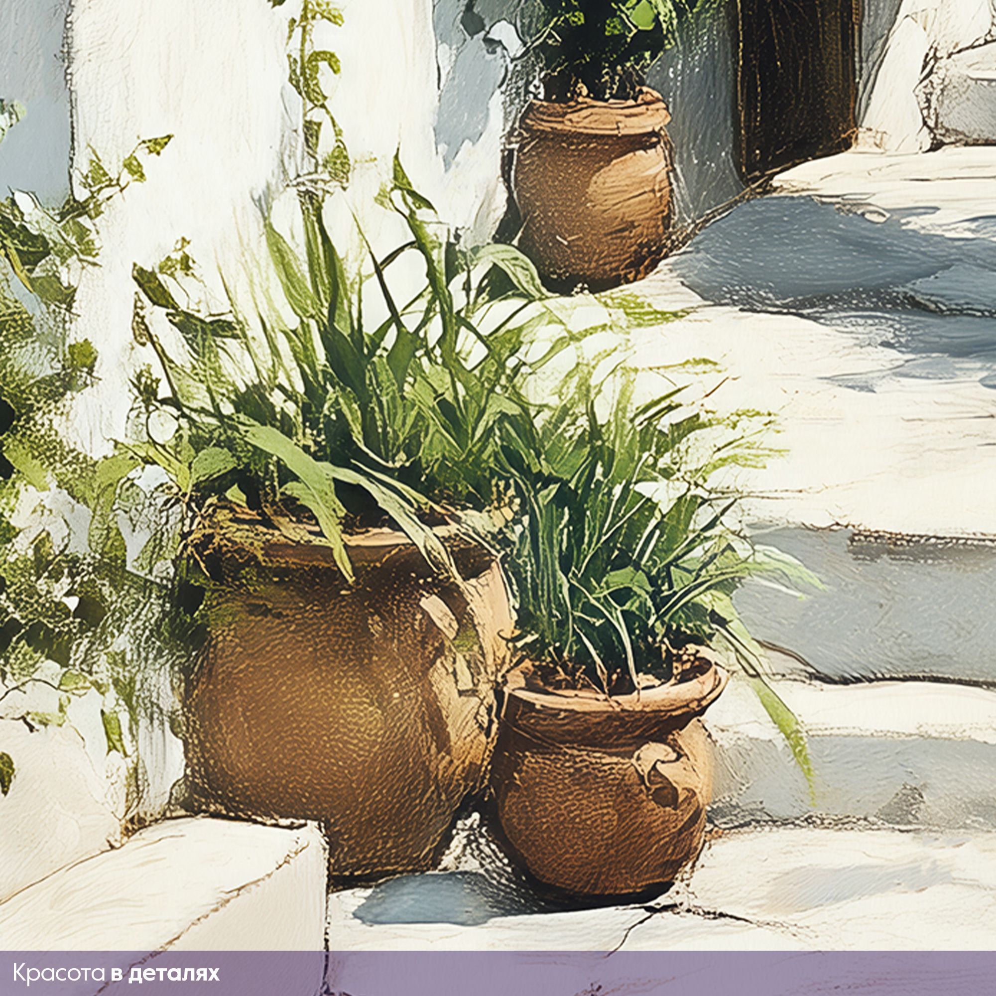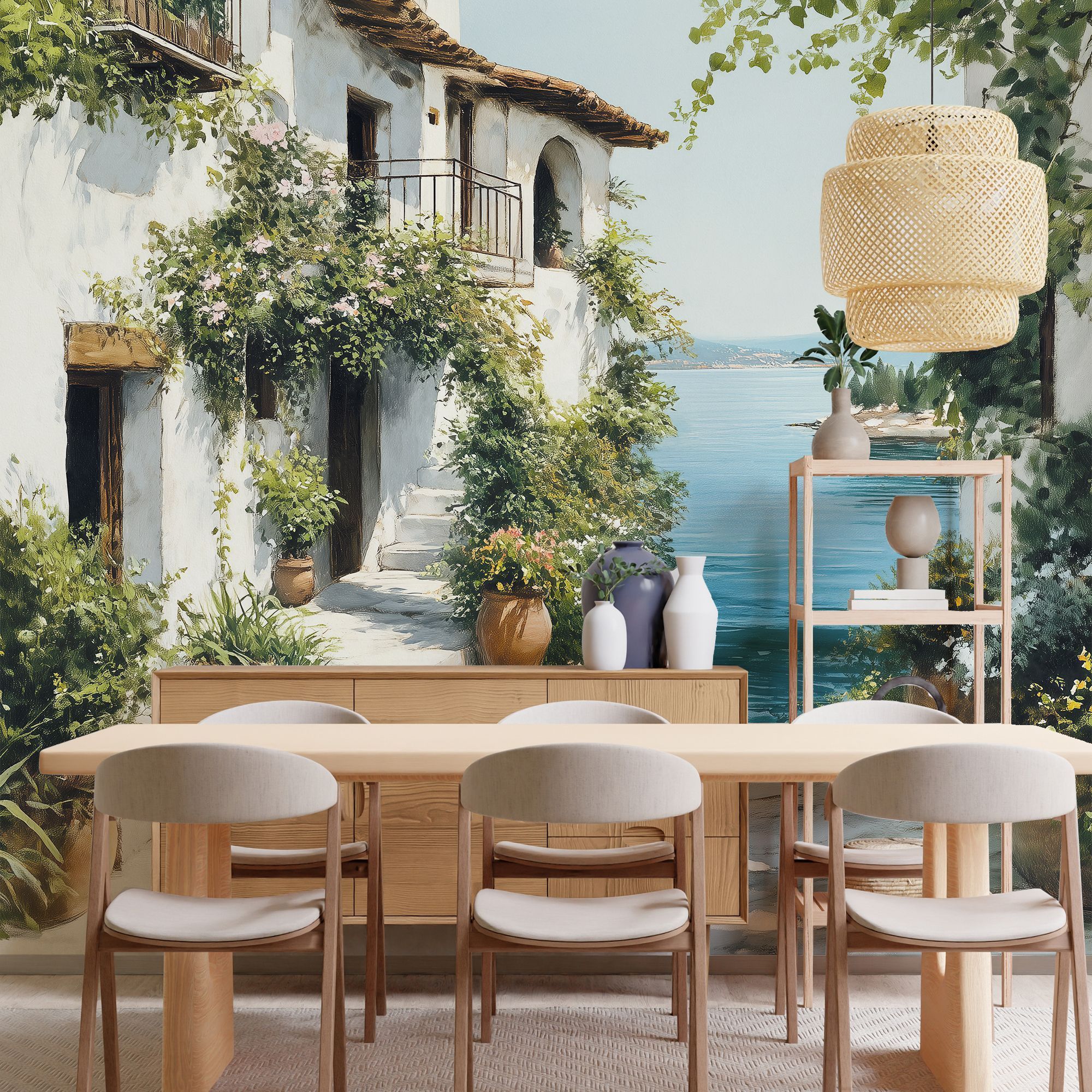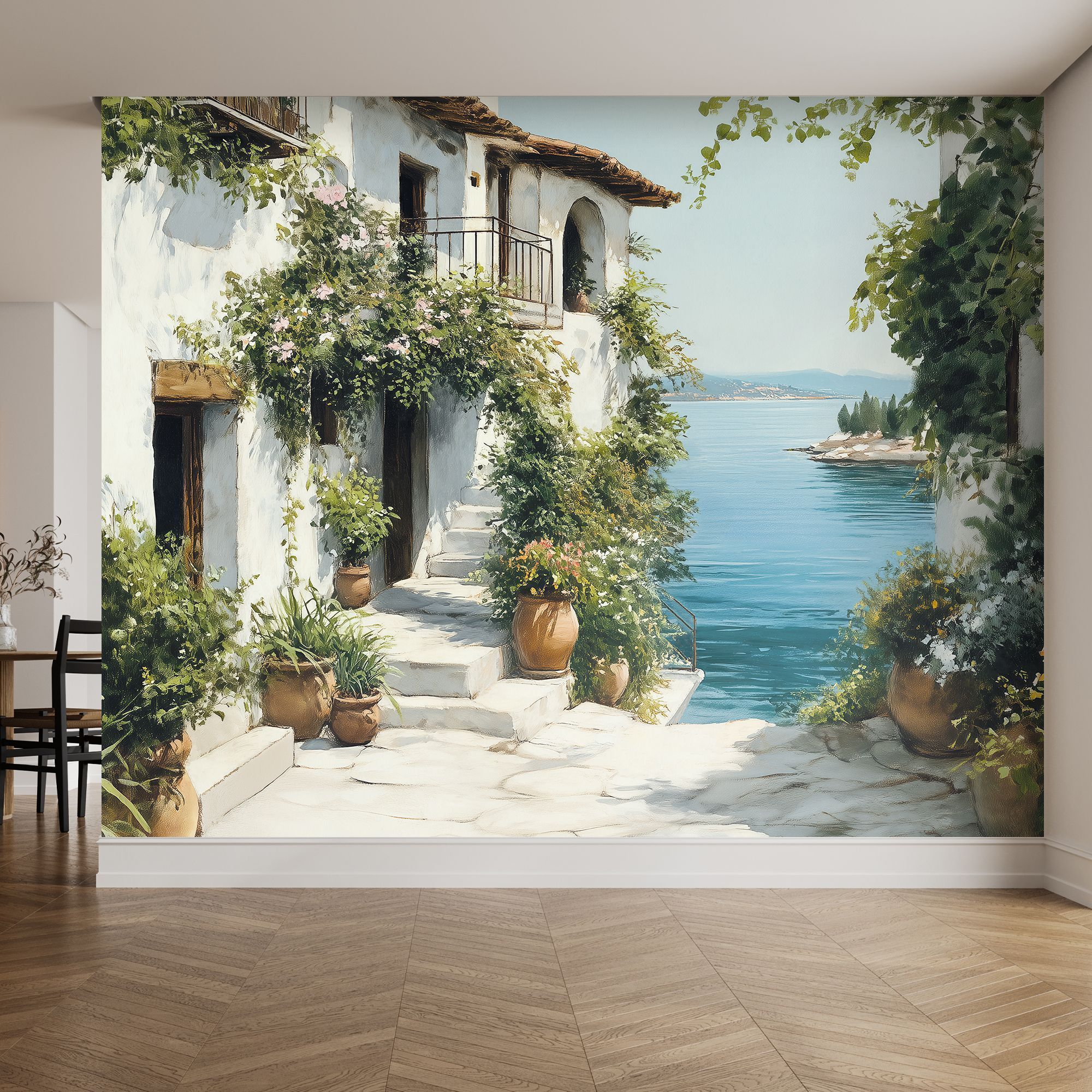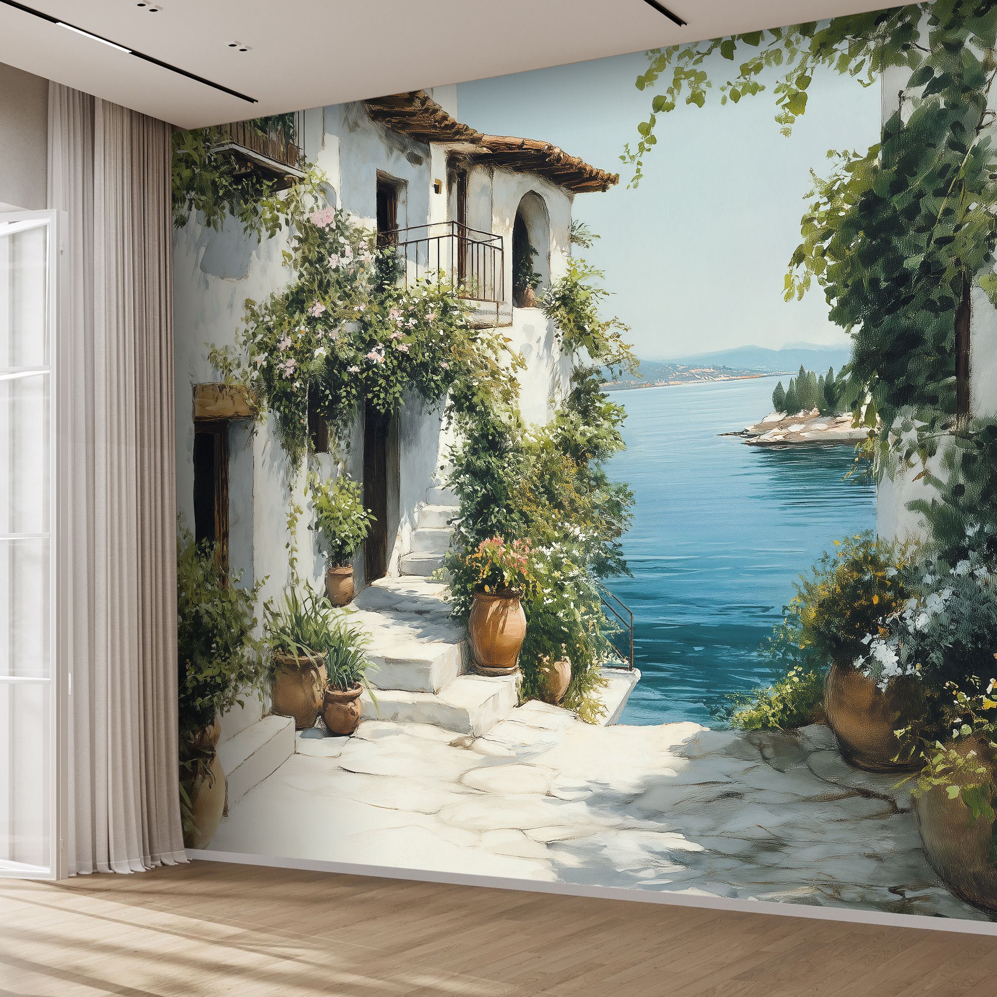 Эти фотообои переносят вас в тихую средиземноморскую улочку, где белоснежные стены домов гармонично сочетаются с пышной зеленью и цветущими растениями в глиняных горшках. Мягкий свет солнца создаёт ощущение тепла и уюта, подчёркивая текстуру каменной мостовой и изящность архитектурных деталей — деревянных балкончиков, арок и ступенек. На заднем плане открывается великолепный вид на спокойное лазурное море, уходящее к горизонту, где небо встречается с водой, дополняя атмосферу безмятежности и покоя. Уютная композиция позволяет ощутить близость природы и умиротворяющую гармонию традиционной деревенской жизни, приглашает к мечтам о путешествиях и отдыхе. Эти фотообои станут идеальным украшением для тех, кто стремится наполнить интерьер светом, теплом и вдохновением спокойствия, создавая уникальную атмосферу уюта и наслаждения природной красотой.