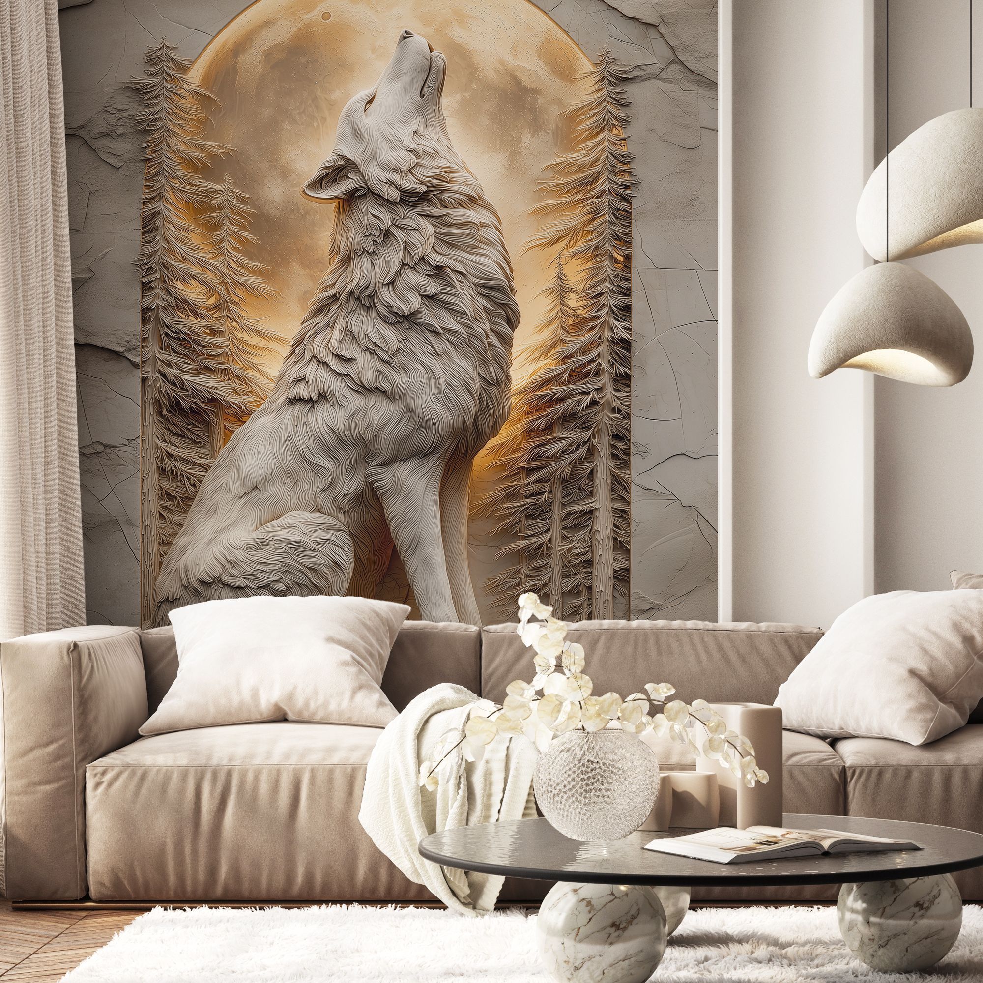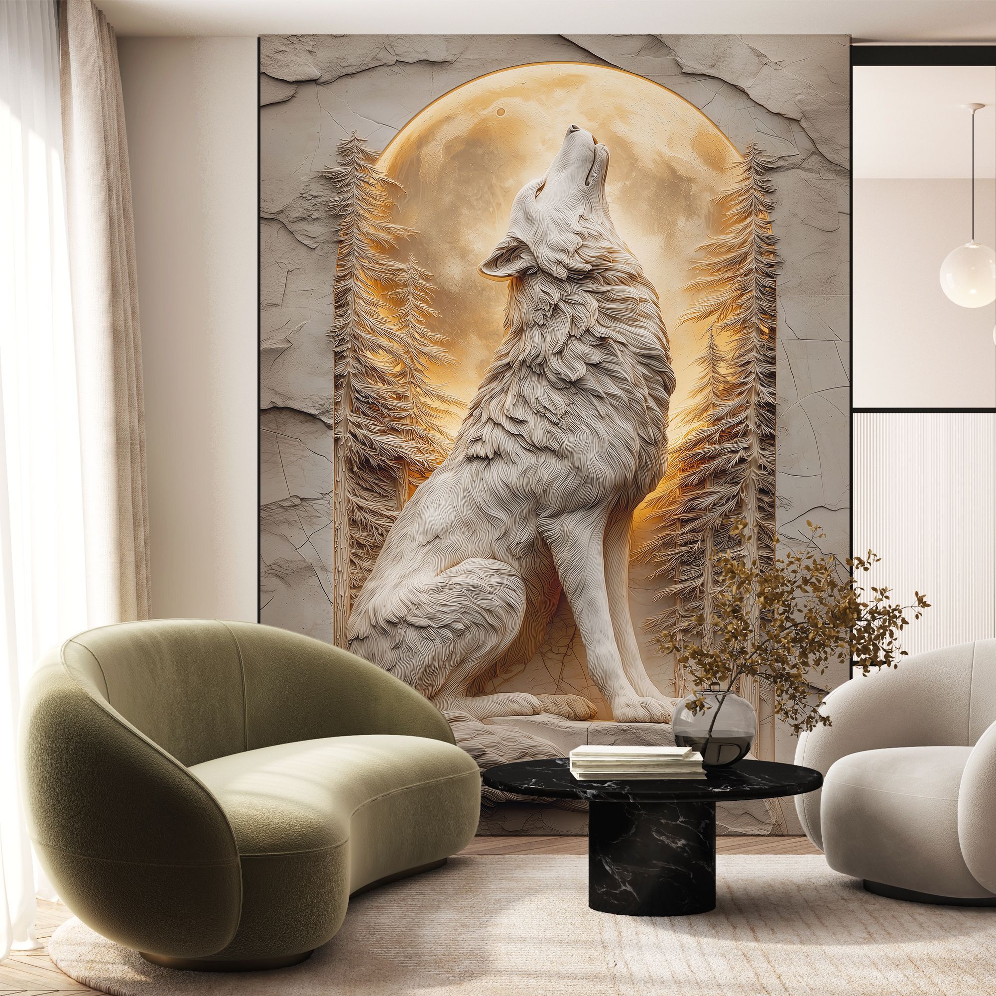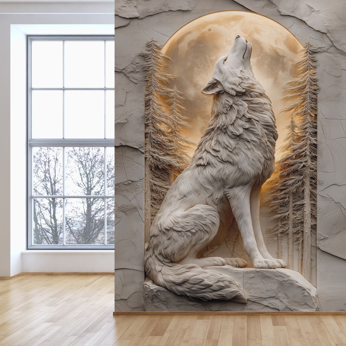 Эти фотообои представляют собой удивительное сочетание силы и таинственности, воплощённое в образе величественного волка, задумчиво воющего на фоне полной луны. Выполненное в технике резьбы по камню изображение словно оживает благодаря детальной проработке каждой шерстинки и текстуре скалистой поверхности. За волком возвышаются стройные хвойные деревья, которые придают композиции глубину и атмосферу уединённого леса. Тёплое золотистое свечение луны создаёт эффект загадочного ночного света, наполняя пространство теплом и мистикой. Этот художественный декор идеально подойдёт для тех, кто ценит природную энергию и силу духа, желая добавить своему интерьеру изысканную драматичность и символизм. Фотообои гармонично впишутся в комнаты с природными или этническими мотивами, став эффектным акцентом любого пространства.