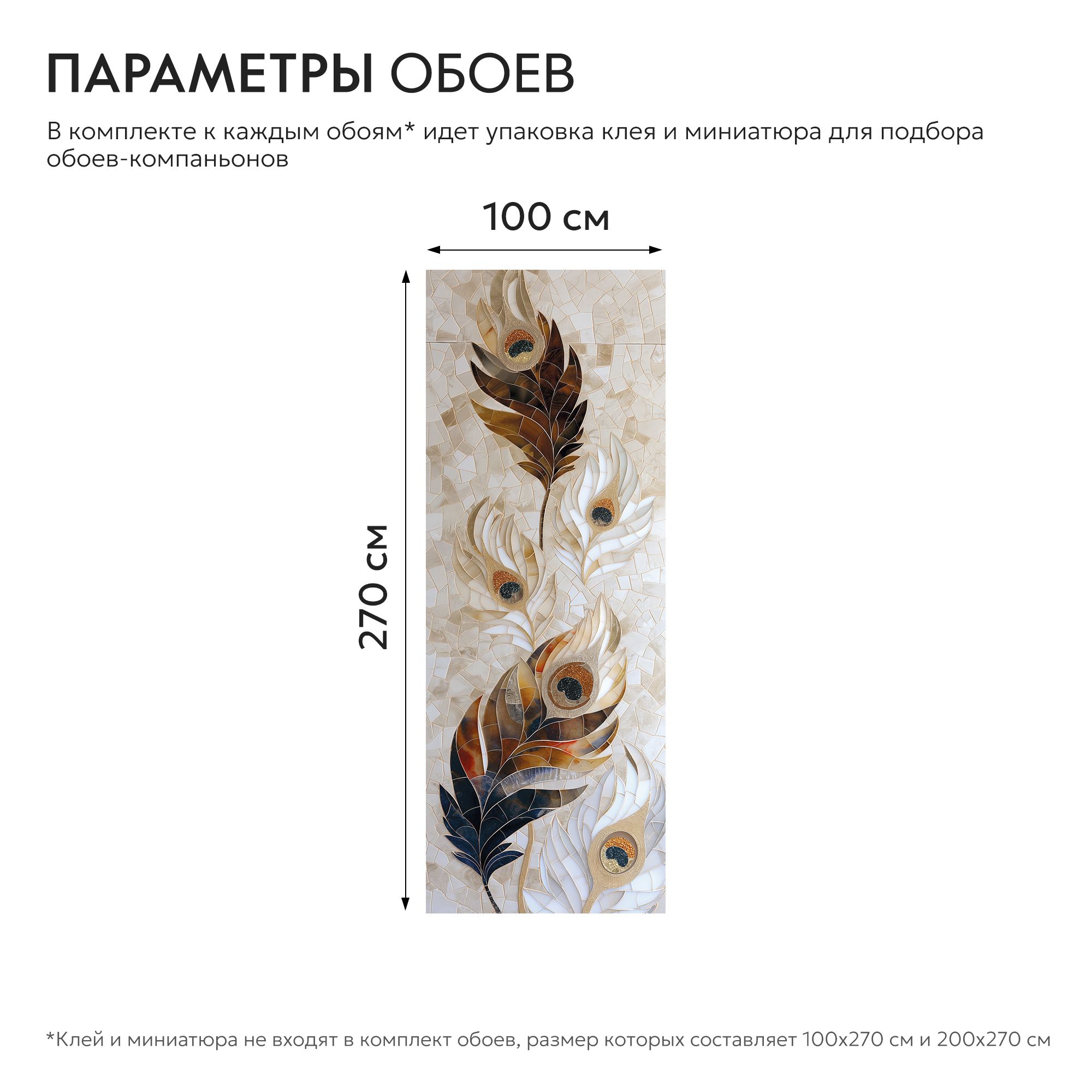 Эти изысканные фотообои представляют собой великолепную композицию из стилизованных перьев павлина, выполненных в технике мозаики. Каждый элемент будто создан из множества стеклянных или керамических вставок, объединённых прозрачными и матовыми текстурами, что создаёт глубокий визуальный эффект объёма и плавности линий. Цветовая палитра выдержана в тёплых, натуральных оттенках коричневого, золотистого, белого и бежевого, что придаёт изображению утончённость и гармонию. Перья будто будто светятся изнутри, а каждый «глазок» украшен контрастными акцентами тёмно-синего и янтарного цвета, придавая композиции благородство и изящество. Данная задумка прекрасно подойдёт для декорирования гостиной или спальни, где хочется создать атмосферу лёгкости, изящества и теплоты. Эти фотообои способны стать центральным элементом интерьера, подчёркивая утонченный вкус и стремление к уникальности. Идеальный выбор для любителей природы и изящного искусства, соединяющего в себе классические мотивы и современную технику исполнения.