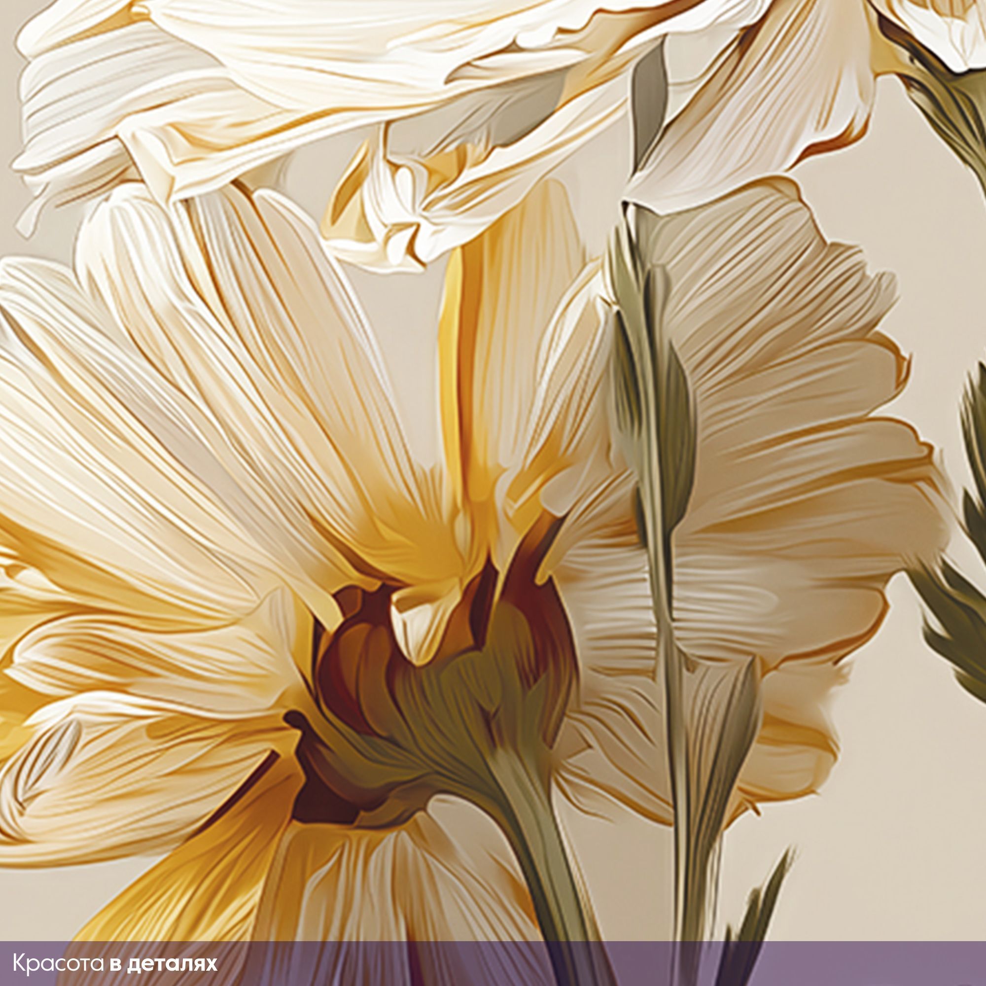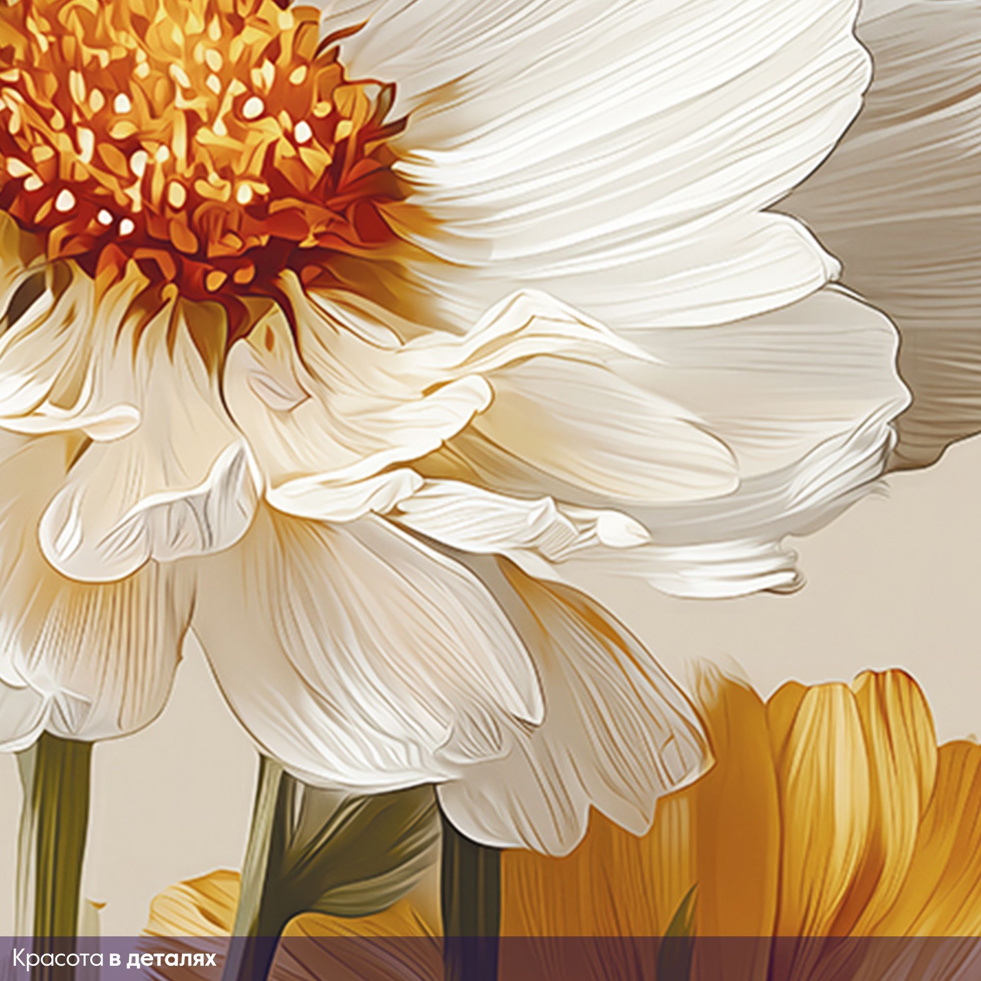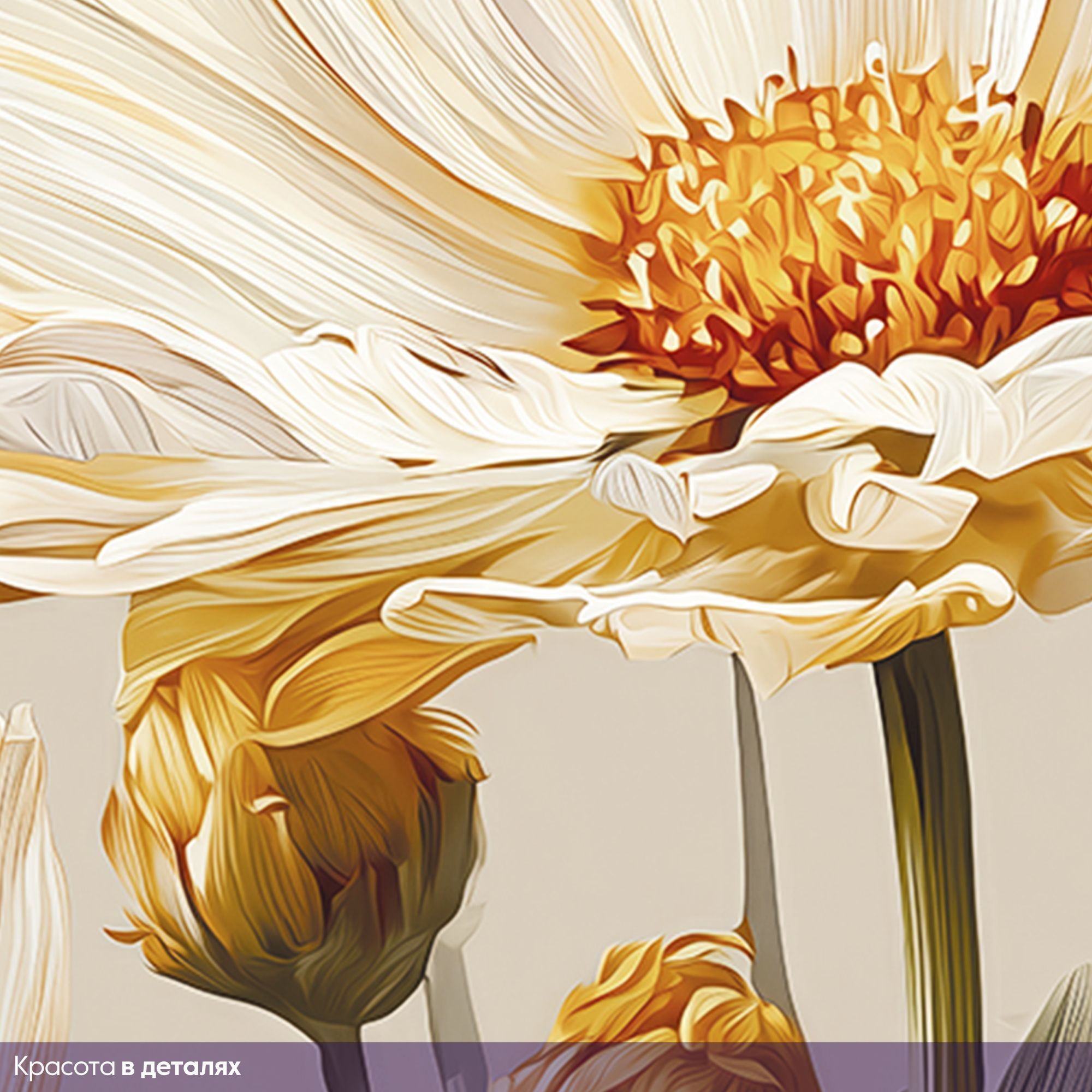 Эти фотообои демонстрируют изысканную красоту природы через нежные белые цветы, выполненные в реалистичном и в то же время немного стилизованном художественном ключе. Каждое цветочное соцветие, с тонко прорисованными лепестками и текстурой, словно оживает на фоне спокойного бежевого цвета, создавая атмосферу умиротворённости и лёгкости. Преобладание светлых оттенков белого и мягких золотисто-жёлтых тонов придаёт композиции свежесть и тепло, а разнообразие бутонов — от полностью раскрытых цветов до нежных, только начинающих распускаться — добавляет динамики и естественности. Такие фотообои станут идеальным решением для оформления спальни, гостиной или любой зоны, где важна атмосфера уюта, лёгкости и гармонии. Они прекрасно сочетаются с минималистичными и классическими интерьерами, придавая помещению нежность и природную элегантность.