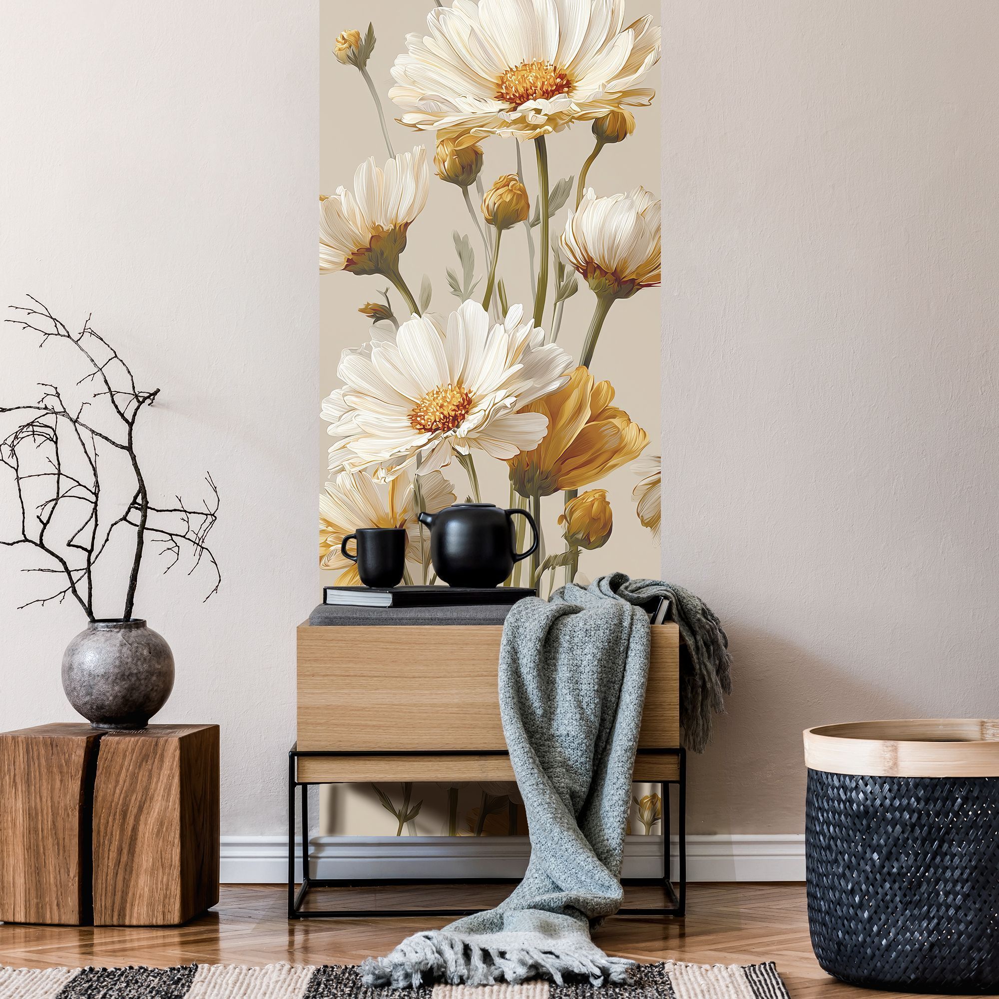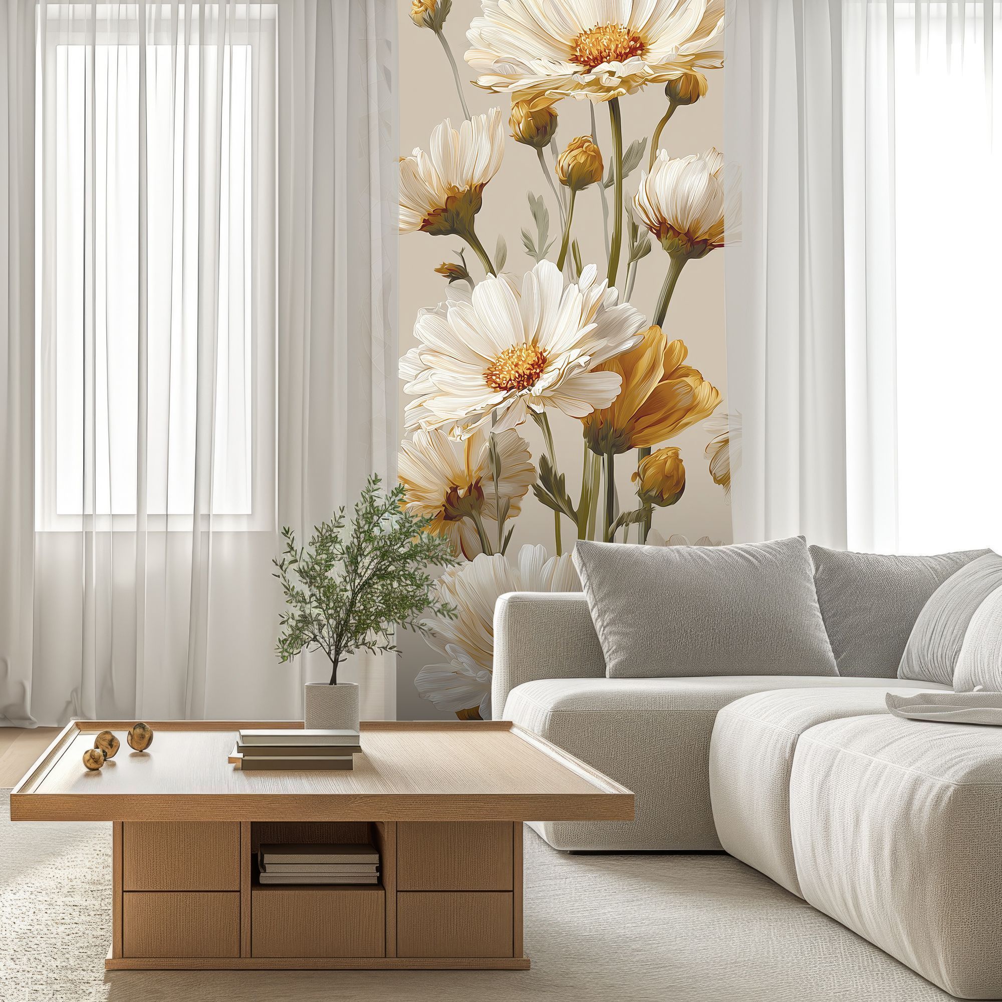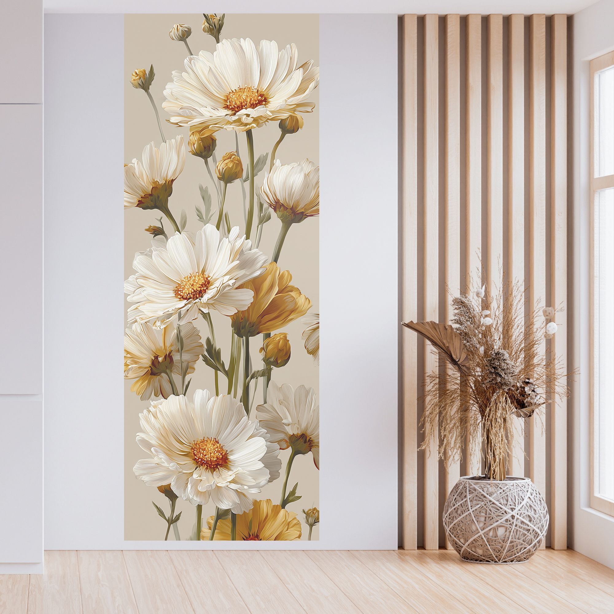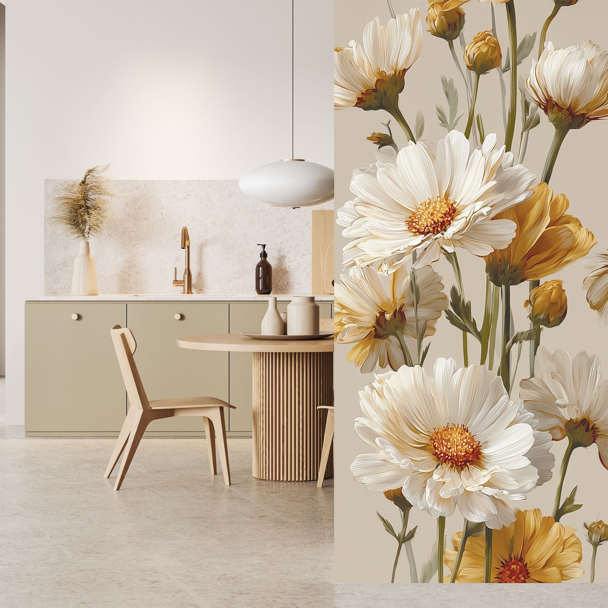 Эти фотообои демонстрируют изысканную красоту природы через нежные белые цветы, выполненные в реалистичном и в то же время немного стилизованном художественном ключе. Каждое цветочное соцветие, с тонко прорисованными лепестками и текстурой, словно оживает на фоне спокойного бежевого цвета, создавая атмосферу умиротворённости и лёгкости. Преобладание светлых оттенков белого и мягких золотисто-жёлтых тонов придаёт композиции свежесть и тепло, а разнообразие бутонов — от полностью раскрытых цветов до нежных, только начинающих распускаться — добавляет динамики и естественности. Такие фотообои станут идеальным решением для оформления спальни, гостиной или любой зоны, где важна атмосфера уюта, лёгкости и гармонии. Они прекрасно сочетаются с минималистичными и классическими интерьерами, придавая помещению нежность и природную элегантность.
