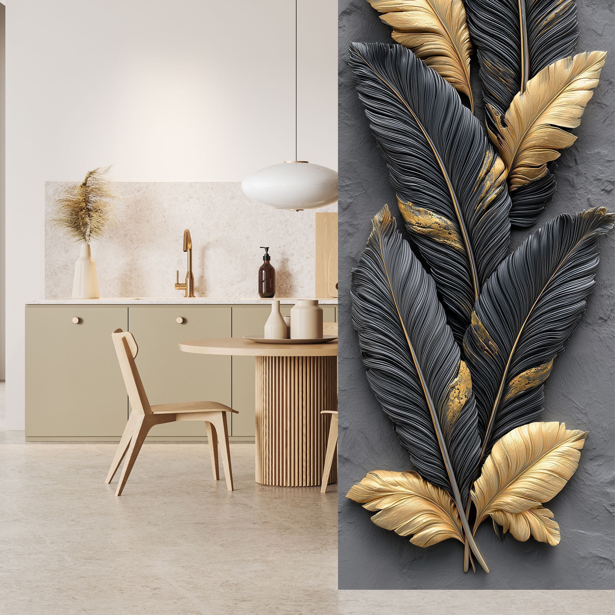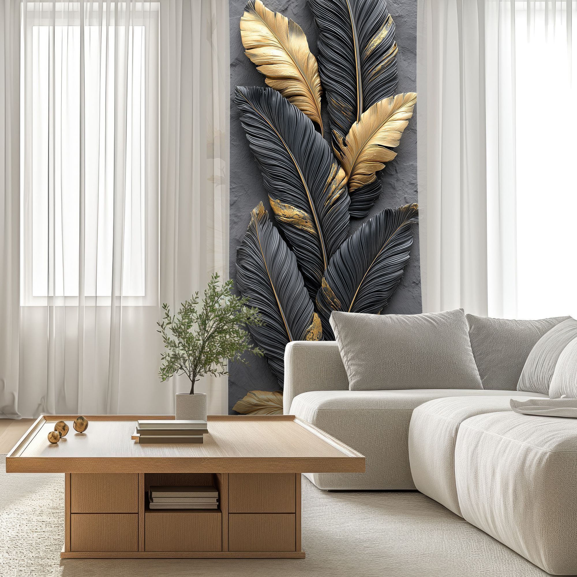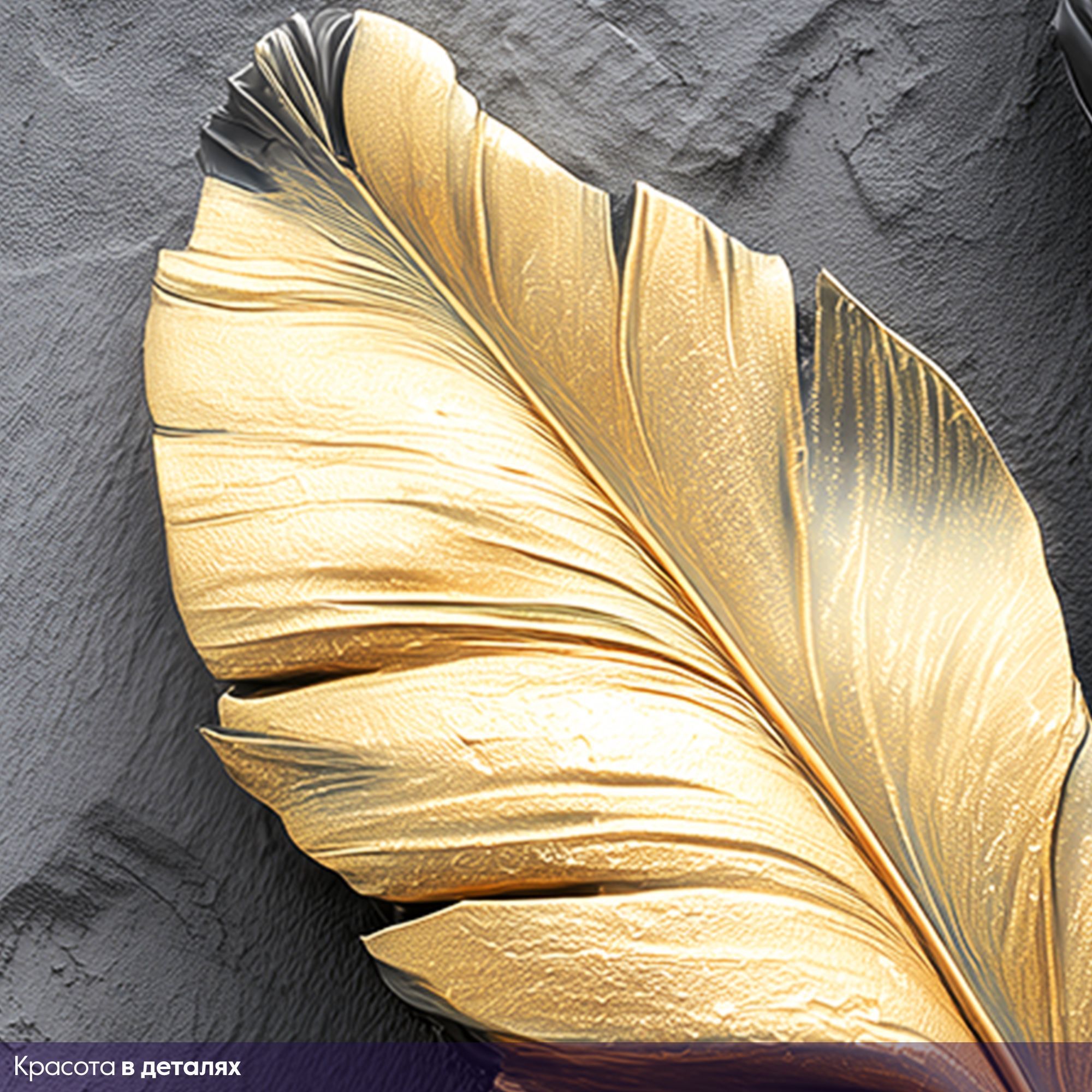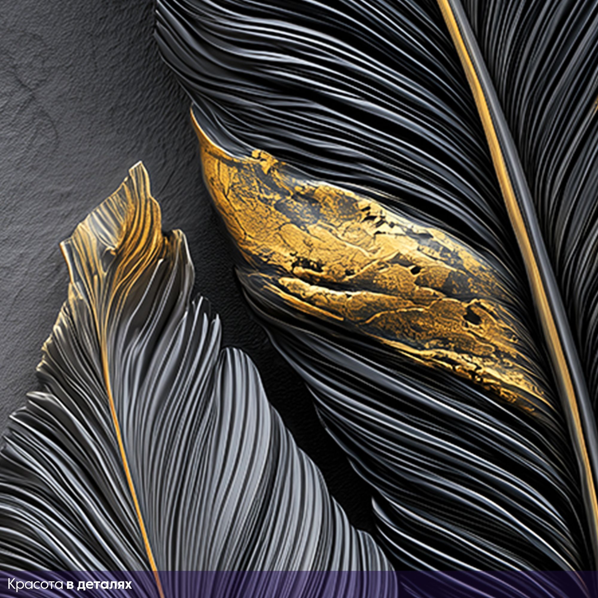 Эти фотообои представляют собой изысканную композицию из крупных перьев, выполненных в стиле современной скульптуры. Глубокий графитовый цвет перьев контрастирует с блестящими золотистыми элементами, что придаёт изображению благородство и элегантность. Тонкая проработка каждой детали — от тонких линий жилок до плавных изгибов — создаёт впечатление объёмности и текстурной выразительности. Фон выполнен в спокойном сером оттенке с легкой неровной текстурой, подчёркивающей рельеф перьев и добавляя динамичности всей композиции. Такое сочетание цвета и фактуры идеально впишется в стильные интерьеры в духе минимализма, арт-деко или современного лофта. Данные фотообои станут акцентом в гостиной, спальне или кабинете, добавляя интерьеру утончённости, силы и гармонии. Идеальный выбор для тех, кто ценит сочетание изящной природы и современного дизайна.
