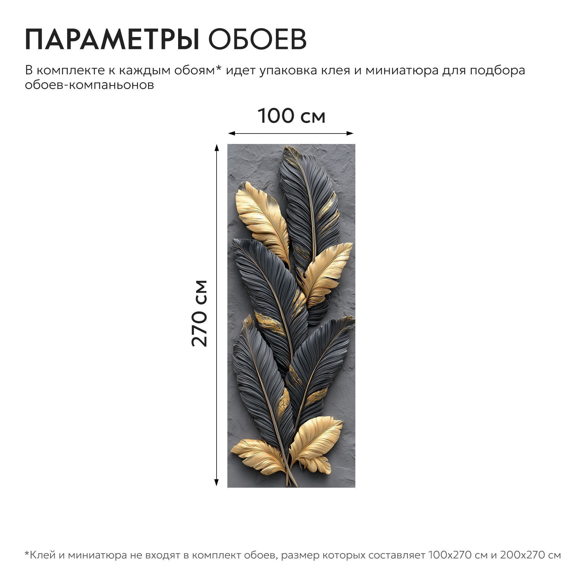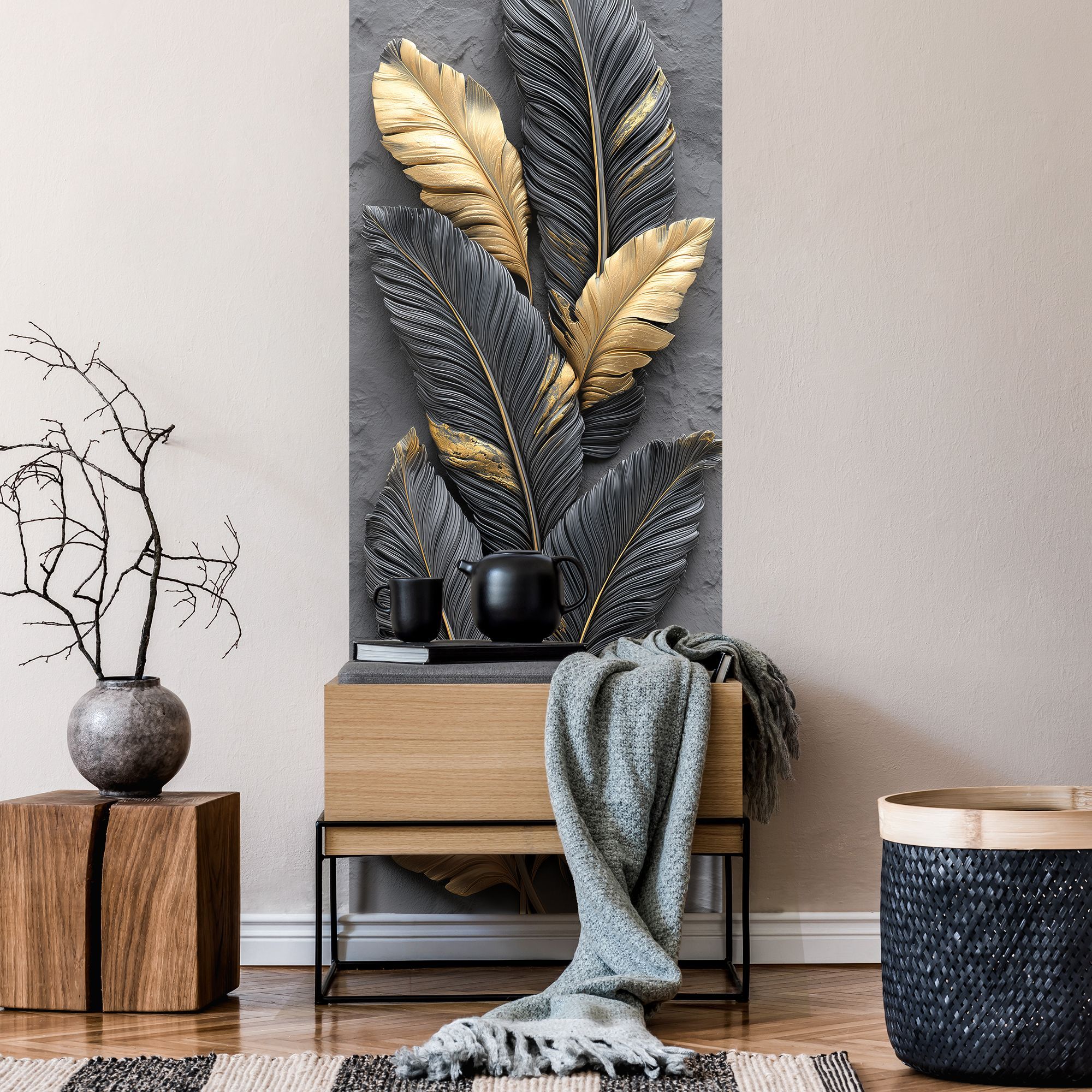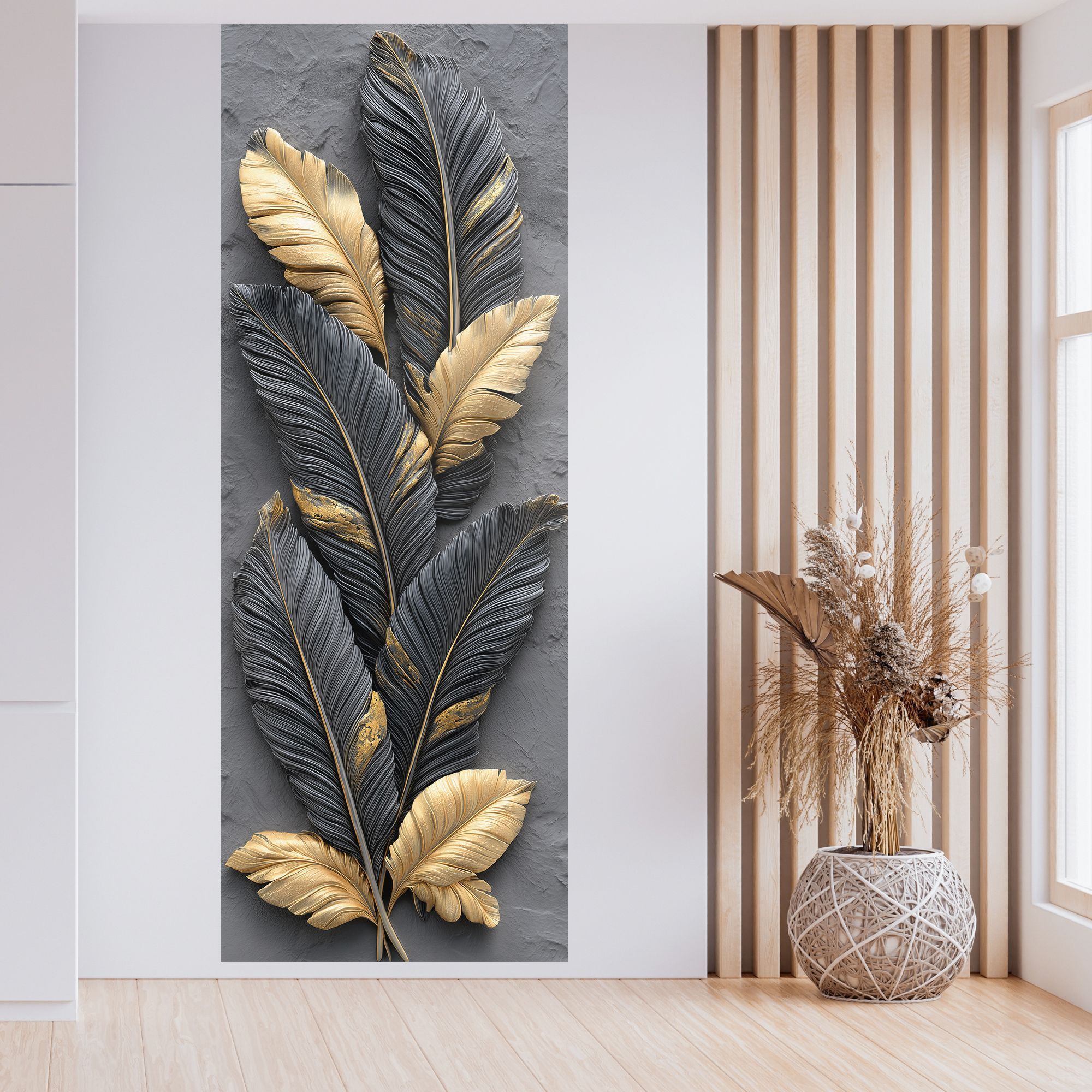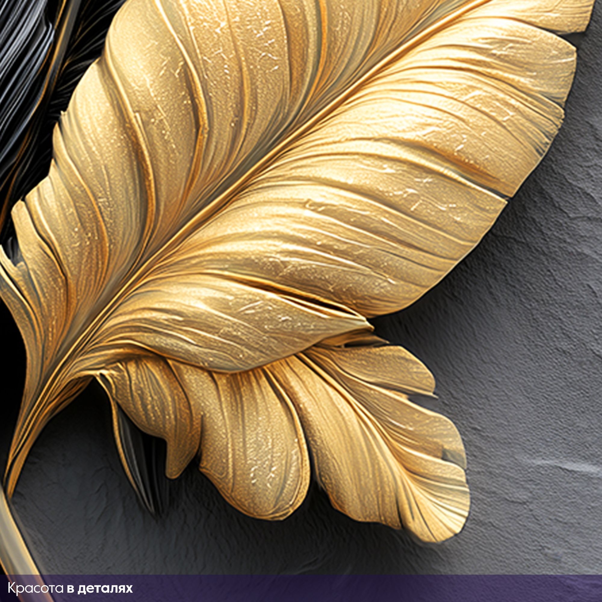 Эти фотообои представляют собой изысканную композицию из крупных перьев, выполненных в стиле современной скульптуры. Глубокий графитовый цвет перьев контрастирует с блестящими золотистыми элементами, что придаёт изображению благородство и элегантность. Тонкая проработка каждой детали — от тонких линий жилок до плавных изгибов — создаёт впечатление объёмности и текстурной выразительности. Фон выполнен в спокойном сером оттенке с легкой неровной текстурой, подчёркивающей рельеф перьев и добавляя динамичности всей композиции. Такое сочетание цвета и фактуры идеально впишется в стильные интерьеры в духе минимализма, арт-деко или современного лофта. Данные фотообои станут акцентом в гостиной, спальне или кабинете, добавляя интерьеру утончённости, силы и гармонии. Идеальный выбор для тех, кто ценит сочетание изящной природы и современного дизайна.