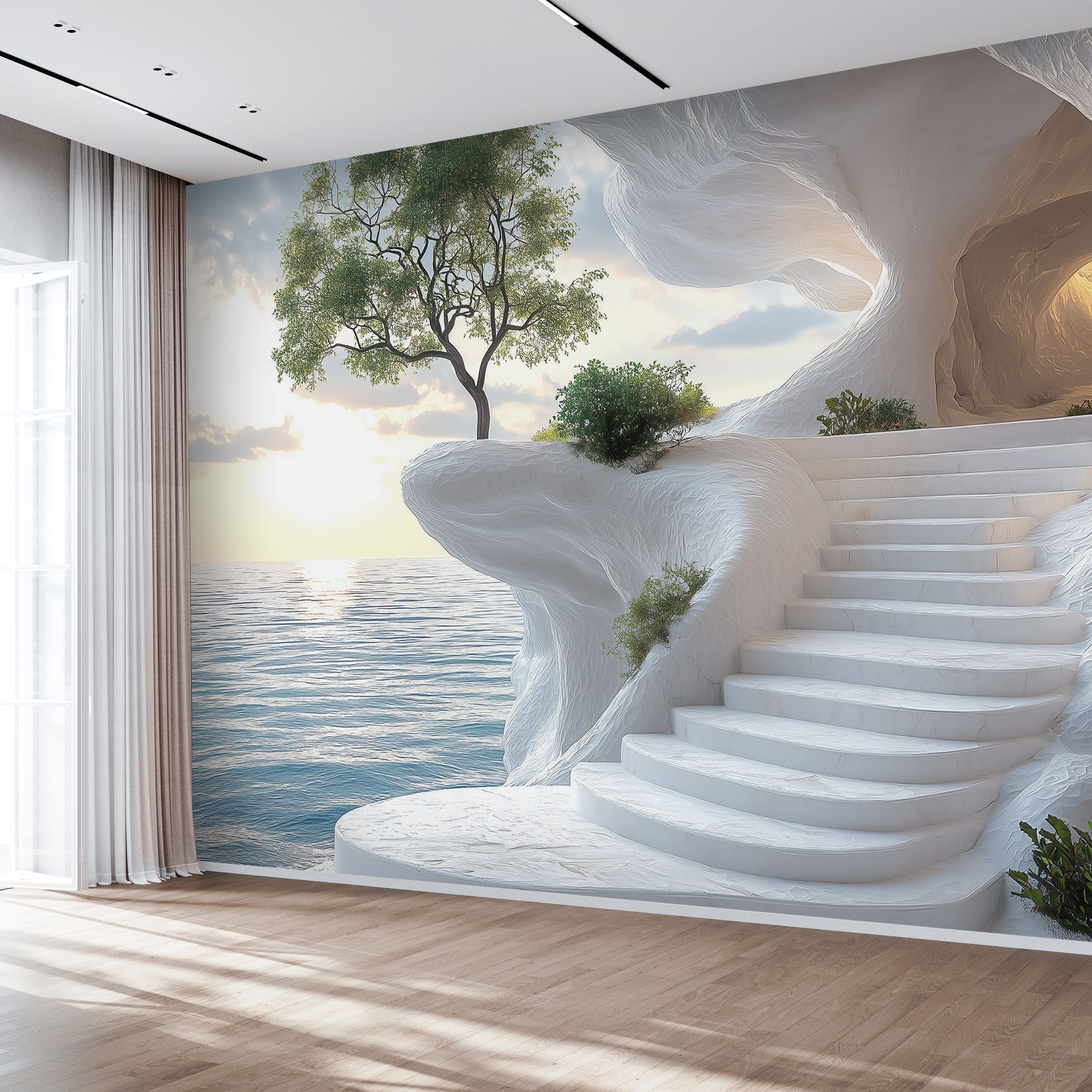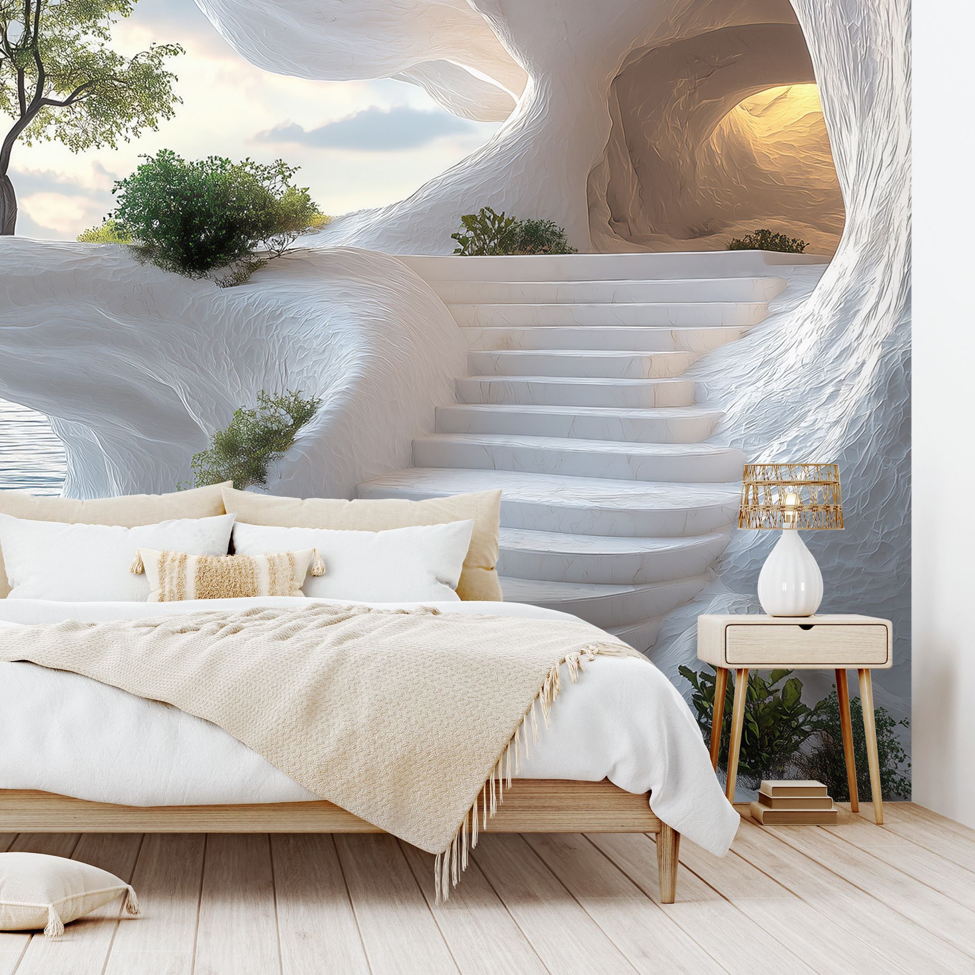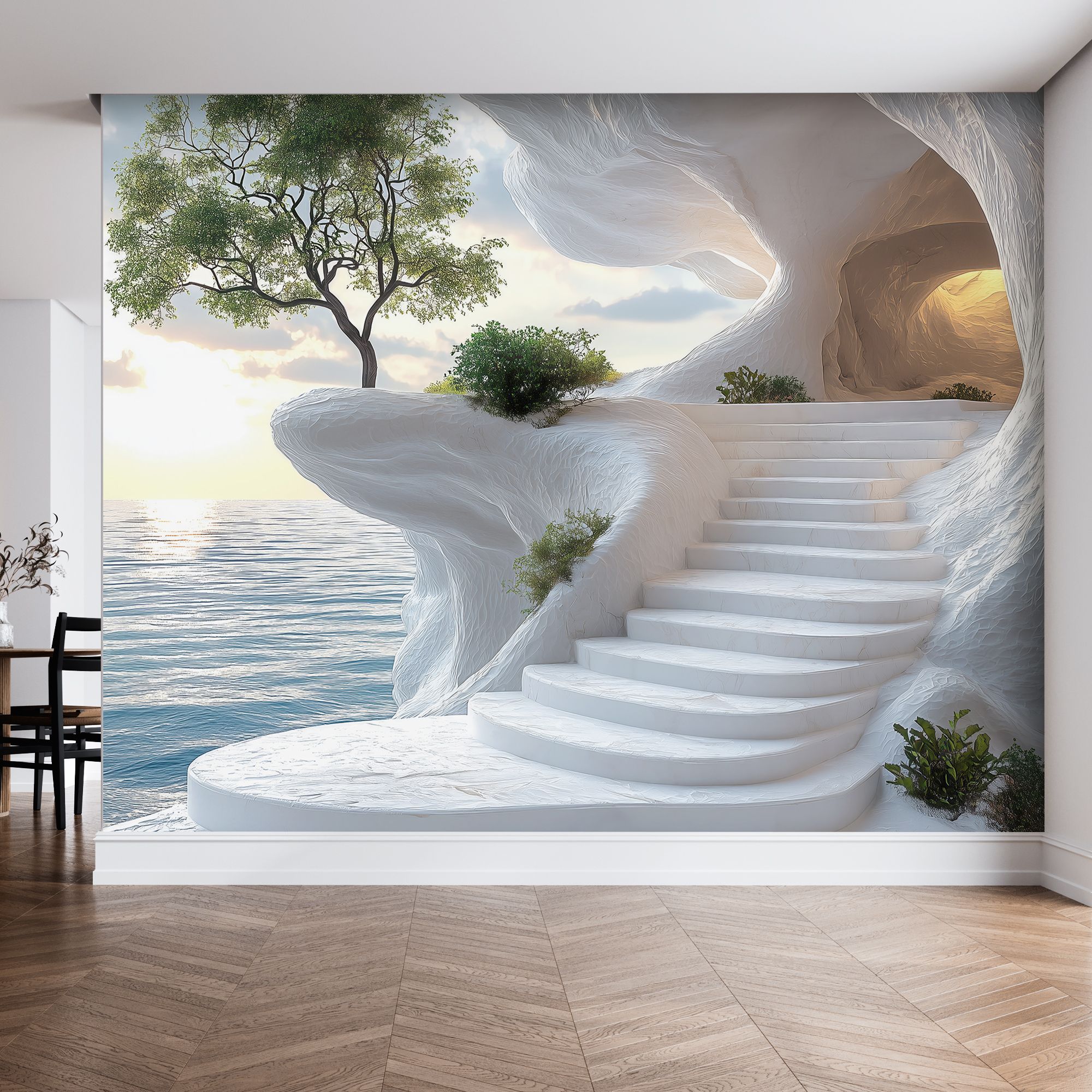 На картине раскрывается волшебный пейзаж, словно вышедший из глубин сказочной мечты. Изящные ступени, словно вырезанные из чистейшего мрамора, нежно поднимаются к пещере с причудливо изогнутыми и богато текстурированными стенами. Через её арочный проём открывается бескрайний океан под светлым, завораживающим небом, усыпанным мягкими, словно пух, облаками. На скалах изящно возвышается одинокое дерево, его пышная зелень утончённо сочетается с белоснежной гармонией окружающего ландшафта. Вся композиция дышит умиротворённостью, внутренней гармонией и лёгкостью, словно приглашая погрузиться в мечты и уединение у самого берега великого простора.