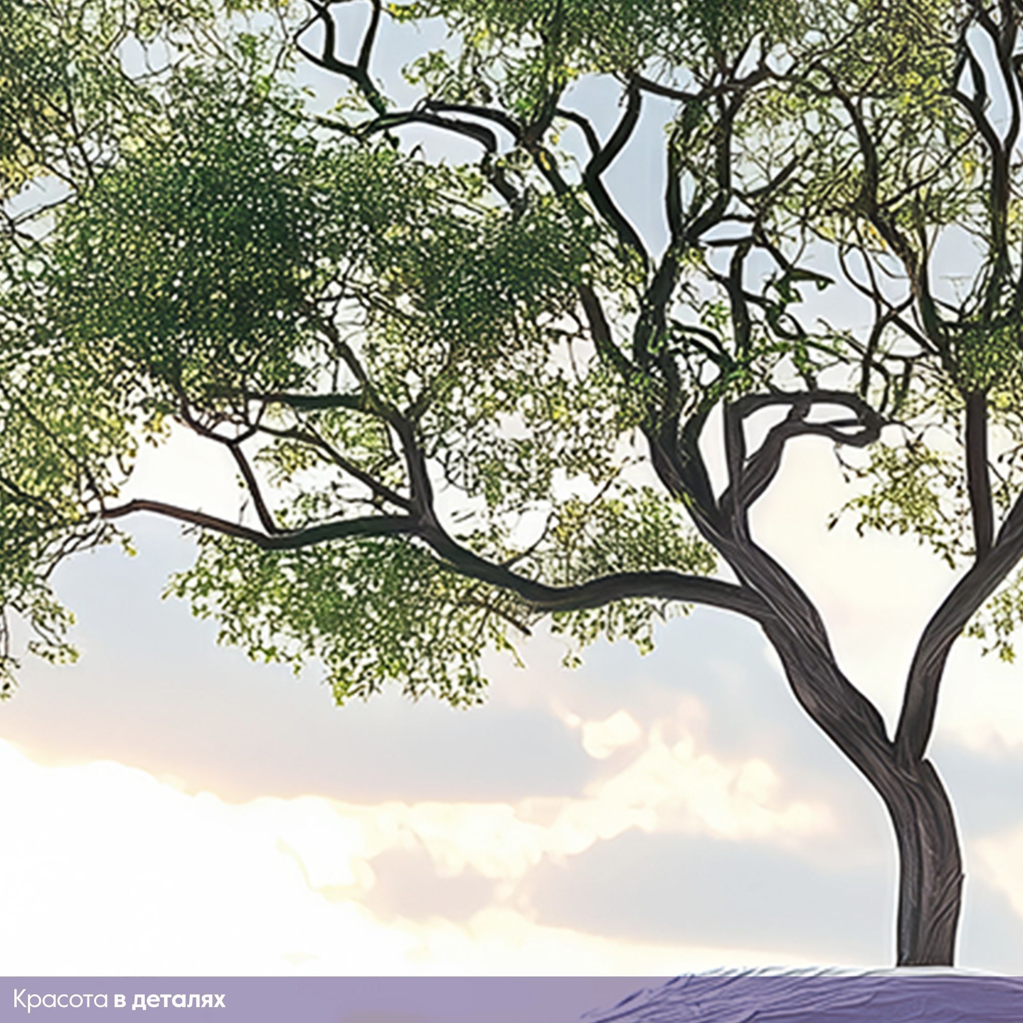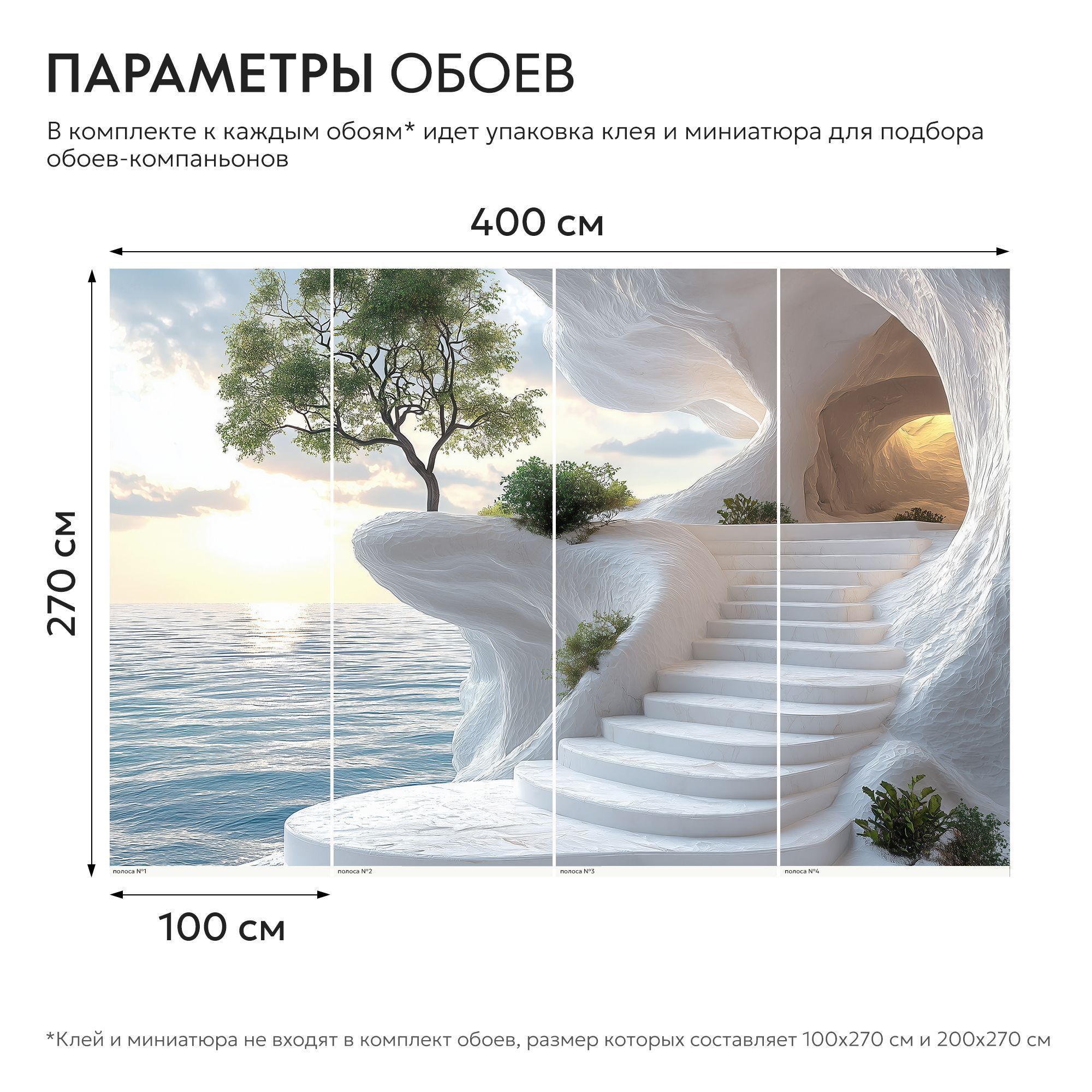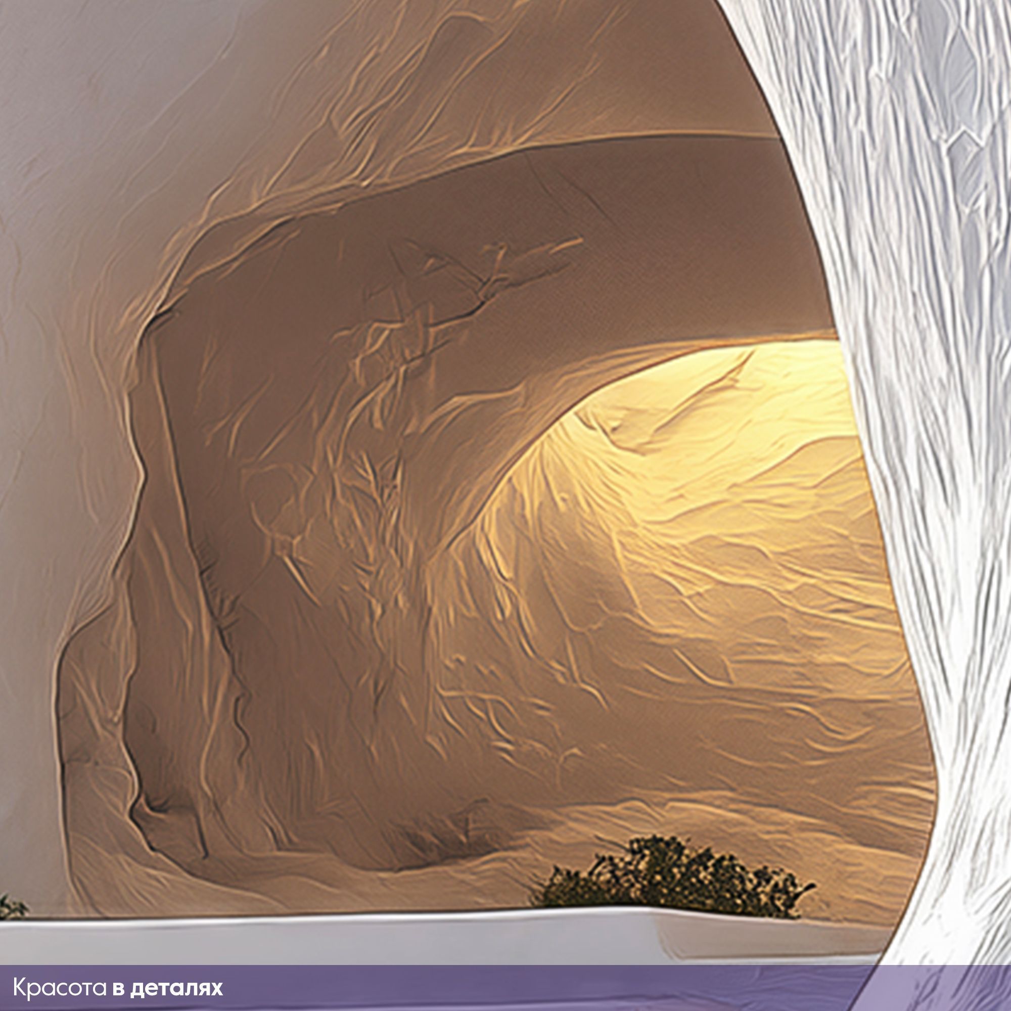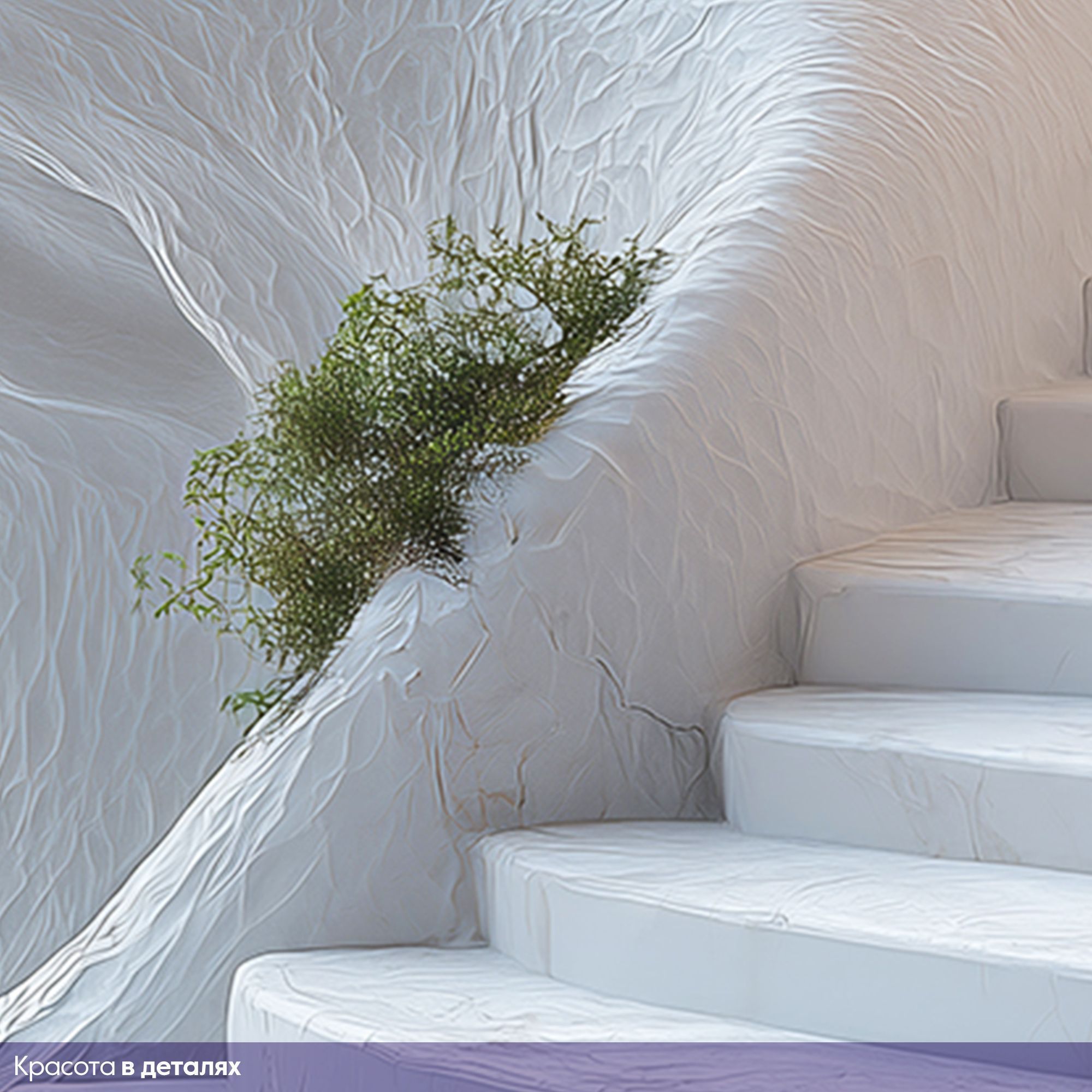 На картине раскрывается волшебный пейзаж, словно вышедший из глубин сказочной мечты. Изящные ступени, словно вырезанные из чистейшего мрамора, нежно поднимаются к пещере с причудливо изогнутыми и богато текстурированными стенами. Через её арочный проём открывается бескрайний океан под светлым, завораживающим небом, усыпанным мягкими, словно пух, облаками. На скалах изящно возвышается одинокое дерево, его пышная зелень утончённо сочетается с белоснежной гармонией окружающего ландшафта. Вся композиция дышит умиротворённостью, внутренней гармонией и лёгкостью, словно приглашая погрузиться в мечты и уединение у самого берега великого простора.