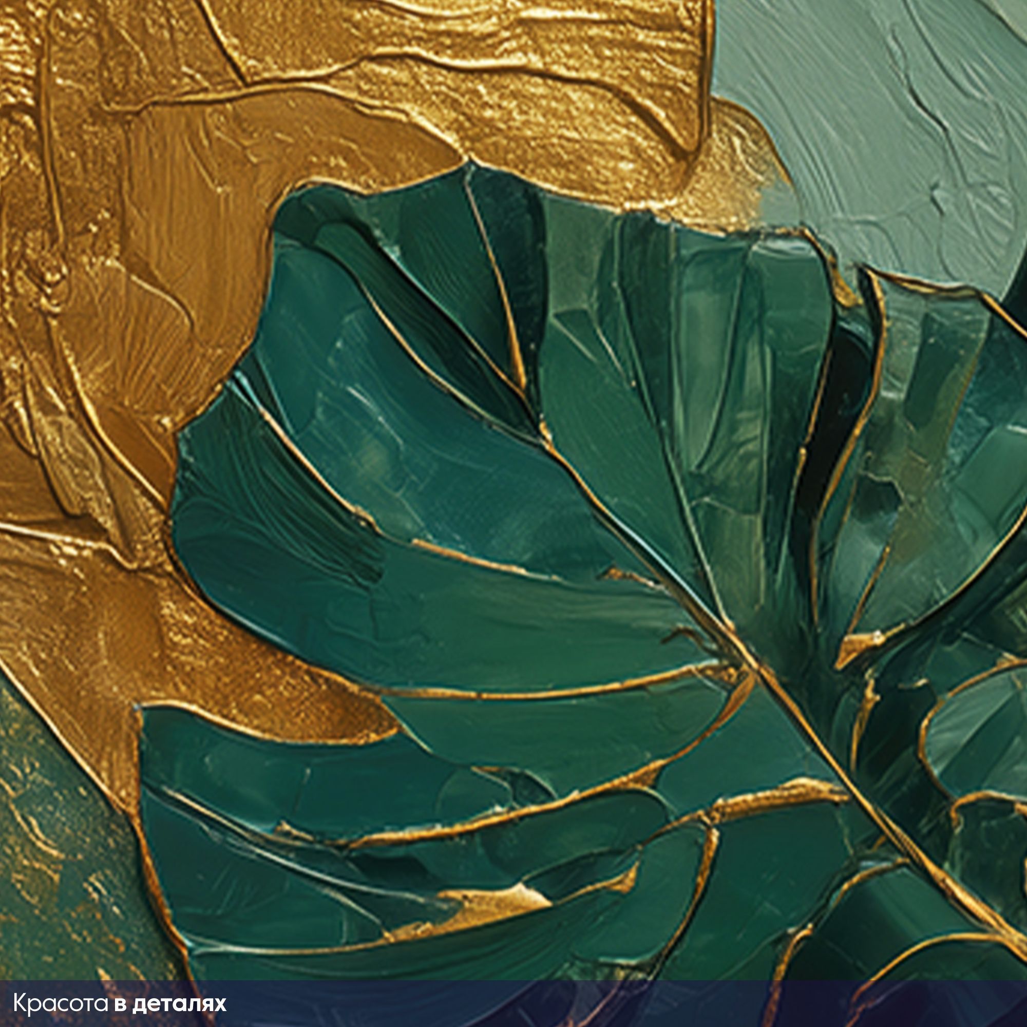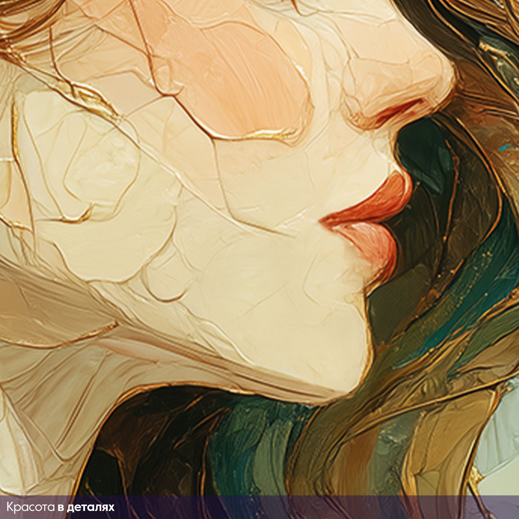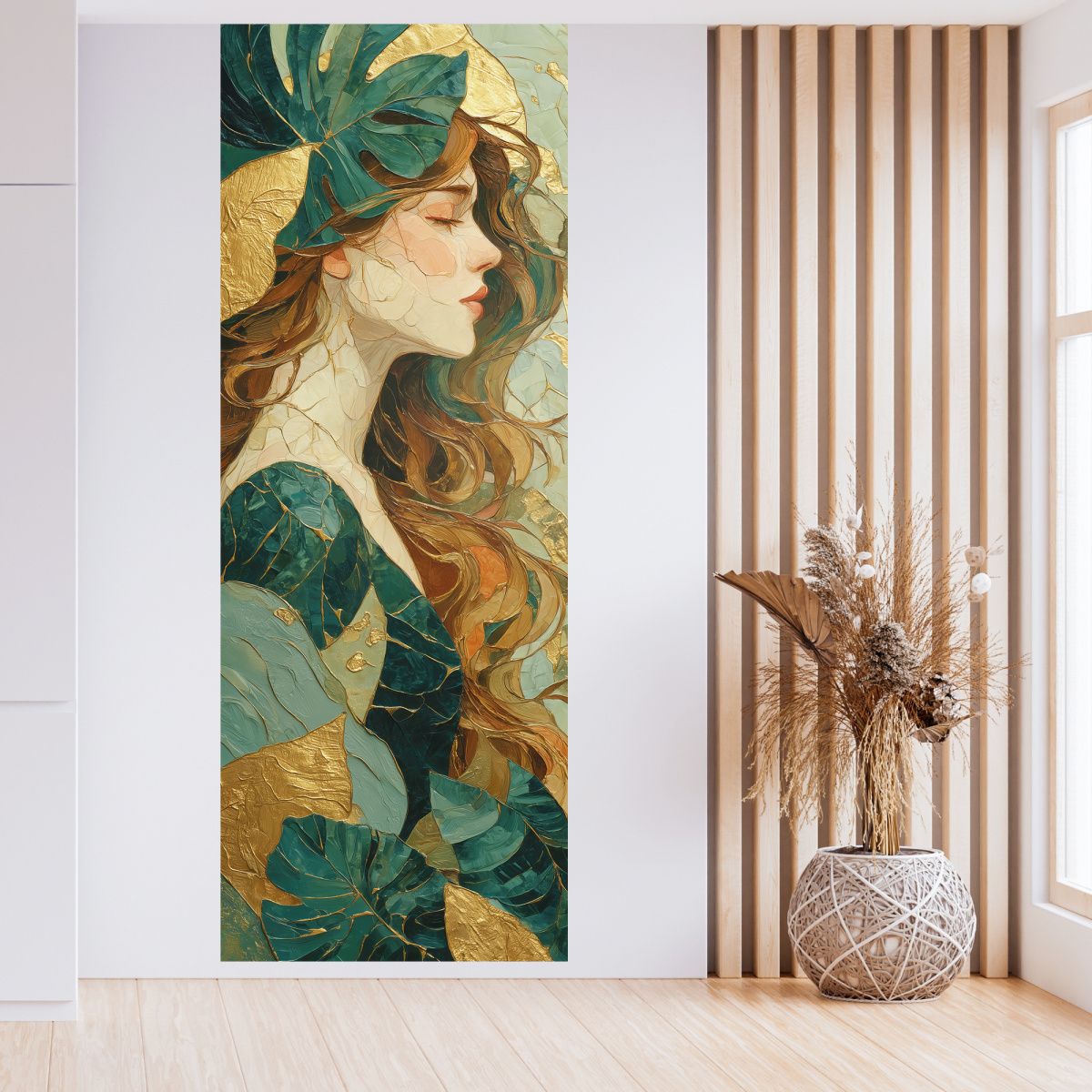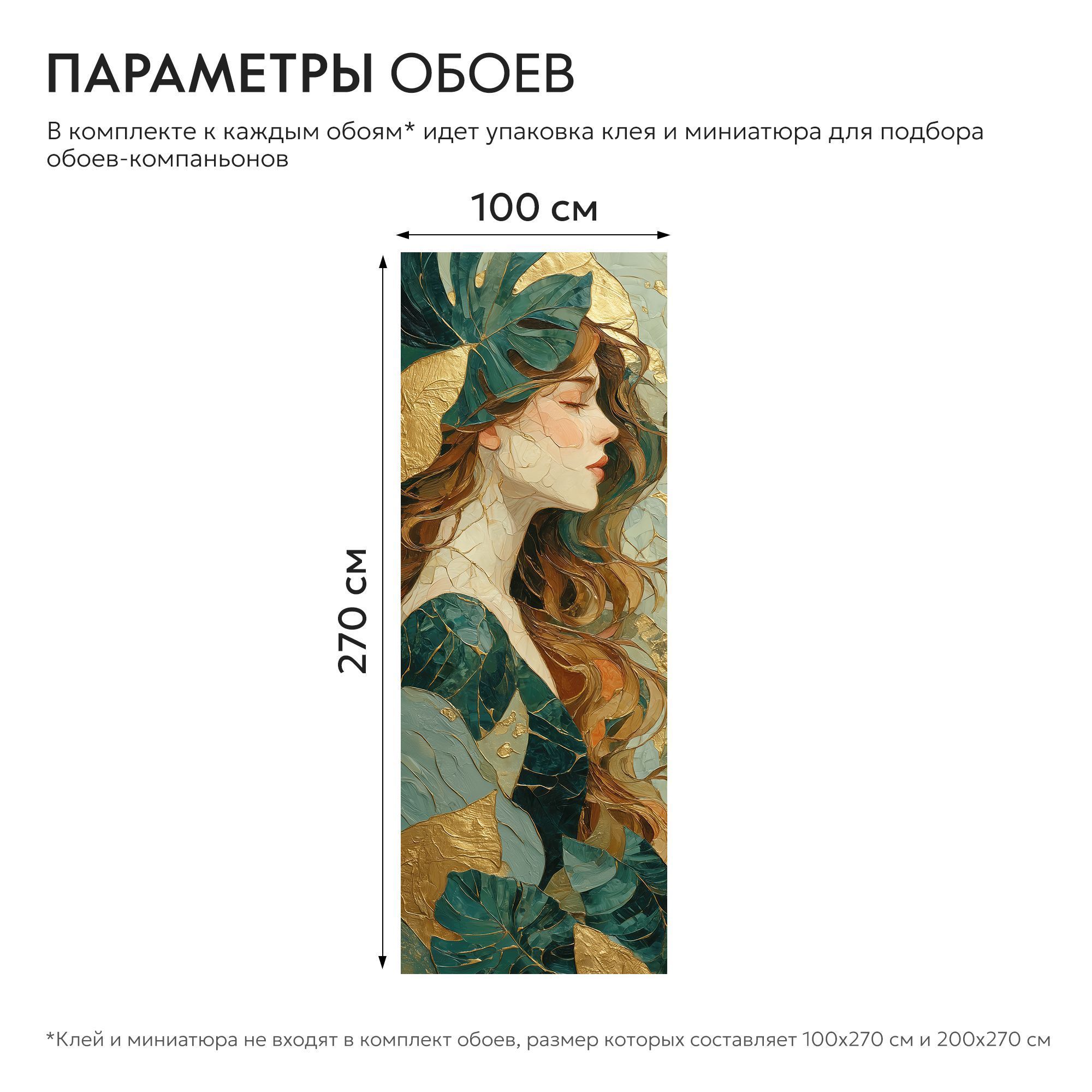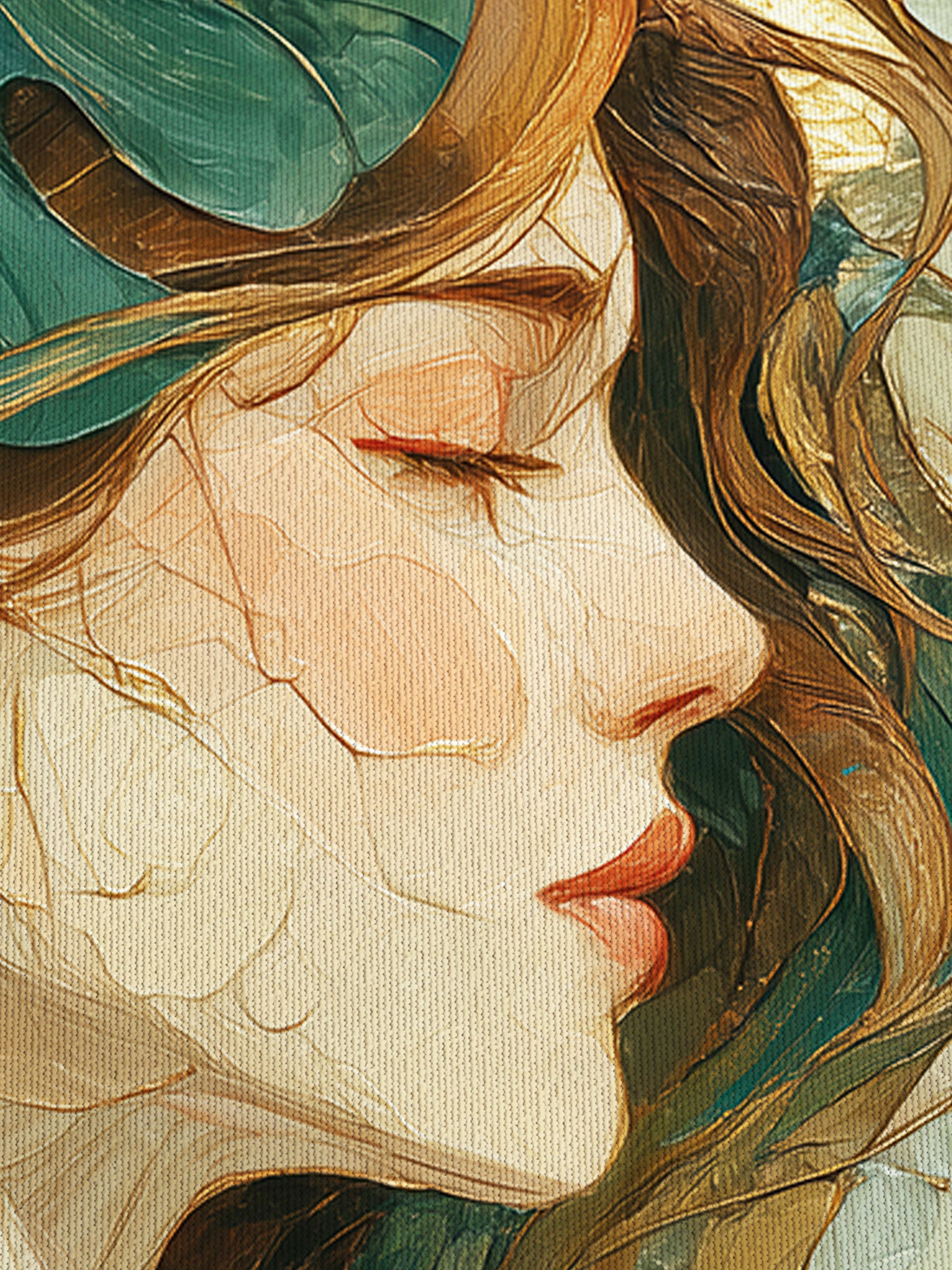 Эти фотообои представляют собой изящную смесь художественной живописи и декора, где женский профиль олицетворяет гармонию и утонченную красоту. Внимание привлекают плавные линии лица, передающие спокойствие и задумчивость, а также медовые оттенки волос, которые словно струятся на фоне. Особое очарование придают крупные листья монстеры зелёного и бирюзового цвета, искусно вплетённые в композицию. Золотистые вкрапления и штрихи добавляют роскошь и глубину, создавая эффект живой текстуры и объемности. Контраст тёплых и холодных оттенков усиливает визуальное восприятие, делая изображение притягательным и стильным. Такие фотообои станут эффектным акцентом в интерьере спальни, гостиной или арт-пространства, привнося атмосферу изящества, природной гармонии и внутреннего спокойствия.