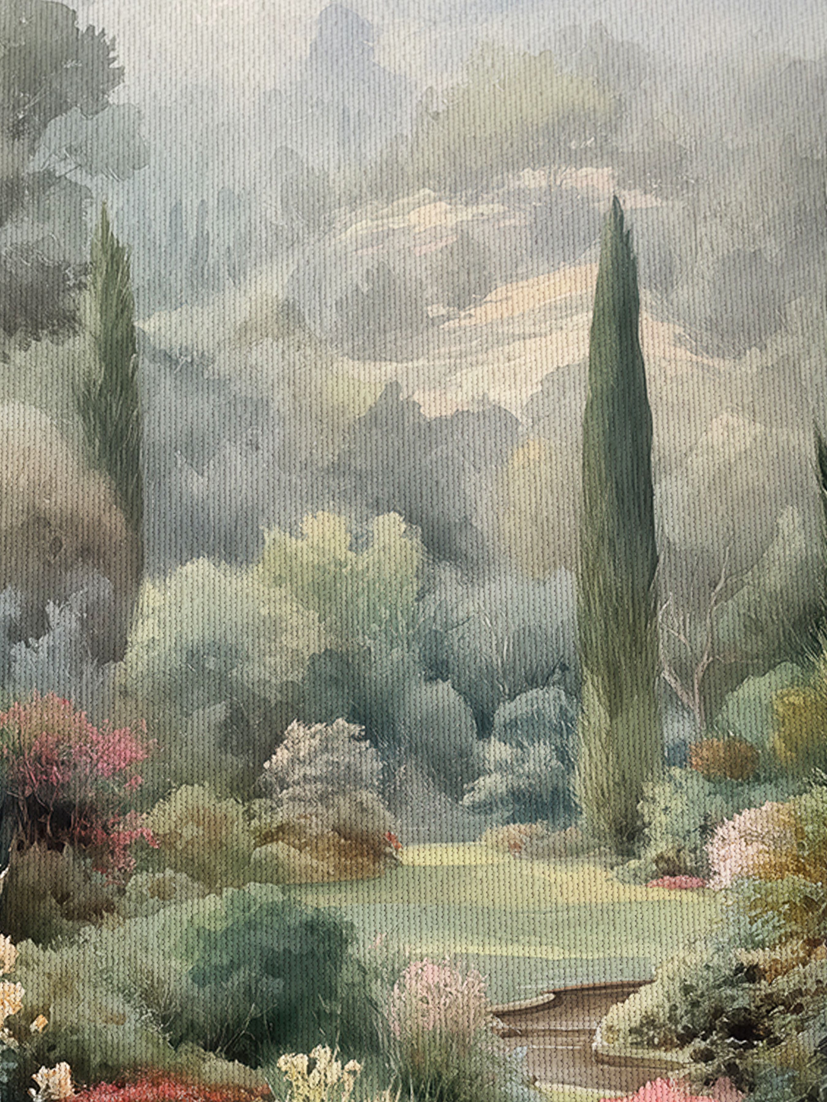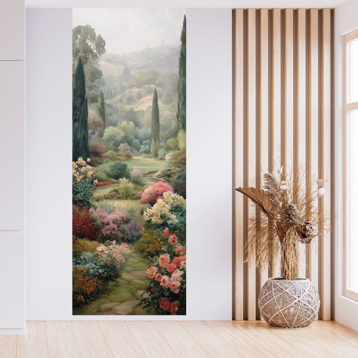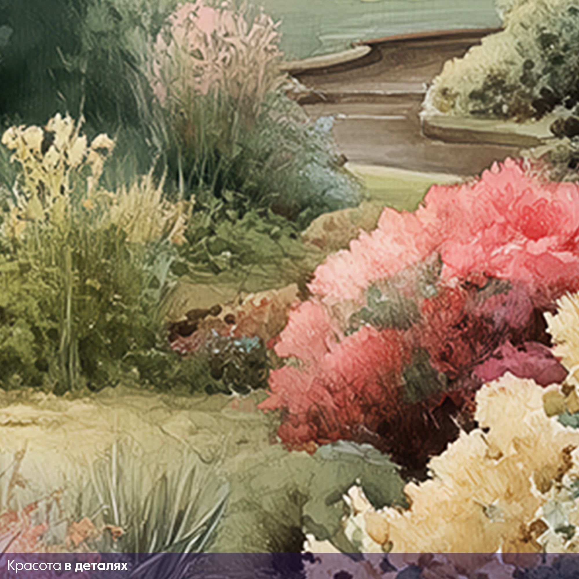 Эти фотообои переносят вас в сказочный уголок природы, где среди густой зелени и ярких цветочных композиций спрятан очаровательный домик с соломенной крышей и дымящимися трубами. Внимание к деталям – от нежных оттенков кисточек растений до мягкого света, просачивающегося сквозь листву – создаёт ощущение покоя и гармонии. Путь, между пышных цветников в разнообразных оттенках розового, белого, жёлтого и зелёного, будто приглашает пройтись по саду, почувствовать сердце природы и вдохновиться её красотой. Высокие деревья на заднем плане добавляют глубину и создают атмосферу уединённости. Идеальный выбор для тех, кто мечтает наполнить интерьер уютом и природной свежестью, почувствовать связь с природой и создать в доме атмосферу отдыха и умиротворения.