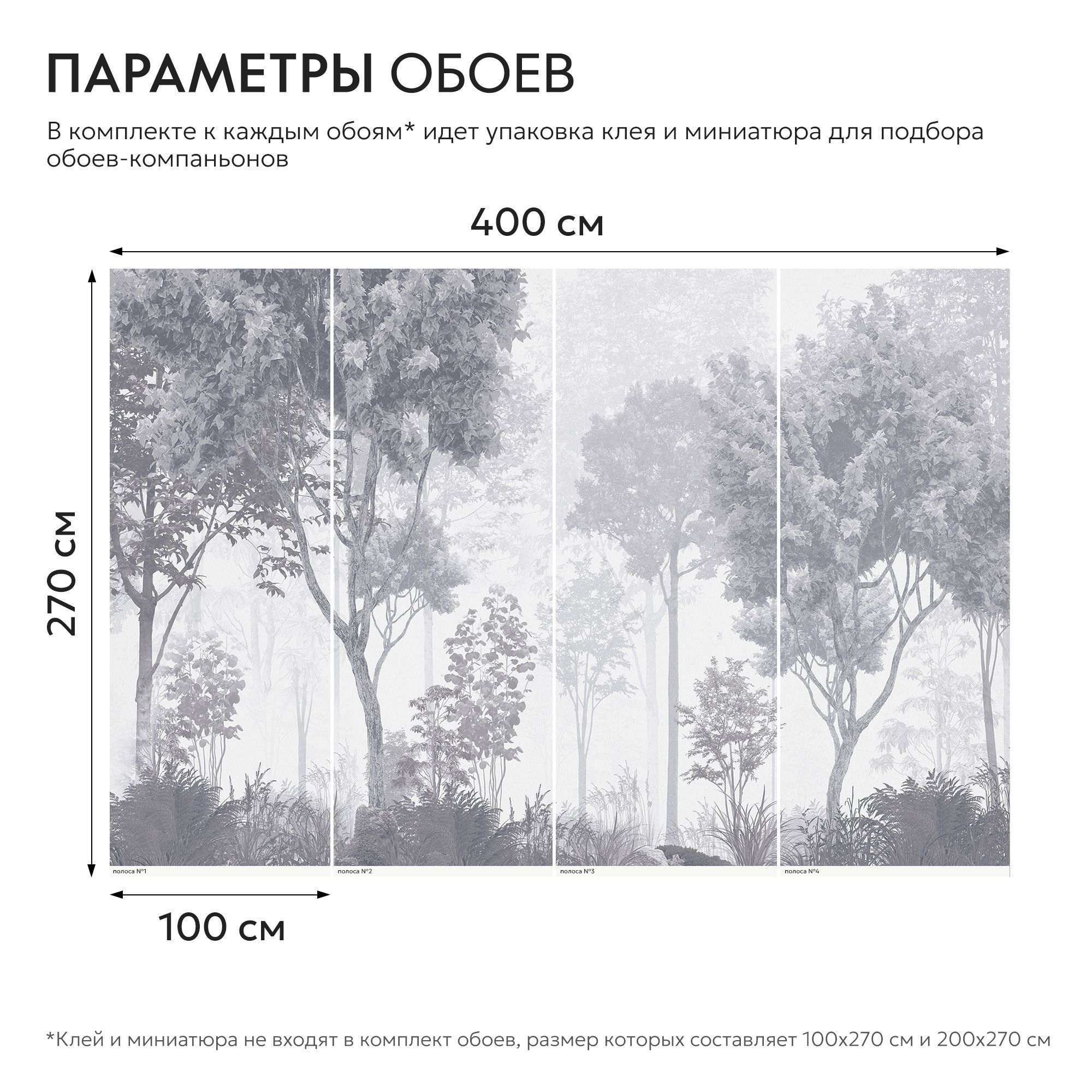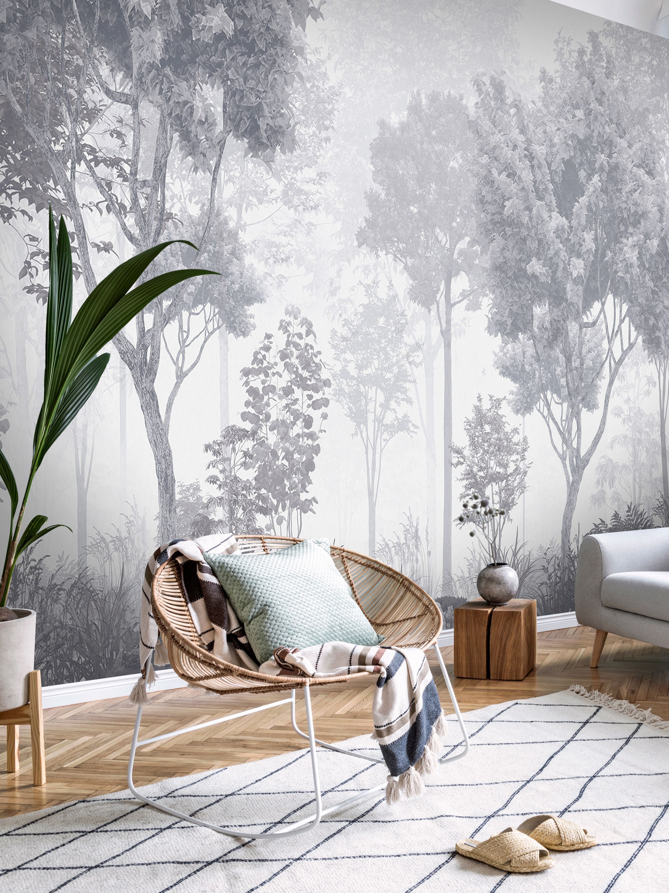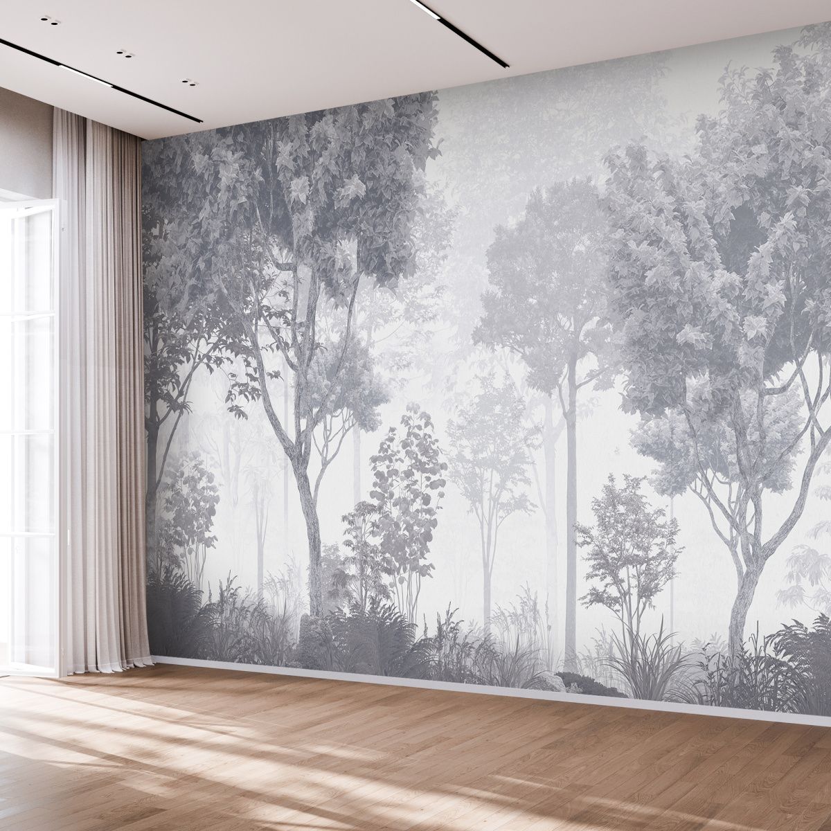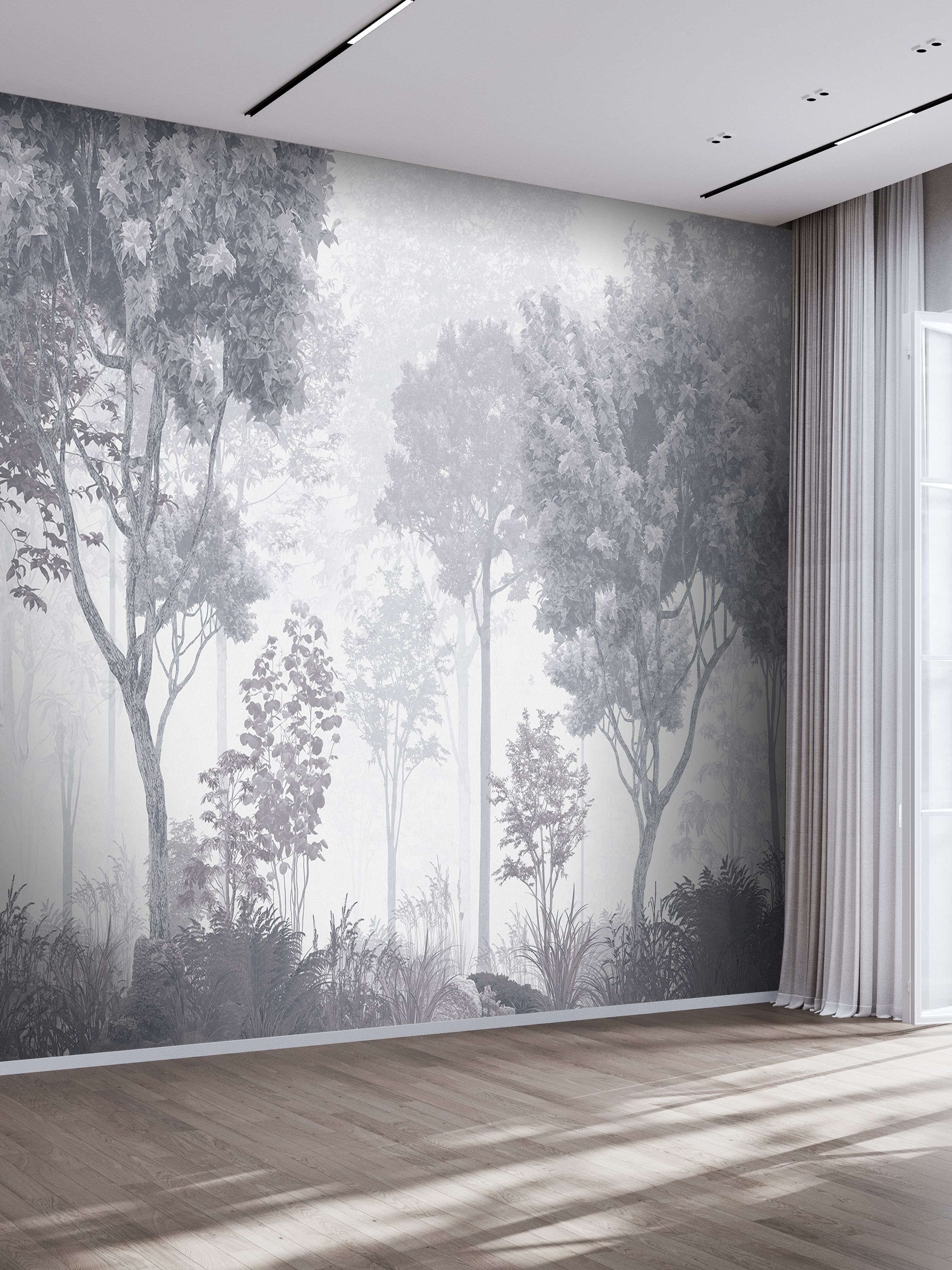 Эти фотообои передают атмосферу утреннего тумана в лесу, погружая пространство в лёгкую, мистическую и умиротворённую гамму. Оттенки серого создают эффект глубины и воздушности, словно деревья постепенно растворяются в дымке, что добавляет интерьеру ощущение пространства и спокойствия. Лёгкая монохромная палитра подчёркивает природную красоту и структуру деревьев, делая композицию одновременно сдержанной и выразительной. Обилие листвы и разнообразие форм создают живую текстуру, которая не перегружает, а органично дополняет пространство. Подходит для гостиных, кабинетов и спален, где необходима атмосфера умиротворённости и лёгкого уединения. Такие обои станут прекрасным фоном для современных интерьеров, которые стремятся к естественной гармонии и спокойно-природной эстетике.