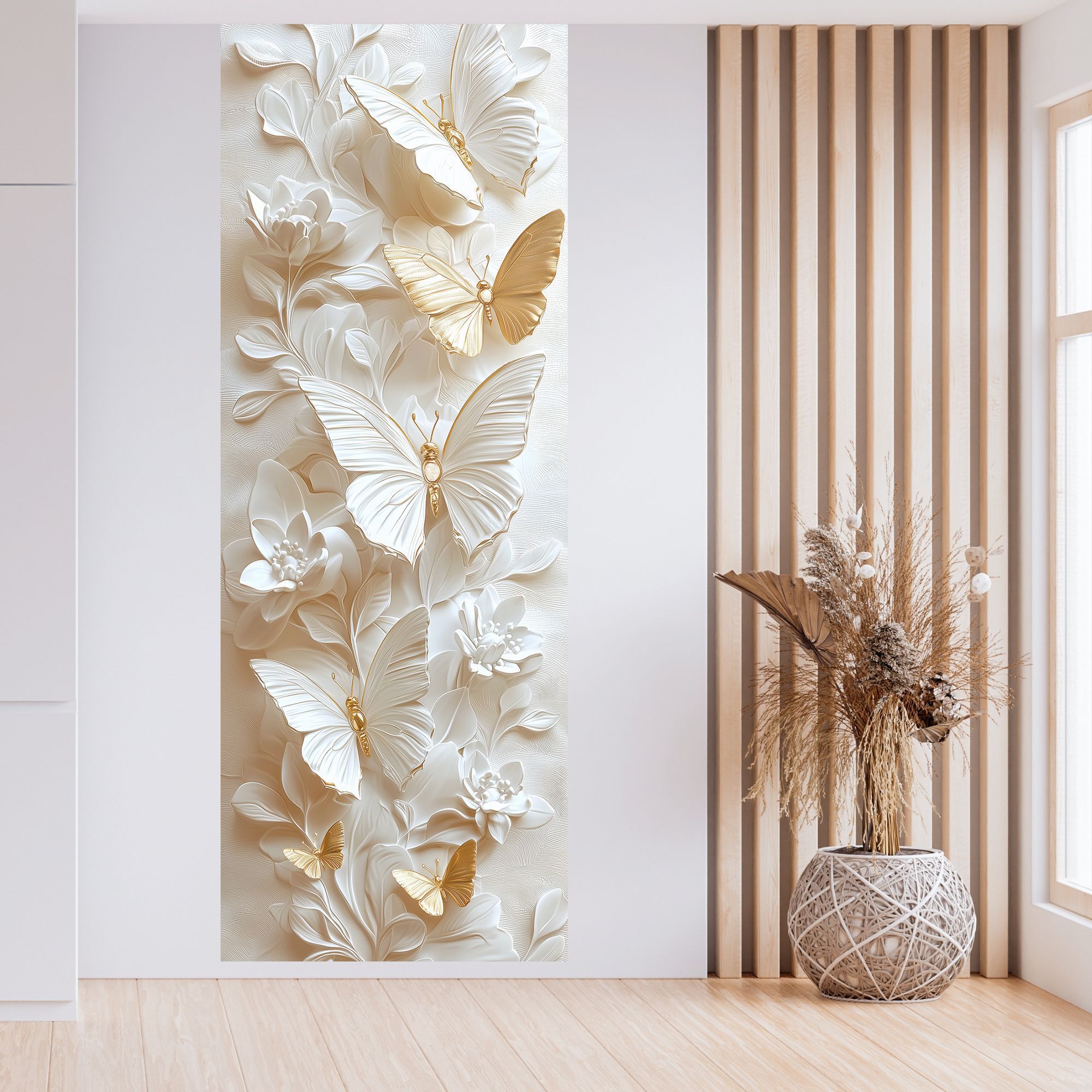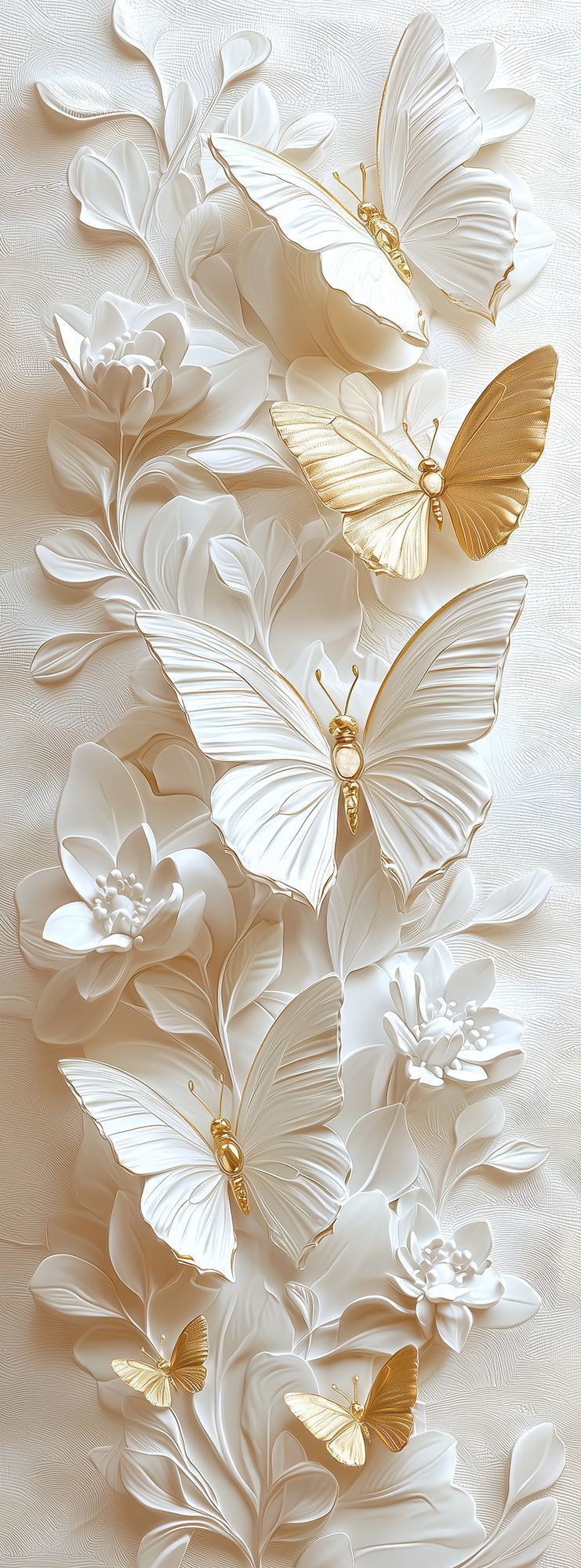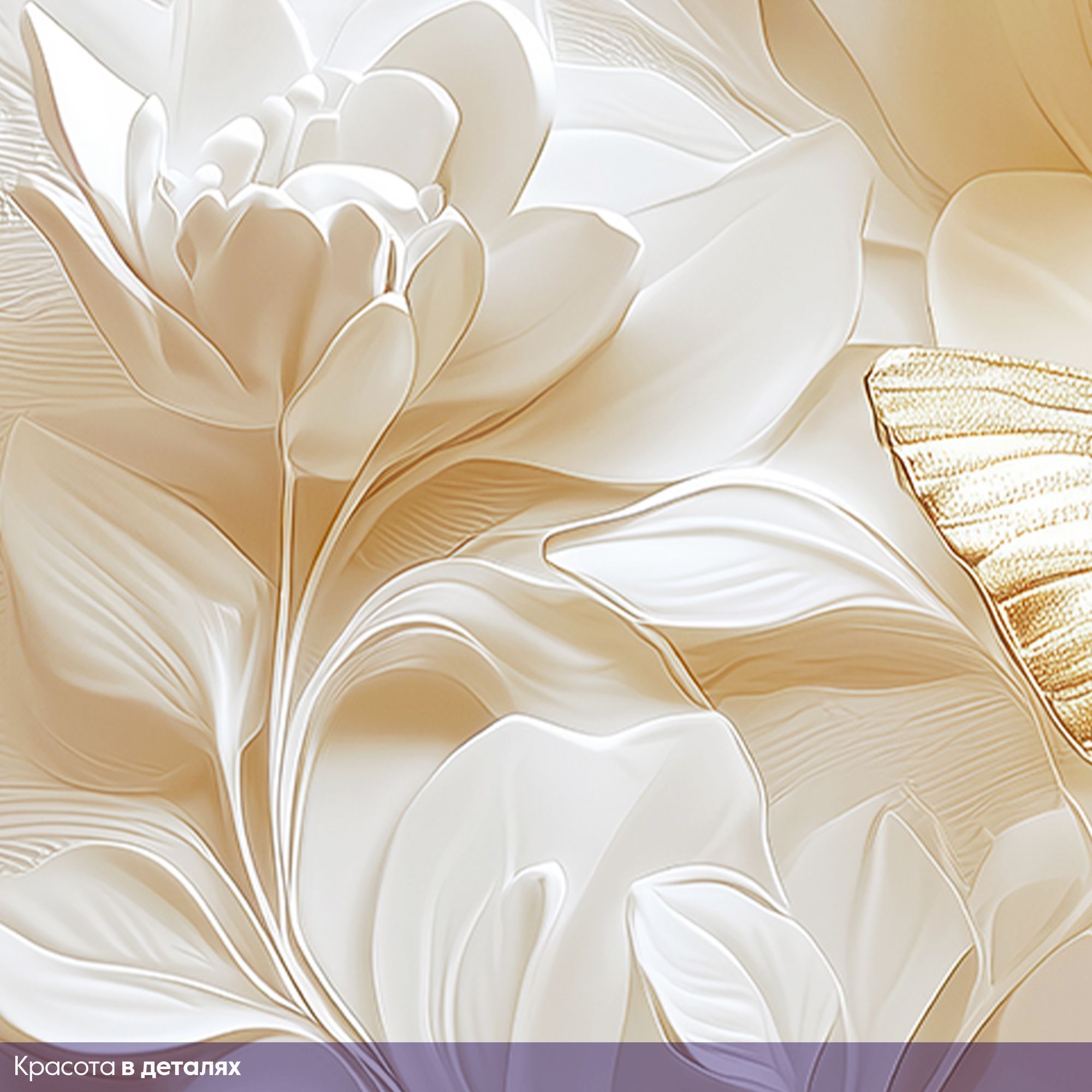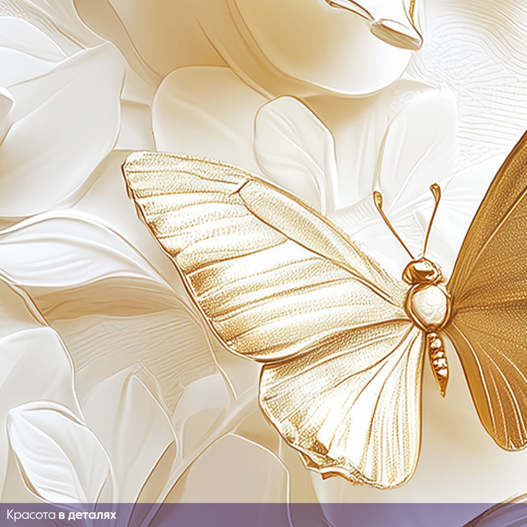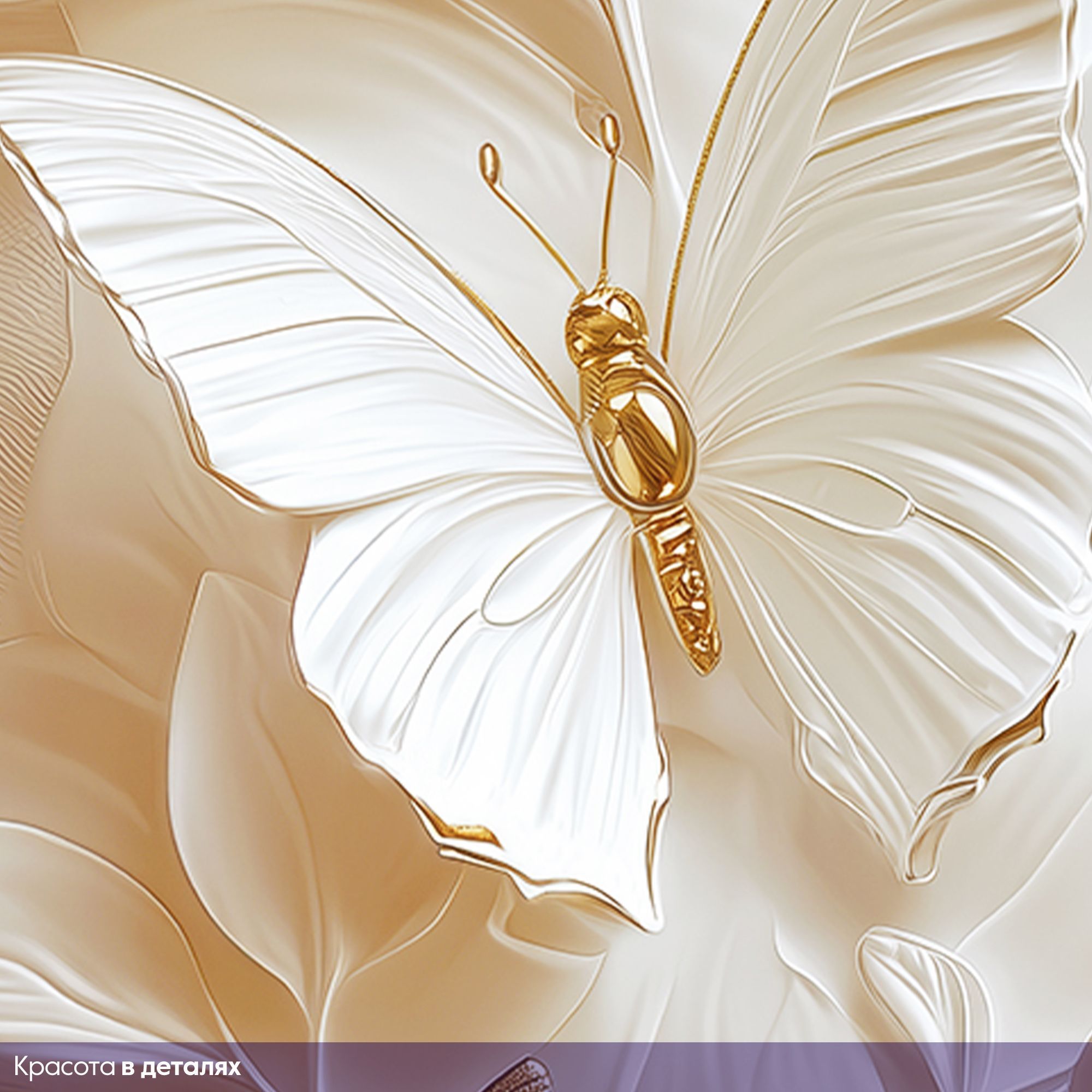 Эти изящные фотообои воплощают в себе гармонию лёгкости и утончённости. Белоснежные бабочки с тонкой фактурой крыльев словно парят над слоистым фоном из стилизованных листьев, выполненных в нежных пастельных оттенках. Изюминкой композиции служат золотистые детали на телах бабочек, которые придают изображению особую роскошь и изящество. Такой дизайн создаёт неповторимую атмосферу спокойствия и умиротворения, позволяя интерьеру наполниться светом и воздушностью. Благодаря сочетанию белого с золотыми акцентами обои прекрасно впишутся в современные и классические пространства, подчеркнут стиль гостиной, спальни или кабинета, а также станут вдохновляющим фоном для творческих зон. Идеально подойдёт тем, кто ценит элегантность, лёгкость и хочет привнести в дом элемент природной красоты в художественном исполнении.