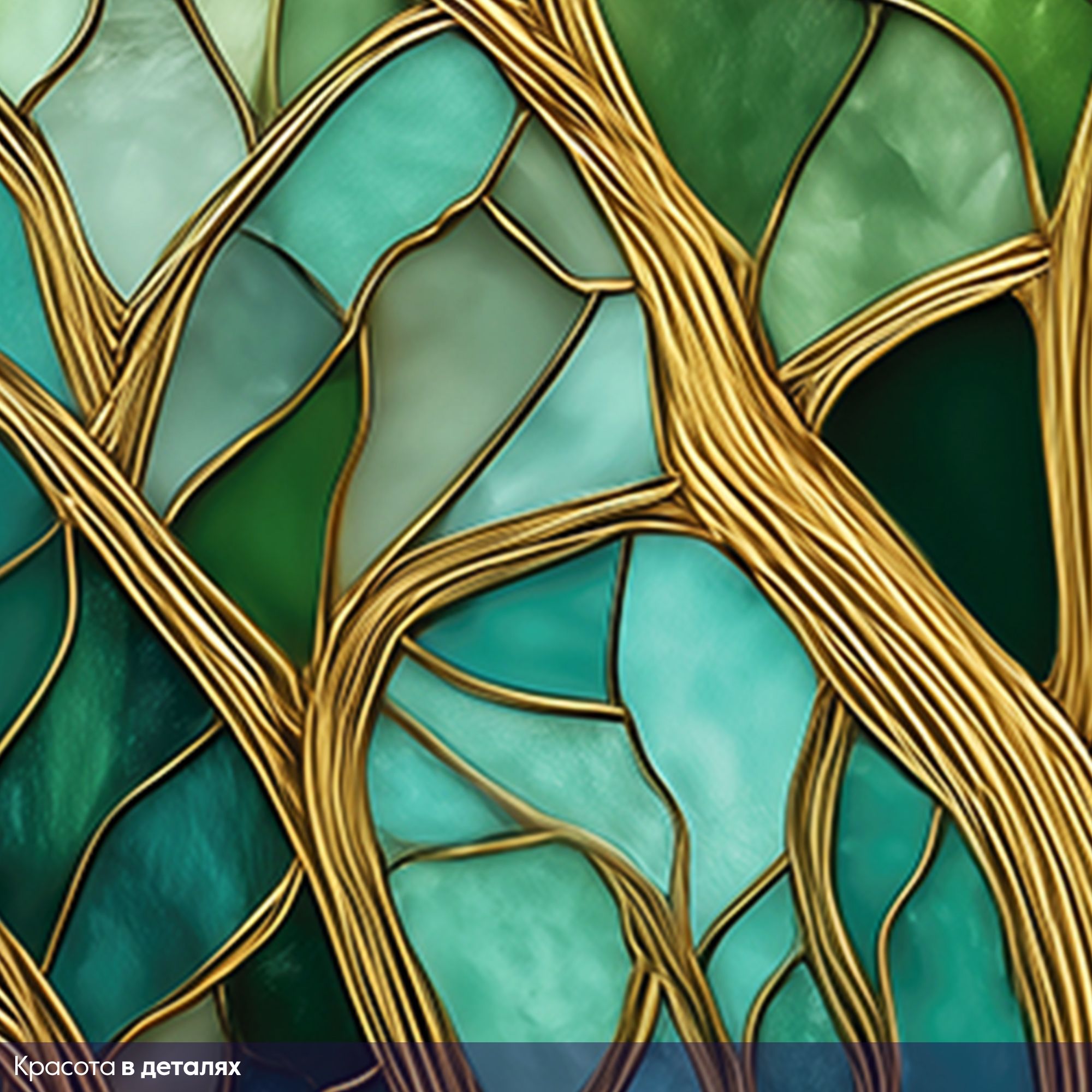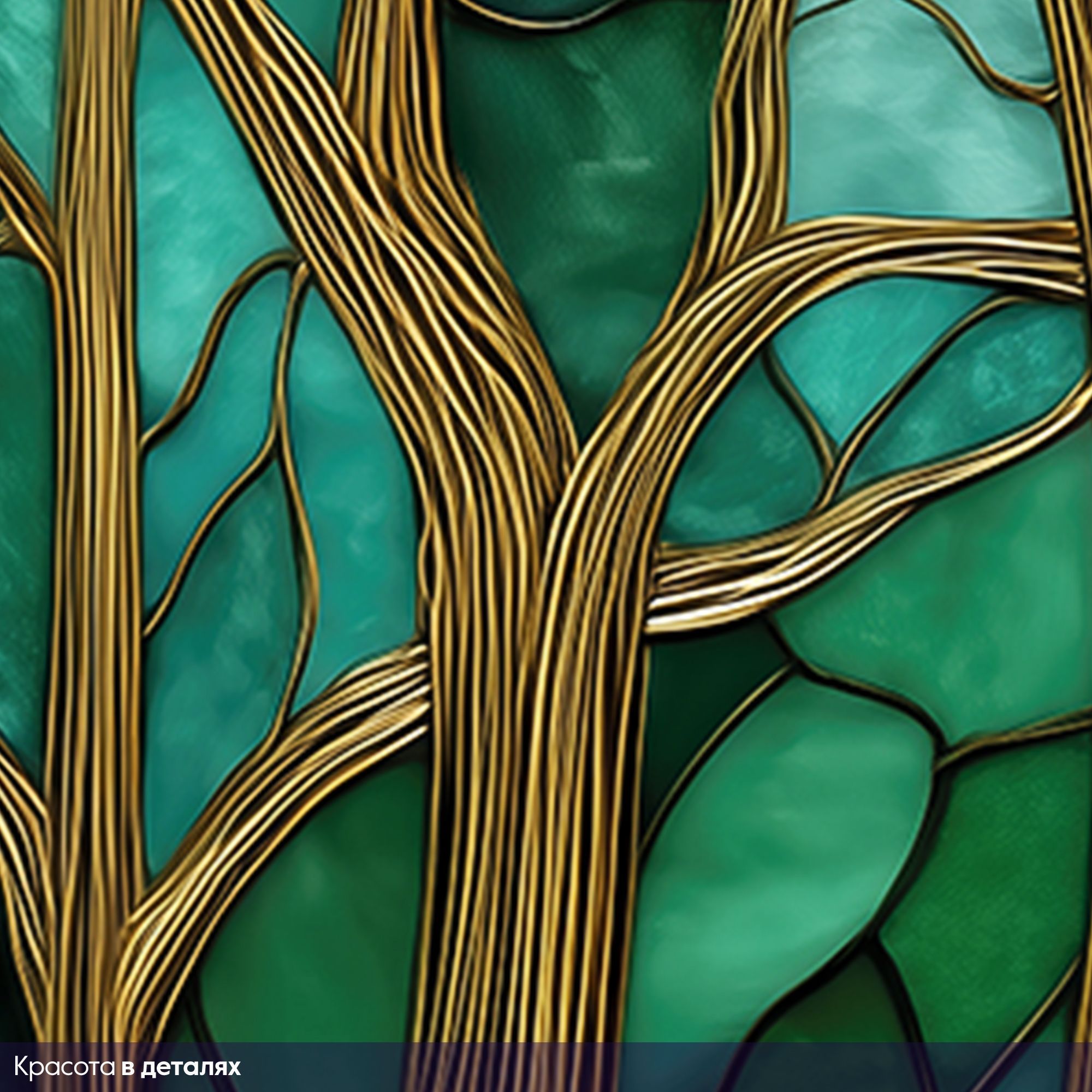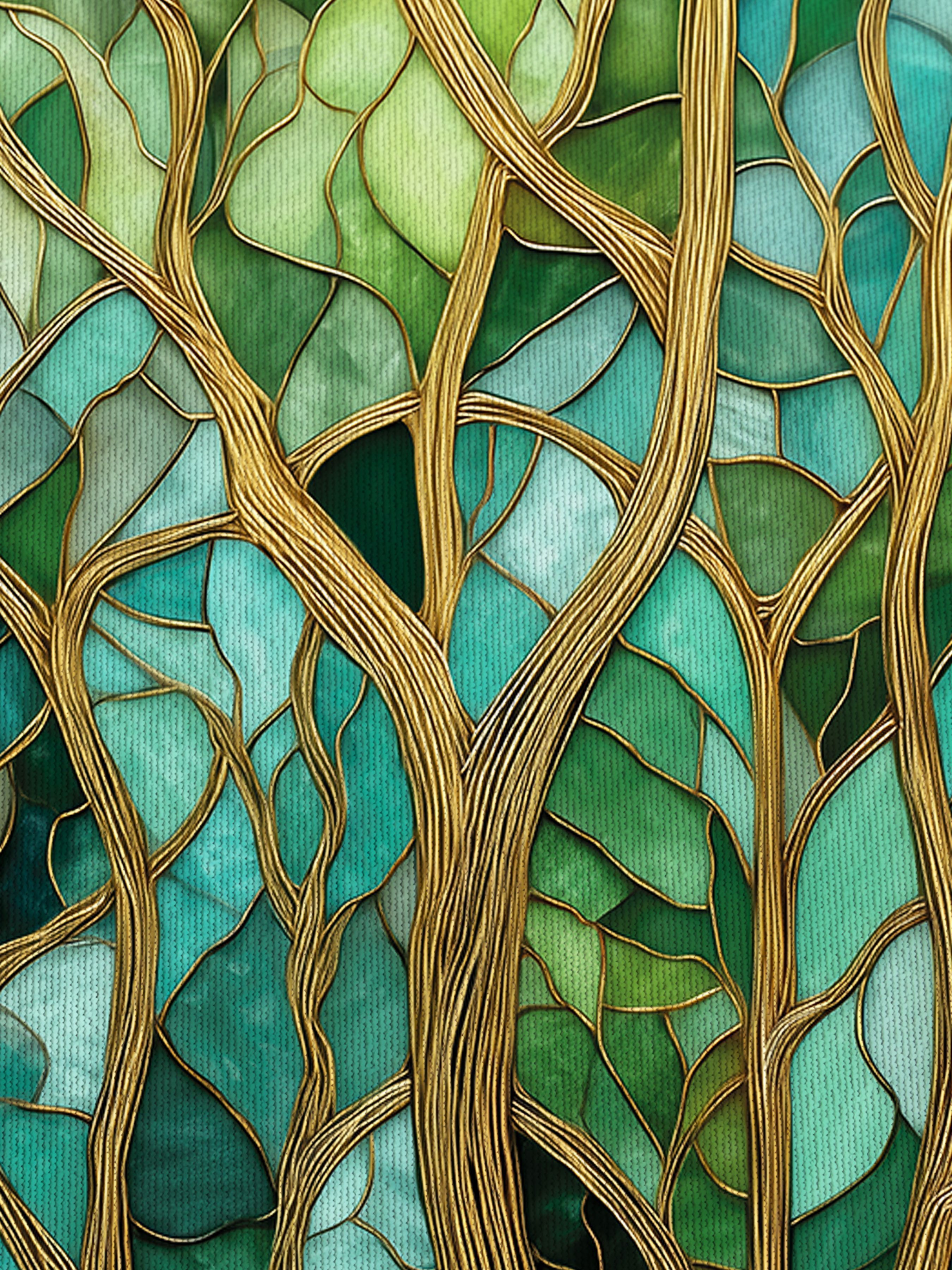 Эти фотообои выполнены в уникальной технике, напоминающей витражное искусство, где каждая ветка и лист словно вырезаны из стекла разных оттенков зелёного, бирюзового и бирюзово-синего. Тонкие золотистые контуры филигранно обрамляют стволы и ветви, придавая изображению глубину и благородный блеск. Композиция очаровывает своей гармонией — переплетение ветвей создает эффект живого, дышащего леса, а плавные переходы оттенков погружают в атмосферу умиротворённости и природной свежести. Такой дизайн идеально впишется в интерьер, добавляя ему элегантности, спокойствия и изящества, при этом не нарушая общего баланса пространства. Фотообои идеально подойдут для гостиных, кабинетов или спален, где хочется создать атмосферу естественной красоты и вдохновения, напоминая о гармонии природы и искусства.