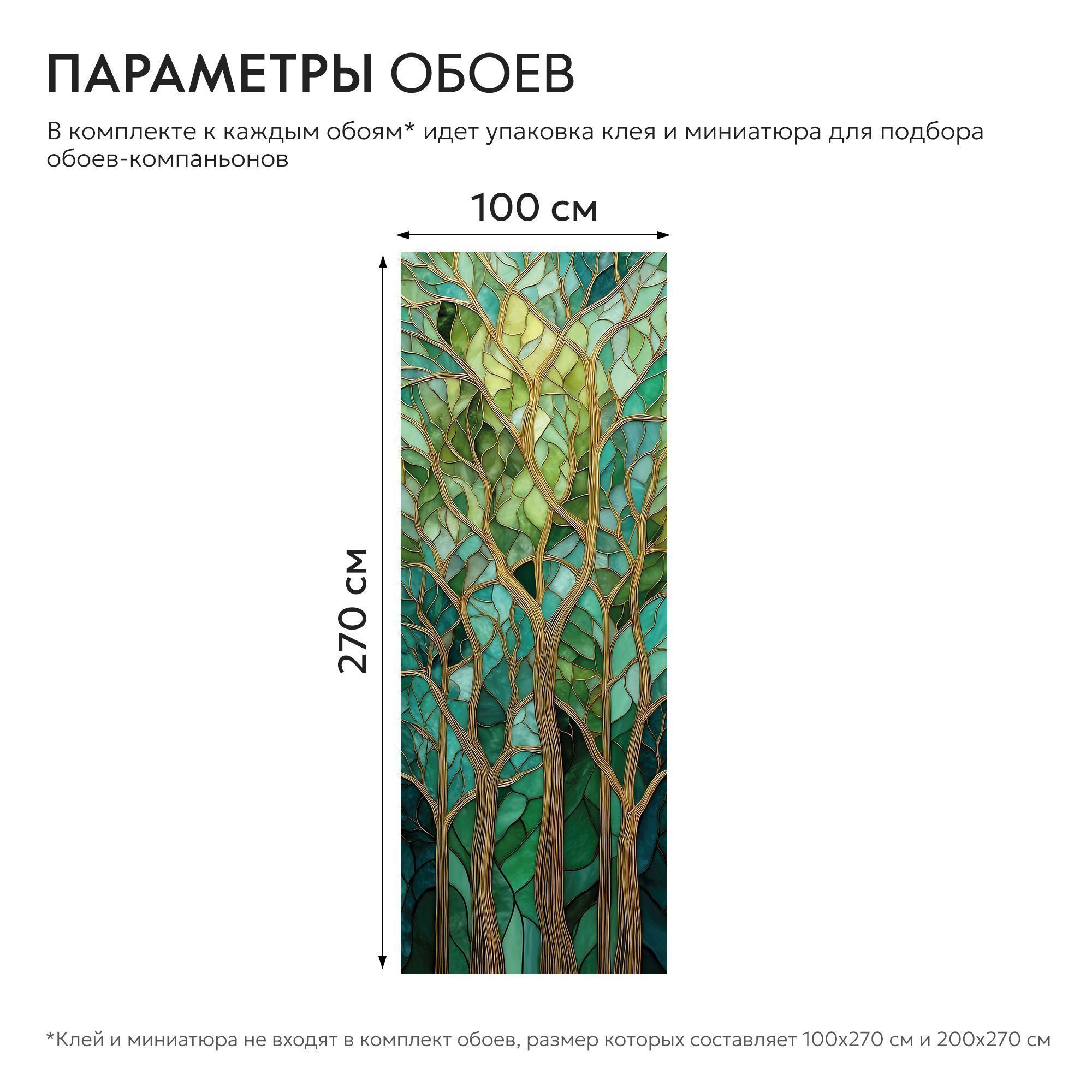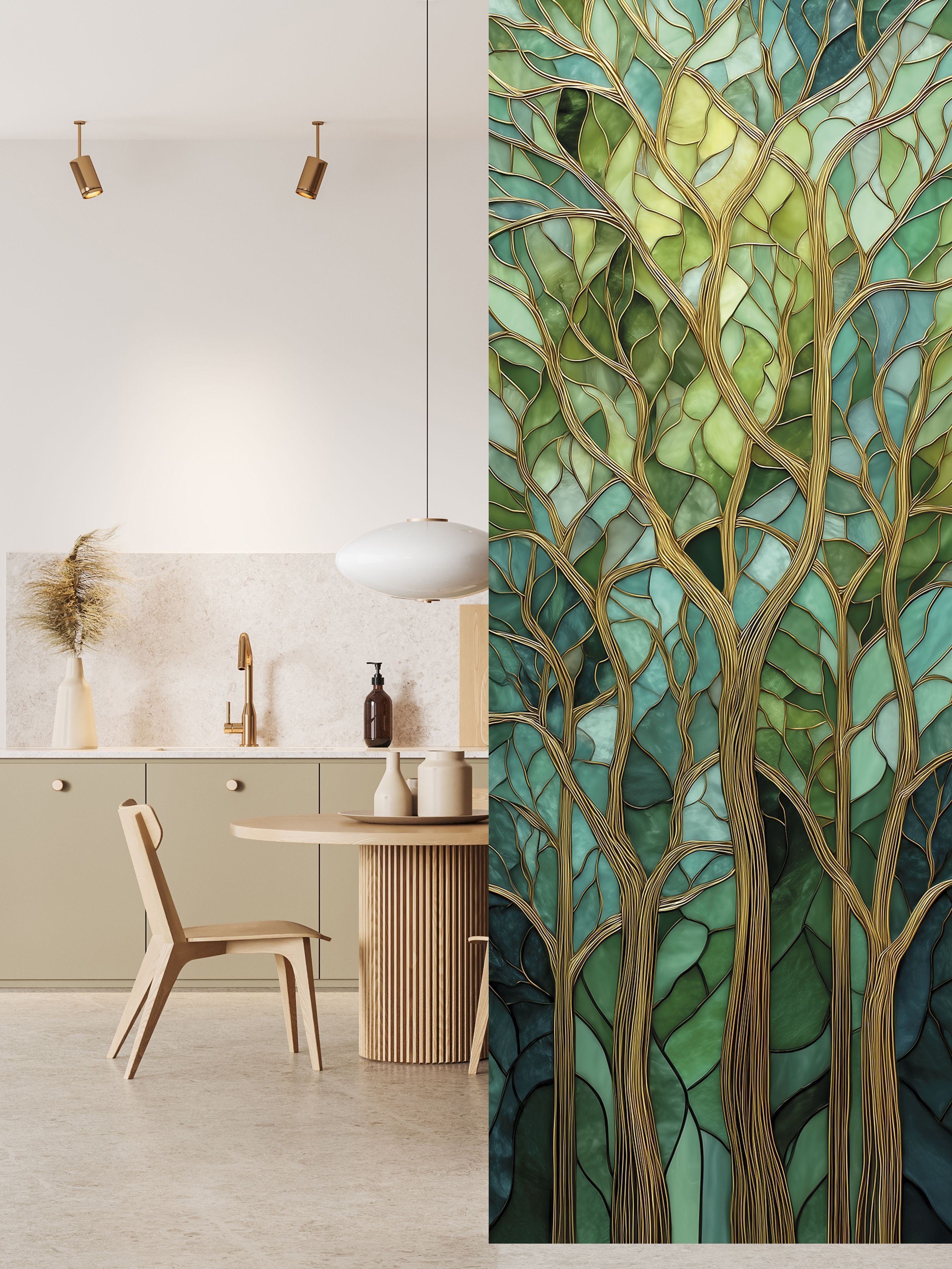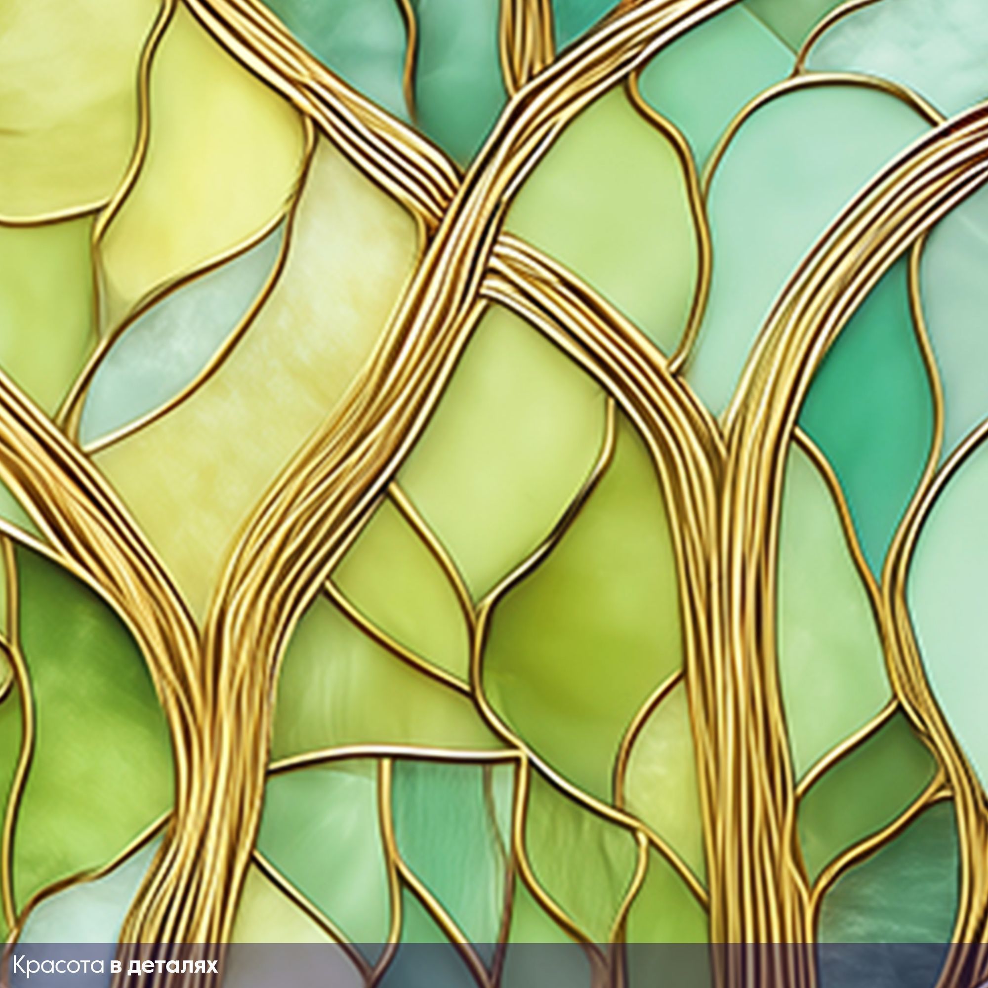 Эти фотообои выполнены в уникальной технике, напоминающей витражное искусство, где каждая ветка и лист словно вырезаны из стекла разных оттенков зелёного, бирюзового и бирюзово-синего. Тонкие золотистые контуры филигранно обрамляют стволы и ветви, придавая изображению глубину и благородный блеск. Композиция очаровывает своей гармонией — переплетение ветвей создает эффект живого, дышащего леса, а плавные переходы оттенков погружают в атмосферу умиротворённости и природной свежести. Такой дизайн идеально впишется в интерьер, добавляя ему элегантности, спокойствия и изящества, при этом не нарушая общего баланса пространства. Фотообои идеально подойдут для гостиных, кабинетов или спален, где хочется создать атмосферу естественной красоты и вдохновения, напоминая о гармонии природы и искусства.