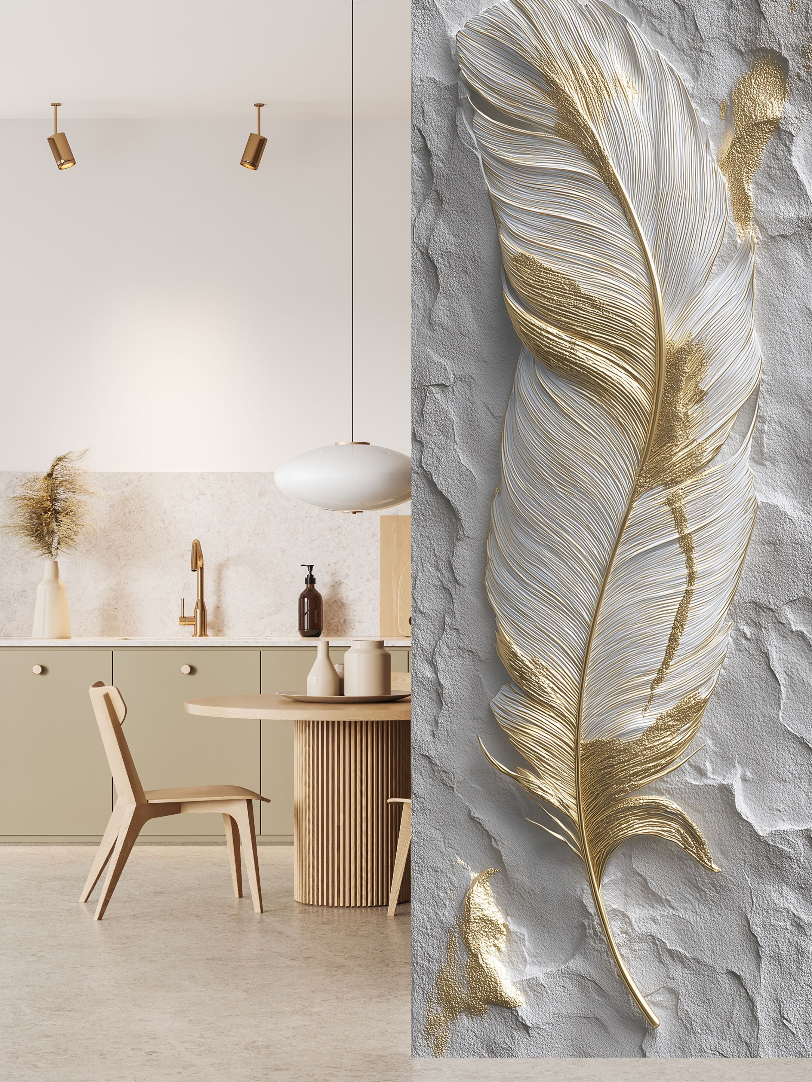 Эти фотообои представляют собой элегантное сочетание минимализма и роскоши. Главный элемент — крупное, детализированное перо, выполненное в сочных белых и золотых оттенках, с тонкой прорисовкой каждой линии, что придаёт ему эффект объёма и живости. Использование золота в рисунке добавляет глубину и благородство, создавая ощущение изящества и утончённости. Фон имитирует фактурную поверхность серого камня или штукатурки, что обеспечивает контраст мягкости пера и жёсткости окружающего пространства. Это сочетание натуральной текстуры и одновременно декоративного элемента делает изображение стильным и универсальным. Такие фотообои идеально подойдут для современных интерьеров, любящих спокойствие, воздушность и при этом ценящих изысканные детали. Они способны стать акцентом в гостиной, спальне или кабинете, привнося атмосферу лёгкости и элегантной красоты.