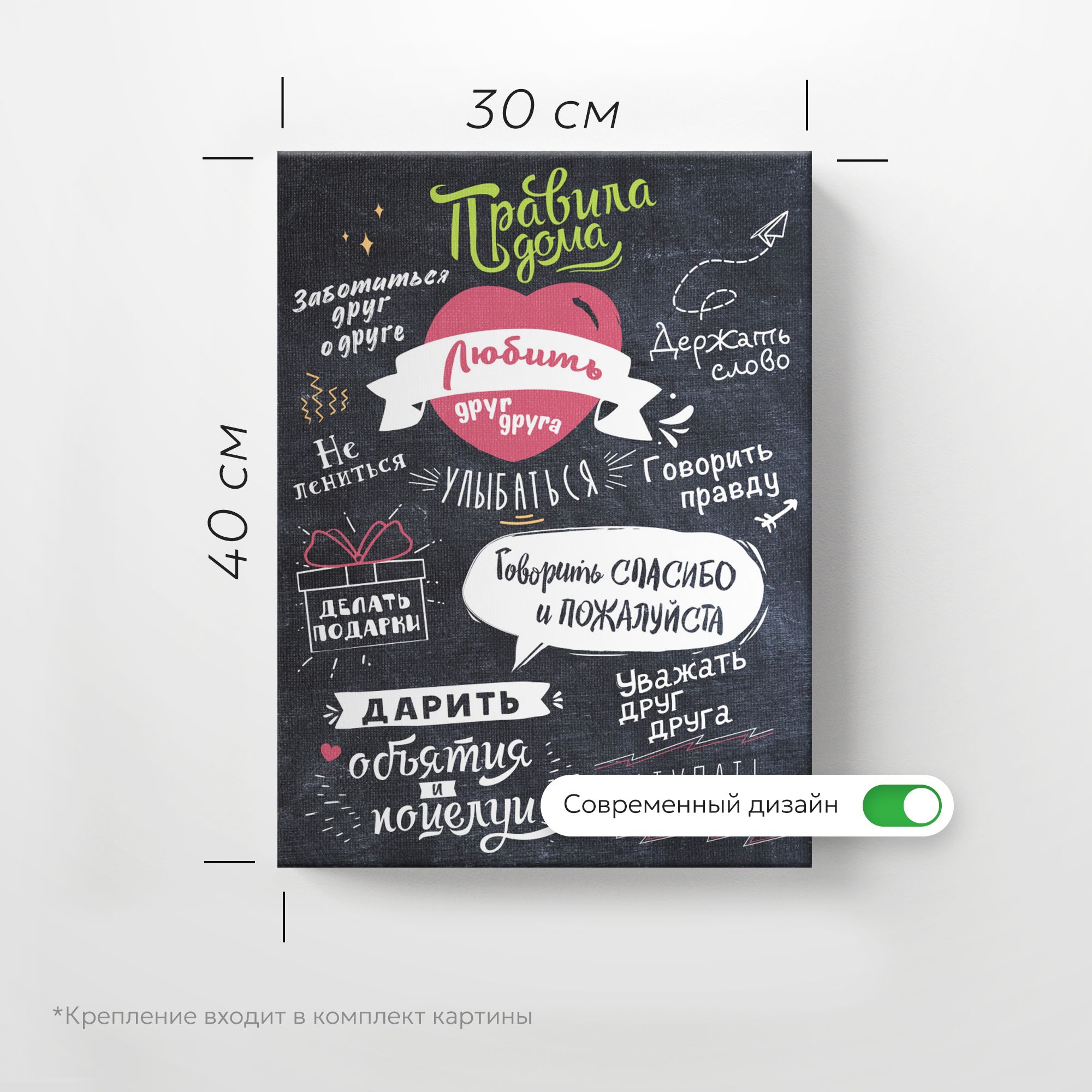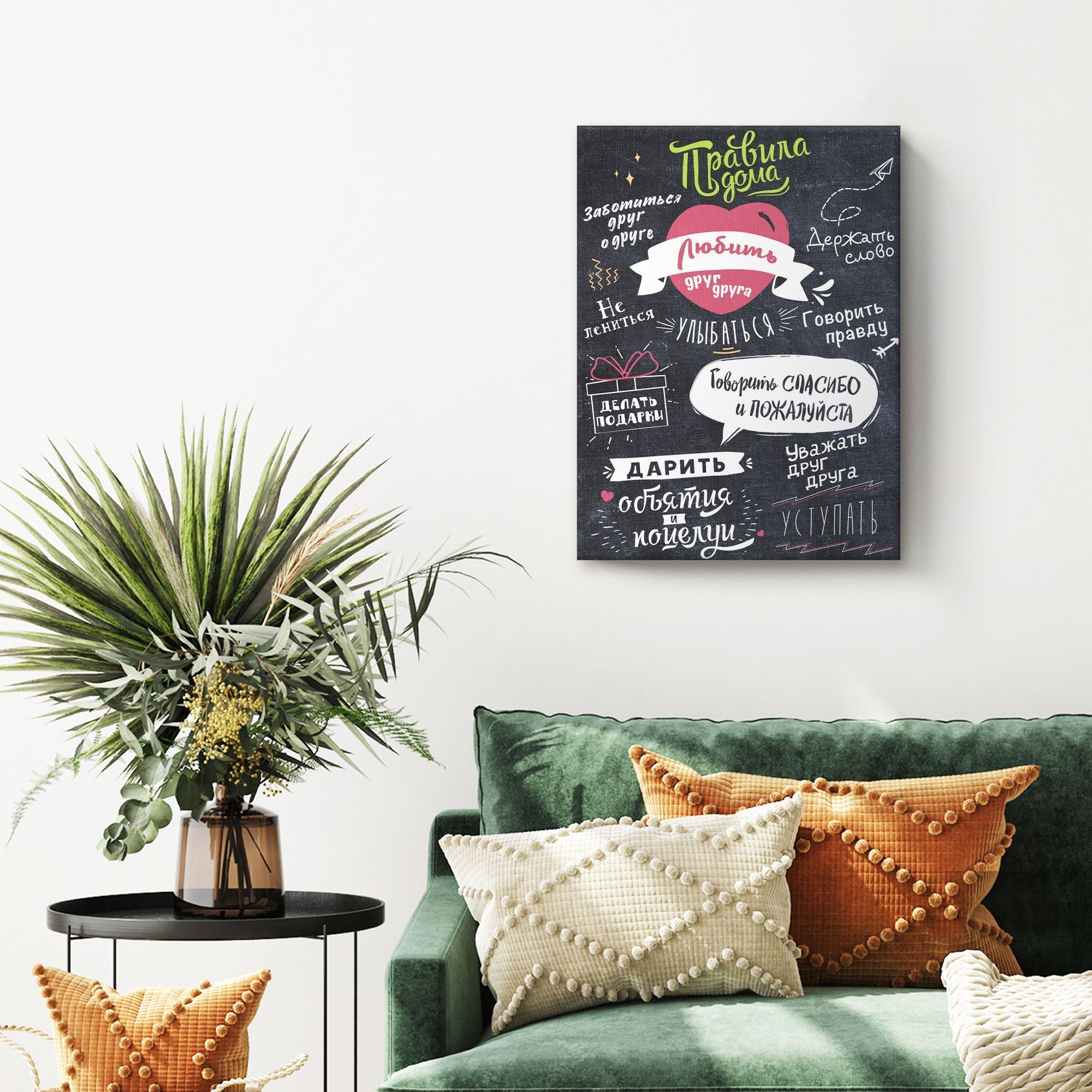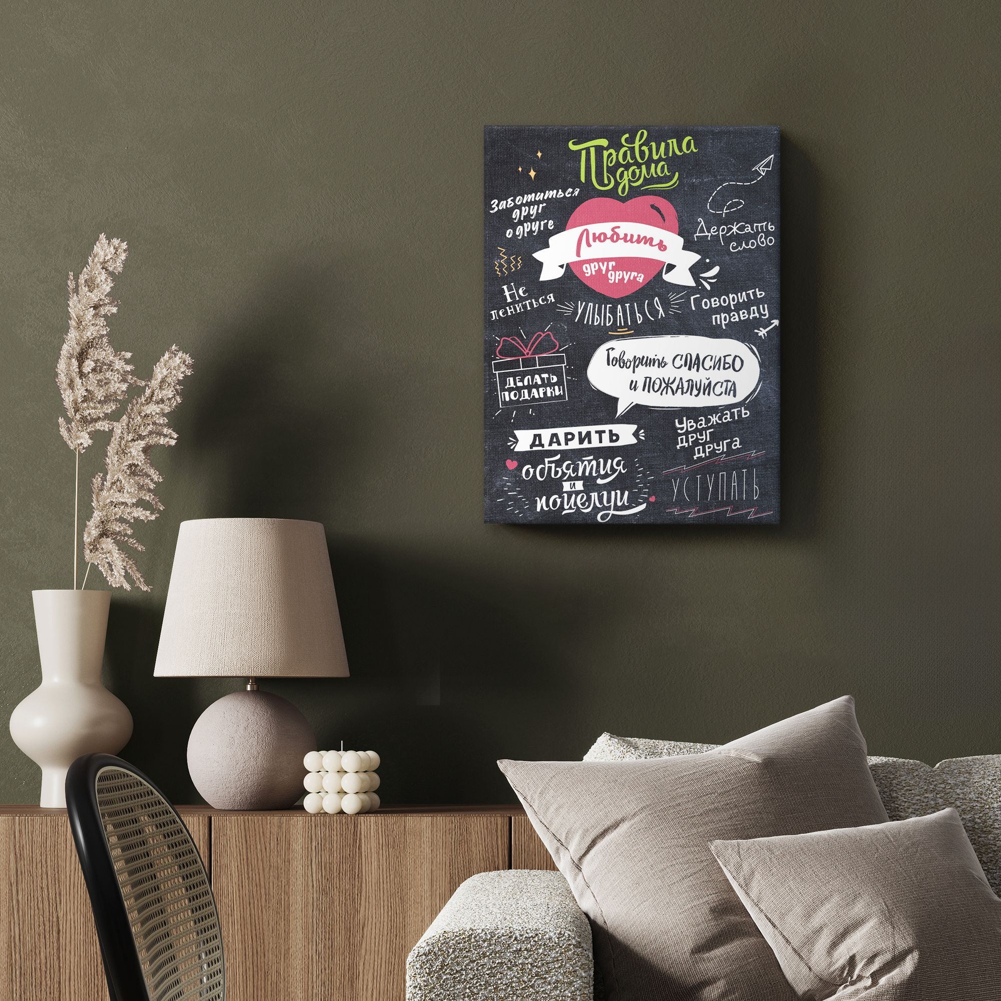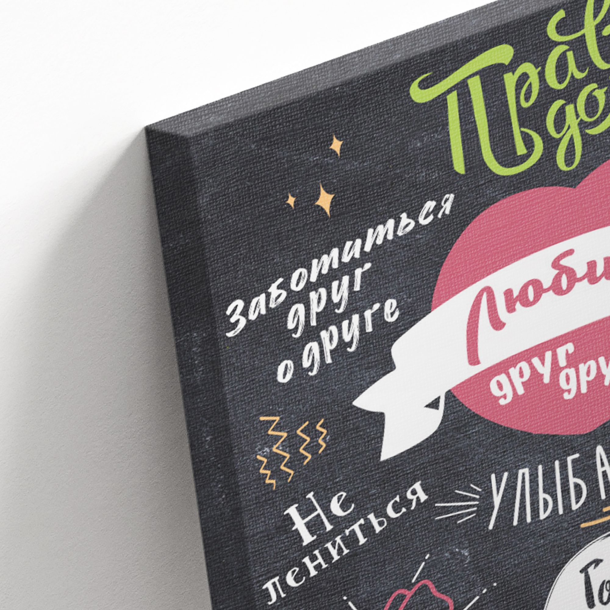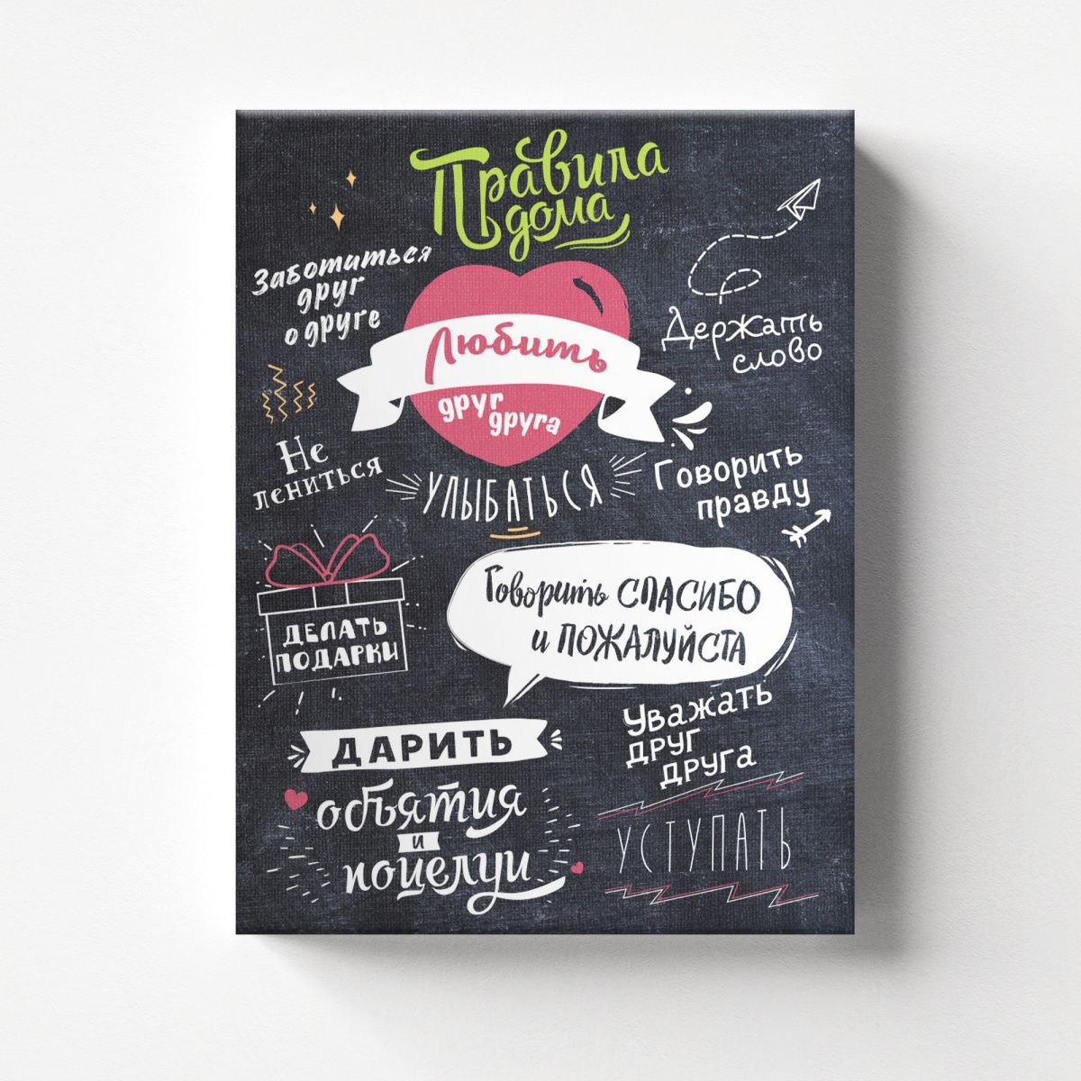 Приятная взгляду картина на холсте «Правила дома 2» создана для того, чтобы украсить ваше жилище. Согласитесь, что оглашенные правила сделают совместное проживание более приятным и позитивным. Стильный элемент декора дополнит оформление гостиной комнаты, кухни или даже террасы. Его можно разместить как на одной из стен, так и поставить на полку или столик. Добрые правила дома на холсте найдут отклик в душе у каждого. Они будут служить напоминанием о тех главных вещах, которые в суматохе будних дней могут показаться неважными. Но на самом деле так важно уделить близкому человеку хотя бы несколько минут своего времени и сказать о своей любви, проявить заботу или подчеркнуть уважение. Вы можете купить "Правила дома 2" на холсте для своей семьи, либо же вручить близкому человеку в качестве оригинального подарка.