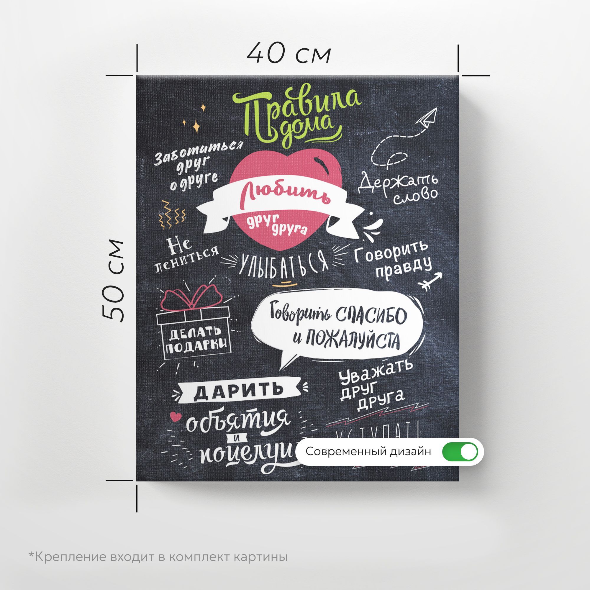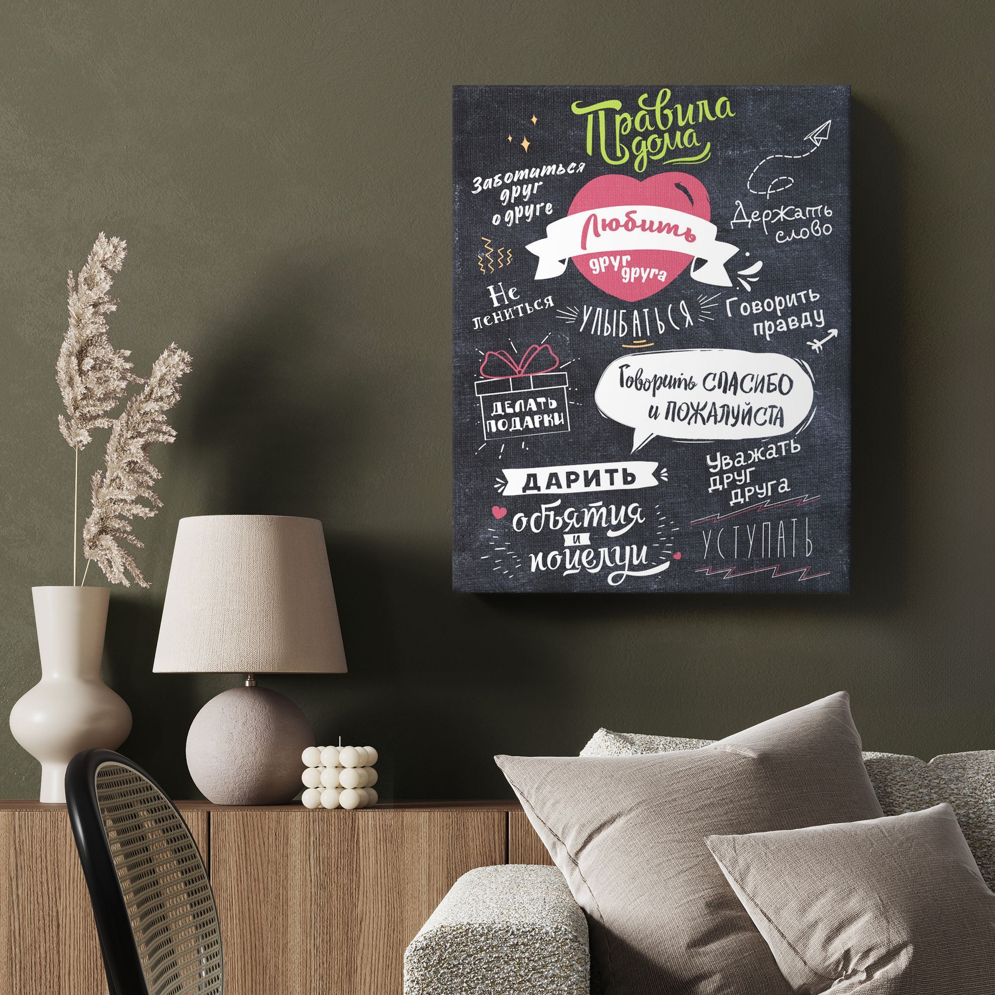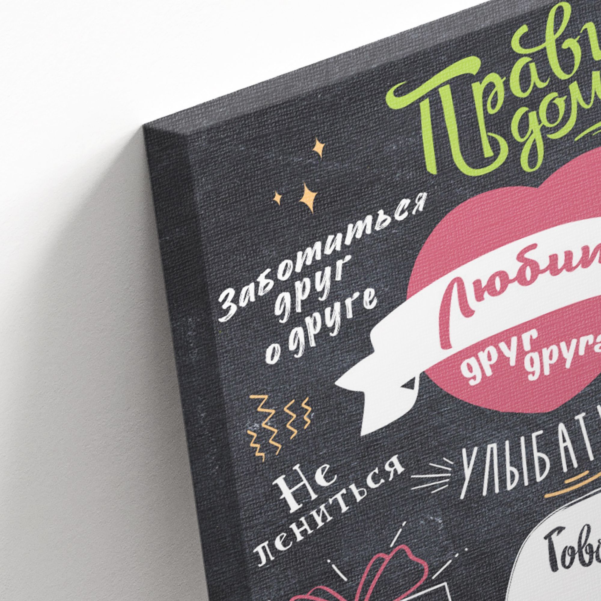 "Мечтаете внести изюминку в оформление семейного гнездышка? Картина на холсте «Правила дома II» является прекрасным вариантом, ведь она органично впишется в дизайн гостевой зоны, спальной комнаты, прихожей или кухни. Выполнена в универсальных цветах, поэтому не станет слишком выделяться и перетягивать основное внимание на себя. Но при этом Правила дома II на холсте станут необычной деталью любой зоны. Для ее установки вам не потребуется много сил и времени. Фиксируется она с помощью зубчатой вешалки, которая идет в комплекте. Проста в уходе. Выполнена картина на холсте «Правила дома» с помощью современной печати, при использовании неаллергенных чернил на водной основе. Каждый семейный постулат на холсте - символ уважения и любви. Проявите к близкому человеку самые искренние чувства и вручите ему картину на холсте «Правила дома II»!