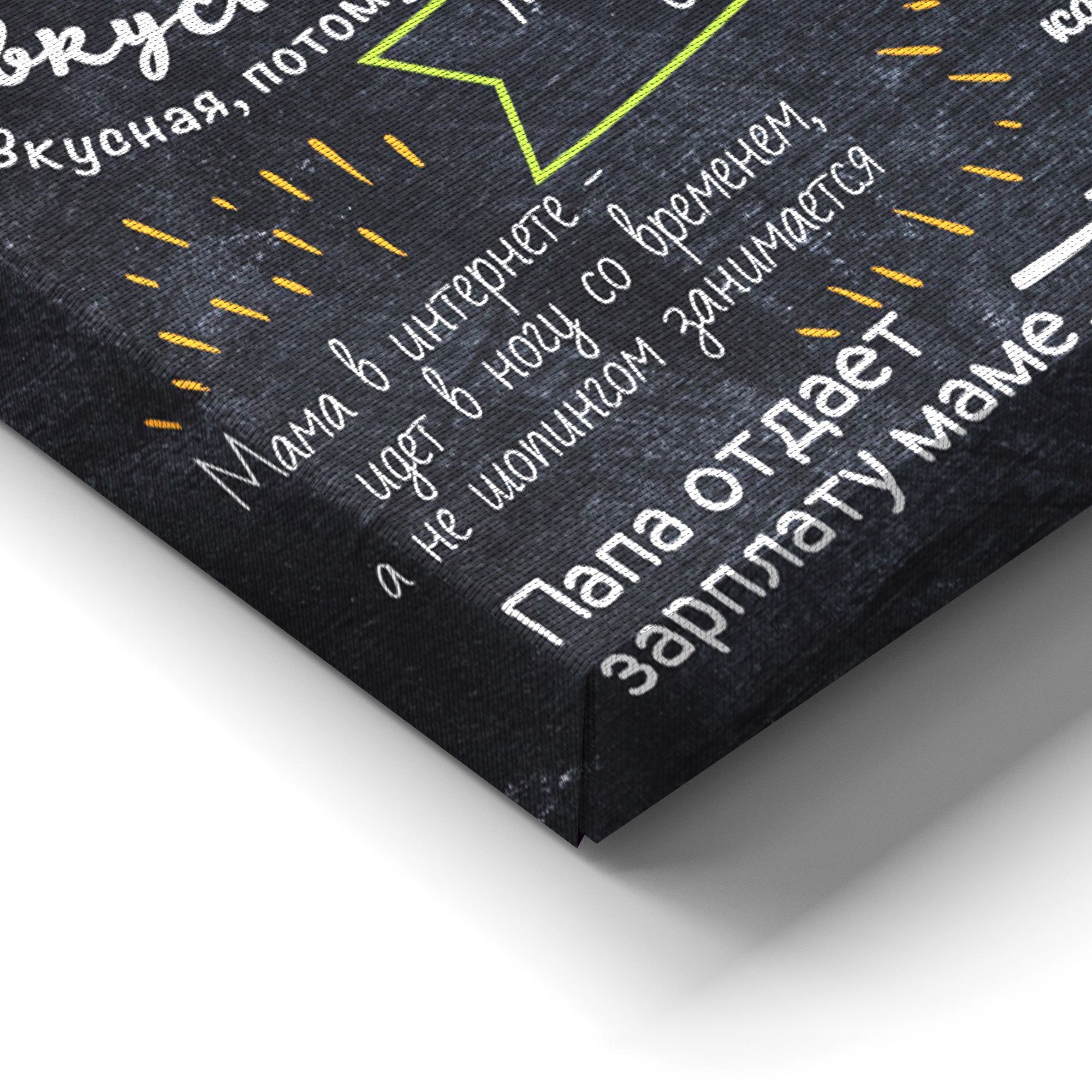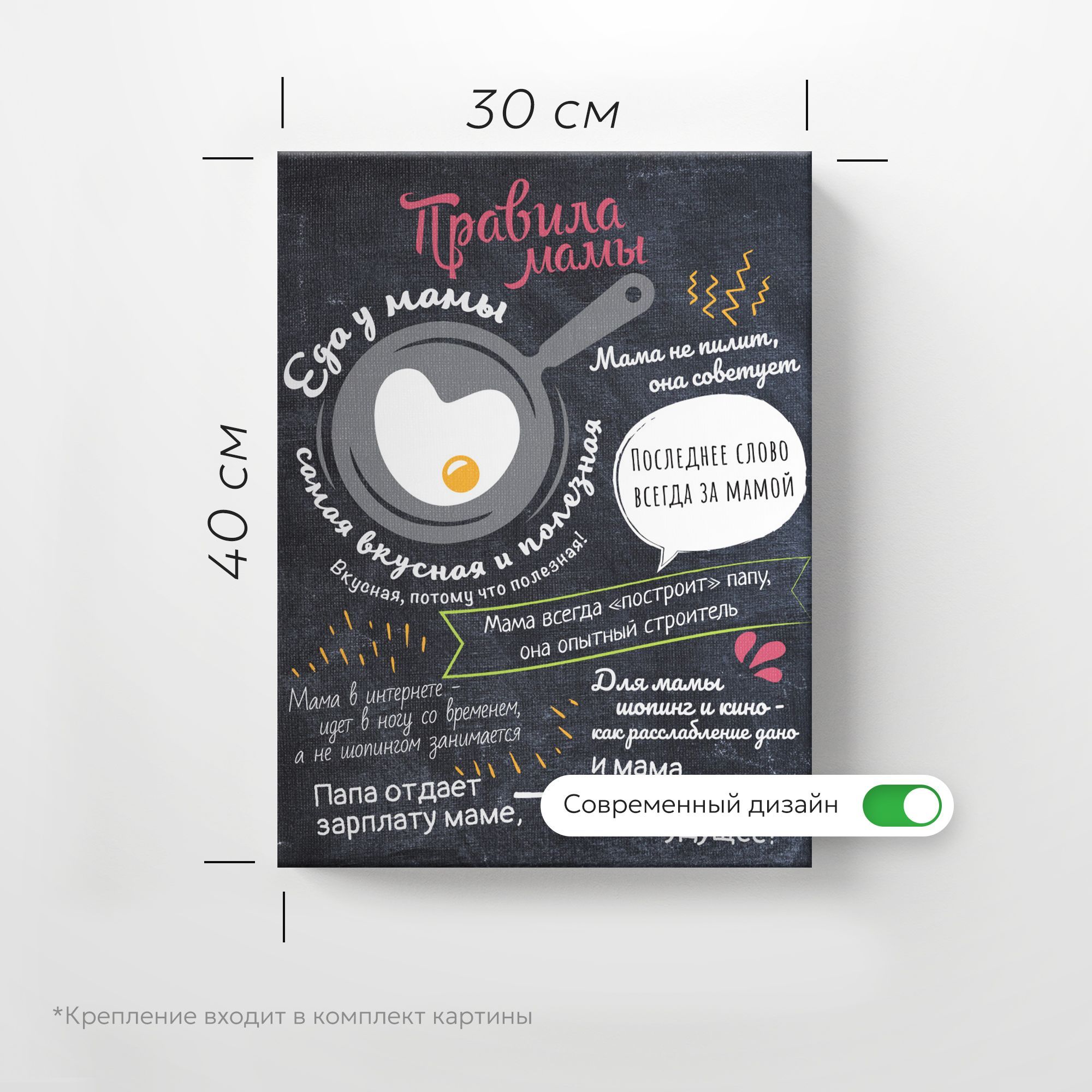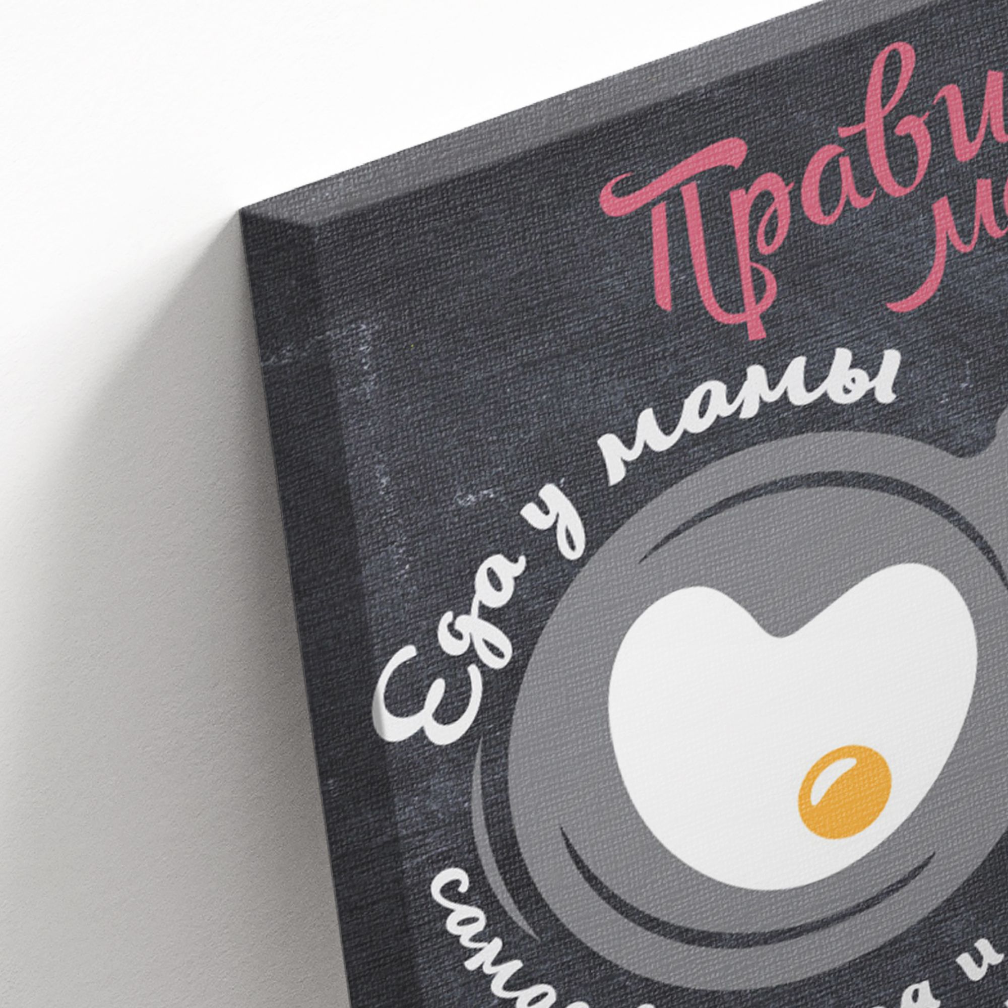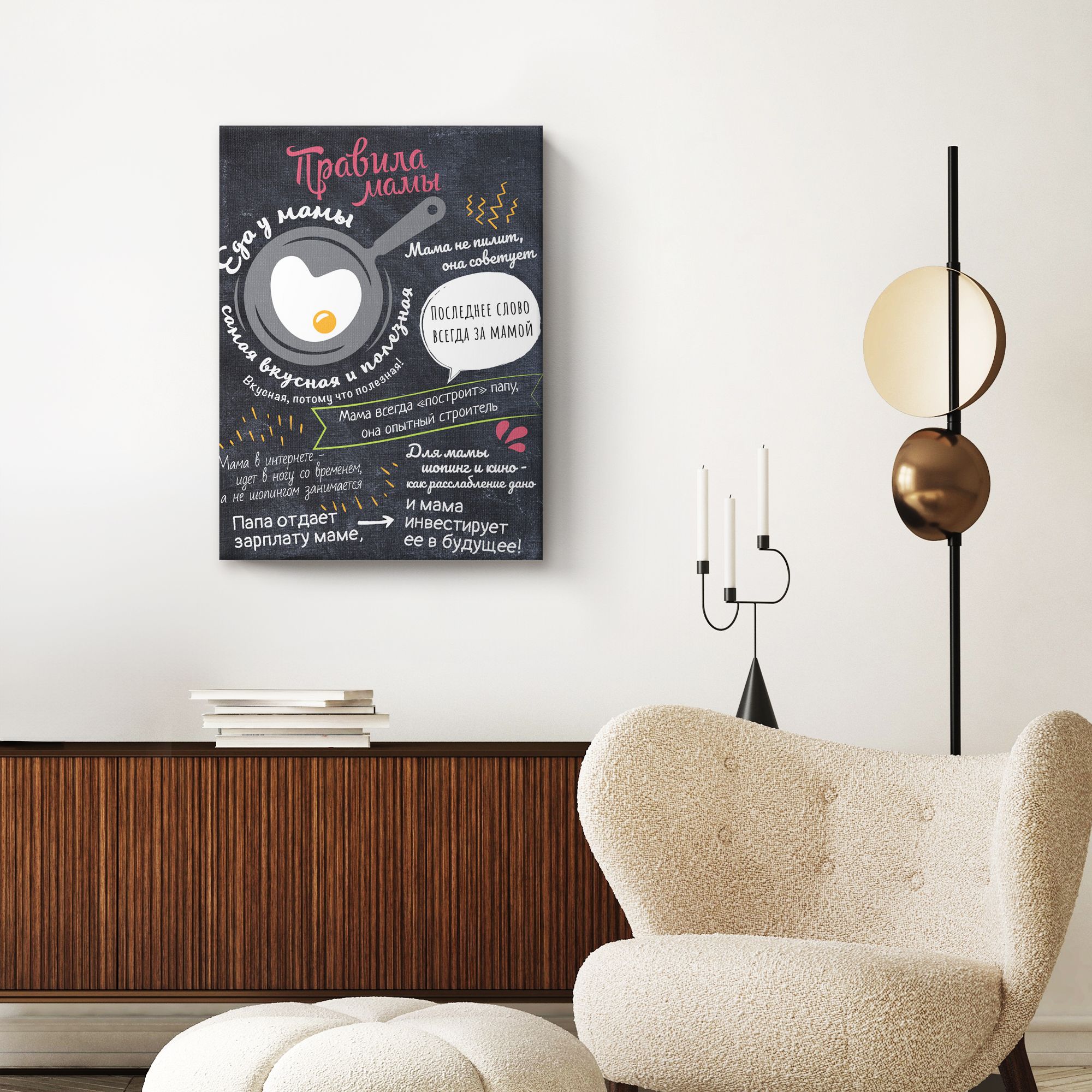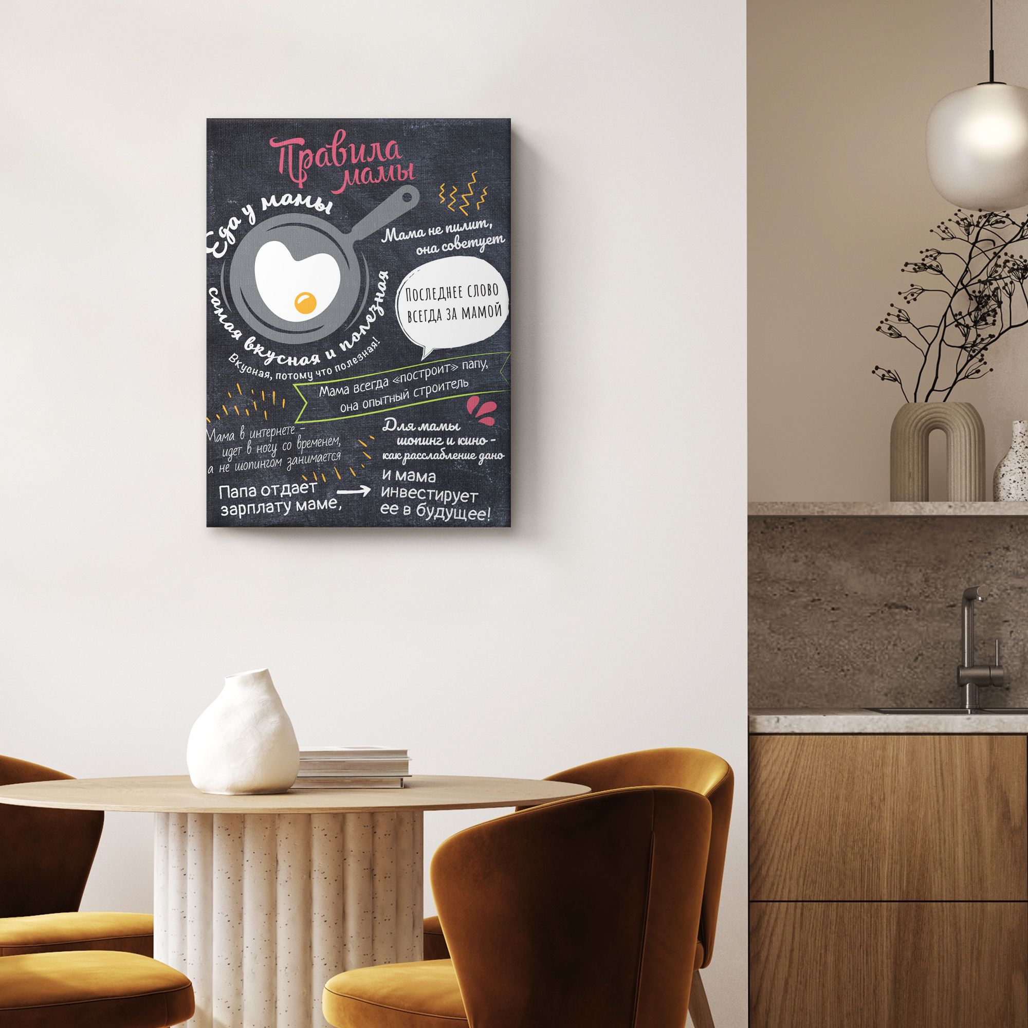 Картина на холсте «Правила мамы» - сочетание креатива, юмора и, конечно же, правдивых законов. Разве кто-нибудь захочет перечить маме? Так можно и без обеда остаться, причем вкусного. Ведь еда у мамы - самая вкусная и полезная (так гласит одно из правил). Не обязательно ходить по струнке, важно - уважать и любить родительницу. Ведь ей цены нет! Подчеркните свои самые искренние чувства, порадуйте маму диковинкой в оформлении одной из комнат квартиры, загородного дома или даже ее рабочего места. Оригинальная картина с правилами мамы выполнена с помощью современных технологи и инноваций в сфере печати. Она долгий период времени прослужит своему владельцу, так как насыщенность оттенков не теряется с годами. В установке правила мамы на холсте не требует сверх физических усилий, лишь немного времени и смекалки. Вы можете купить картину на холсте «Правила мамы», будьте уверены, что покупкой будут довольны все, а мама - особенно!