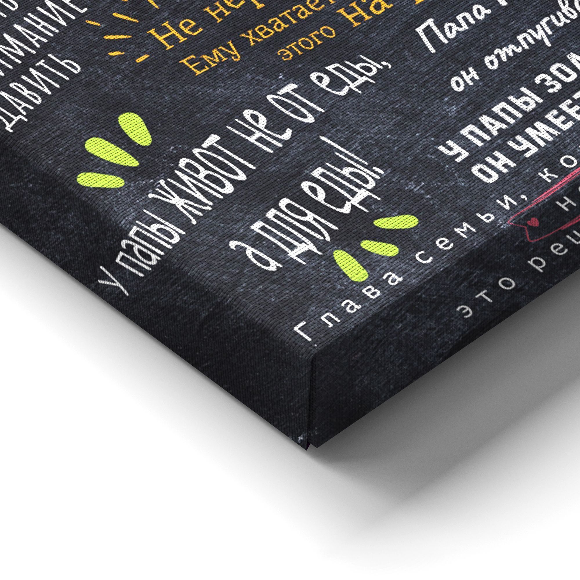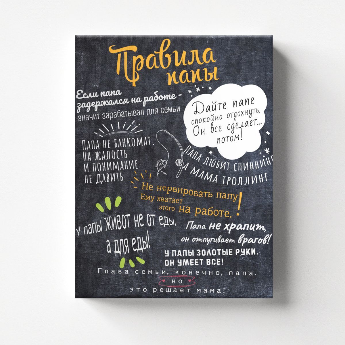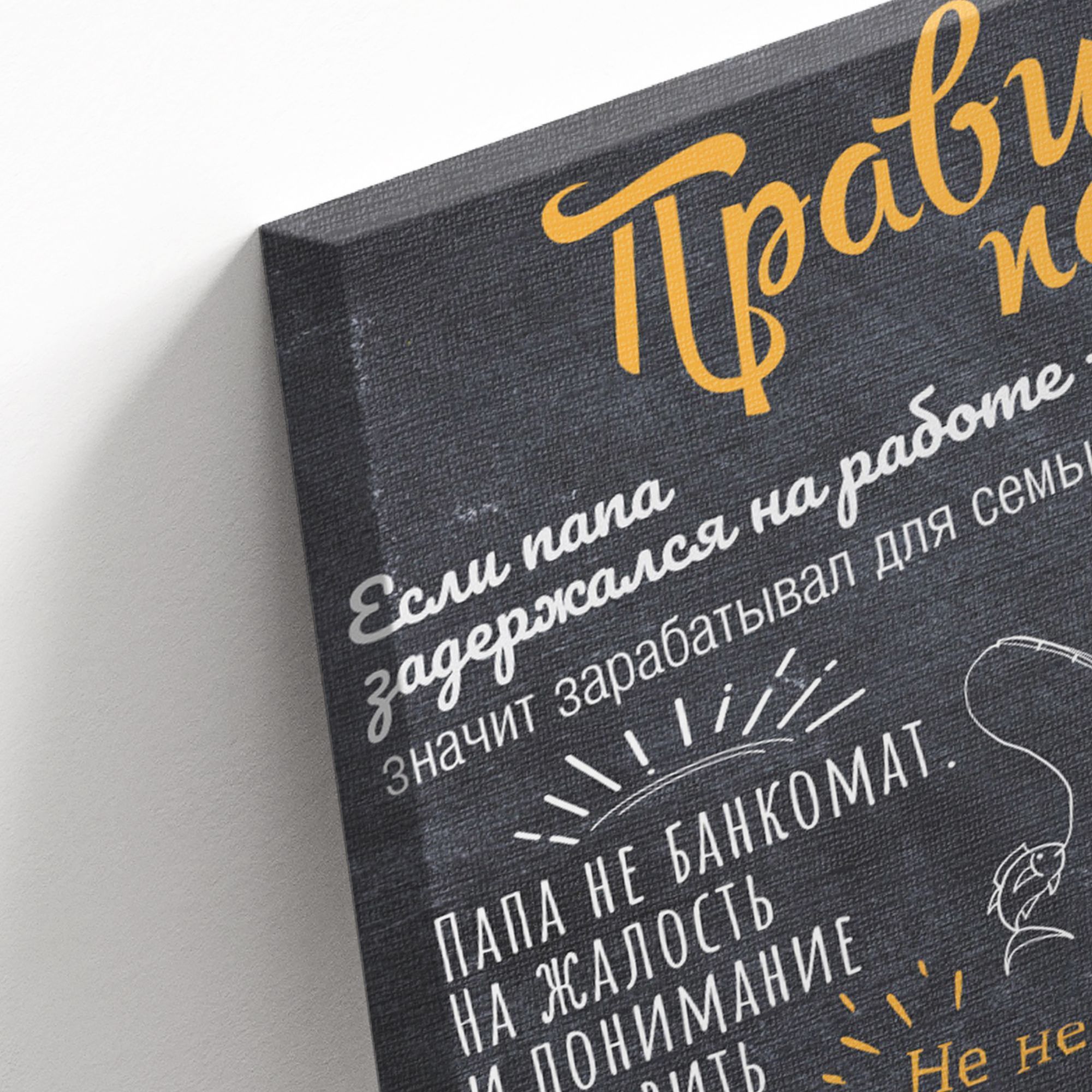 Картина на холсте «Правила папы I» - юморные постулаты, которые оценит родитель и остальные члены семьи с хорошим чувством юмора. Каждый из нас прекрасно знает, что отец - глава семейства, а значит к нему нужно прислушиваться и прощать ему мелкие погрешности. Оригинальные правила папы на холсте украсят гостевую комнату, спальню, кухонное или рабочее пространство. В любом месте представленный элемент декора будет выглядеть органично, так как сочетает в себе универсальные цвета и оттенки. И если вдруг кто-нибудь из семьи захочет надавить на жалость и выпросить кругленькую сумму денег у папы, он в праве в ответ указать пальцем на холст. Или может кто-то начнет папу нервировать, отец вправе кивнуть в сторону холста с заветами, дабы от него отстали. Поэтому будьте бдительны! Удивите любимого родителя и вручите ему картину на холсте «Правила папы I»!