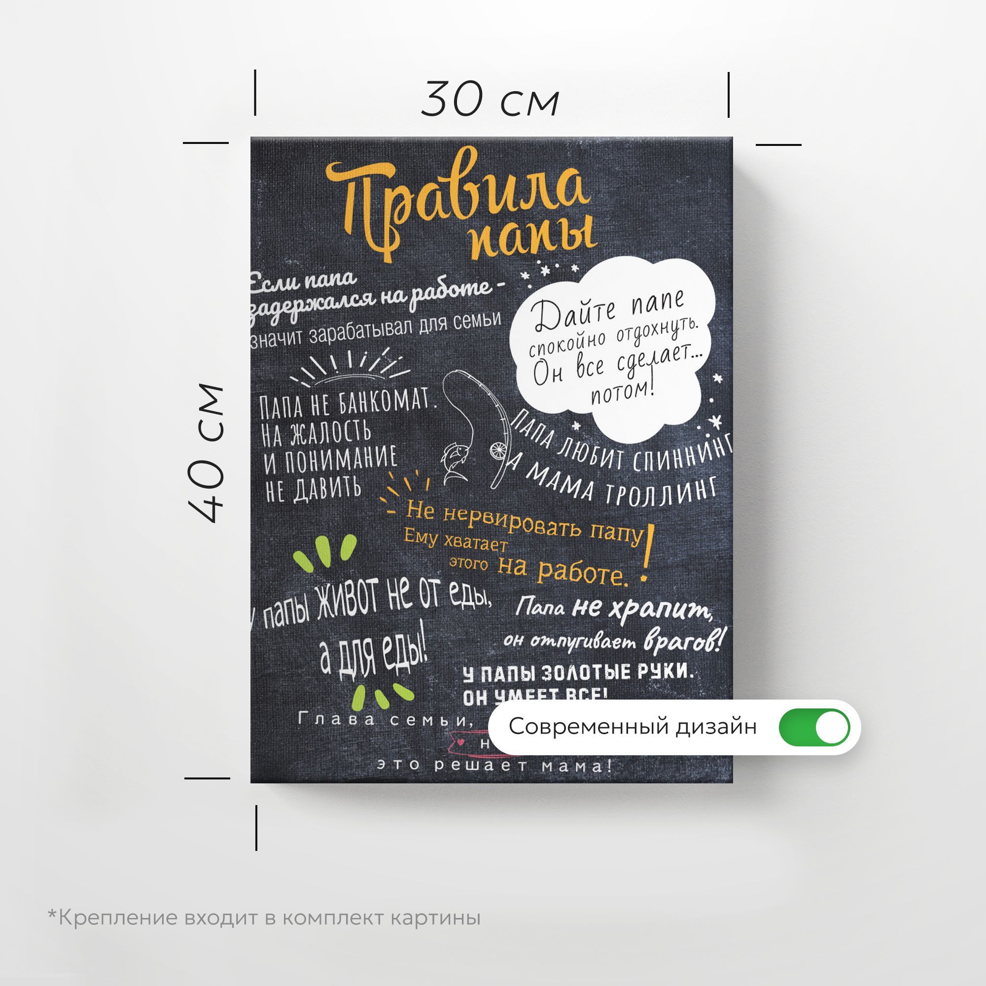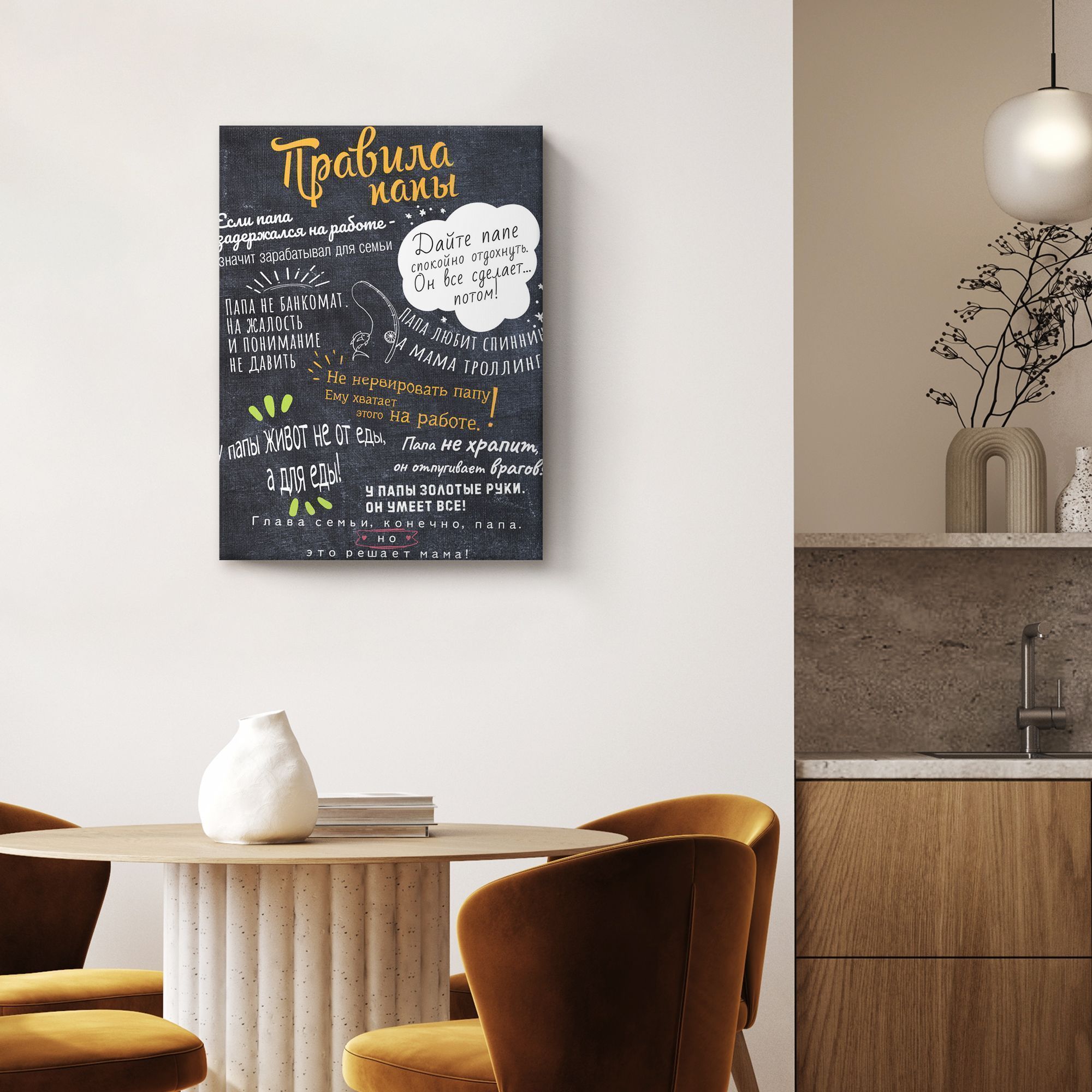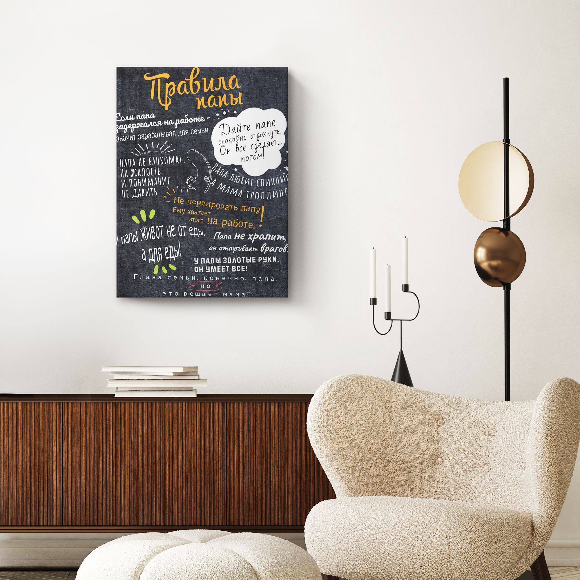 Картина на холсте «Правила папы I» - юморные постулаты, которые оценит родитель и остальные члены семьи с хорошим чувством юмора. Каждый из нас прекрасно знает, что отец - глава семейства, а значит к нему нужно прислушиваться и прощать ему мелкие погрешности. Оригинальные правила папы на холсте украсят гостевую комнату, спальню, кухонное или рабочее пространство. В любом месте представленный элемент декора будет выглядеть органично, так как сочетает в себе универсальные цвета и оттенки. И если вдруг кто-нибудь из семьи захочет надавить на жалость и выпросить кругленькую сумму денег у папы, он в праве в ответ указать пальцем на холст. Или может кто-то начнет папу нервировать, отец вправе кивнуть в сторону холста с заветами, дабы от него отстали. Поэтому будьте бдительны! Удивите любимого родителя и вручите ему картину на холсте «Правила папы I»!