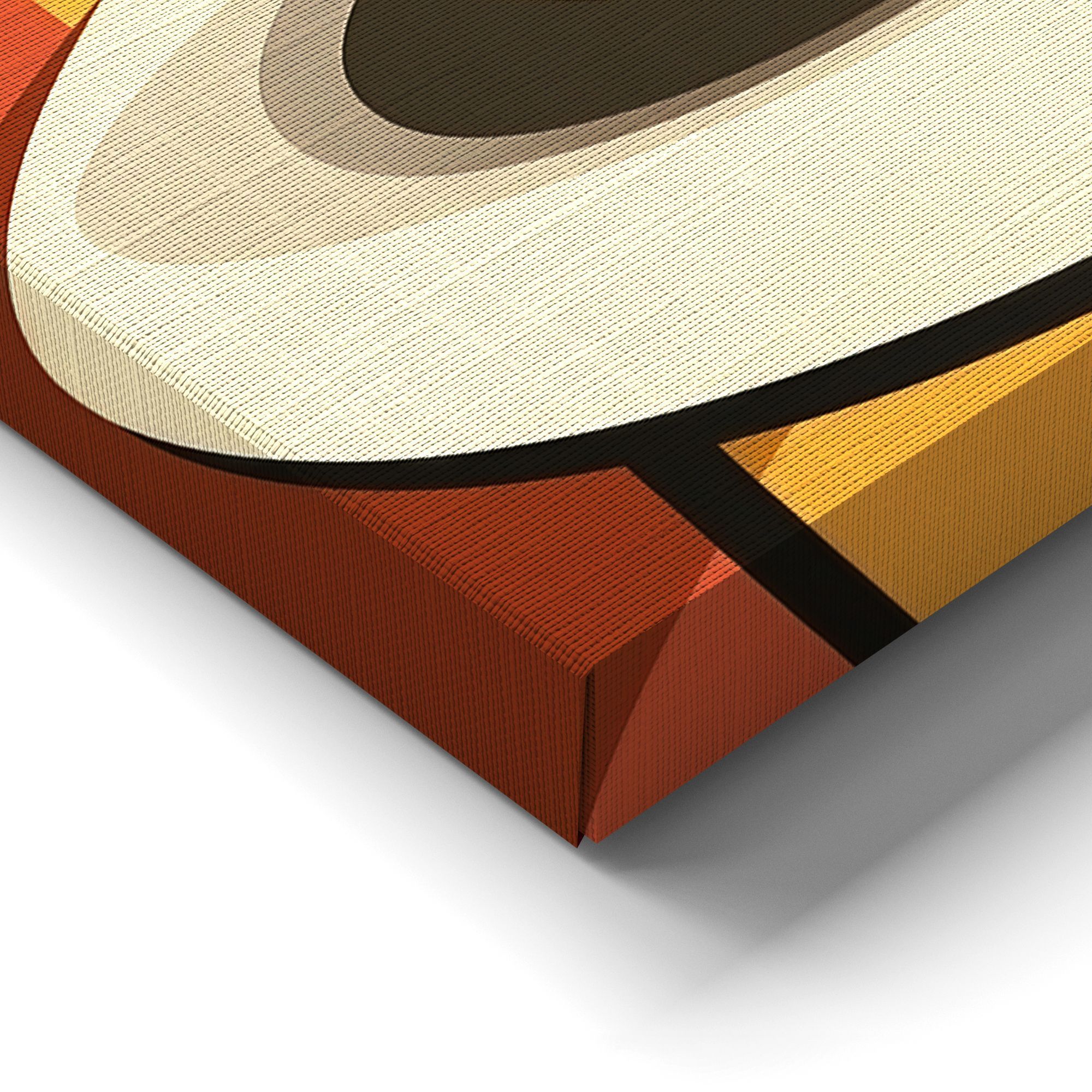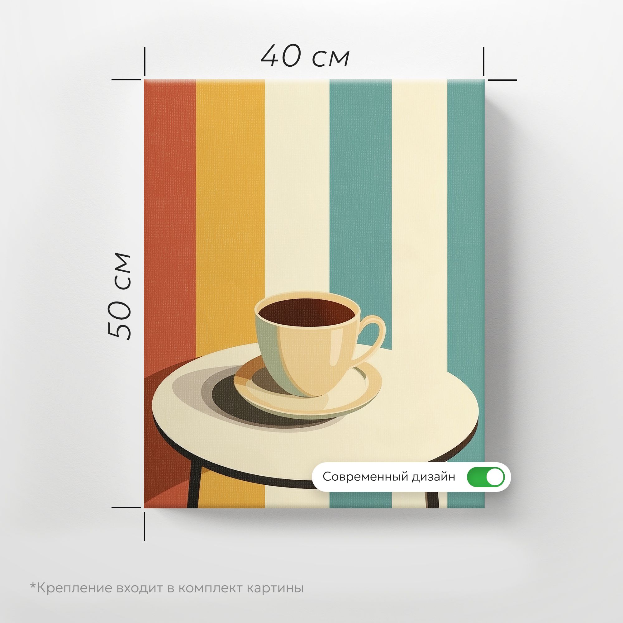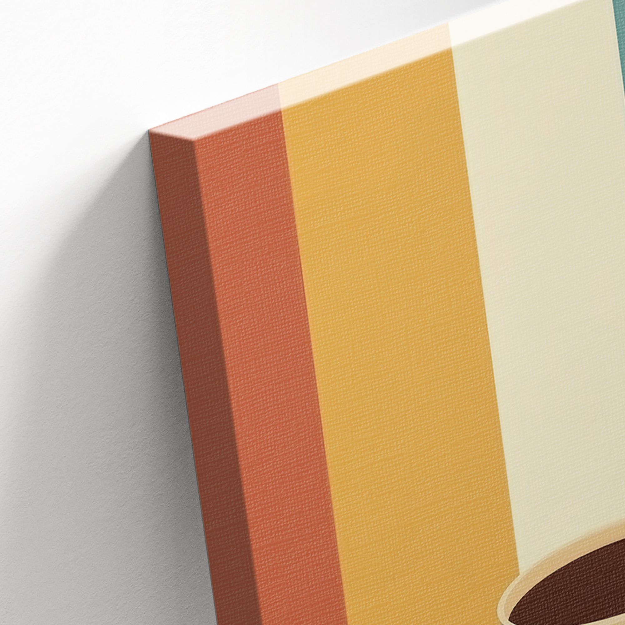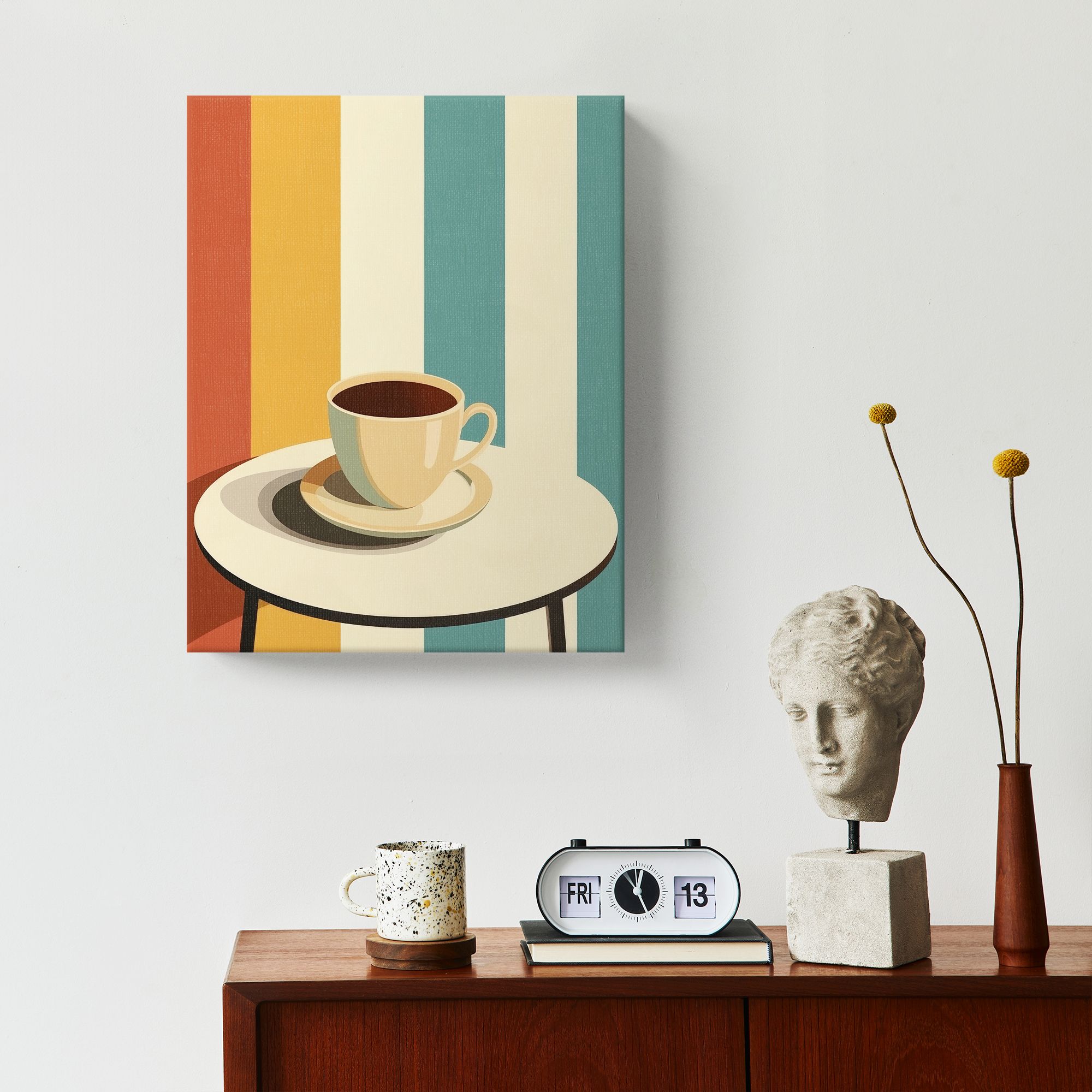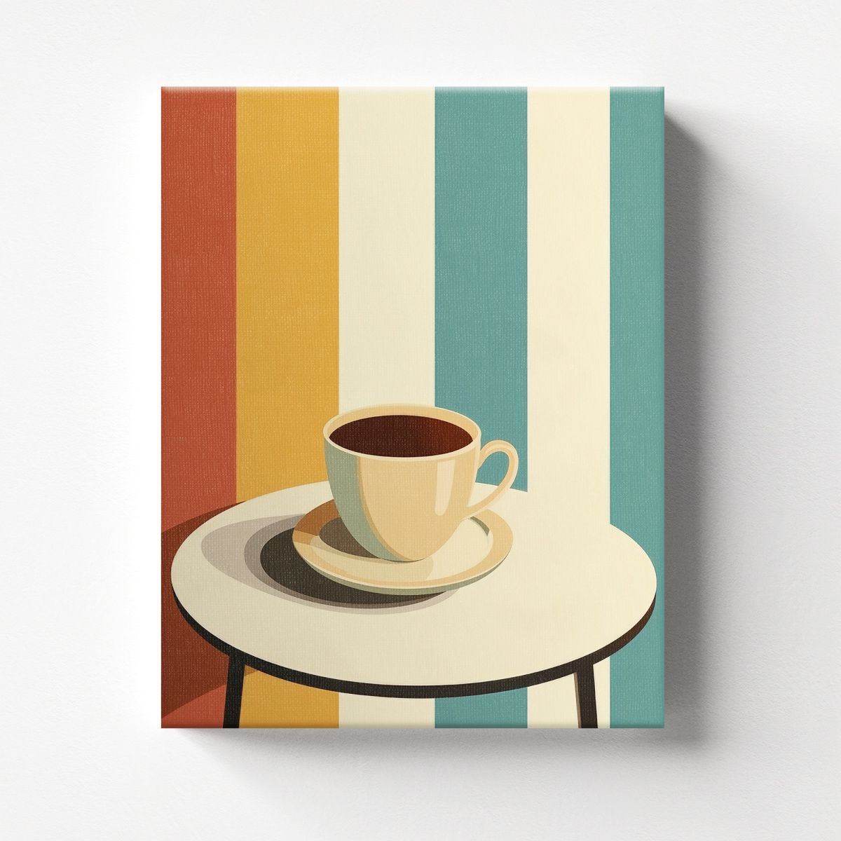 Эта картина на холсте передает спокойствие и уют момента с чашкой кофе на небольшом столике. Яркие, но приглушённые полосы на стене в теплых оттенках охры, терракоты и бирюзы создают атмосферу ретро и гармонии. Простота композиции и мягкие тени подчеркивают спокойствие начала дня, приглашая зрителя насладиться моментом тишины и вдохновения.