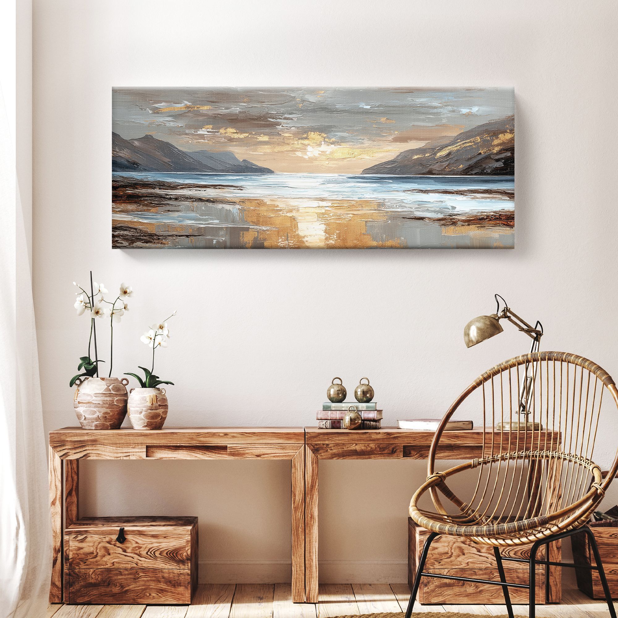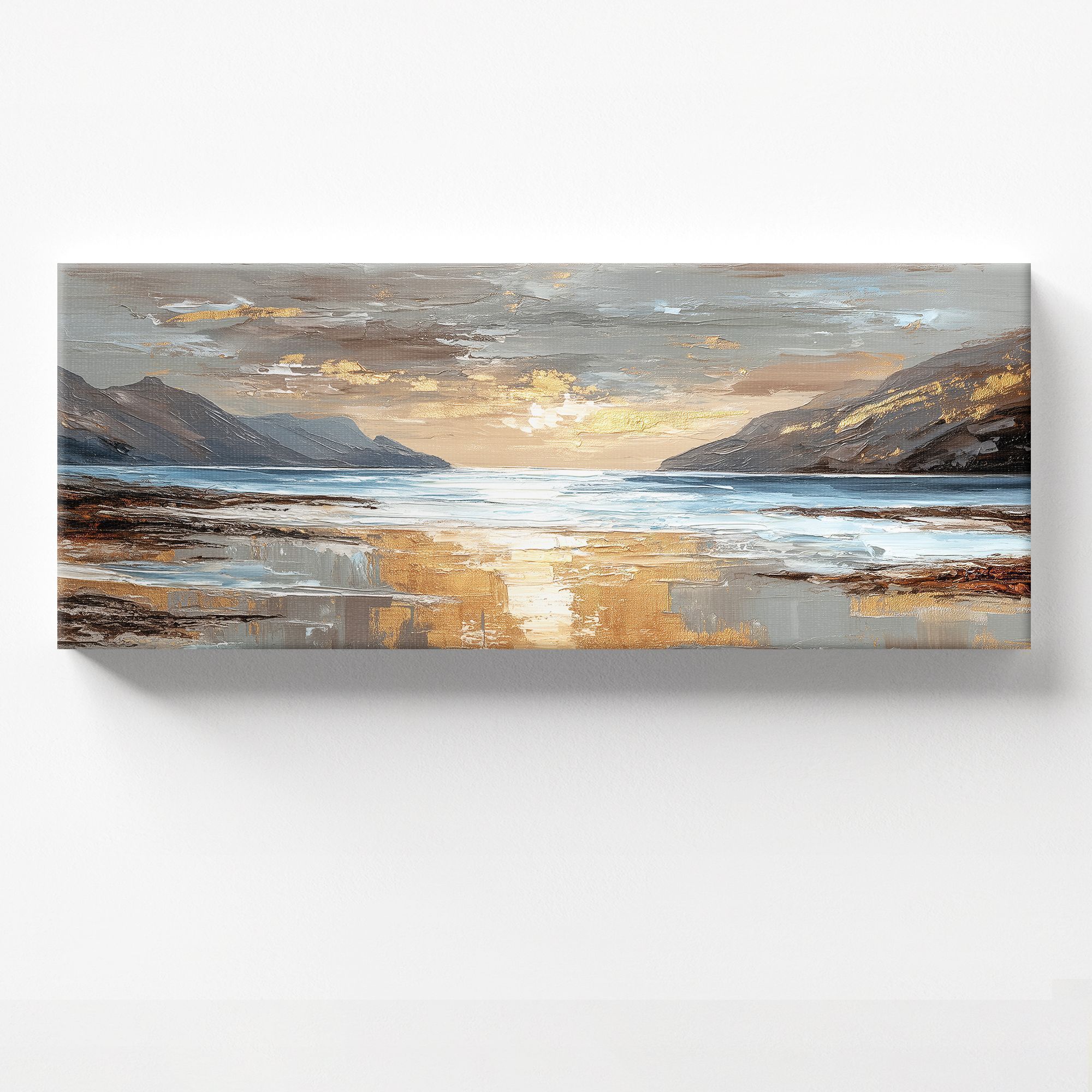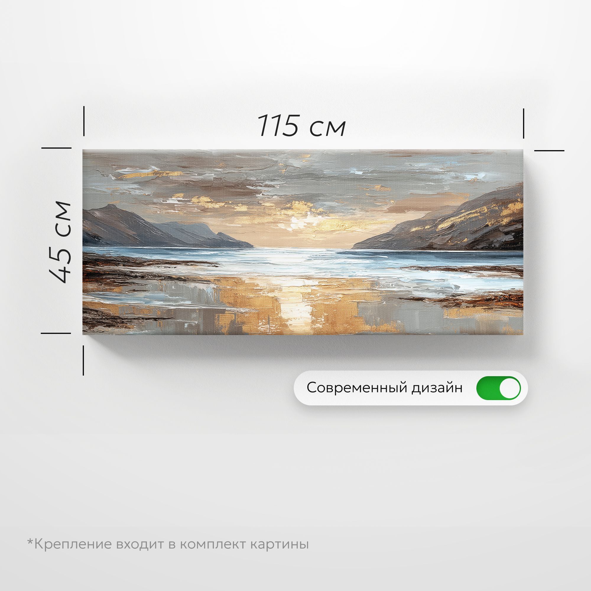 На картине изображён живописный морской пейзаж в закатных или рассветных лучах. Центральную часть композиции занимает водная гладь, отражающая золотистое сияние неба. По обе стороны простираются величественные скалистые горы, обрамляющие залив. Их контуры выполнены в приглушённых серо-коричневых тонах, которые контрастируют с мерцающими золотыми бликами на облаках и воде. Техника исполнения напоминает импрессионизм: мазки широкие, фактурные, создают ощущение движения воды и лёгкости облаков. Цветовая гамма сбалансирована: преобладают холодные оттенки синего и серого, которые гармонично сочетаются с тёплыми золотисто-бежевыми акцентами. Отражение света на мокром песке и волнах придаёт работе особую глубину и реалистичность. Картина добавит пространству глубины и природной гармонии, станет выразительным акцентом на светлой стене.