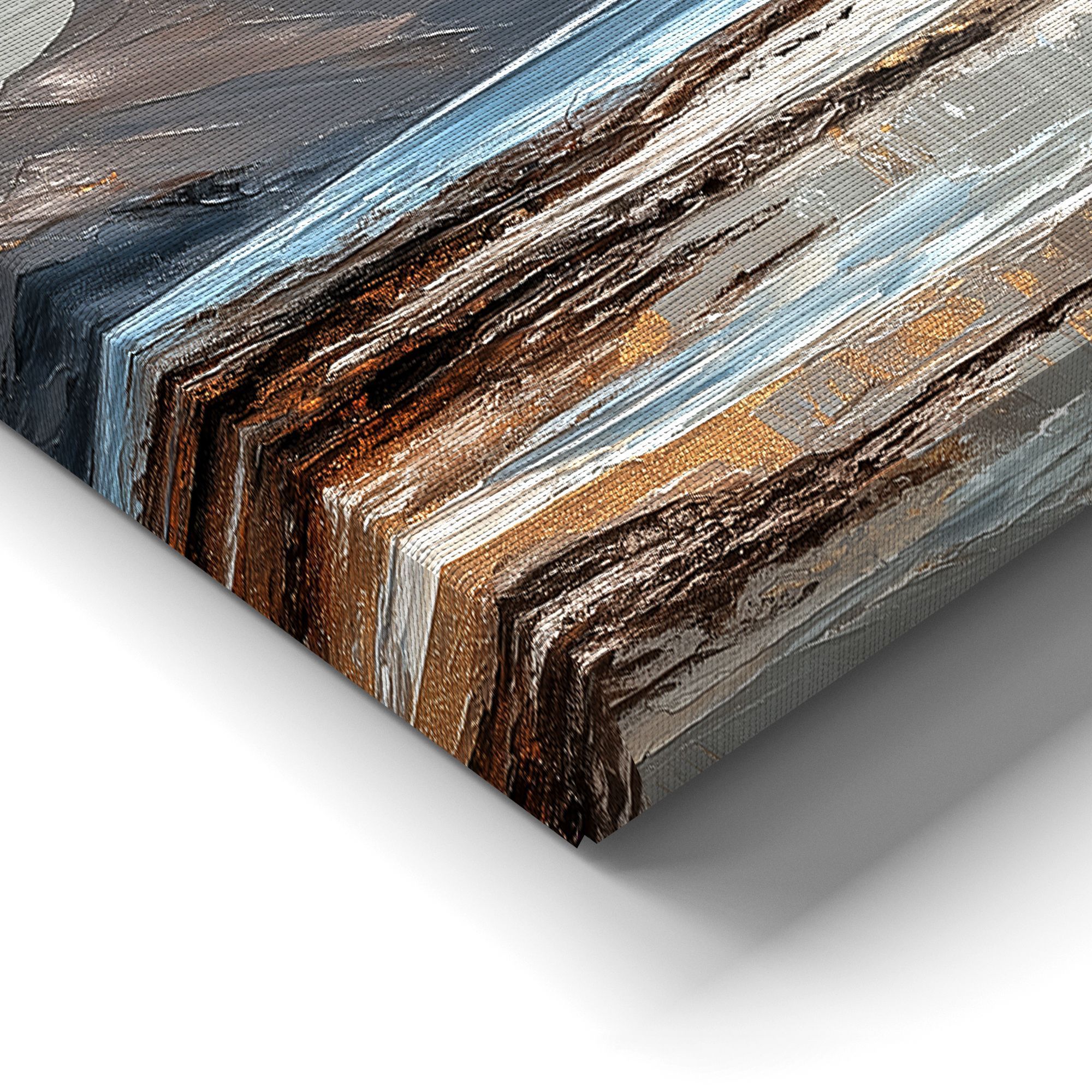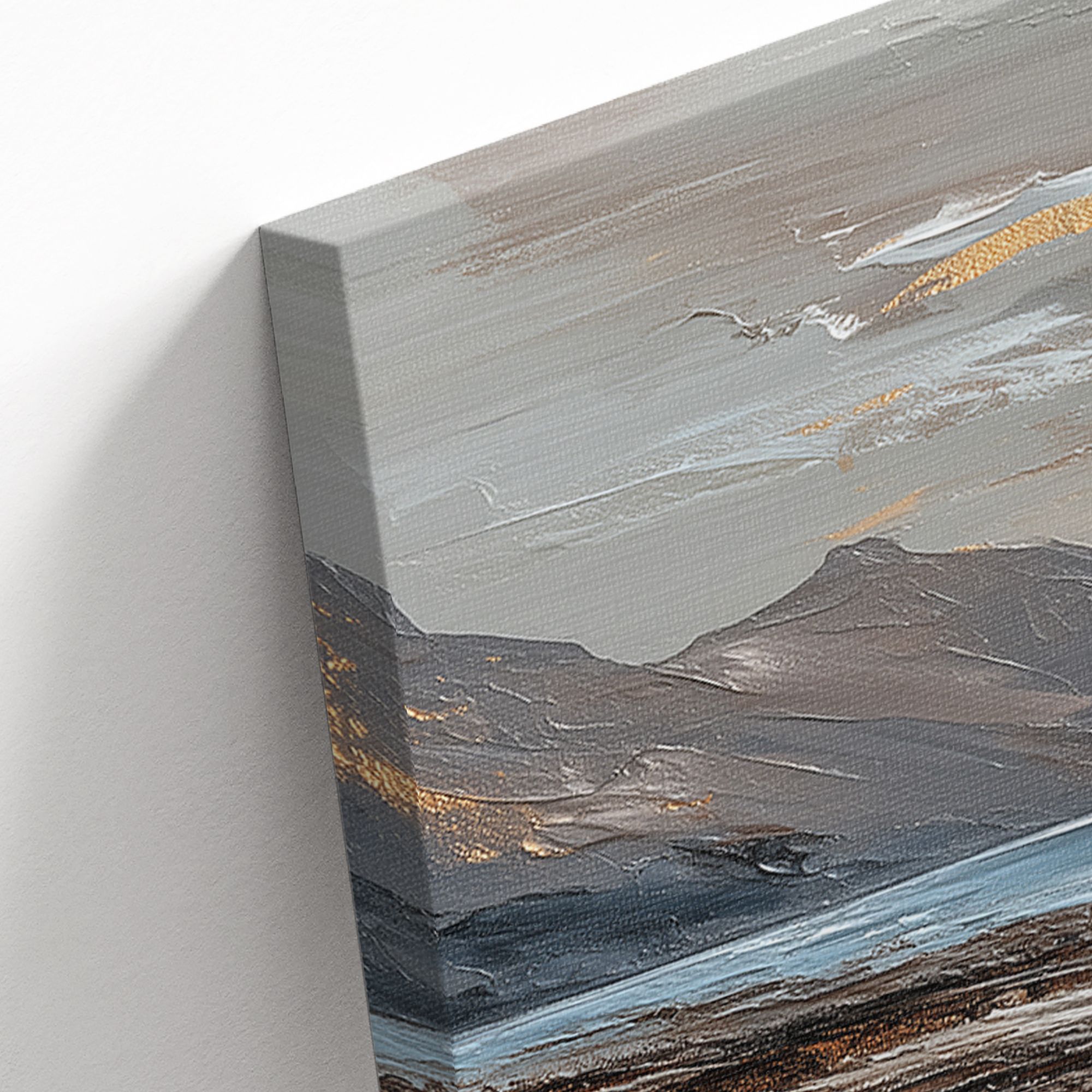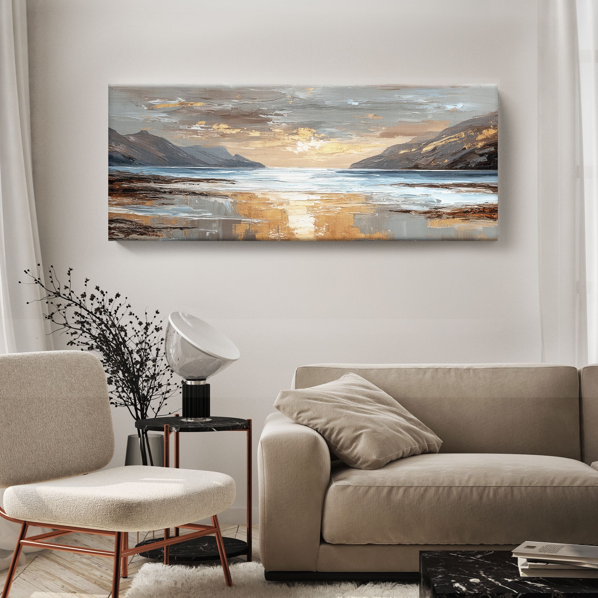 На картине изображён живописный морской пейзаж в закатных или рассветных лучах. Центральную часть композиции занимает водная гладь, отражающая золотистое сияние неба. По обе стороны простираются величественные скалистые горы, обрамляющие залив. Их контуры выполнены в приглушённых серо-коричневых тонах, которые контрастируют с мерцающими золотыми бликами на облаках и воде. Техника исполнения напоминает импрессионизм: мазки широкие, фактурные, создают ощущение движения воды и лёгкости облаков. Цветовая гамма сбалансирована: преобладают холодные оттенки синего и серого, которые гармонично сочетаются с тёплыми золотисто-бежевыми акцентами. Отражение света на мокром песке и волнах придаёт работе особую глубину и реалистичность. Картина добавит пространству глубины и природной гармонии, станет выразительным акцентом на светлой стене.