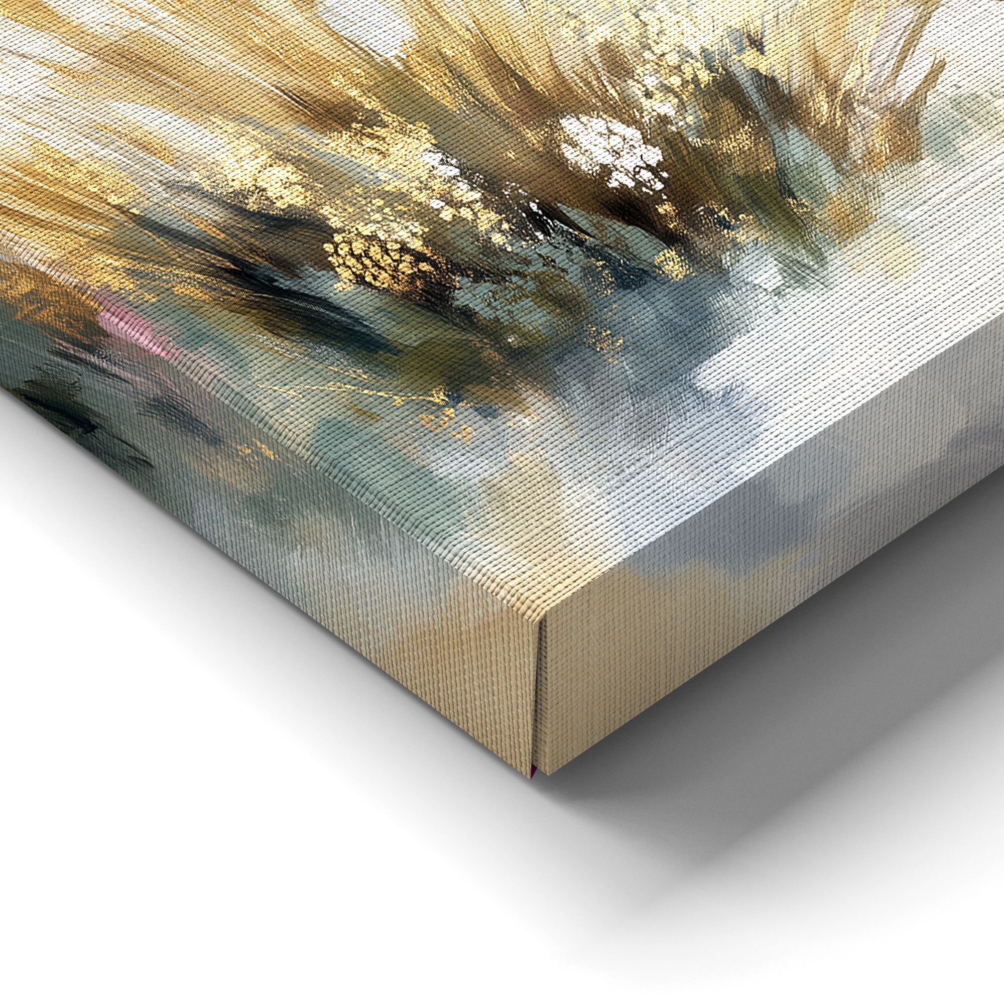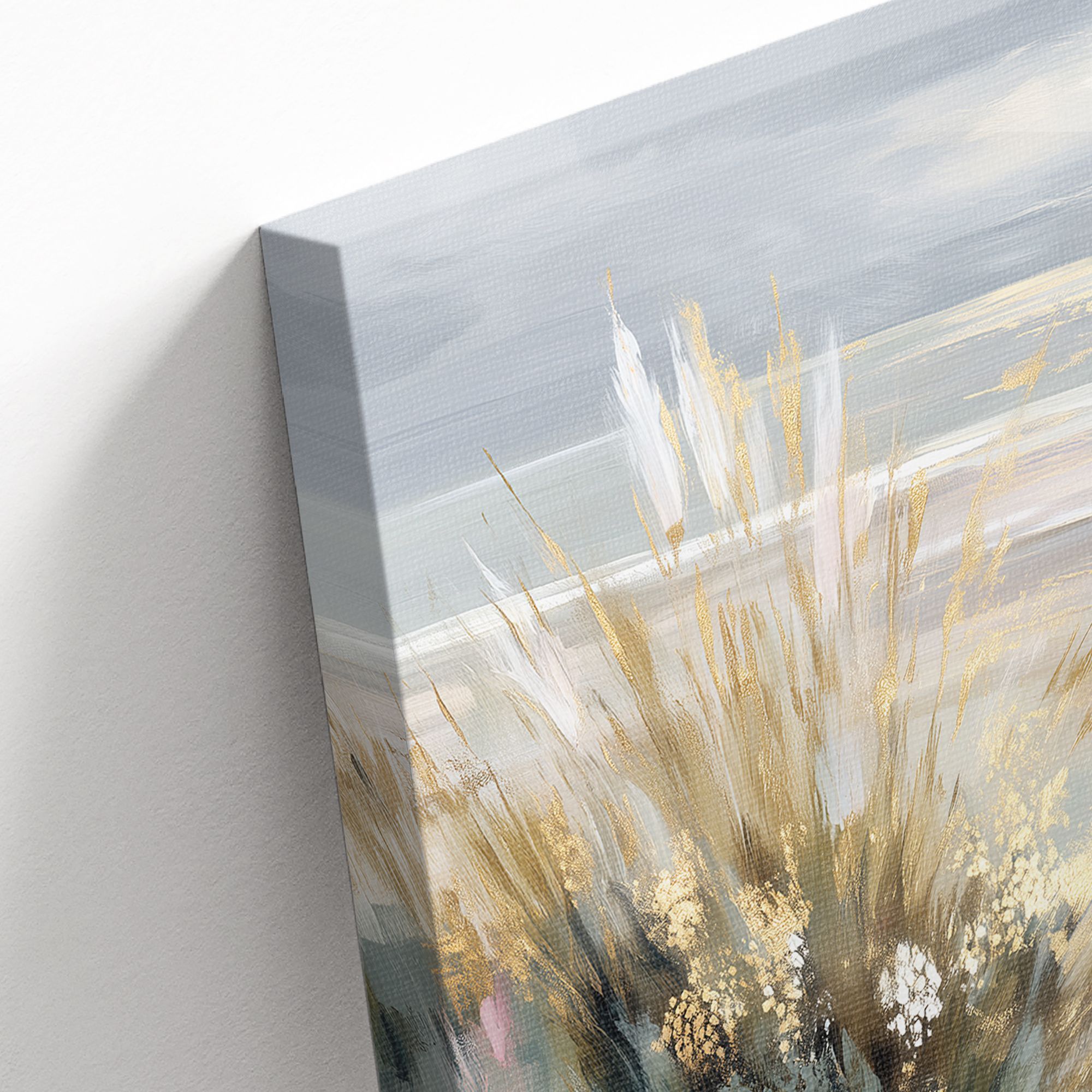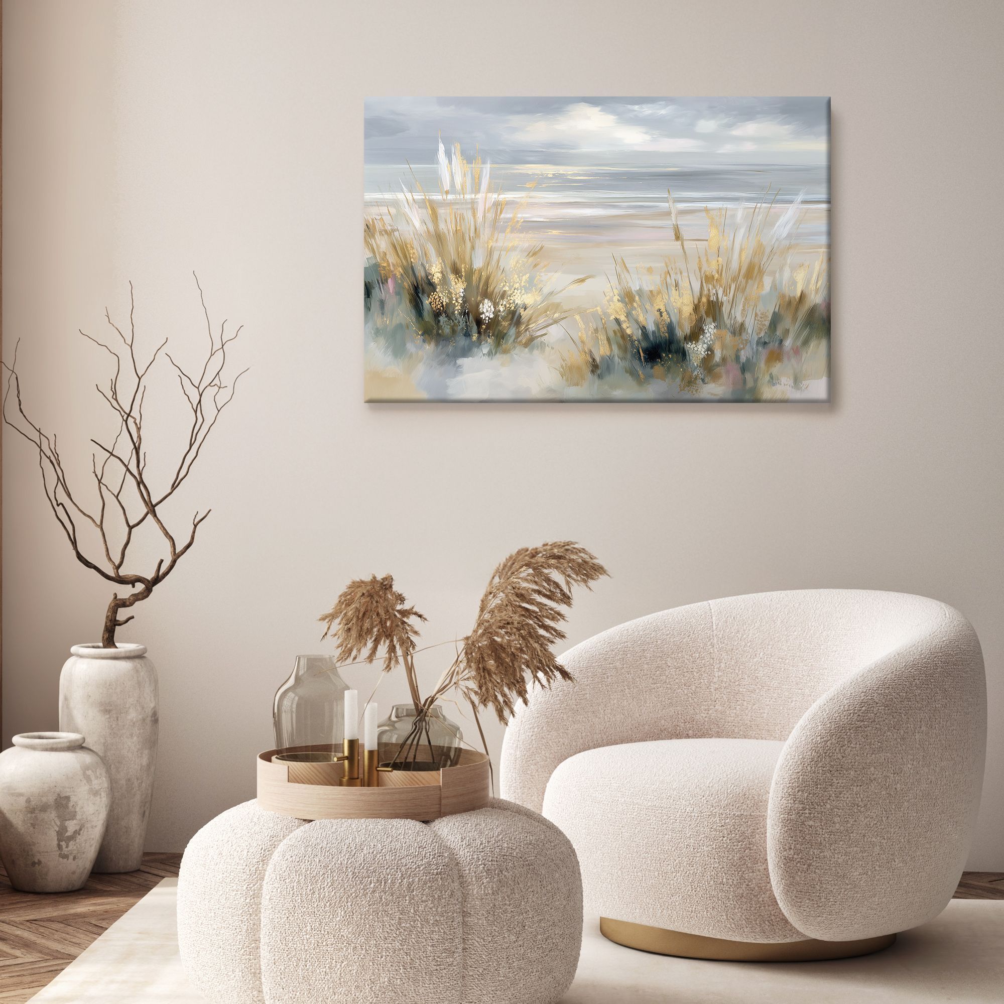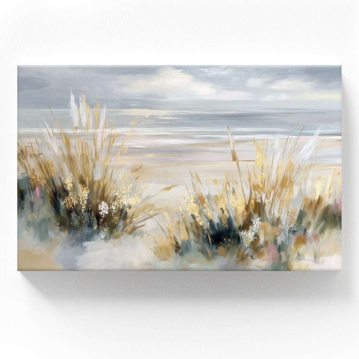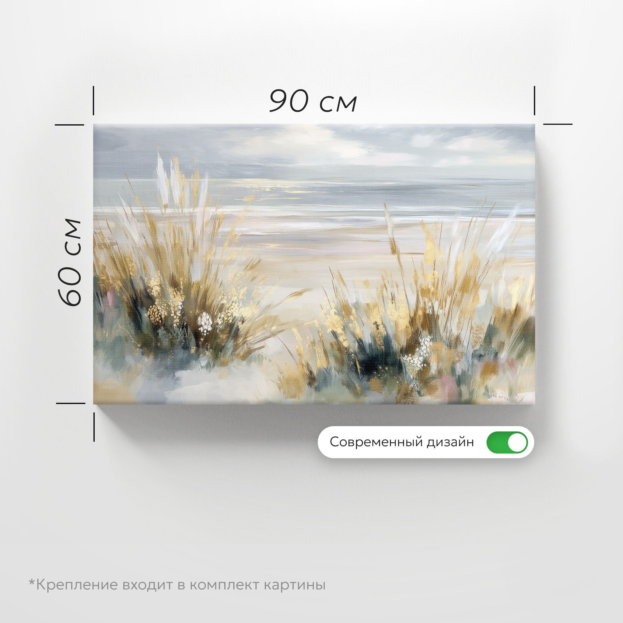 На холсте изображён абстрактный морской пейзаж, выполненный в мягких, приглушённых тонах. На переднем плане — золотисто-бежевые травы и кустарники, словно освещённые закатным солнцем. Их мазки динамичны, создают ощущение лёгкого ветерка. За растительностью простирается песчаный пляж, плавно переходящий в спокойное море с мягкими волнами. Вода написана полупрозрачными слоями, с лёгкими бликами золотистого света, отражающими закатное небо. Верхняя часть картины занята небом в серо-голубых и белых оттенках, с размытыми облаками, создающими атмосферу умиротворения и лёгкой задумчивости. Композиция горизонтальна, что усиливает ощущение простора и свободы. Преобладают пастельные оттенки: бежевый, золотой, серый, голубой, белый — они гармонично сочетаются, создавая расслабляющий эффект. Эта картина станет отличным акцентом в интерьере скандинавского стиля — благодаря светлым, спокойным оттенкам и природной тематике дополнит минималистичный интерьер с белыми стенами и деревянной мебелью.