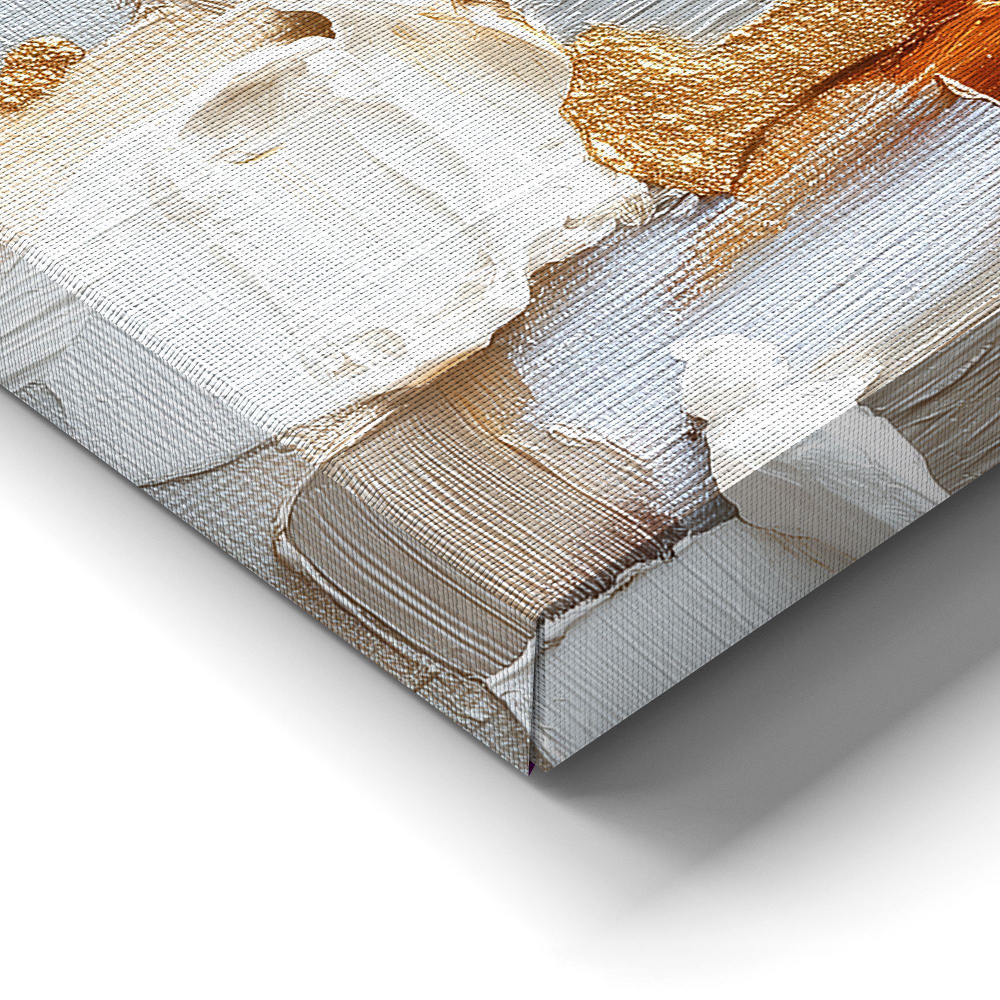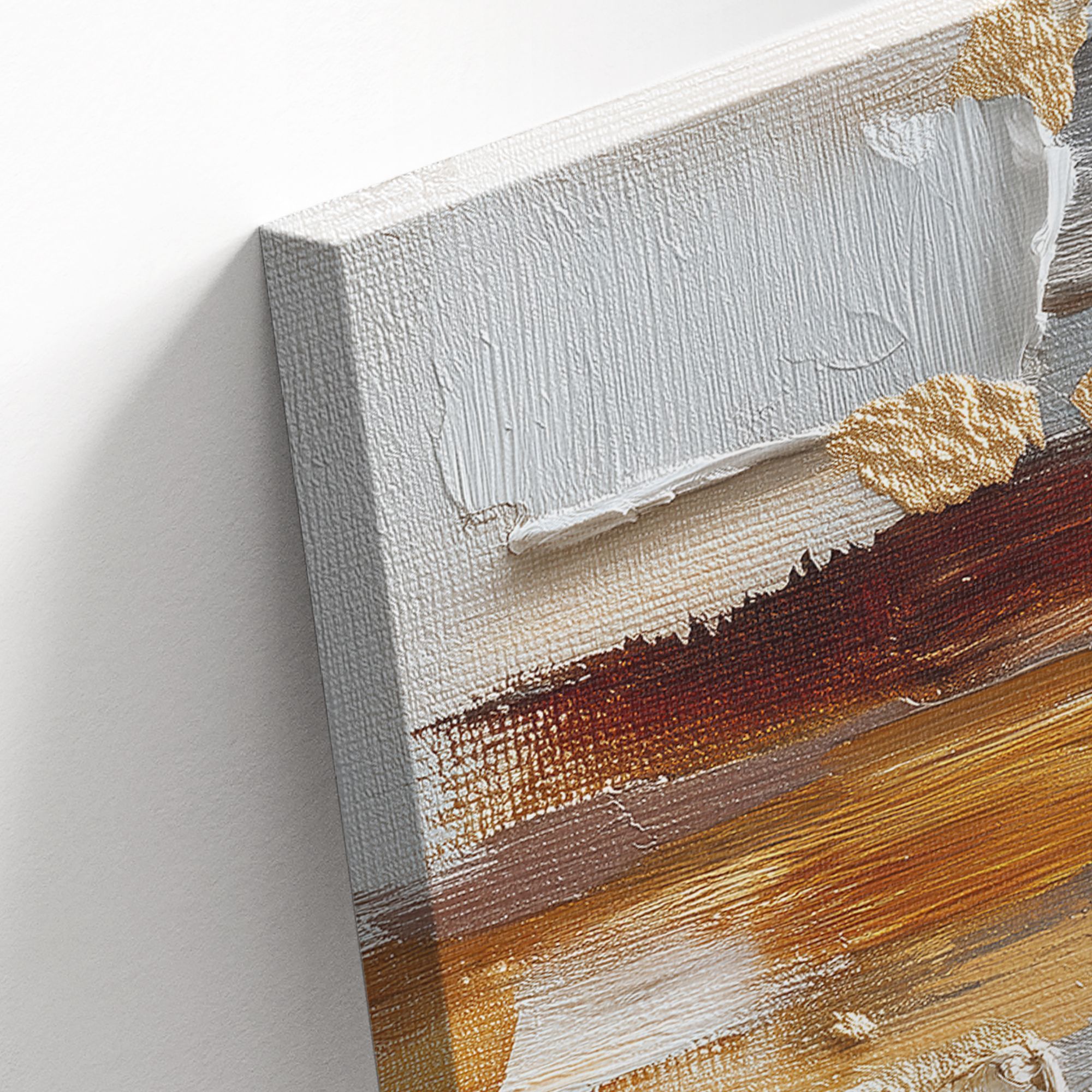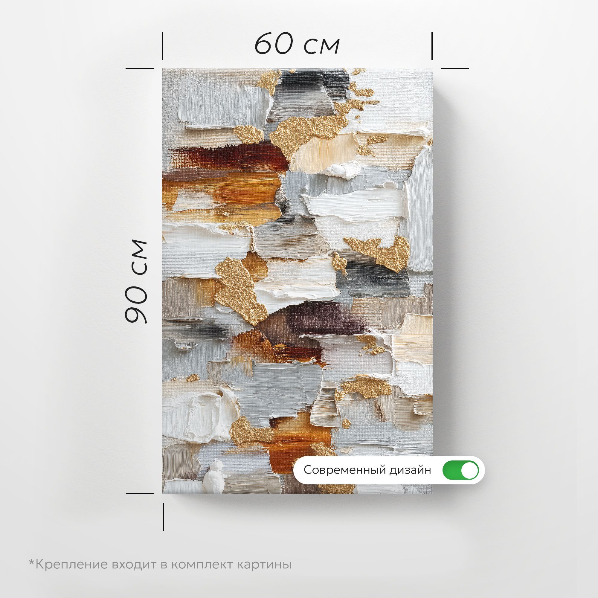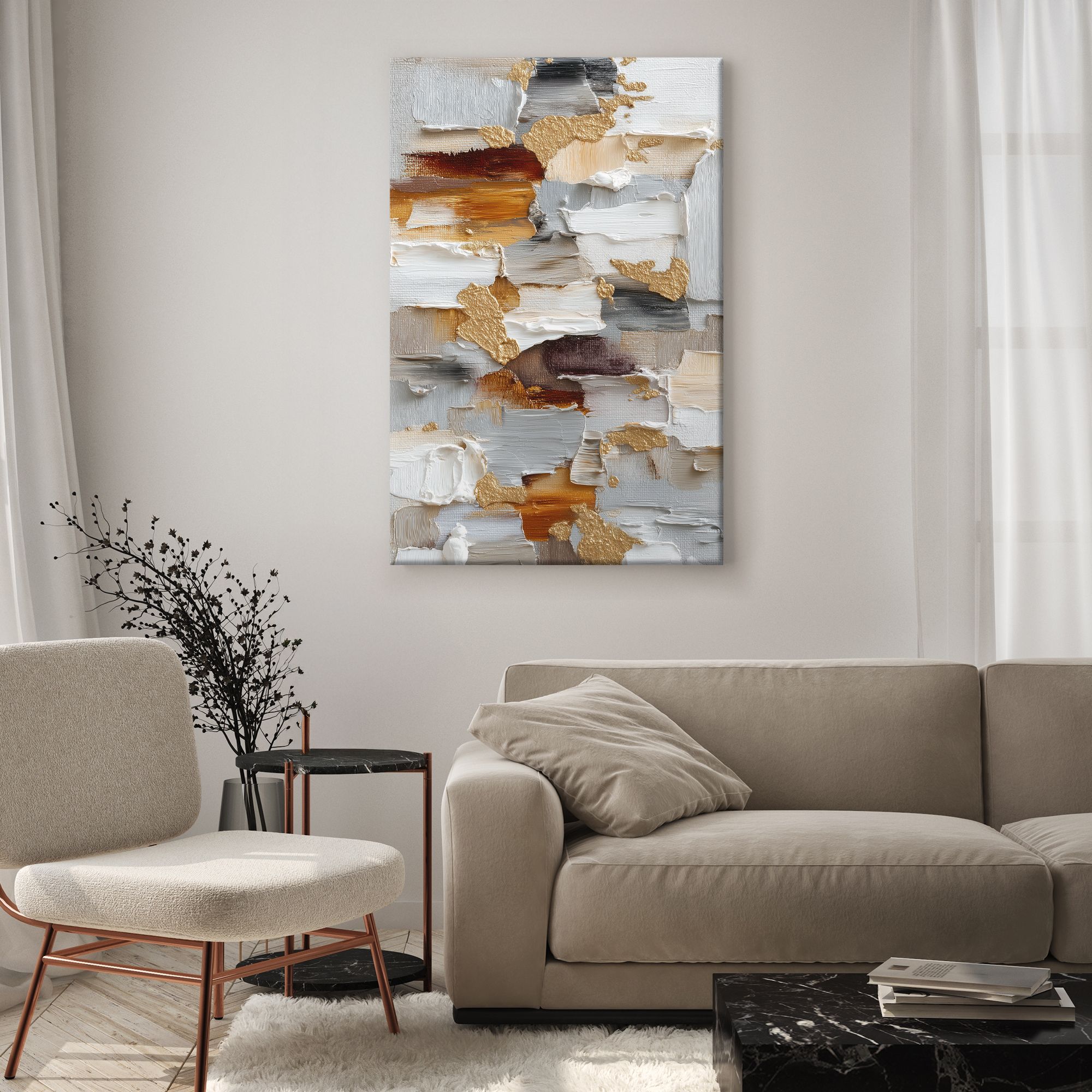 Эта абстрактная картина выделяется своей насыщенной текстурой и комбинацией теплых и нейтральных оттенков — белого, серого, коричневого и золотого. Использование густых мазков масла создаёт живую фактуру и глубину, а золотые вкрапления добавляют ощущение утончённости и света. Композиция неявно передаёт гармонию между природой и современностью, приглашая зрителя погрузиться в многослойность материи и найти собственные ассоциации и эмоции. Эта работа — идеальный пример игры цвета и формы, подчеркивающей красоту абстракции.
