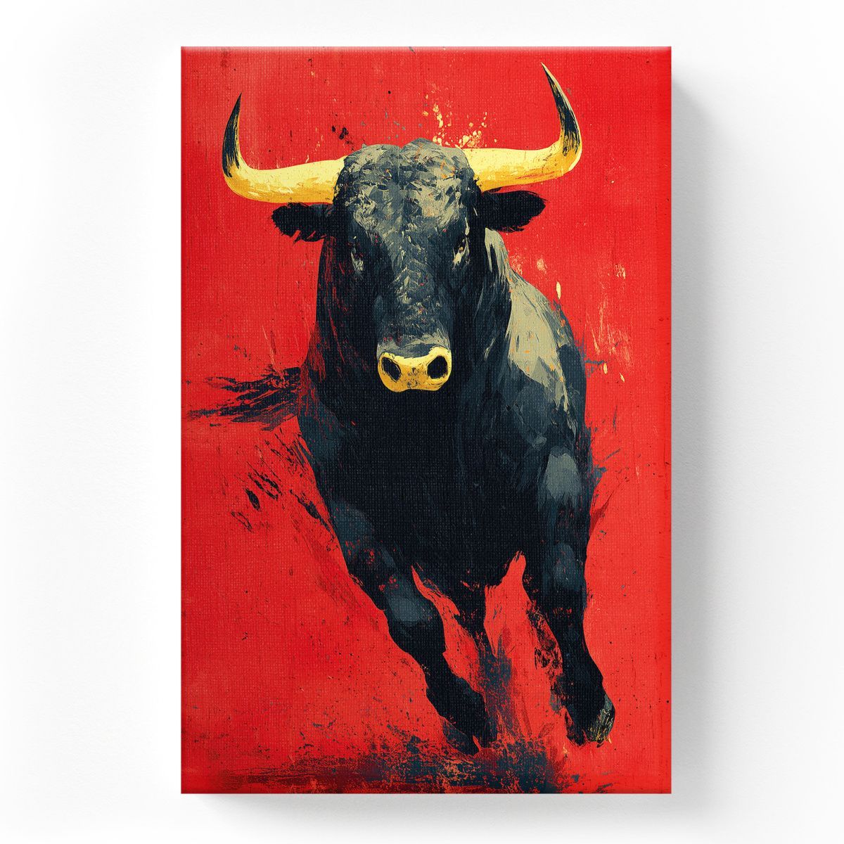 Динамичная картина изображает мчащегося быка на ярко-красном фоне — символе энергии, страсти и агрессии. Контраст между тёмным телом животного и золотистыми рогами подчёркивает его силу и власть. Живописные мазки придают работе экспрессивность и движение, передавая мощь и напор животного в момент рывка. Картина вызывает ассоциации с традициями и культурой Испании, где бык олицетворяет мужество и бесстрашие. Яркий красный фон насыщает композицию драматизмом и эмоциональностью.