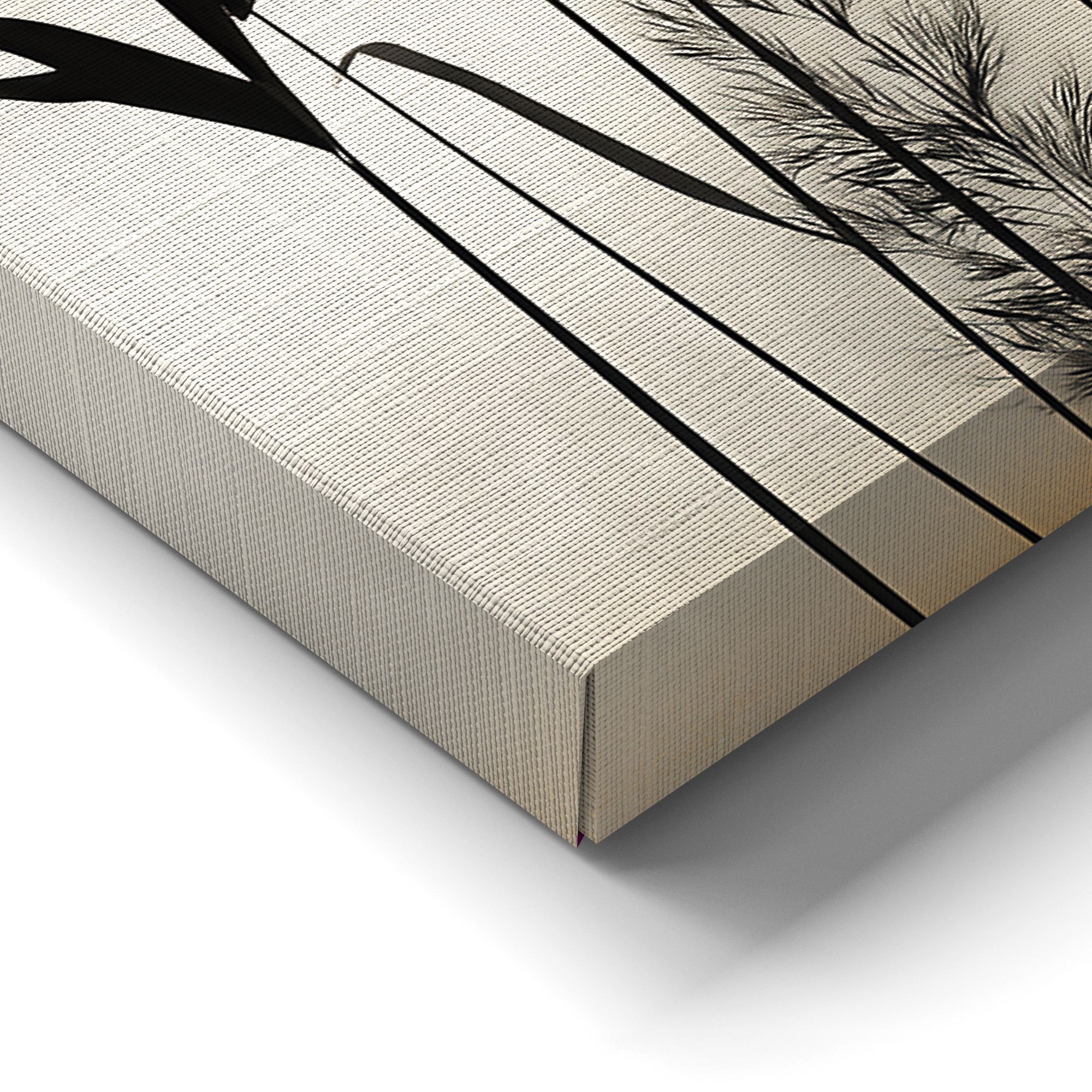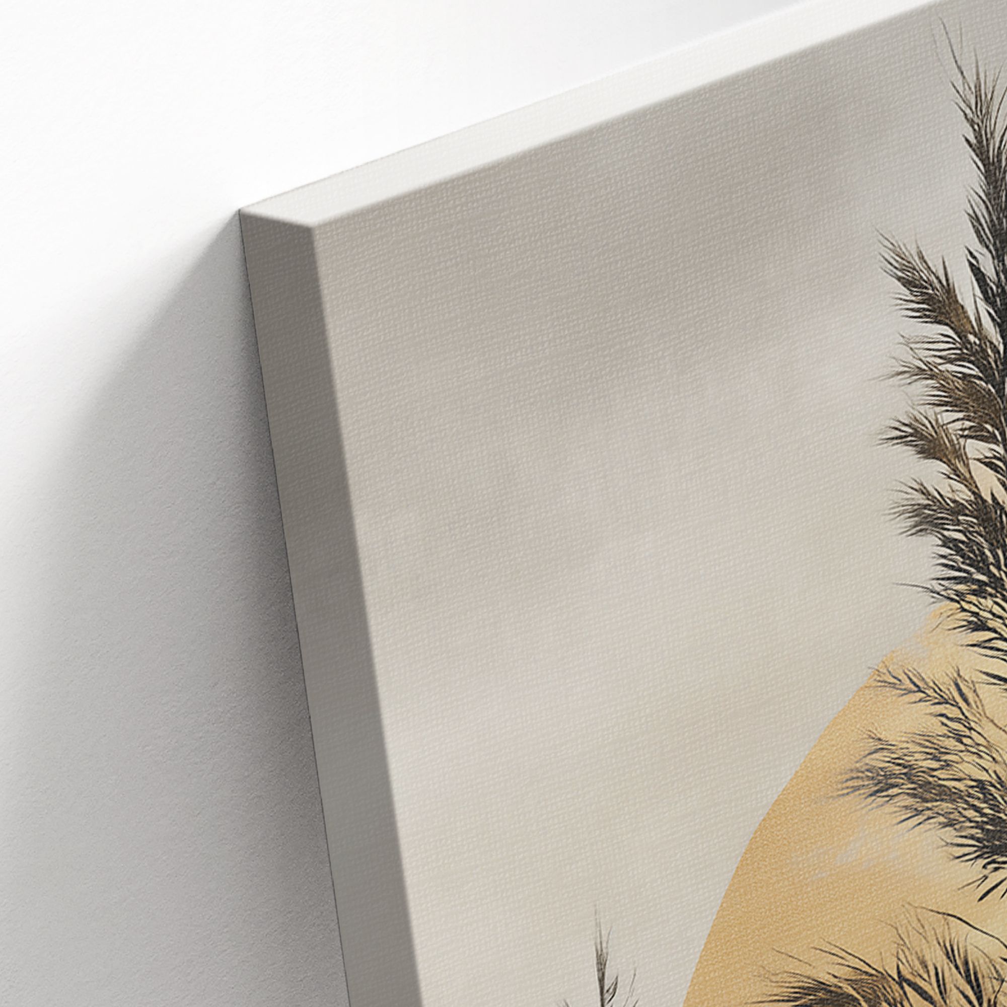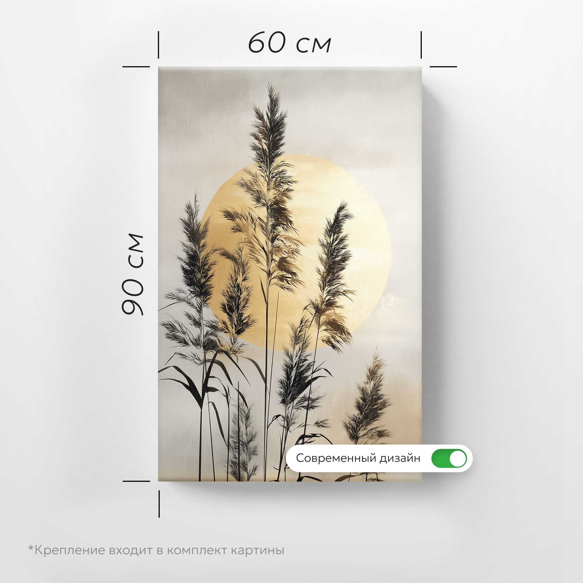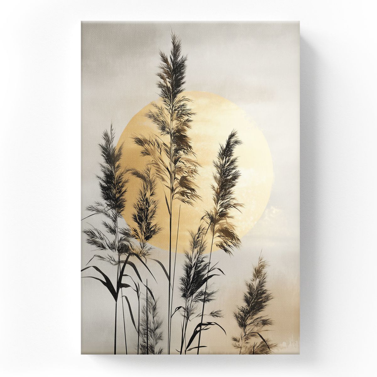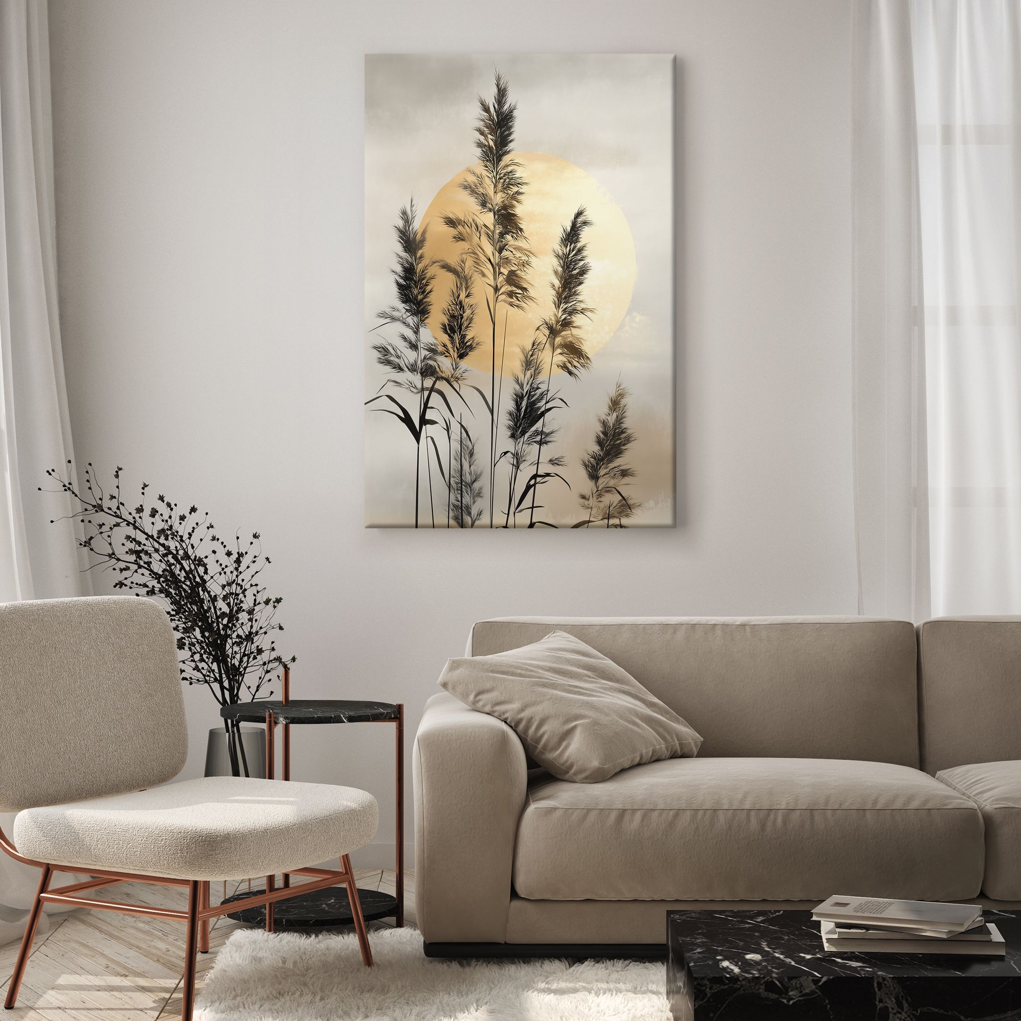 На этом холсте изображены тонкие силуэты тростника, возвышающегося на фоне большого теплого светящегося круга, символизирующего солнце. Цветовая гамма выдержана в мягких бежевых, коричневых и серых оттенках, что придаёт работе умиротворённость и нежность. Картина словно запечатлевает тихий момент на природе — перед рассветом или закатом, когда свет особым образом обволакивает всё вокруг, подчёркивая хрупкость и красоту простых растений. Это произведение вдохновляет на созерцание, спокойствие и внутреннее равновесие.