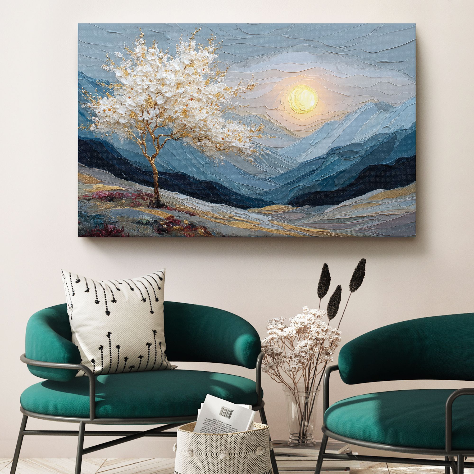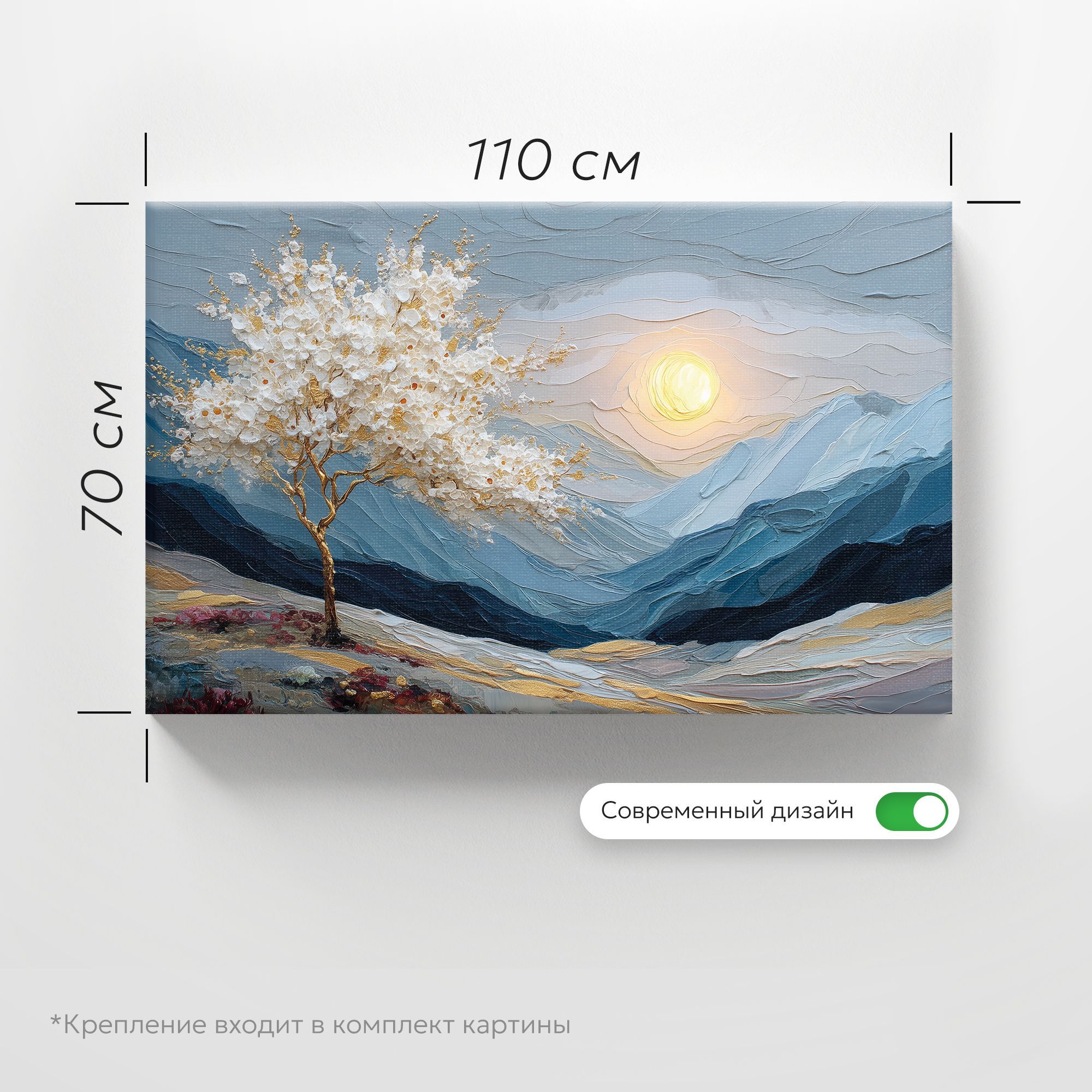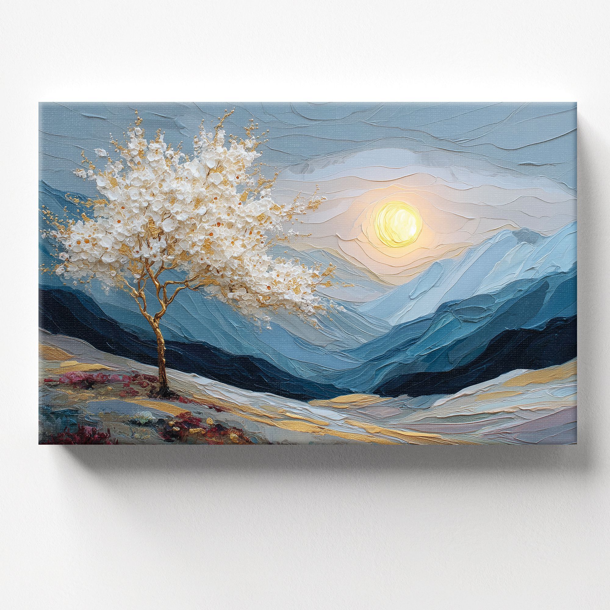 На холсте изображён живописный пейзаж, выполненный в технике объёмной масляной живописи с выразительной фактурой мазков. Центральным элементом композиции является изящное дерево с золотым стволом и ветвями, украшенное пышной кроной из белых цветов с золотистыми акцентами. Дерево словно светится на фоне прохладных оттенков окружающего ландшафта. Фон картины представляет собой многослойный горный пейзаж в сине-серых тонах, создающий ощущение глубины и простора. Горы написаны густыми, волнообразными мазками, что придаёт работе скульптурность и динамику. В правой части композиции изображено большое, сияющее солнце, словно погружённое в мягкие облака. Тёплый жёлтый свет солнца контрастирует с холодными оттенками гор, создавая гармоничное равновесие. В нижней части картины можно заметить вкрапления розовых и бордовых оттенков — вероятно, это полевые цветы или кустарники, добавляющие композиции живости и природного очарования. Общая цветовая гамма сочетает холодные и тёплые тона, а золотые акценты придают работе ощущение роскоши и утончённости. Картина станет выразительным акцентом в лаконичном пространстве, добавит глубины и природной эстетики.