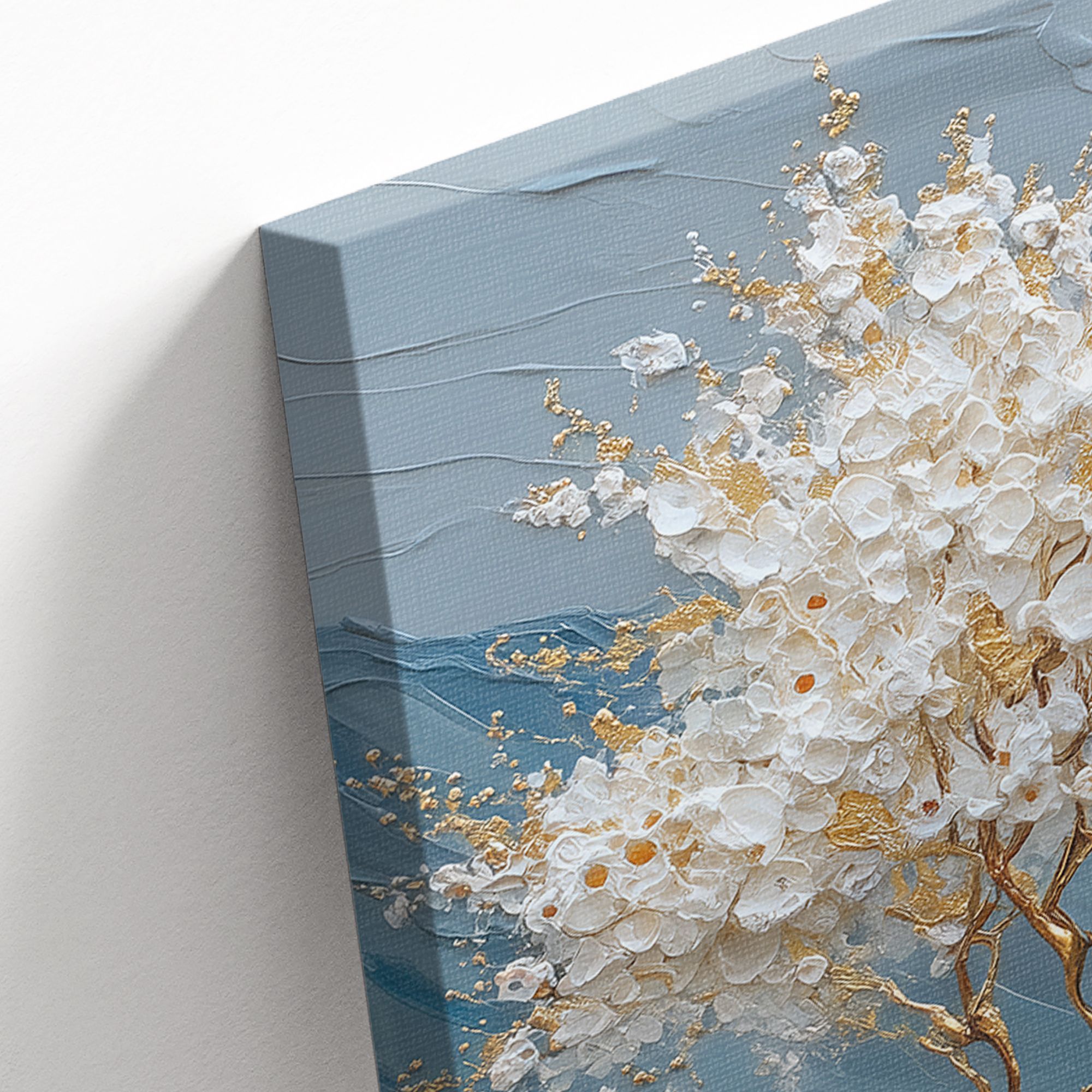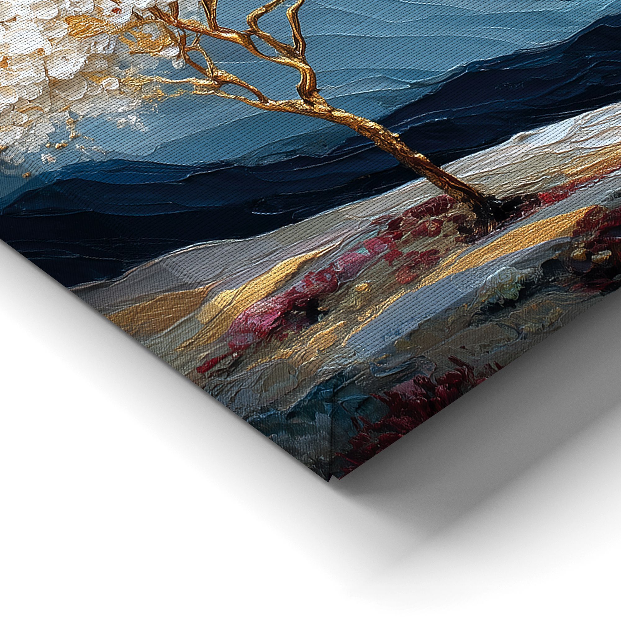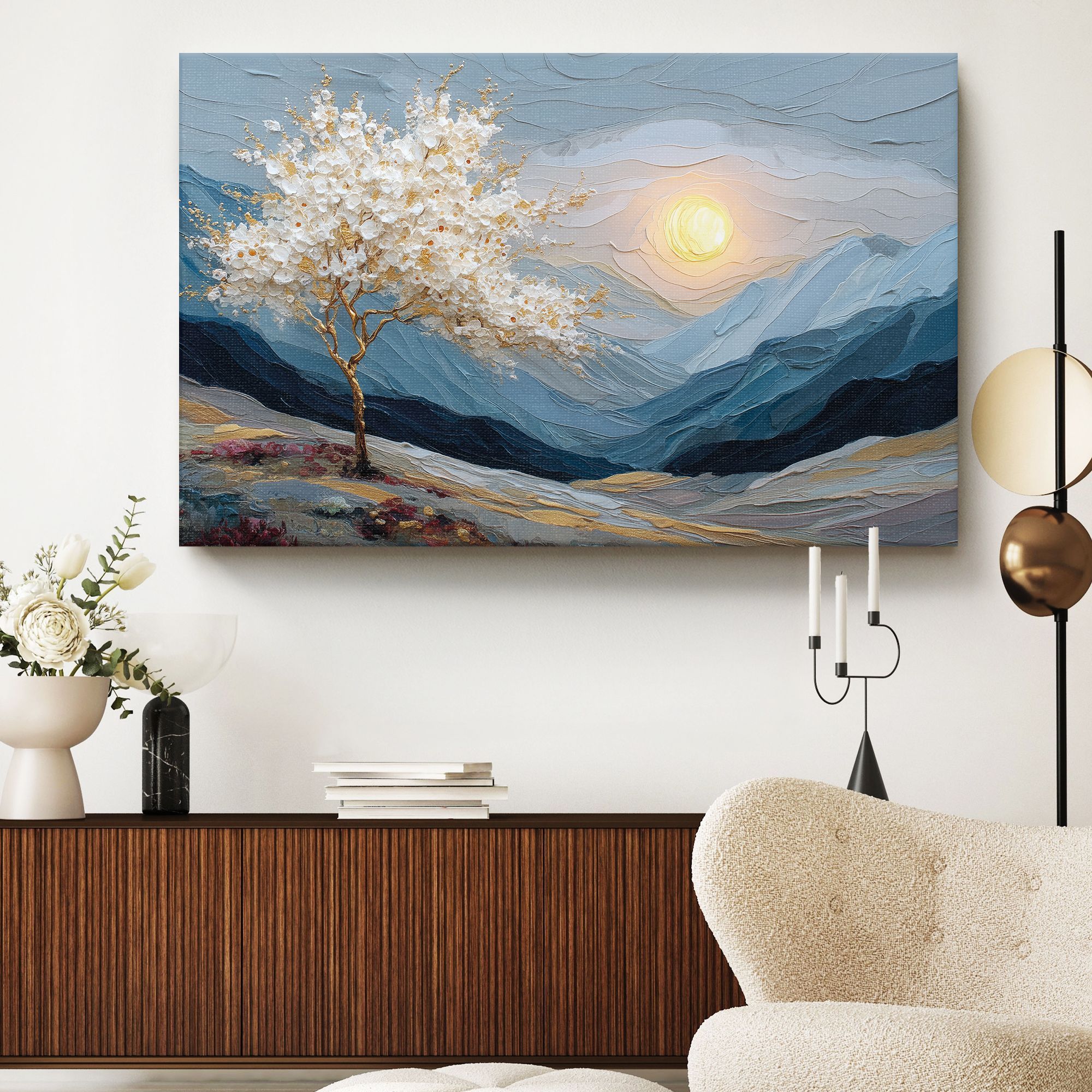 На холсте изображён живописный пейзаж, выполненный в технике объёмной масляной живописи с выразительной фактурой мазков. Центральным элементом композиции является изящное дерево с золотым стволом и ветвями, украшенное пышной кроной из белых цветов с золотистыми акцентами. Дерево словно светится на фоне прохладных оттенков окружающего ландшафта. Фон картины представляет собой многослойный горный пейзаж в сине-серых тонах, создающий ощущение глубины и простора. Горы написаны густыми, волнообразными мазками, что придаёт работе скульптурность и динамику. В правой части композиции изображено большое, сияющее солнце, словно погружённое в мягкие облака. Тёплый жёлтый свет солнца контрастирует с холодными оттенками гор, создавая гармоничное равновесие. В нижней части картины можно заметить вкрапления розовых и бордовых оттенков — вероятно, это полевые цветы или кустарники, добавляющие композиции живости и природного очарования. Общая цветовая гамма сочетает холодные и тёплые тона, а золотые акценты придают работе ощущение роскоши и утончённости. Картина станет выразительным акцентом в лаконичном пространстве, добавит глубины и природной эстетики.