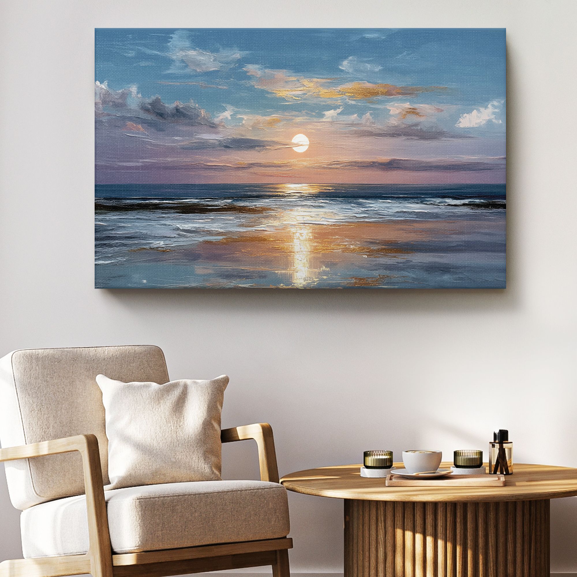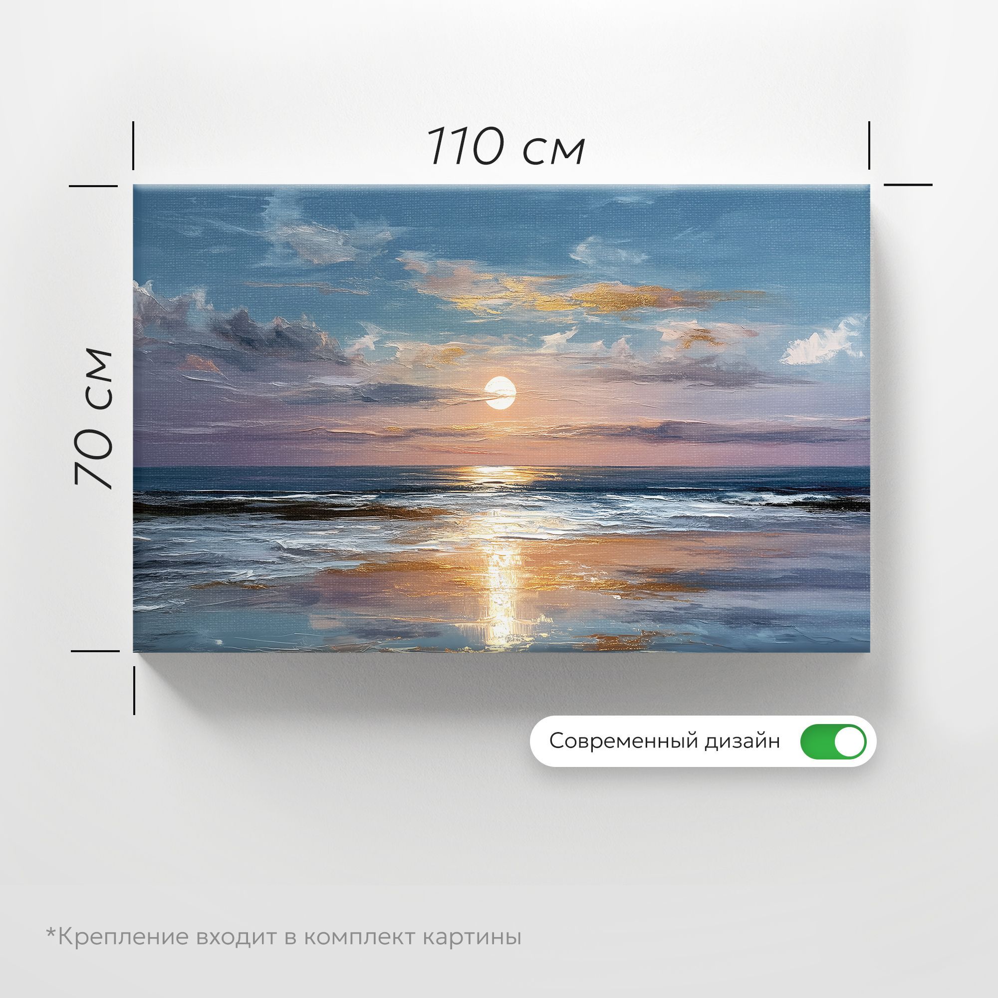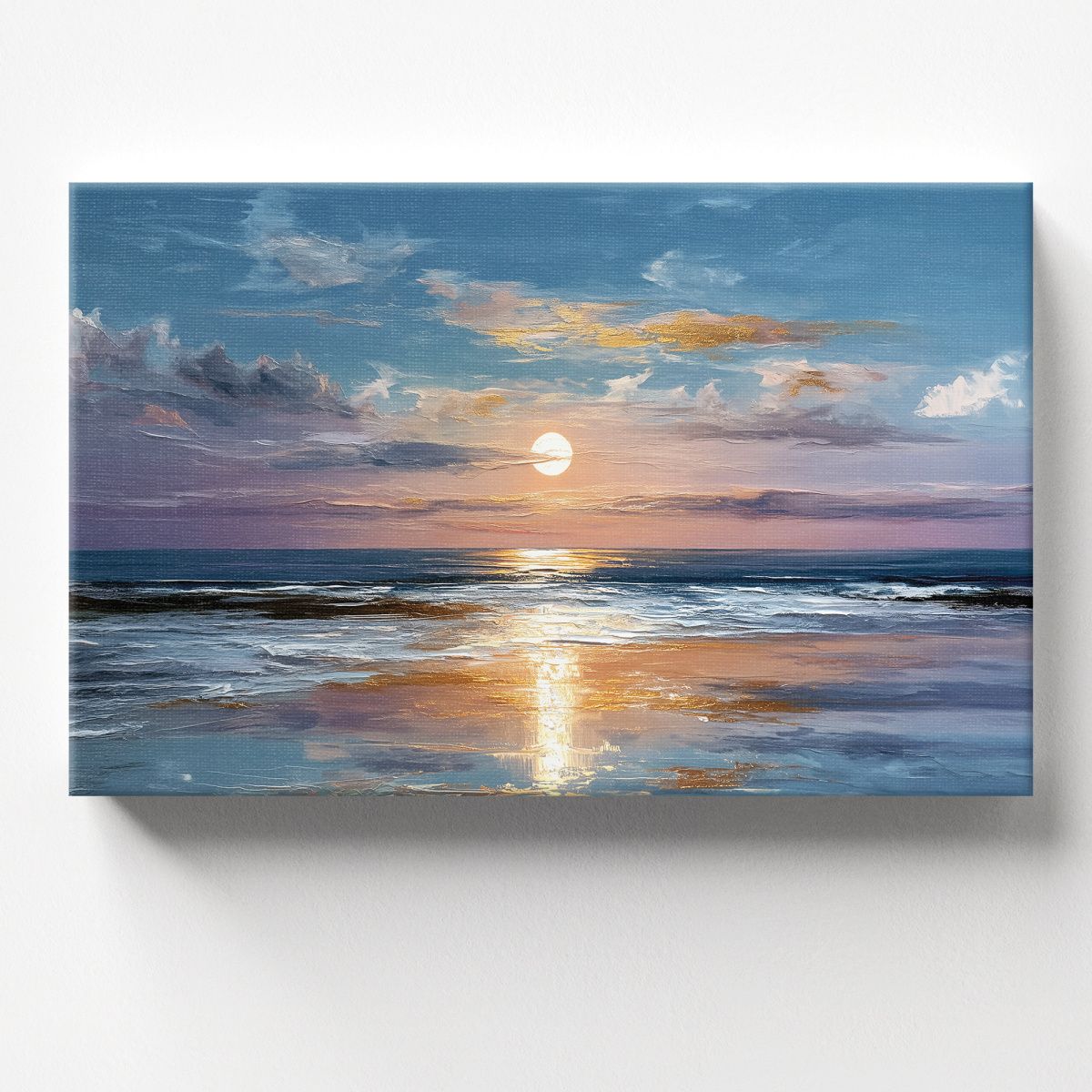 На картине изображён завораживающий морской пейзаж на закате или рассвете. Центральное место занимает сияющий диск солнца, низко висящий над горизонтом. Его свет отражается в воде, создавая длинную золотистую дорожку, которая притягивает взгляд к центру композиции. Небо написано широкими, экспрессивными мазками в нежных оттенках голубого, сиреневого и розового, с вкраплениями золотистых бликов на облаках. Облака выглядят воздушными и полупрозрачными, что придаёт работе лёгкость и мечтательность. Морская гладь изображена с тонкой игрой света и тени: волны мягко накатывают на берег, их белая пена контрастирует с глубокими синими и бирюзовыми оттенками воды. Отражение солнца на мокром песке и волнах создаёт ощущение мерцания и движения. Цветовая гамма картины построена на гармоничном сочетании холодных (синий, серый, фиолетовый) и тёплых (золотисто-оранжевый, персиковый) тонов, что создаёт атмосферу спокойствия и умиротворения. Композиция сбалансирована: небо занимает большую часть полотна, подчёркивая бескрайность и свободу морского пейзажа.