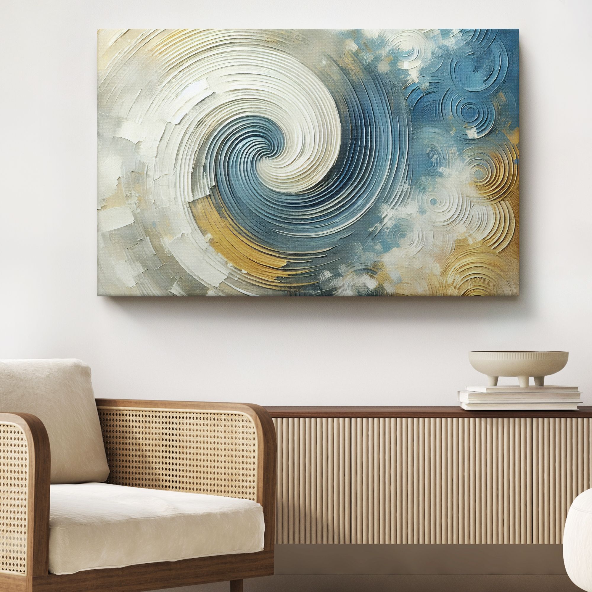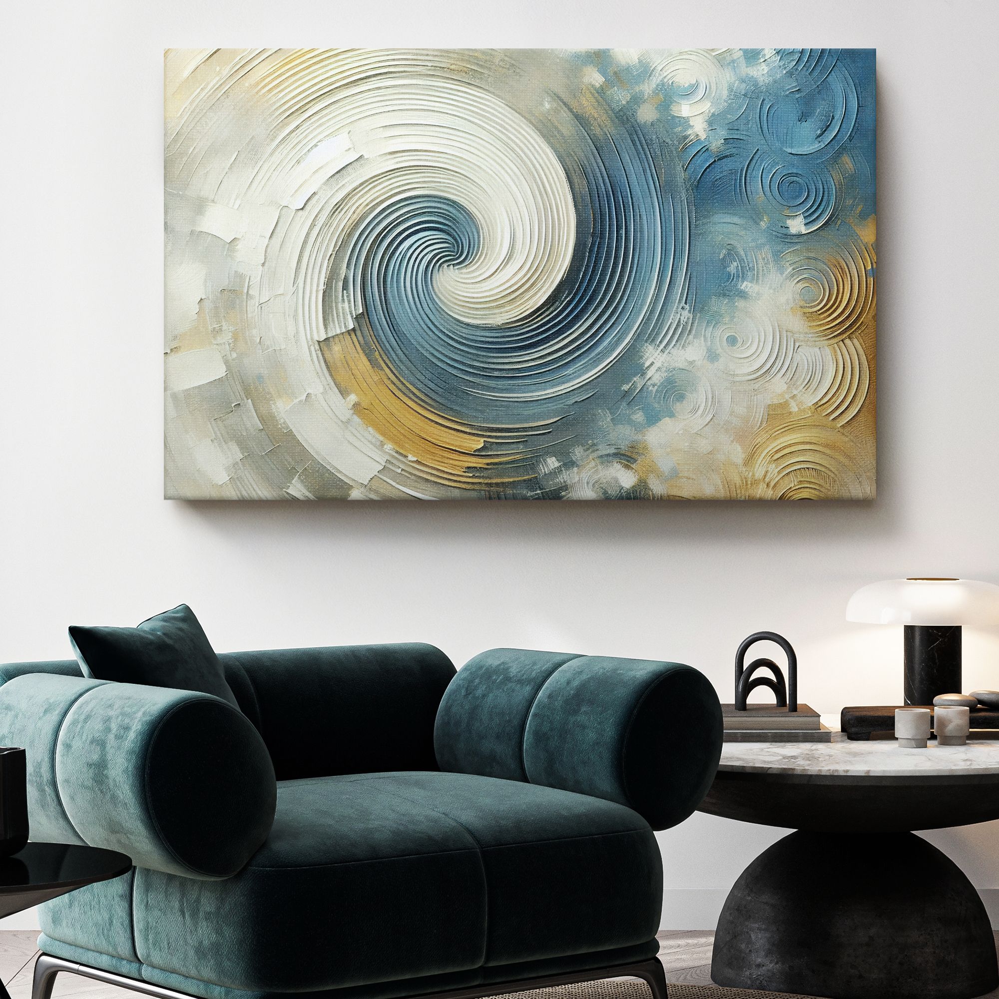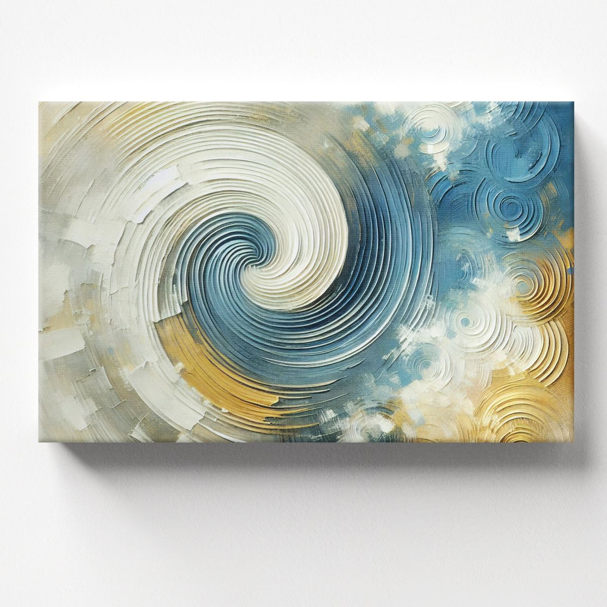 Эта абстрактная картина на холсте выполнена в технике объёмной живописи с ярко выраженным рельефом. Центральным элементом композиции является крупная спиралевидная форма, напоминающая водоворот или галактику, которая притягивает взгляд внутрь. Спираль состоит из плавных, чётко очерченных концентрических линий, создающих ощущение движения и глубины. Цветовая гамма сочетает холодные и тёплые оттенки: серо-белые тона доминируют в левой части картины, придавая ей лёгкость и воздушность; глубокие синие и голубые оттенки формируют «сердцевину» спирали, создавая ощущение прохлады и загадочности; золотисто-бежевые акценты разбросаны по полотну, добавляя тепла и динамики, словно солнечные блики на воде. Правая часть картины менее насыщенная, с меньшими спиралями и кругами, что создаёт баланс между центром и периферией. Текстура холста хорошо ощутима — рельефные мазки добавляют трёхмерности и тактильного интереса.