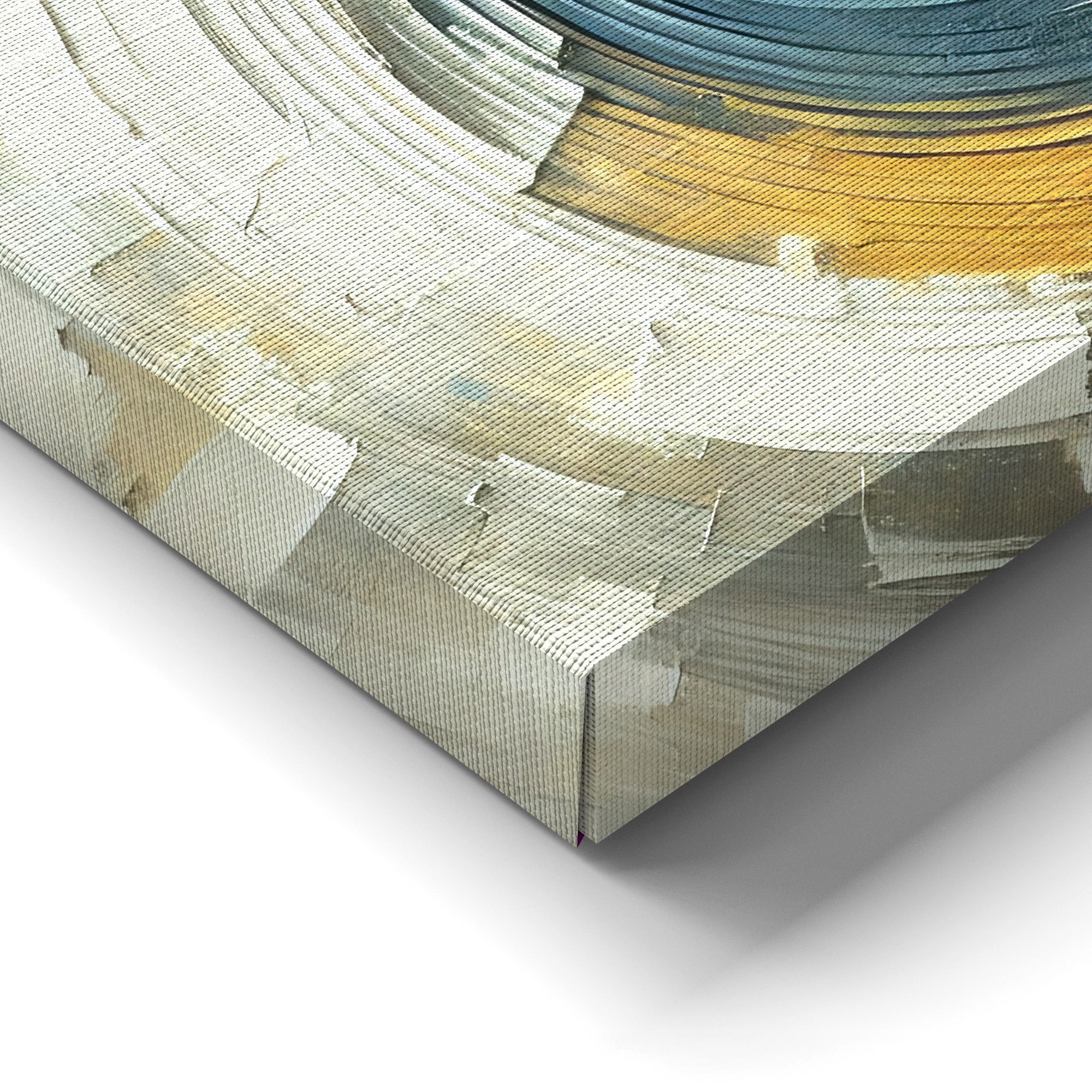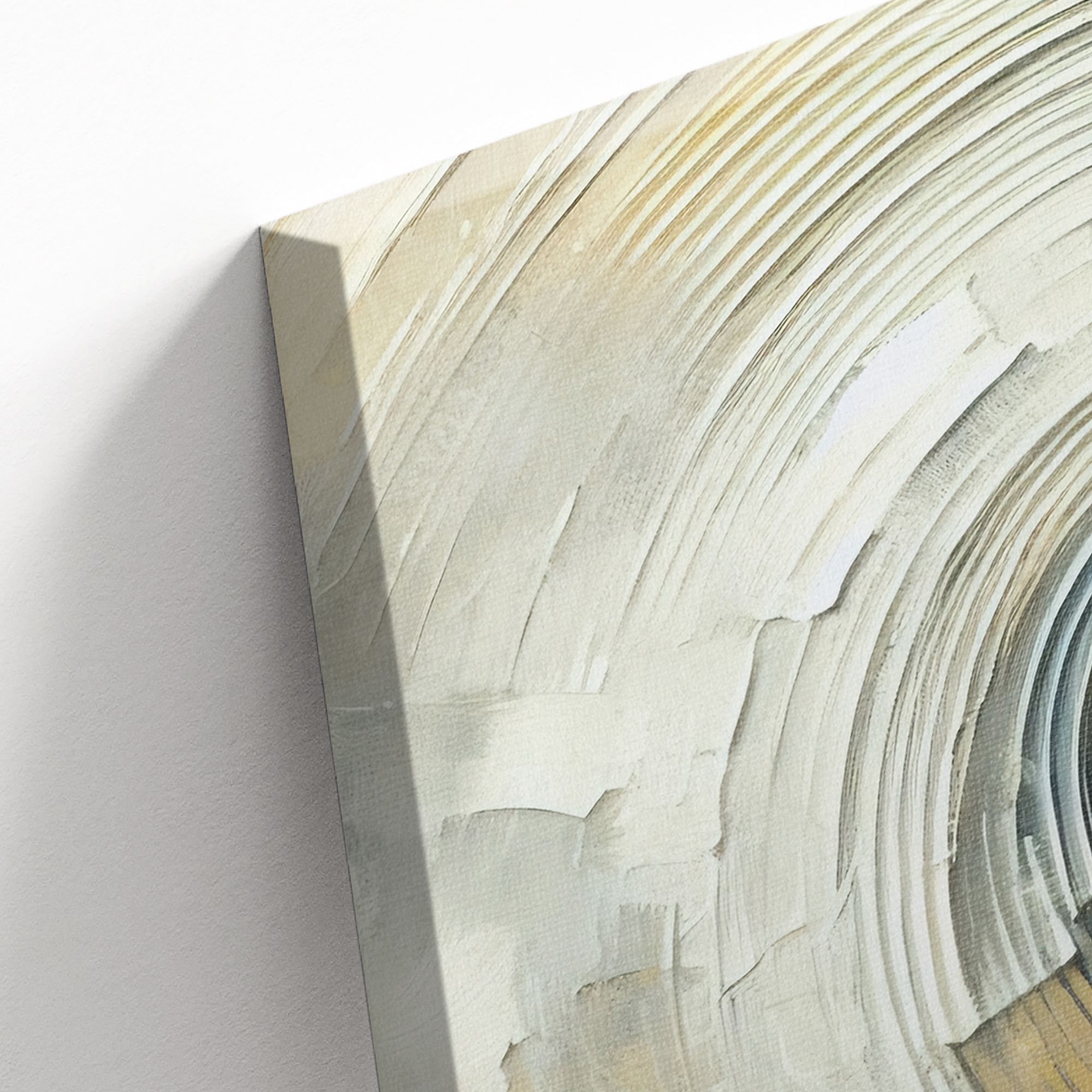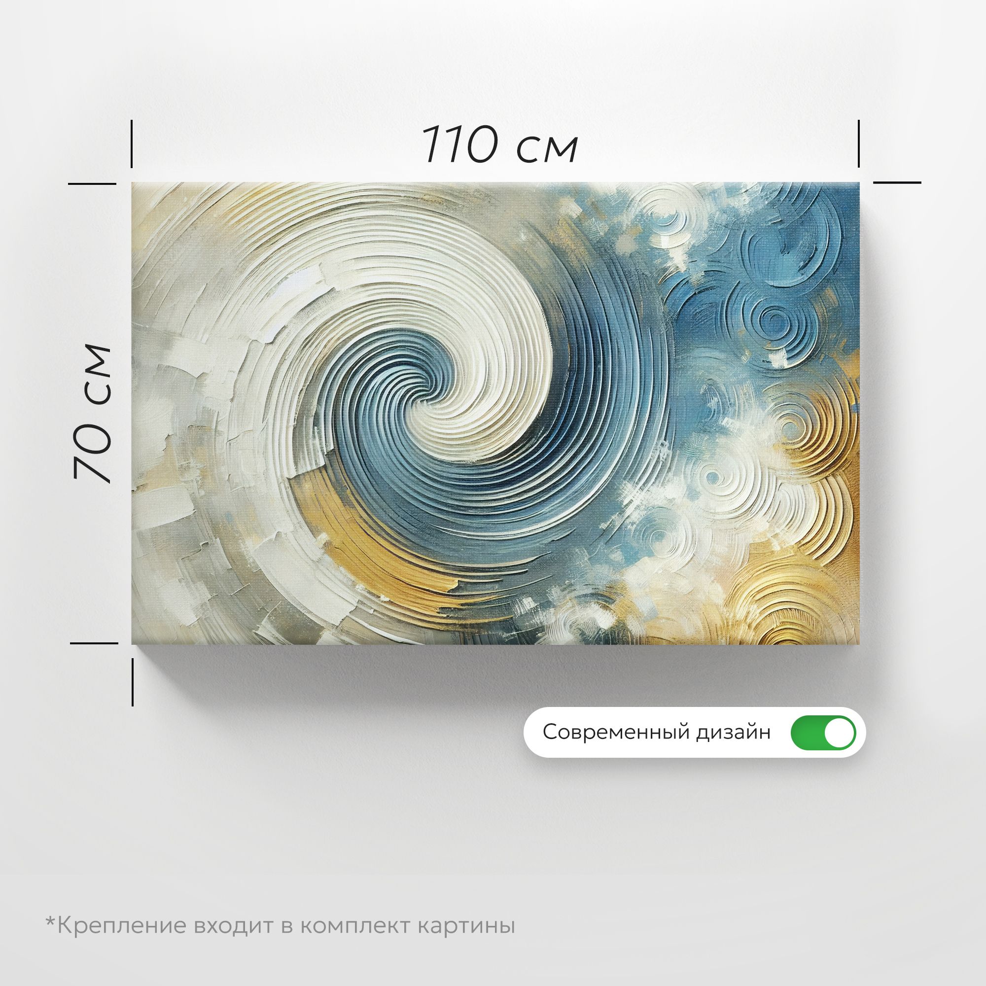 Эта абстрактная картина на холсте выполнена в технике объёмной живописи с ярко выраженным рельефом. Центральным элементом композиции является крупная спиралевидная форма, напоминающая водоворот или галактику, которая притягивает взгляд внутрь. Спираль состоит из плавных, чётко очерченных концентрических линий, создающих ощущение движения и глубины. Цветовая гамма сочетает холодные и тёплые оттенки: серо-белые тона доминируют в левой части картины, придавая ей лёгкость и воздушность; глубокие синие и голубые оттенки формируют «сердцевину» спирали, создавая ощущение прохлады и загадочности; золотисто-бежевые акценты разбросаны по полотну, добавляя тепла и динамики, словно солнечные блики на воде. Правая часть картины менее насыщенная, с меньшими спиралями и кругами, что создаёт баланс между центром и периферией. Текстура холста хорошо ощутима — рельефные мазки добавляют трёхмерности и тактильного интереса.