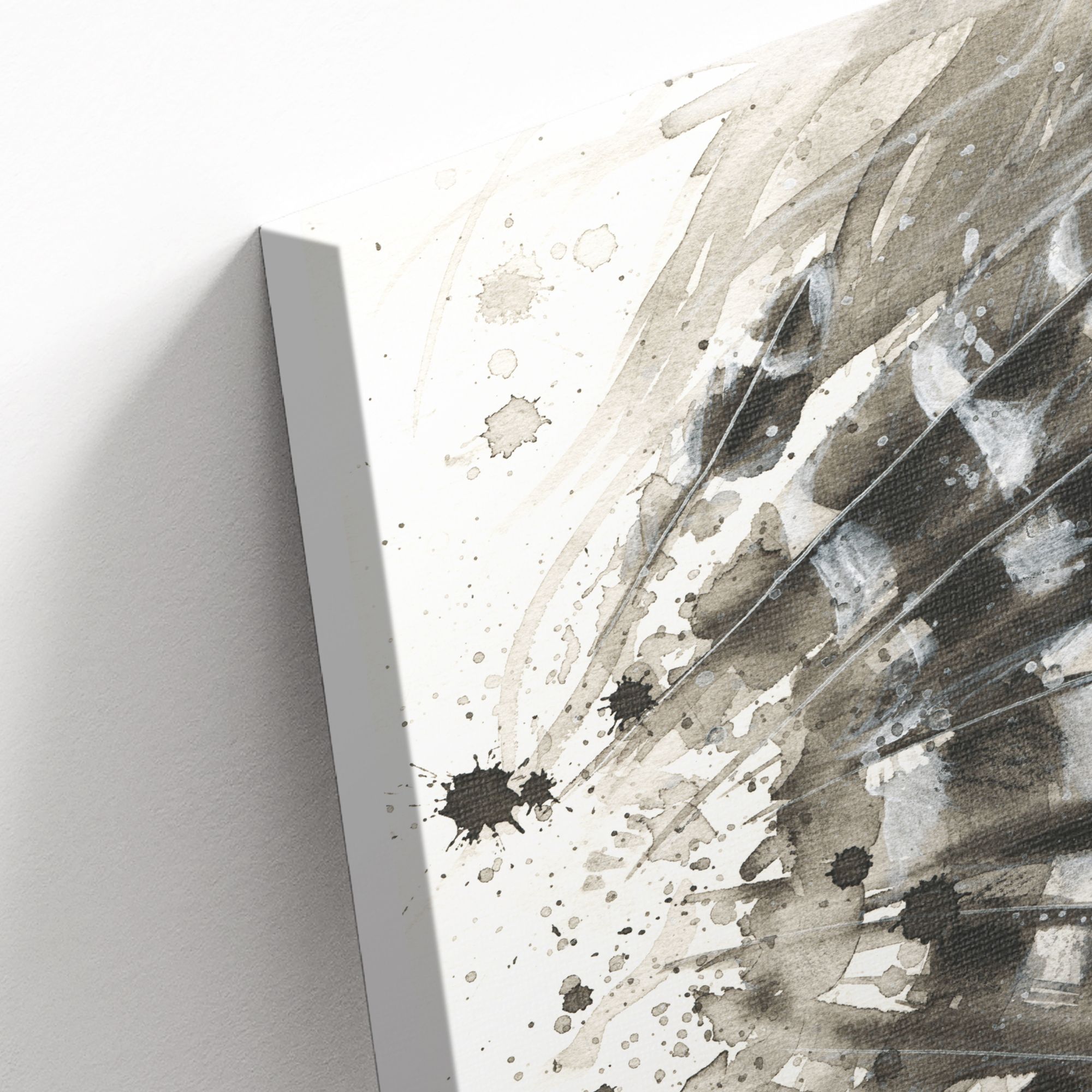 Картина выполнена в смешанной технике, сочетающей реализм и элементы абстракции. Центральным элементом композиции является портрет молодой женщины с выразительным взглядом. Лицо прорисовано детально: видны веснушки, текстура кожи, блеск в глазах, мягкие губы. Волосы изображены свободными, слегка растрёпанными прядями, что придаёт образу естественность и динамику. Особенность картины — интеграция перьев в композицию. Они словно «вырастают» из левой части портрета, частично перекрывая лицо и волосы девушки. Перья выполнены с тщательной детализацией: видны прожилки, игра света и тени, что создаёт ощущение объёма и движения. Фон картины абстрактный, с акварельными разводами и пятнами туши, создающими атмосферу лёгкости и мистики. Цветовая гамма выдержана в монохромных, приглушённых тонах: преобладают серые, бежевые и коричневые оттенки. Это придаёт работе глубину и сдержанную элегантность, одновременно подчёркивая эмоциональность образа. Композиция асимметрична, что усиливает ощущение спонтанности и внутреннего напряжения.