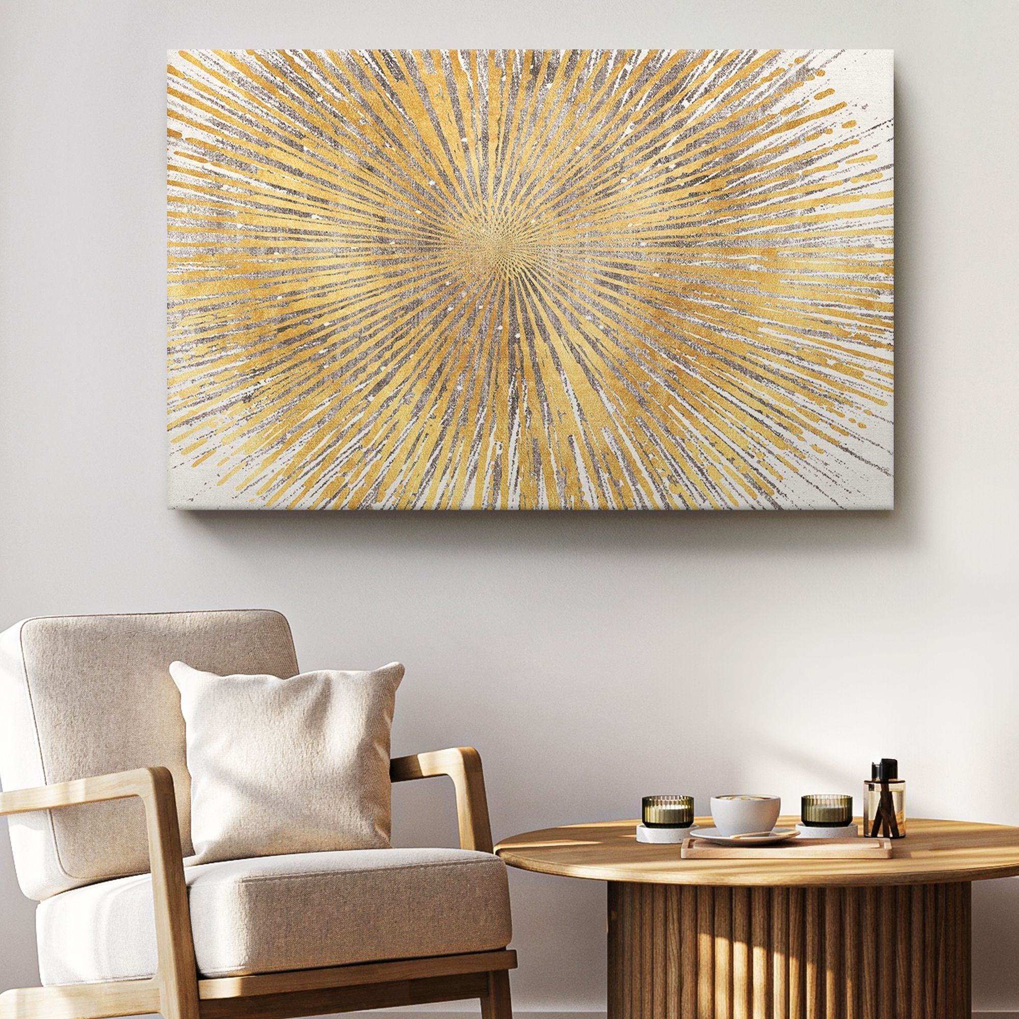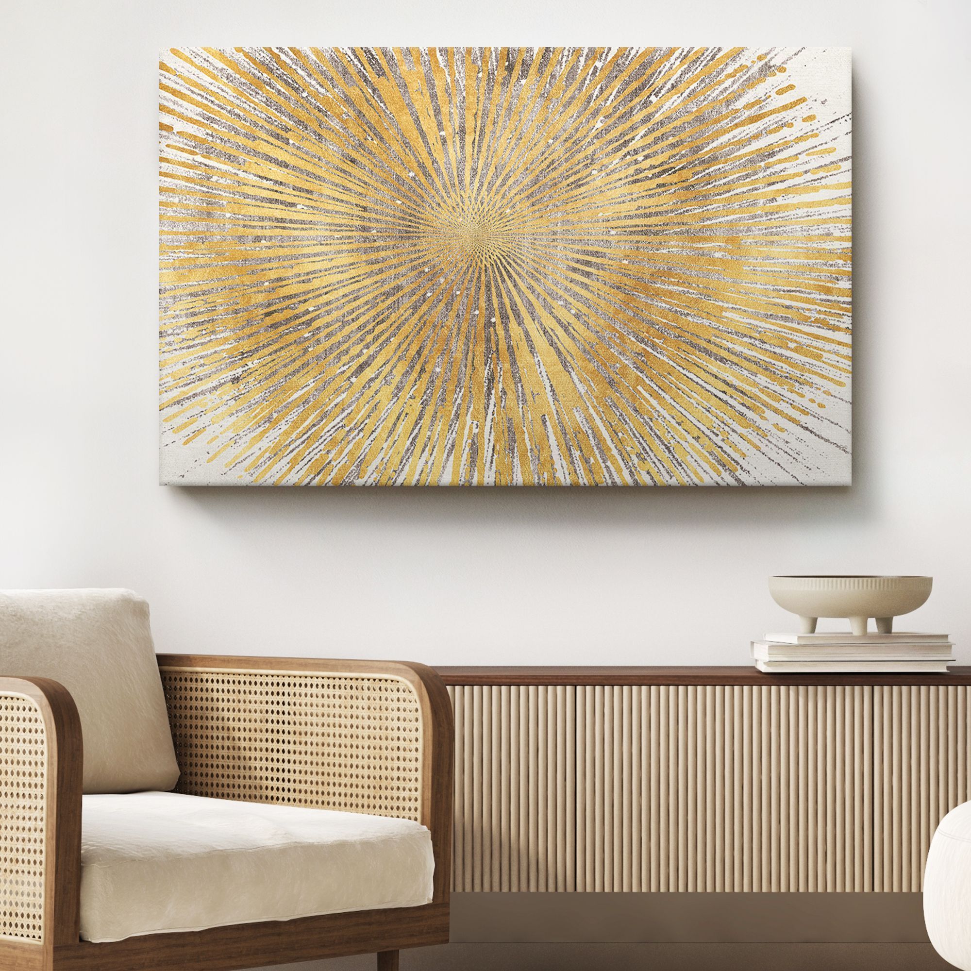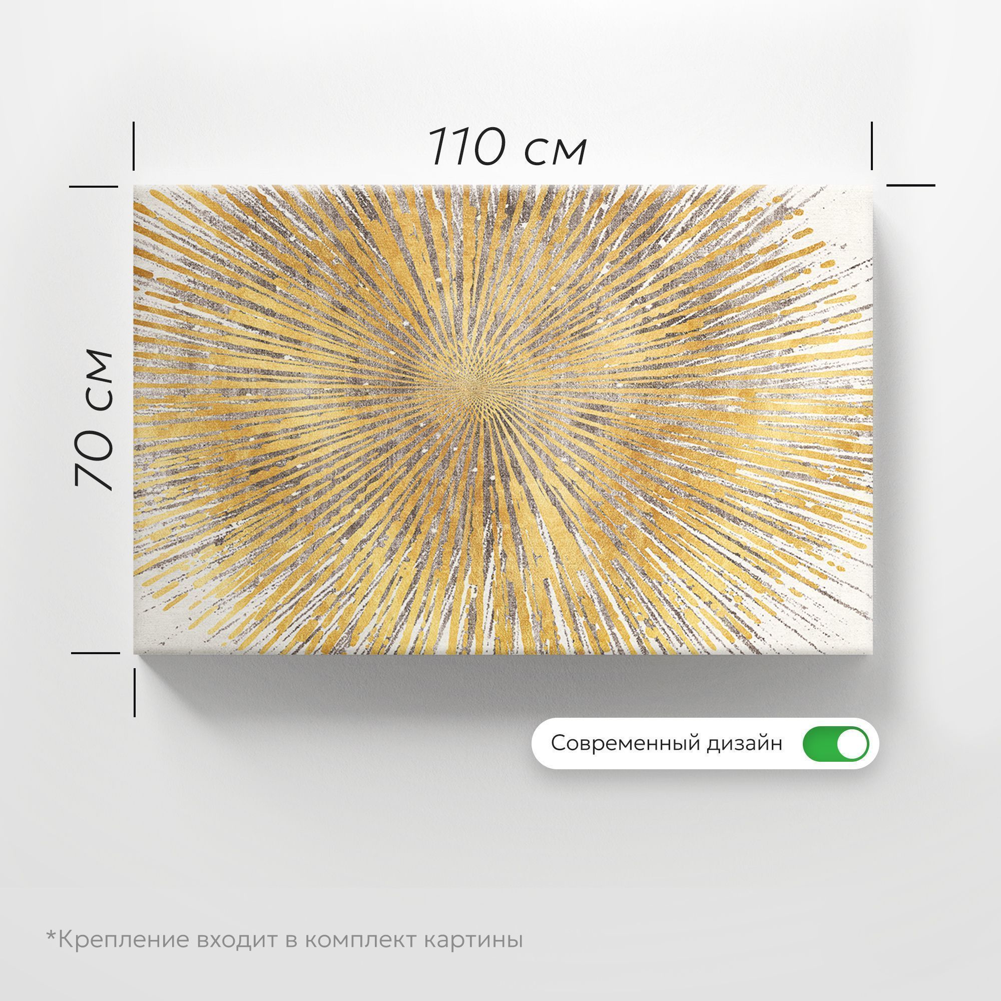 Картина выполнена в абстрактном стиле и изображает эффект сияющего всплеска или солнечных лучей, расходящихся из центра полотна. Основной мотив — динамичные линии, напоминающие золотые и серебристые лучи, которые создают ощущение энергии и движения. Цветовая гамма построена на сочетании тёплых золотистых оттенков с холодными серебристо-серыми, что придаёт работе глубину и контраст. Фон светлый, нейтральный, что позволяет «всплеску» лучей выглядеть особенно выразительно. Текстура мазков неравномерная, с элементами пастозности, что добавляет объём и художественную выразительность. Композиция центростремительная — взгляд зрителя сразу притягивается к «ядру» сияния. Картина на холсте станет выразительным акцентом на однотонной стене, подчеркнёт лаконичность мебели и отделки. Золотые лучи добавят тепла и динамики в сдержанный интерьер.