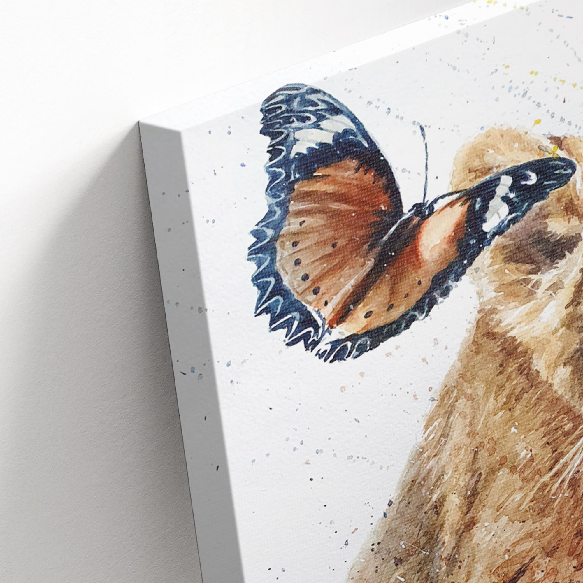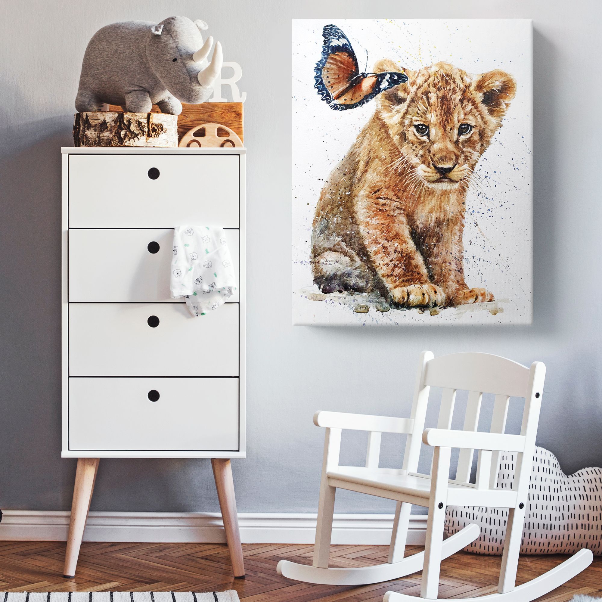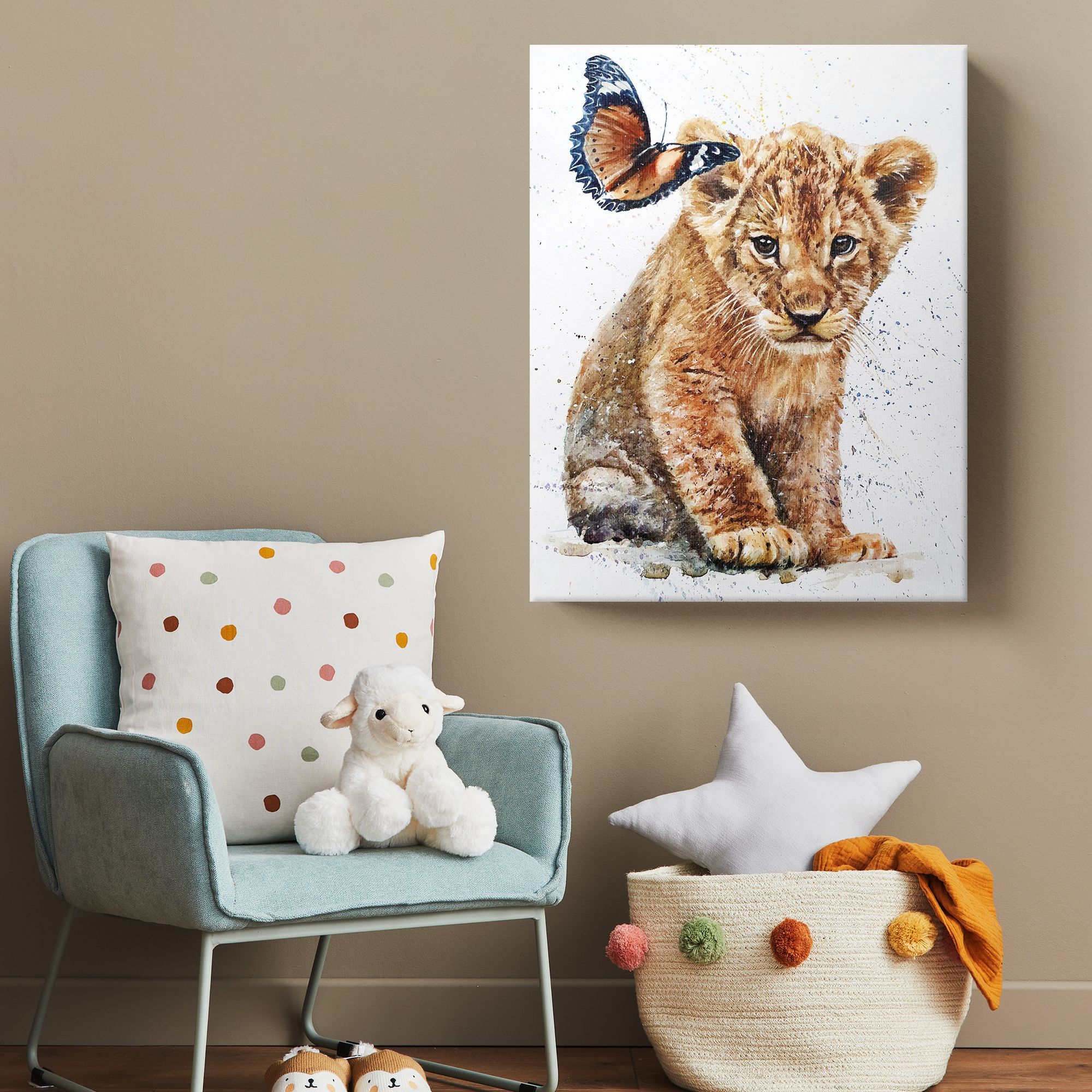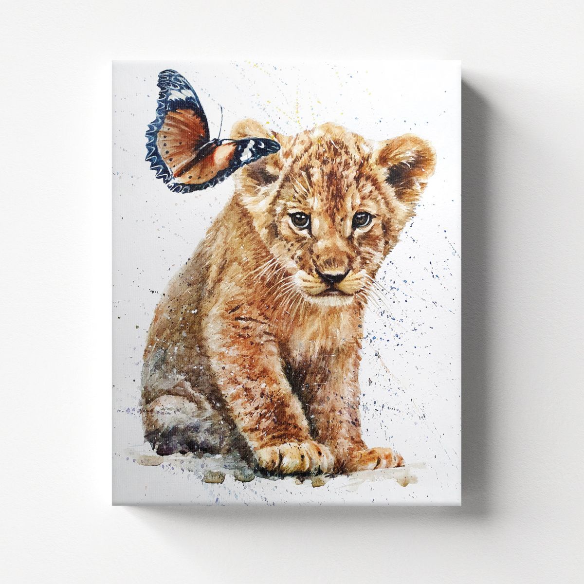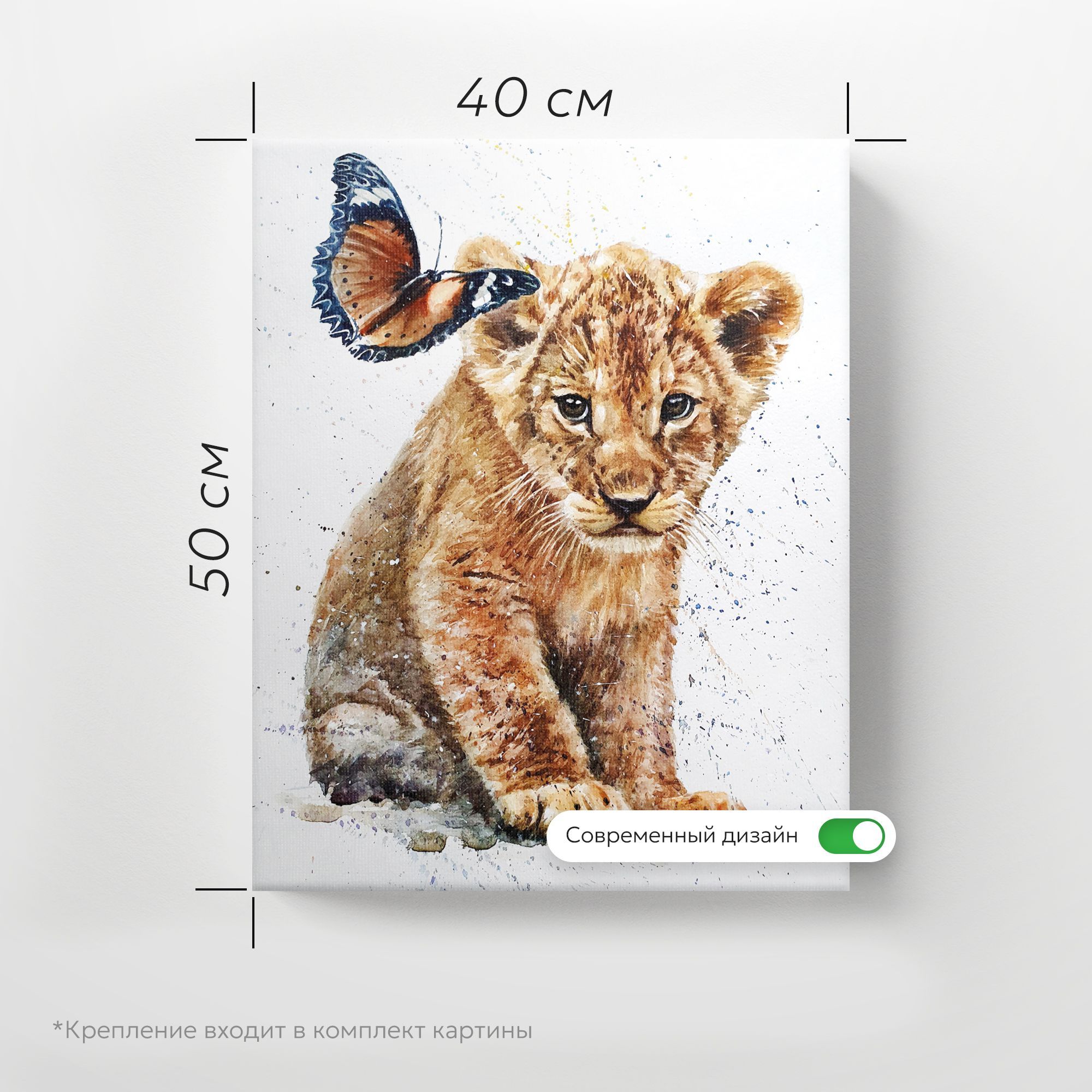 На картине, выполненной в технике акварели, изображён трогательный сюжет: маленький львёнок и бабочка. Центральным элементом композиции является львёнок, который занимает большую часть холста. Он сидит, слегка наклонившись вперёд, его взгляд направлен прямо на зрителя — в глазах читается смесь любопытства и невинности. Мастерски прорисована текстура пушистой шерсти с мягкими переходами коричневых и бежевых оттенков. Видны отдельные волоски, что придаёт реалистичность. Бабочка расположена в верхней левой части картины, словно зависла в полёте рядом с ухом львёнка; крылья бабочки крупные, с чётким рисунком: преобладают коричневые и чёрные тона, украшенные белыми пятнами и изящными узорами по краям; создаёт контраст с массивностью львёнка, добавляя лёгкости и воздушности композиции. Фон выполнен в светлых, почти белых тонах с лёгкими акварельными брызгами и точками синего, жёлтого и фиолетового цветов; не отвлекает внимание от главных героев, но придаёт картине динамику и художественную глубину; создаёт ощущение лёгкости, словно сцена происходит в залитом солнцем пространстве. Сочетание мощи (символизируемой львёнком) и хрупкости (бабочки) создаёт гармоничный баланс; работа наполнена нежностью, умиротворением и лёгкой сказочностью; вызывает тёплые чувства, пробуждает ассоциации с детством, природой и безмятежностью. В детской комнате станет ярким, но не перегруженным акцентом, будет радовать ребёнка и создавать уютную атмосферу.