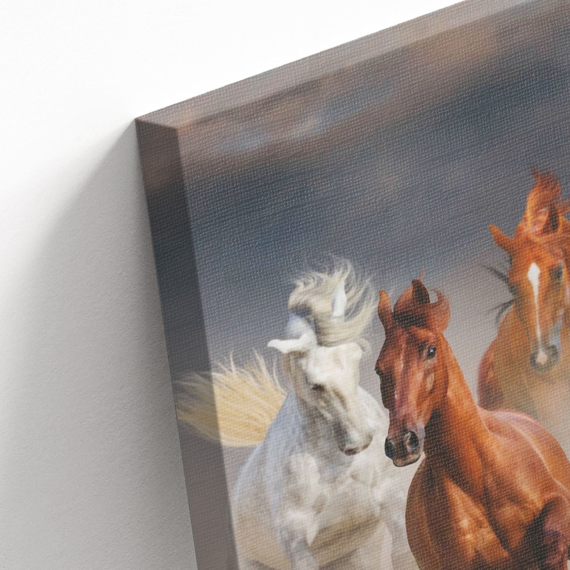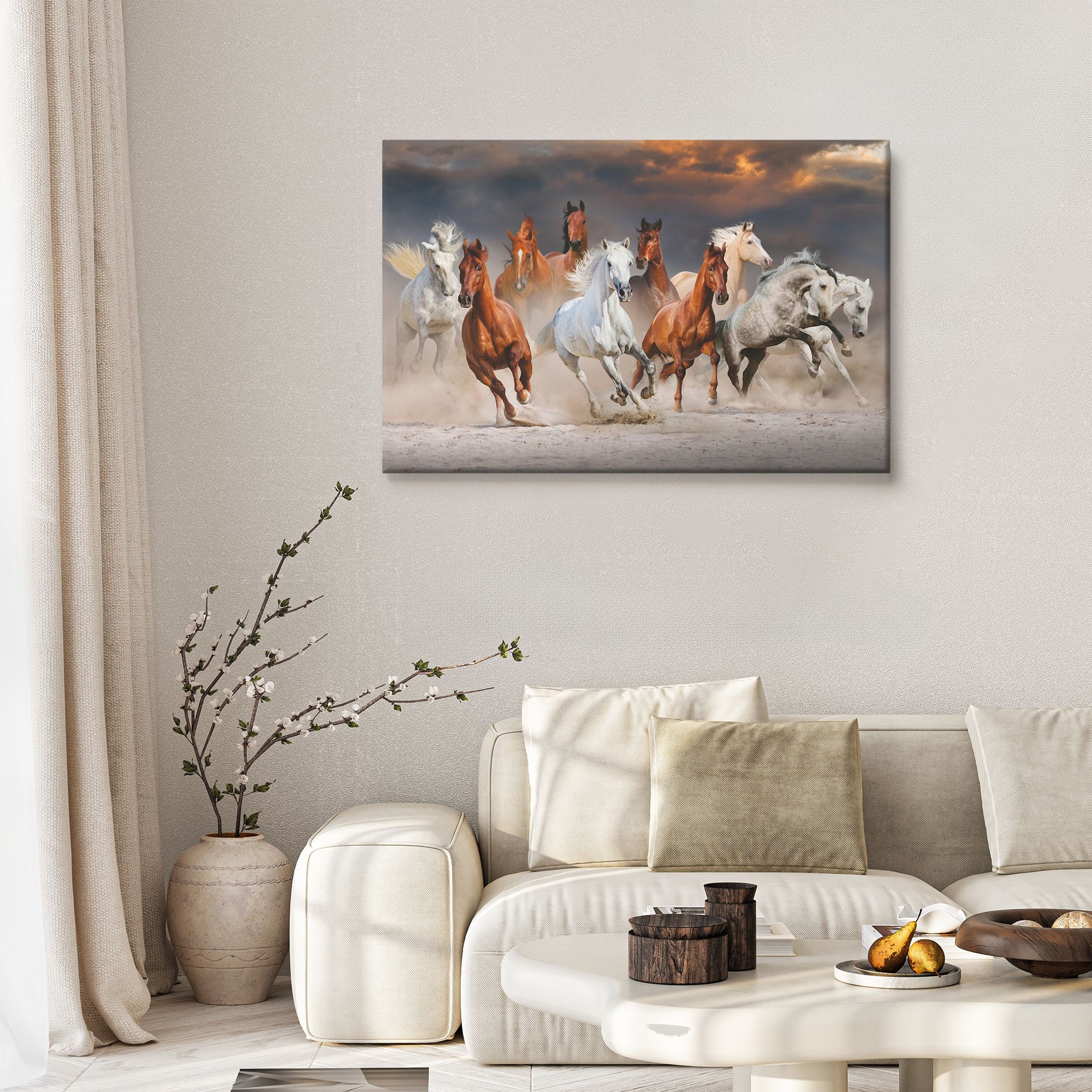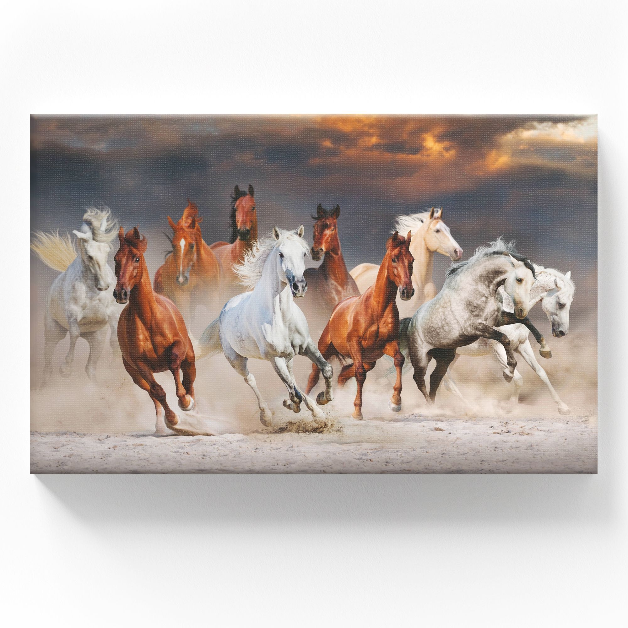 На картине изображён динамичный табун лошадей, мчащихся по песчаной равнине на фоне драматичного закатного неба. Композиция наполнена энергией и движением: лошади разных мастей — белые, гнедые, серые — бегут в одном порыве, вздымая клубы пыли. Их мускулистые тела напряжены, гривы и хвосты развеваются на ветру, подчёркивая стремительность бега. Центральную часть композиции занимает белоснежная лошадь, словно ведущая за собой остальных. Остальные скакуны располагаются вокруг неё, создавая ощущение единого потока. Фон картины — насыщенное закатное небо с густыми облаками, окрашенными в золотисто-оранжевые и тёмно-серые тона. Контраст между светом и тенью придаёт сцене драматизма и глубины. Детализация лошадей поражает: видны отдельные пряди гривы, блеск шерсти, напряжённые мышцы. Песчаная поверхность под копытами подчёркивает динамику движения, а клубы пыли добавляют реалистичности. Картина выполнена в реалистичной манере с акцентом на экспрессию и мощь животных.