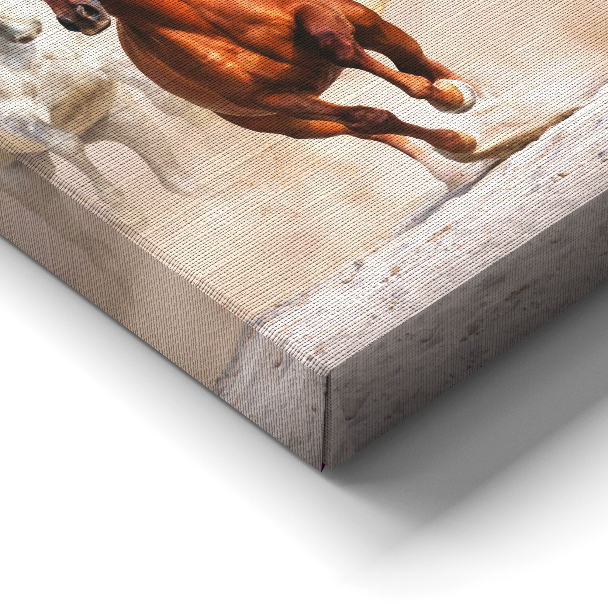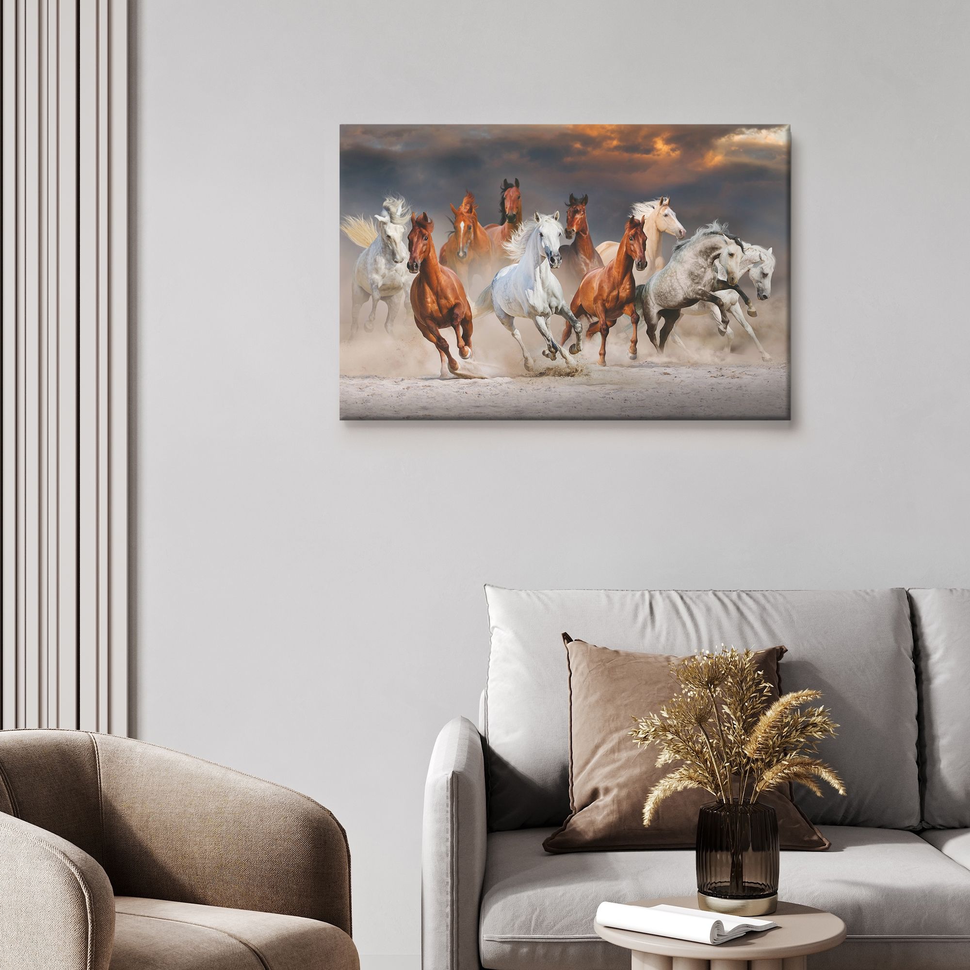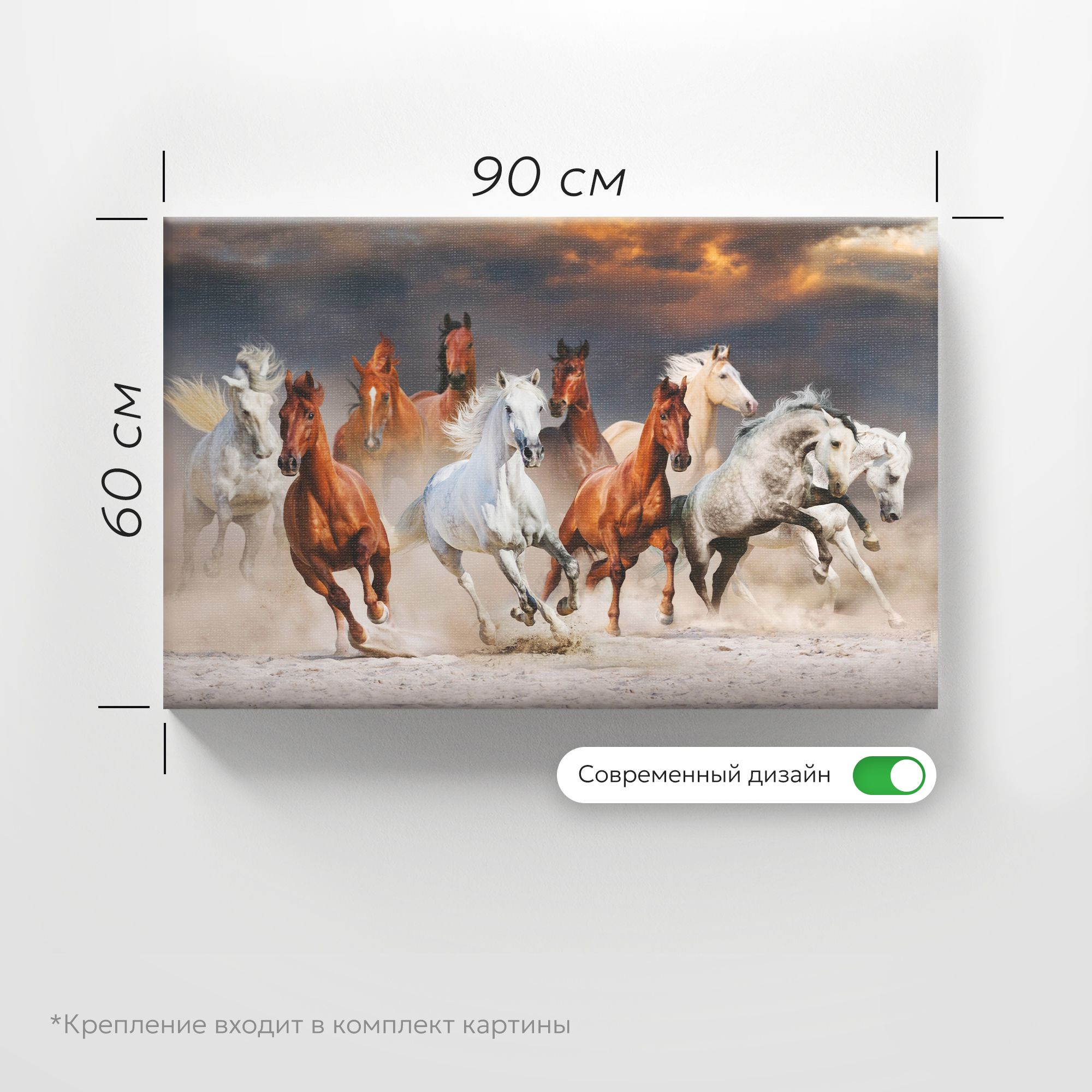 На картине изображён динамичный табун лошадей, мчащихся по песчаной равнине на фоне драматичного закатного неба. Композиция наполнена энергией и движением: лошади разных мастей — белые, гнедые, серые — бегут в одном порыве, вздымая клубы пыли. Их мускулистые тела напряжены, гривы и хвосты развеваются на ветру, подчёркивая стремительность бега. Центральную часть композиции занимает белоснежная лошадь, словно ведущая за собой остальных. Остальные скакуны располагаются вокруг неё, создавая ощущение единого потока. Фон картины — насыщенное закатное небо с густыми облаками, окрашенными в золотисто-оранжевые и тёмно-серые тона. Контраст между светом и тенью придаёт сцене драматизма и глубины. Детализация лошадей поражает: видны отдельные пряди гривы, блеск шерсти, напряжённые мышцы. Песчаная поверхность под копытами подчёркивает динамику движения, а клубы пыли добавляют реалистичности. Картина выполнена в реалистичной манере с акцентом на экспрессию и мощь животных.